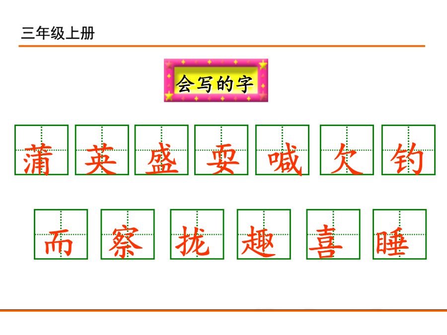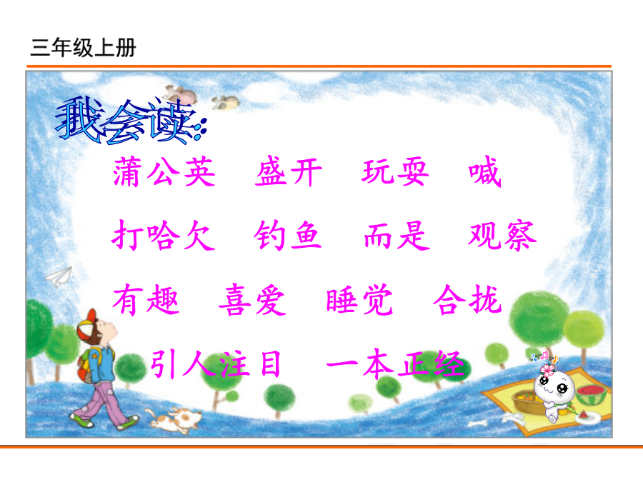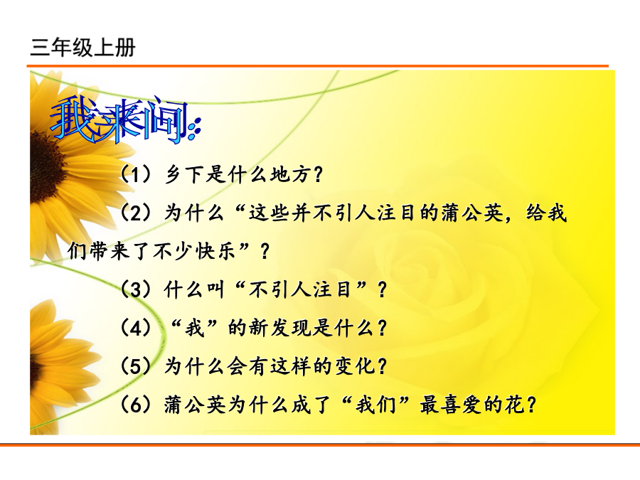 16.金色的草地蒲公英盛开玩耍喊 打哈欠钓鱼而是观察有趣喜爱睡觉合拢 引人注目一本正经(1)乡下是什么地方? (2)为什么“这些并不引人注目的蒲公英,给我们带来了不少快乐”? (3)什么叫“不引人注目”? (4)“我”的新发现是什么? (5)为什么会有这样的变化? (6)蒲公英为什么成了“我们”最喜爱的花?第二课时睡觉拓展练习有一天,我起得很早去钓鱼,发现草地并不是的,而是的。中午回家的时候,我看见草地是的。傍晚的时候,草地又了。我来到草地上,仔细观察,发现蒲公英的花瓣是合拢的。原来,蒲公英的花就像我们的,可以、。花朵张开时,花瓣是的,草地也是的;花朵合拢时,金色的花瓣被包住了,草地就变成的了。 再见1821