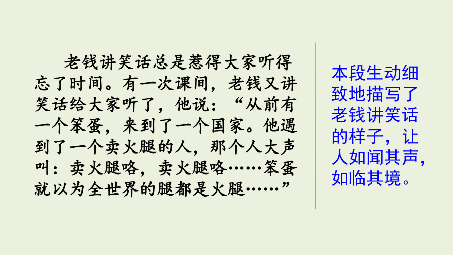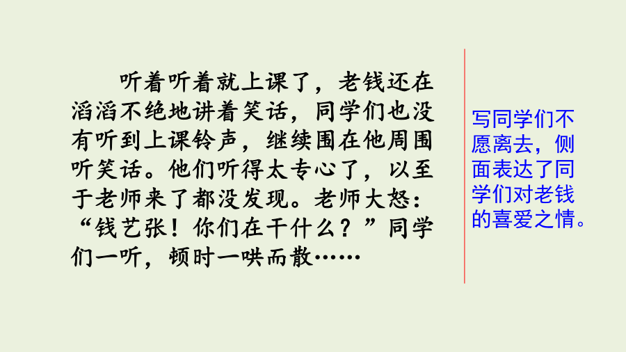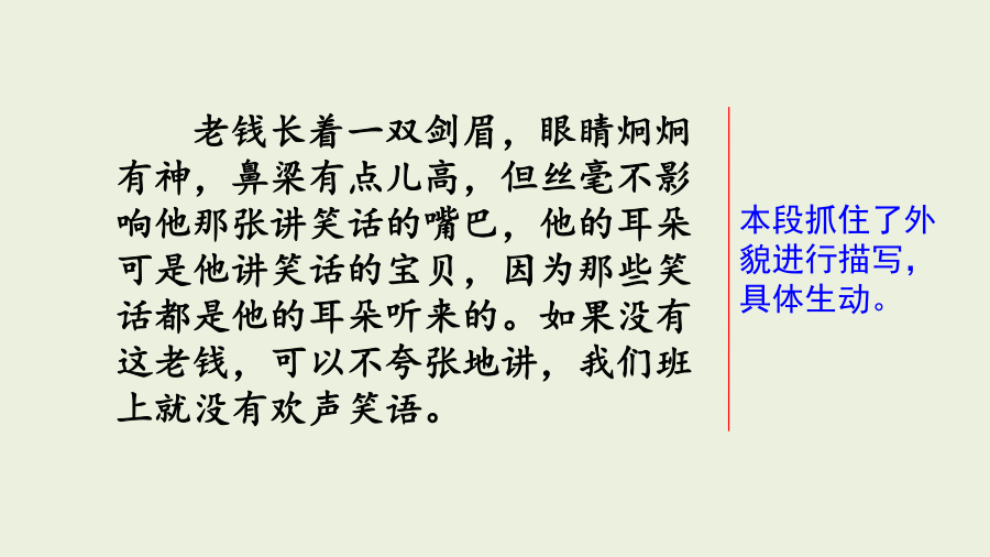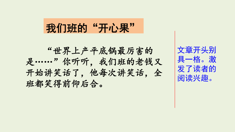 我们班的“开心果”老钱长着一双剑眉,眼睛炯炯有神,鼻梁有点儿高,但丝毫不影响他那张讲笑话的嘴巴,他的耳朵可是他讲笑话的宝贝,因为那些笑话都是他的耳朵听来的。如果没有这老钱,可以不夸张地讲,我们班上就没有欢声笑语。老钱讲笑话总是惹得大家听得忘了时间。有一次课间,老钱又讲笑话给大家听了,他说:“从前有一个笨蛋,来到了一个国家。他遇到了一个卖火腿的人,那个人大声叫:卖火腿咯,卖火腿咯……笨蛋就以为全世界的腿都是火腿……”听着听着就上课了,老钱还在滔滔不绝地讲着笑话,同学们也没有听到上课铃声,继续围在他周围听笑话。他们听得太专心了,以至于老师来了都没发现。老师大怒:“钱艺张!你们在干什么?”同学们一听,顿时一哄而散……听着听着就上课了,老钱还在滔滔不绝地讲着笑话,同学们也没有听到上课铃声,继续围在他周围听笑话。他们听得太专心了,以至于老师来了都没发现。老师大怒:“钱艺张!你们在干什么?”同学们一听,顿时一哄而散……后来,老师罚了他们每人站一节课,这回他们可有苦头吃了。 这就是我们班的“开心果”——钱艺张,哪里有他,哪里就有快乐!后来,老师罚了他们每人站一节课,这回他们可有苦头吃了。 这就是我们班的“开心果”——钱艺张,哪里有他,哪里就有快乐!点评:这篇文章小作者为我们描述了一位能给同学们带来快乐的“开心果”,用词准确,情节设计独特,很吸引人。这一点值得大家学习。