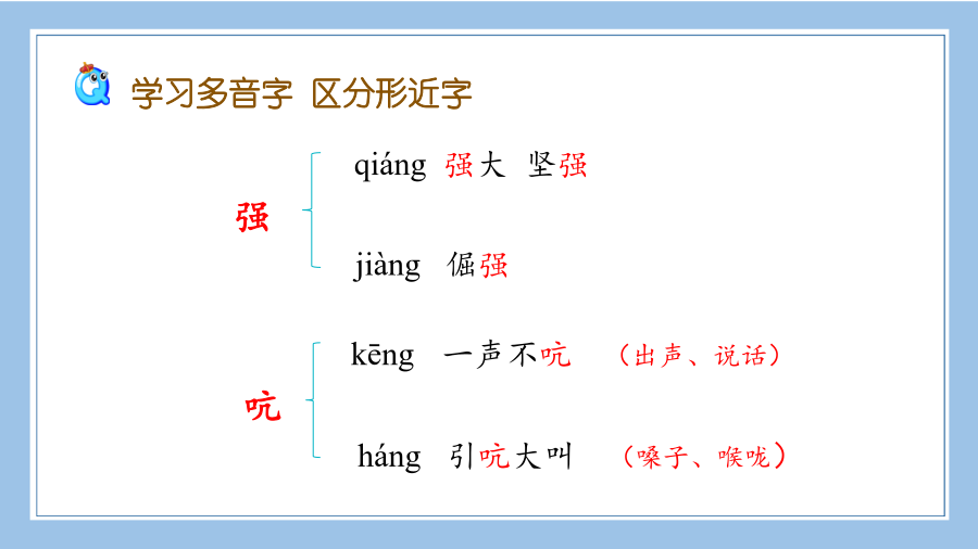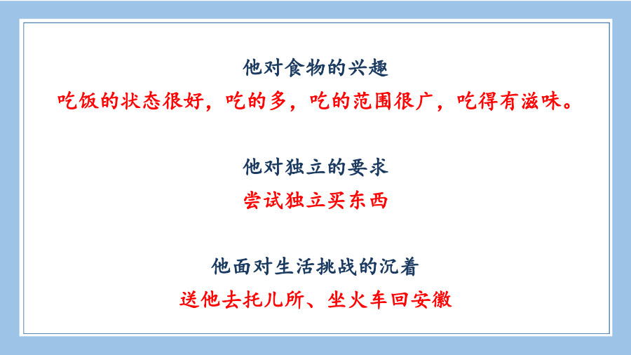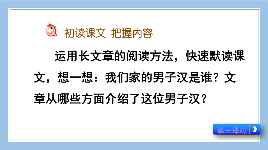 运用长文章的阅读方法,快速默读课文,想一想:我们家的男子汉是谁?文章从哪些方面介绍了这位男子汉?他对食物的兴趣 吃饭的状态很好,吃的多,吃的范围很广,吃得有滋味。 他对独立的要求 尝试独立买东西 他面对生活挑战的沉着 送他去托儿所、坐火车回安徽qiáng强大坚强 强 jiàng倔强 嘱恍惚:看得不真切;不清楚。课后思考: 再读课文,想一想为什么作者称这个孩子为“男子汉”?结合小标题,说说课文主要写了什么内容?默读课文,结合具体事例说一说为什么称这个小男孩是个“男子汉”?从中你感受到作者怎样的情感?不知从什么时候起,和他出去,他不愿让人牵他的手了。一只胖胖的小手在我的手掌里,像一条倔强的活鱼—样挣扎着。有一次,我带他去买东西,他提出要让他自己买。我给了他一角钱。他攥着钱,走近了柜台,忽然又胆怯起来。我说:“你递上钱,我帮你说好了。”“不要,不要,我自己说。”他说。到了柜台前,他又嘱咐我一句:“你不要讲话啊!”营业员终于过来了,他神情有点儿紧张,勇敢地开口了:“同志,买,买,买……”他忘了要买什么东西了。我终于忍不住了:“买一包山楂片。”他好久没说话,潦草地吃着山楂片,神情有些沮丧,我有点儿后悔起来。他仍然很着急,认为自己是非走不可的。姐姐说:“让他从窗口爬进来吧!”我把他抱了起来,他勇敢地抓住窗框,两只脚有力地蹬着车厢,攀上了窗口。窗口边的旅客不约而同地伸手去抱他。他推开那些妨碍他的手,抓住一双最得力的,蹿进了车厢,淹没在拥挤的人群里了。这就是我们家的男子汉。看着他一点儿一点儿长大,他的脸盘的轮廓,他的手掌上的细纹,他的身体,他的力气,他的智慧,他的性格,还有他的性别,那样神秘地一点儿一点儿鲜明,突出,扩大,再扩大,实在是一件最最奇妙的事情。结合着对文章的体会,你能试着给这三部分换个小标题吗?小练笔: 相信在你的成长中,一定也遇到过许多有趣的、烦恼的、有挑战的事情,你是如何面对的?怎样做才能让我们成长为一名“男子汉”“女强人”呢?请你动笔写一写吧!七彩课堂伴你成长以下资料为赠送学习目标陈尧咨(善射)1、联系生活、学习,说说熟能生巧的事例。 2、你认为一个人应该如何看待自己的长处?又如何看待他人的长处?1、课文主要写了和两个场面。人外有人,天外有天。 取人之长,补己之短。 自满人十事九空,虚心人万事可成。 谦受益,满招损。1、正视自己的长处,扬长避短, 2、正视自己的缺点,知错能改, 3谦虚使人进步, 4、人应有一技之长, 5、自信是走向成功的第一步, 6强中更有强中手,一山还比一山高, 7艺无止境 8、宝剑锋从磨砺出,梅花香自苦寒来,刻苦训练才能有所收获,取得成效。 9、骄傲自大、不可一世者往往遭人轻视; 10、智者超然物外