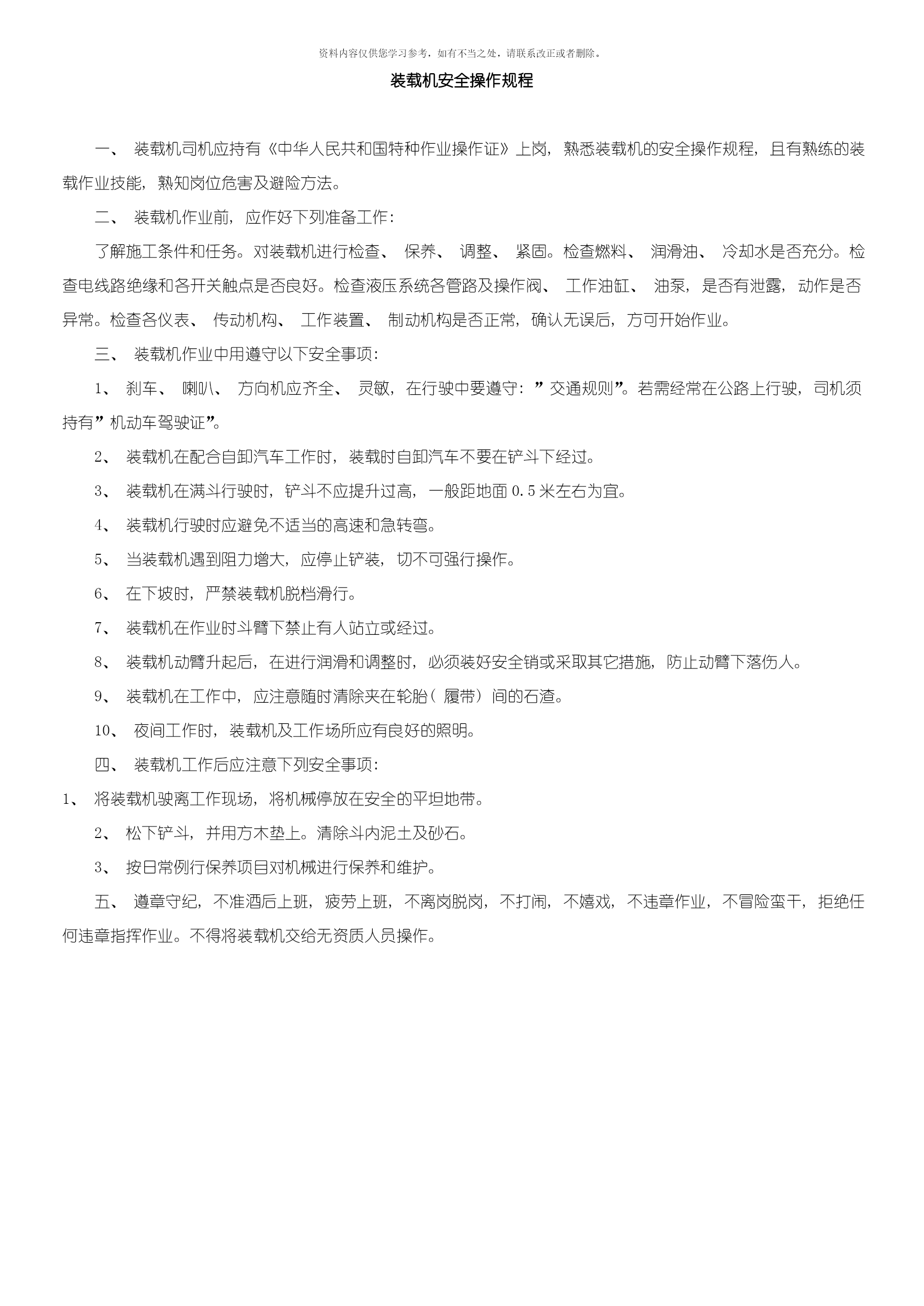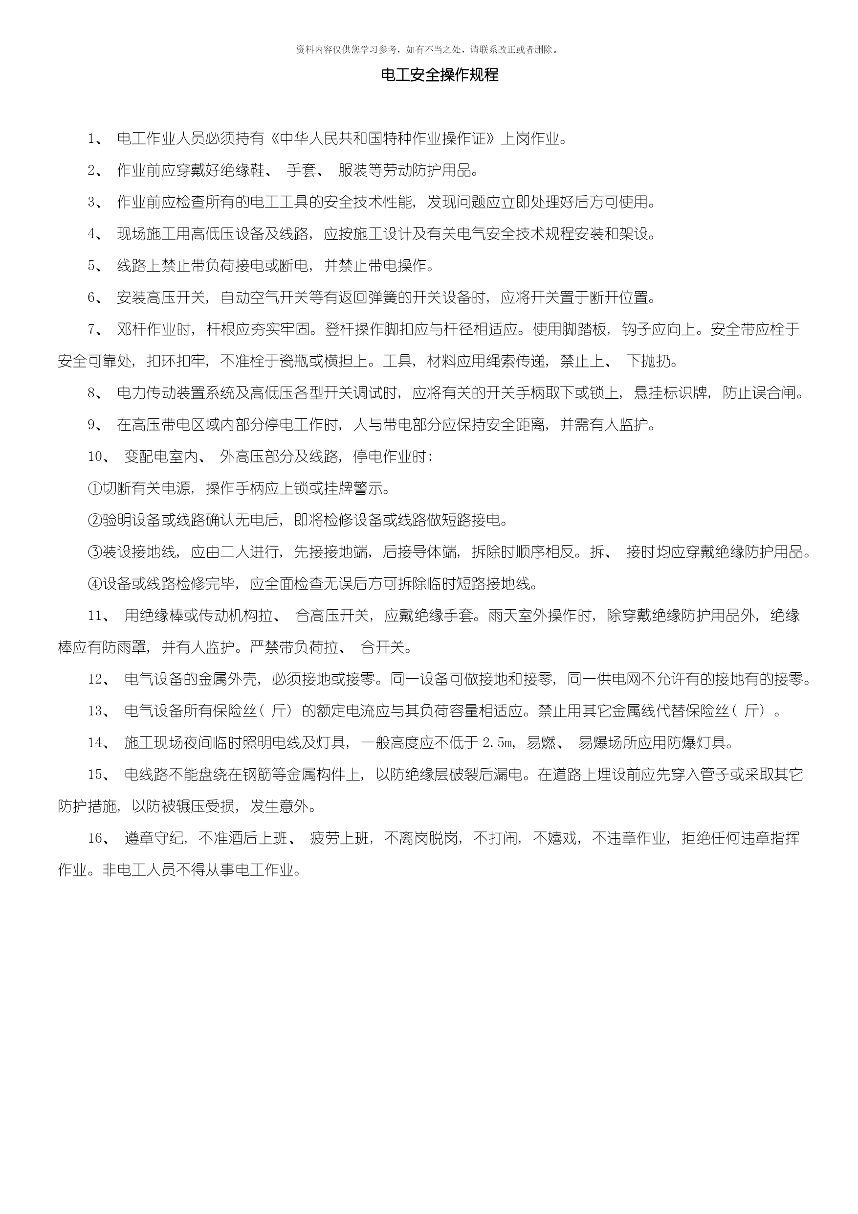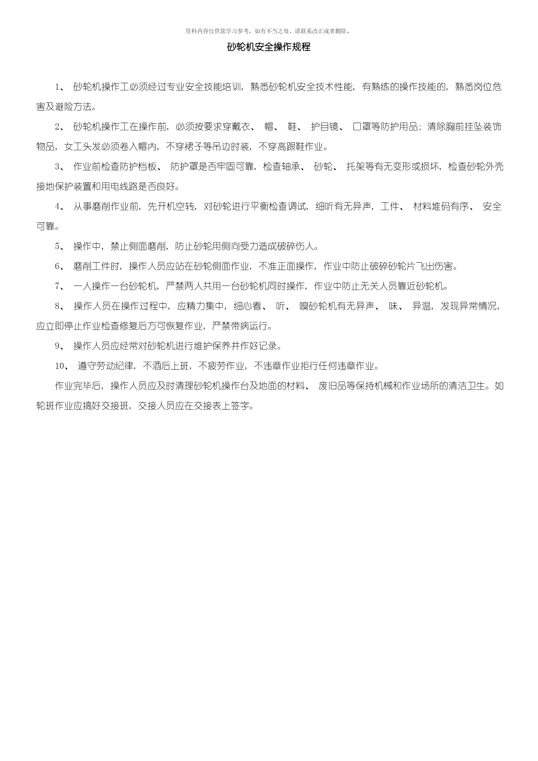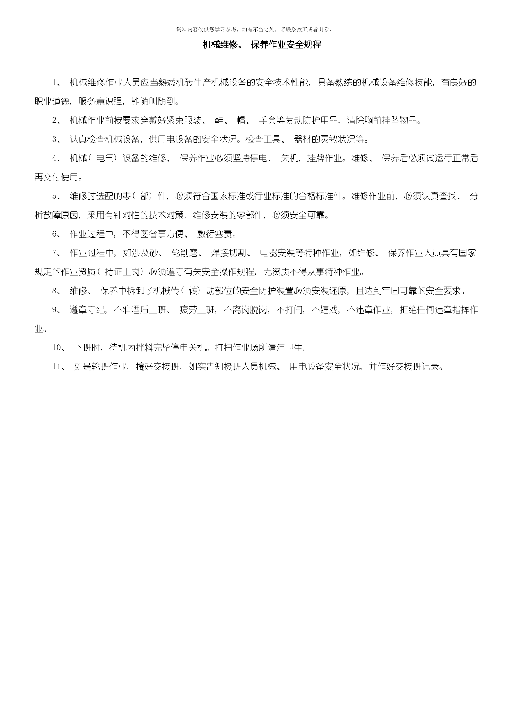 资料内容仅供您学习参考,如有不当之处,请联系改正或者删除。 电焊工安全操作规程 1、电焊作业人员必须持有《中华人民共和国特种作业操作证》上岗作业。 2、电焊作业人员必须佩带符合国家或行业标准的劳动防护用品方可焊割作业。 3、实施作业前,认真检查焊机和导线路的安全技术状况,发现问题应立即整改,必须作好焊接的所有工作后方可作业。 4、电焊机外壳,必须接地良好,其电源的装拆应由电工进行。 5、电焊机要设单独的开关,开关应放在防雨的闸箱内,拉合时应戴手套侧向操作。 6、焊钳与把线必须绝缘良好,连接牢固,更换焊条应戴手套,在潮湿地点工作,应站在绝缘胶板或木板上。 7、严禁在带电和带压力的容器上或管道上施焊,焊接带电的设备必须先切断电源。 8、焊接贮存过易燃、易爆、有毒物品的容器或管道,必须清洗干净,并将所有孔口打开。 9、在密闭金属容器内施焊时,容器必须可靠接地,通风良好,并应有人监护,严禁向容器内输入氧气。 10、焊接预热工件时,应有石棉布或挡板等隔热措施。 11、把线、地线禁止与钢丝绳接触,更不得用钢丝绳索或机电设备代替零线,所有地线接头,必须连接牢固。 12、更换场地移动把线时,应切断电源并不得手持把线爬梯登高。 13、清除焊渣或采用电弧气刨清根时,应戴好防护眼镜或面罩,防止铁渣飞溅伤人。 14、多台焊机在一起集中施焊时,焊接平台或焊件必须接地,并应有阁光板。 15、钍钨板要放置要密闭铅盒内,磨削钍钨板时,必须戴手套,口罩,并将粉尘及时排除。 16、二氧化碳预热器的外壳应绝缘,端电压不大于36V。 17、雷雨时应停止露天焊接作业。 18、施焊场地周围应清除易燃易爆物品,或进行覆盖、隔离。 19、必须在易燃易爆气体或液体扩散区施焊时,应经有关部门检视许可后,方可施焊。 20、工作结束应切断焊机电源,并检查工作地点,确认无起火危险后,方可离开。 21、尊章守纪,不准酒后上班、疲劳上班,不离岗脱岗,不打闹,嬉戏,不违章作业,拒绝任何违章指挥作业。非电焊工作人员不得从事焊工作业。 电工安全操作规程 1、电工作业人员必须持有《中华人民共和国特种作业操作证》上岗作业。 2、作业前应穿戴好绝缘鞋、手套、服装等劳动防护用品。 3、作业前应检查所有的电工工具的安全技术性能,发现问题应立即处理好后方可使用。 4、现场施工用高低压设备及线路,应按施工设计及有关电气安全技术规程安装和架设。 5、线路上禁止带负荷接电或断电,并禁止带电操作。 6、安装高压开关,自动空气开关等有返回弹簧的开关设备时,应将开关置于断开位置。 7、邓杆作业时,杆根应夯实牢固。登杆操作脚扣应与杆径相适应。使用脚踏板,钩子应向上。安全带应栓于安全可靠处,扣环扣牢,不准栓于瓷瓶或横担上。工具,材料应用绳索传递,禁止上、下抛扔。 8、电力传动装置系统及高低压各型开关调试时,应将有关的开关手柄取下或锁上,悬挂标识牌,防止误合闸。 9、在高压带电区域内部分停电工作时,人与带电部分应保持安全距离,并需有人监护。 10、变配电室内、外高压部分及线路,停电作业时: ①切断有关电源,操作手柄应上锁或挂牌警示。 ②验明设备或线路确认无电后,即将检修设备或线路做短路接电。 ③装设接地线,应由二人进行,先接接地端,后接导体端,拆除时顺序相反。拆、接时均应穿戴绝缘防护用品。 ④设备或线路检修完毕,应全面检查无误后方可拆除临时短路接地线。 11、用绝缘棒或传动机构拉、合高压开关,应戴绝缘手套。雨天室外操作时,除穿戴绝缘防护用品外,绝缘棒应有防雨罩,并有人监护。严禁带负荷拉、合开关。 12、电气设备的金属外壳,必须接地或接零。同一设备可做接地和接零,同一供电网不允许有的接地有的接零。 13、电气设备所有保险丝(斤)的额定电流应与其负荷容量相适应。禁止用其它金属线代替保险丝(斤)。 14、施工现场夜间临时照明电线及灯具,一般高度应不低于2.5m,易燃、易爆场所应用防爆灯具。 15、电线路不能盘绕在钢筋等金属构件上,以防绝缘层破裂后漏电。在道路上埋设前应先穿入管子或采取其它防护措施,以防被辗压受损,发生意外。 16、遵章守纪,不准酒后上班、疲劳上班,不离岗脱岗,不打闹,不嬉戏,不违章作业,拒绝任何违章指挥作业。非电工人员不得从事电工作业。 机械维修、保养作业安全规程 1、机械维修作业人员应当熟悉机砖生产机械设备的安全技术性能,具备熟练的机械设备维修技能,有良好的职业道德,服务意识强,能随叫随到。 2、机械作业前按要求穿戴好紧束服装、鞋、帽、手套等劳动防护用品,清除胸前挂坠物品。 3、认真检查机械设备,供用电设备的安全状况。检查工具、器材的灵敏状况等。 4、机械(电气)设备的维修、保养作业必须坚持停电、关机,挂牌作业。维修、保养后必须试运行正常后再交付使用。 5、维修时选配的零(部)件,必须符合国家标准或行业标