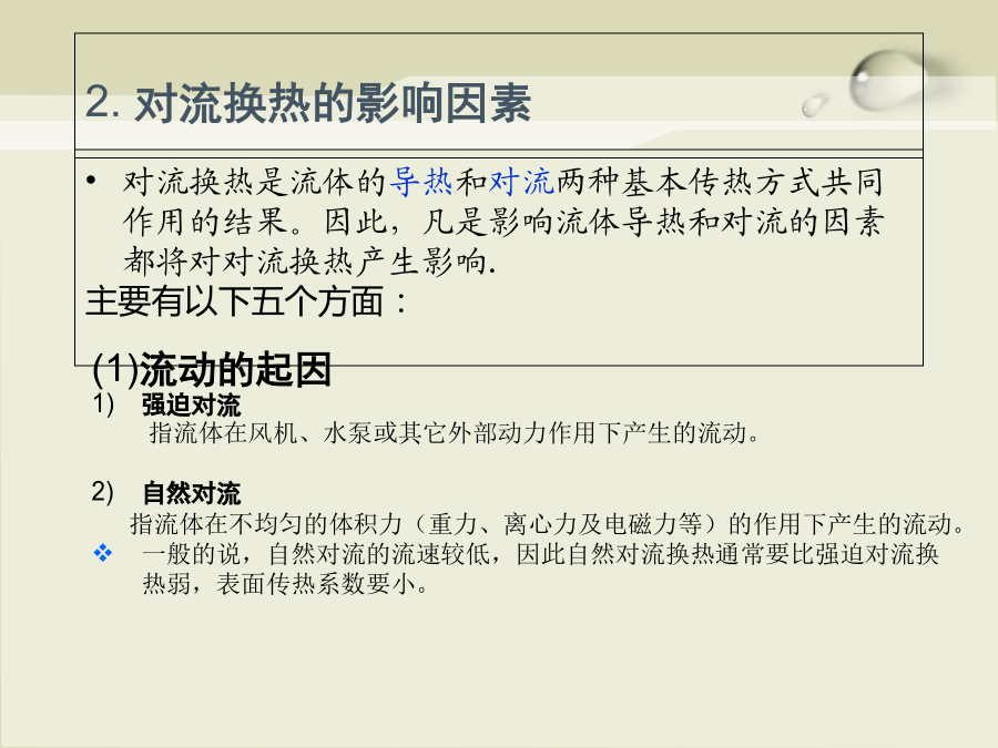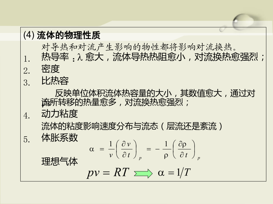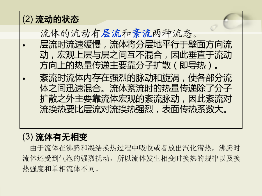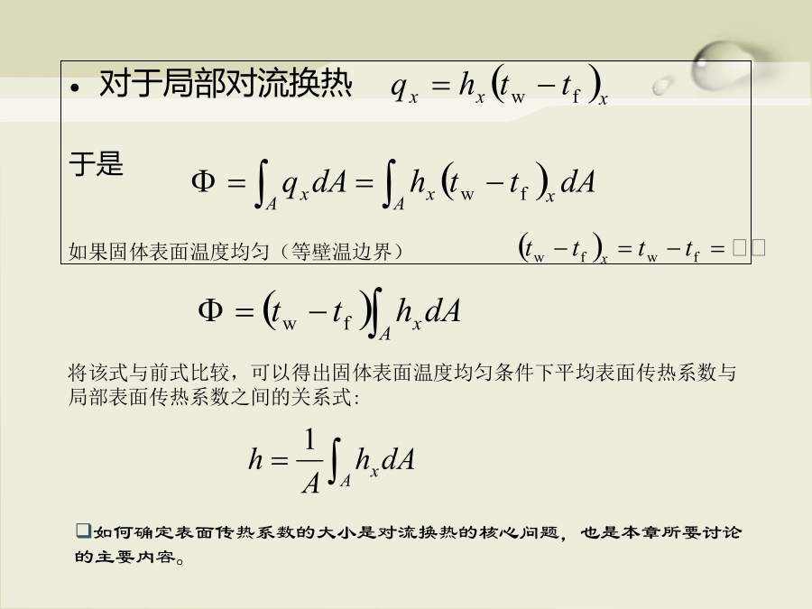 对流换热PPT讲座对于局部对流换热 于是2.对流换热的影响因素(2)流动的状态 流体的流动有层流和紊流两种流态。 层流时流速缓慢,流体将分层地平行于壁面方向流动,宏观上层与层之间互不混合,因此垂直于流动方向上的热量传递主要靠分子扩散(即导热)。 紊流时流体内存在强烈的脉动和旋涡,使各部分流体之间迅速混合。流体紊流时的热量传递除了分子扩散之外主要靠流体宏观的紊流脉动,因此紊流对流换热要比层流对流换热强烈,表面传热系数大。(4)流体的物理性质 对导热和对流产生影响的物性都将影响对流换热。 热导率:愈大,流体导热热阻愈小,对流换热愈强烈; 密度 比热容 反映单位体积流体热容量的大小,其数值愈大,通过对流所转移的热量愈多,对流换热愈强烈; 4.动力粘度 流体的粘度影响速度分布与流态(层流还是紊流) 5.体胀系数 理想气体定性温度 用来确定物性参数数值的温度. 由于流体的物性参数随流体的种类、温度和压力而变化。对于同一种不可压缩牛顿流体,其物性参数的数值主要随温度而变化。在分析计算对流换热时,定性温度的取法取决于对流换热的类型,常用的有: 流体的平均温度 壁面温度 流体与壁面的算术平均温度(5)换热表面的几何因素 换热表面的几何形状、尺寸; 相对位置 表面粗糙度 等几何因素将影响流体的流动状态,因此影响速度分布和温度分布,对对流换热产生显著的影响。综上所述,一般函数关系式可表示为3.对流换热的主要研究方法(2)数值法 对流换热的数值解法应用愈来愈广泛,但由于对流换热控制方程的复杂性,使数值解法的难度和复杂性较大,求解结果需要验证。(4)比拟法 利用热量传递与动量传递在机理上的共性建立起表面传热系数与摩擦系数之间的比拟关系式. 由比较容易进行的流体流动实验获得摩擦系数的数据,再由比拟关系式求出表面传热系数。比拟法曾广泛用于求解紊流对流换热问题,但近些年来由于实验法和数值解法的发展而很少被应用。5-2对流换热的数学描述当流体流过固体表面时,在连续性假设下,由于粘性力的作用,紧靠壁面处的流体是静止的,因此紧靠壁面处的热量传递只能靠导热。根据导热付里叶定律,(1)连续性微分方程(3)能量微分方程方程组的封闭性2)对流换热的单值性条件4)边界条件2.边界层理论与对流换热微分方程组的简化边界层厚度 通常规定速度达到处的y值作为边界层的厚度。 与流动方向的平板长度L相比非常小,相差一个数量级以上。边界层的流态在层流边界层和紊流边界层中间存在一段过渡区。 临界距离 边界层从层流开始向紊流过渡的距离。 大小取决于: 流体的物性 固体壁面的粗糙度等几何因素 来流的稳定度 由实验确定,通常用临界雷锘数给出。 对于流体外掠平板的流动: 2)热边界层(温度边界层)边界层的传热特性:局部表面传热系数的变化趋势两种边界层厚度的比较边界层具有以下几个特征:(2)对流换热微分方程组的简化根据边界层理论: 对微分方程中的各项进行量级分析,可得:对流换热微分方程组可以简化为:简化后方程组只有3个方程,仍然含有等4个未知量,方程组不封闭。 压力p可由主流区理想流体的伯努利方程确定:5-3外掠等温平板层流换热分析解简介常物性、无内热源、不可压缩牛顿流体平行外掠平板稳态对流换热引进下列无量纲变量:将上述无量纲变量分别代入对流换热微分方程组无量纲速度分布:待定特征数 Nu中含有待定的表面传热系数h 已定特征数 Re、Pr完全由已知的单值性条件中的物理量组成2外掠平板层流换热分析结果(2)摩擦系数可看出:成正比,因此可写成:2)温度场的求解结果(2)特征数关联式可以看出 成正比,可写成:平均努塞尔数流体外掠常热流平板层流换热常热流下平均努塞尔数4动量传递与热量传递的比拟无量纲动量微分方程式 能量微分方程式对于同一个对流换热现象来说,二者具有相同的几何条件和物理条件,如果再具有相同的边界条件:分析表明,对于的流体的层流换热和紊流换热,都存在流动边界层与热边界层的类似现象。 这是由于动量传递与热量传递这两种传递现象具有完全相同的物理机理所至。 层流边界层内垂直于壁面:分子扩散 紊流边界层内: 分子扩散与紊流扩散(质点脉动)引入一个新的无量纲数-斯坦登数外掠等温平板层流换热特征数关联式可改写为:雷诺比拟式5-4相似原理指导下的实验研究方法相似特征数 这种无量纲的综合量就是前面提到的特征数.1.相似原理(1)物理现象相似的定义物理现象由等n个物理量描述,则彼此相似的物理现象就有n个对应相似的物理量场,即在所有对应的时间(相似时间)和对应的地点(相似地点):温度变化相似示意图对应瞬间(相似时间) 指时间坐标对应成比例的瞬间。 如前图所示 周期分别为: 对应瞬间的时间坐标:用各自的周期将时间坐标无量纲化 无量纲时间坐标分别为: 对应瞬间的