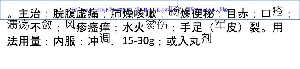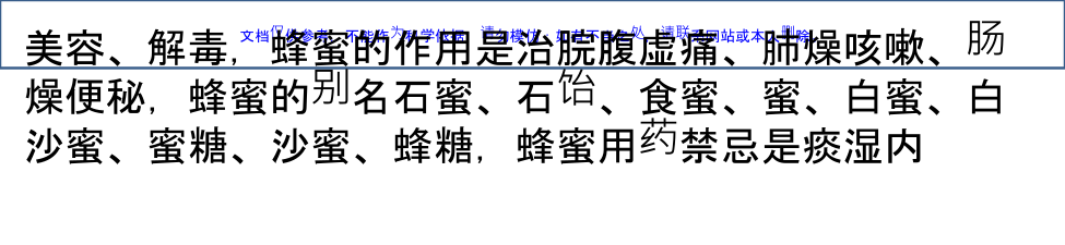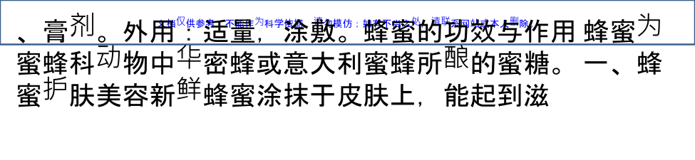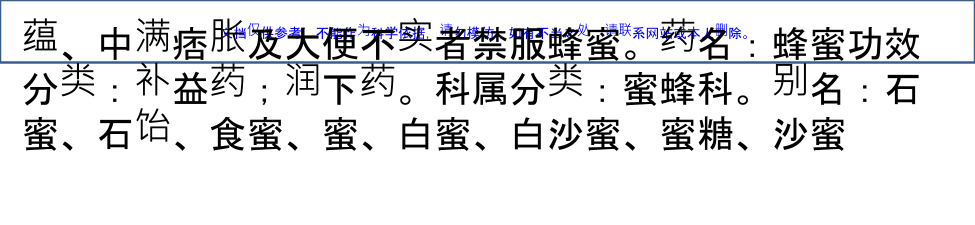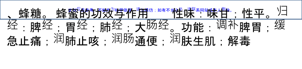 美容、解毒,蜂蜜的作用是治脘腹虚痛、肺燥咳嗽、肠燥便秘,蜂蜜的别名石蜜、石饴、食蜜、蜜、白蜜、白沙蜜、蜜糖、沙蜜、蜂糖,蜂蜜用药禁忌是痰湿内蕴、中满痞胀及大便不实者禁服蜂蜜。药名:蜂蜜功效分类:补益药;润下药。科属分类:蜜蜂科。别名:石蜜、石饴、食蜜、蜜、白蜜、白沙蜜、蜜糖、沙蜜、蜂糖。蜂蜜的功效与作用性味:味甘;性平。归经:脾经;胃经;肺经;大肠经。功能:调补脾胃;缓急止痛;润肺止咳;润肠通便;润肤生肌;解毒。主治:脘腹虚痛;肺燥咳嗽;肠燥便秘;目赤;口疮;溃疡不敛;风疹瘙痒;水火烫伤;手足(军皮)裂。用法用量:内服:冲调,15-30g;或入丸剂、膏剂。外用:适量,涂敷。蜂蜜的功效与作用蜂蜜为蜜蜂科动物中华密蜂或意大利蜜蜂所酿的蜜糖。一、蜂蜜护肤美容新鲜蜂蜜涂抹于皮肤上,能起到滋润和营养作用,使皮肤细腻、光滑、富有弹性。用法:1、蛋蜜膜:新鲜鸡蛋一只,蜂蜜一匙,将两者搅拌均匀,用软刷子涂刷在面部后进行按摩。待自然风干后,用清水洗净。每周再次,具有润肤去皱、益颜美容的功效。2、蜂蜜面膜:用蜂蜜加2-3倍水稀释后,每天涂敷面部。也可用麦片、蛋白加蜂蜜制成面膜敷面,使用时按摩面部10分钟,使蜂蜜的营养成分渗透到皮肤细胞中。3、冬季皮肤干燥,可用少许蜂蜜调和水后涂于皮肤,可防止干裂,可豕蜂蜜代替防裂膏。4、甘油蜂蜜面膜:取一份蜂蜜,半份甘油,三份水,加适量面粉调和后,制成面膜,每次在脸上敷20分钟左右,再用清水洗净,可使皮肤滑嫩,细腻。5、葡萄汁蜂蜜面膜:在一匙葡萄汁中加入一匙蜂蜜,边搅拌加入面粉,调匀后敷面,10分钟后用清水洗去,油性皮肤常使用此法,能使皮肤滑润,柔嫩。二、蜂蜜促进消化蜂蜜对胃肠功能有调节作用,可使胃酸分泌正常。动物实验证实,蜂蜜有增强肠蠕动的作用,可显著缩短排便时间。用法:蜂蜜对结肠炎、习惯性便秘有良好功效,且无任何副作用。蜂蜜可使胃痛及胃烧灼感消失,红细胞及血红蛋白数值长高。患胃十二指肠溃疡的人,常服用蜂蜜,也有辅助作用。三、蜂蜜抗菌消炎、促进组织再生优质蜂蜜在室温下放置数年不会腐败,表明其防腐作用极强。实验证实,蜂蜜对链球菌、葡萄球菌、白喉杆菌等革兰阳性菌有较强的抑制作用。用法:在处理伤口时,将蜂蜜涂于患处,可减少渗出、减轻疼痛,促进伤口愈合,防止感染。四、蜂蜜提高免疫力蜂蜜中含有的多种酶和矿物质,发生协同作用后,可以提高人体免疫力。实验研究证明,用蜂蜜饲喂小鼠,可以提高小鼠的免疫功能。用法:国外常用蜂蜜治疗感冒,咽喉炎,方法是用一杯水加2匙蜂蜜和1/4匙鲜柠檬汁,每天服用3-4杯。五、蜂蜜促进长寿前苏联学者曾调查了200多名百岁以上的老人,其中有143人为养蜂人,证实他们长寿与常吃蜂蜜有关。蜂蜜促进长寿的机制较复杂,是对人体的综合调理,而非简单地作用于某个器官。蜂蜜的作用:一、蜂蜜中含有人体所需的十几种氨基酸,多种活性酶和一些丰富的常量、微量元素。蜂蜜又不含脂肪,这对于老年人、高血压和心脏病患者来说,是最佳的天然食品。二、蜂蜜含有70%以上的转化糖,能够被人体肠壁细胞直接吸收利用,没有必要经人体消化,这对于儿童、老年人以及病后恢复者来说尤为重要;经常服用蜂蜜,能帮助消化。三、蜂蜜具有强烈的杀菌抗菌功效。经常食用蜂蜜,不仅对牙齿无妨碍,还能起到口腔杀菌消毒的作用。将蜂蜜当做皮肤伤口敷料时,细菌无法生长。四4、蜂蜜富含有丰富的矿物质,如有益身心的钾,起镇静作用的镁,强筋健骨的钙,增补血液的铁、铜,健脑的磷和有益身体的各种维生素。五、蜂蜜富含钙和磷,对于儿童骨质的形成和老年人缺钙症是最佳的补品。蜂蜜在人体内产生的热量相当于牛奶的15倍;VB含量与鸡蛋相等,相当于葡萄糖、苹果的16倍。服用蜂蜜能够迅速恢复疲劳,增强耐力,延迟衰老,延年益寿。1、蜂蜜治咳嗽:白蜜一斤,生姜二斤(取汁)。上二味,先秤铜挑,知斤两讫,纳蜜复秤知数,次纳姜汁,以微火煎令姜汁尽,惟有蜜斤两在,止。旦服如枣大,含一九,日三服。禁一切杂食。《千金方》2、蜂蜜解乌头毒:白蜂蜜每次一至四汤匙,温开水冲服。(《上海常用中草药》)3、蜂蜜治上气咳嗽,喘息,喉中有物,唾血:杏仁、生姜汁各二升,糖、蜜各一升,猪膏药二合。上五味,先以猪膏煎杏仁黄,出之,以纸拭令净,捣如膏,合姜汁、蜜、糖等,合煎令可丸。服如杏核一枚,日夜六、七服,渐渐加之。(《干金方》)4、蜂蜜治黯:白蜜和茯苓,涂上。(《补缺肘后方》)5、蜂蜜治阳阴病,自汗出,若发汗,小便自利者,此为津液内竭,虽鞭不可攻之,当须自欲大便:食蜜七合。于铜器内,微火煎,当须凝如饴状,搅之勿令焦著,欲可丸,并手捻作铤,令头锐,大如指,长二寸许,当热时急作,冷则鞭。以纳谷道中,以手急抱,欲大便时乃去之。(《伤寒论》)6、蜂蜜治热油侥痛:白蜜涂之。(《梅师集验方》)7、蜂蜜治高血压,慢性便秘:蜂蜜一两八钱,黑芝麻一两五