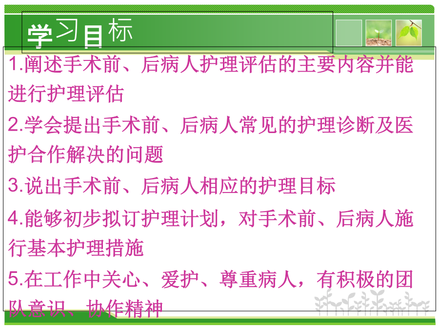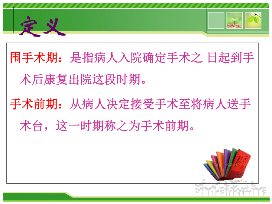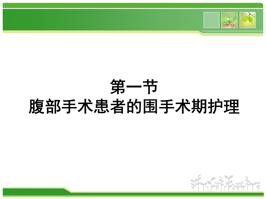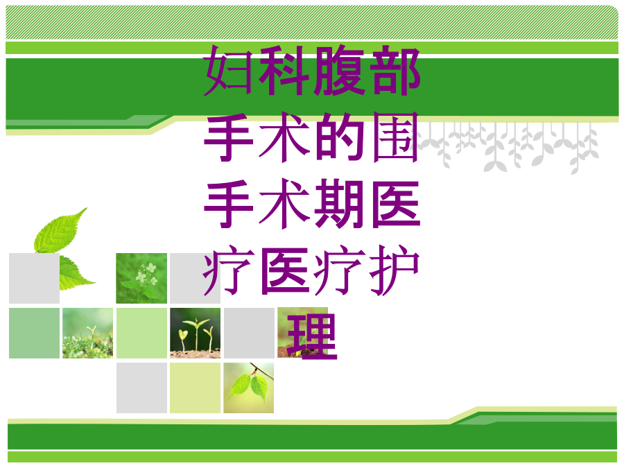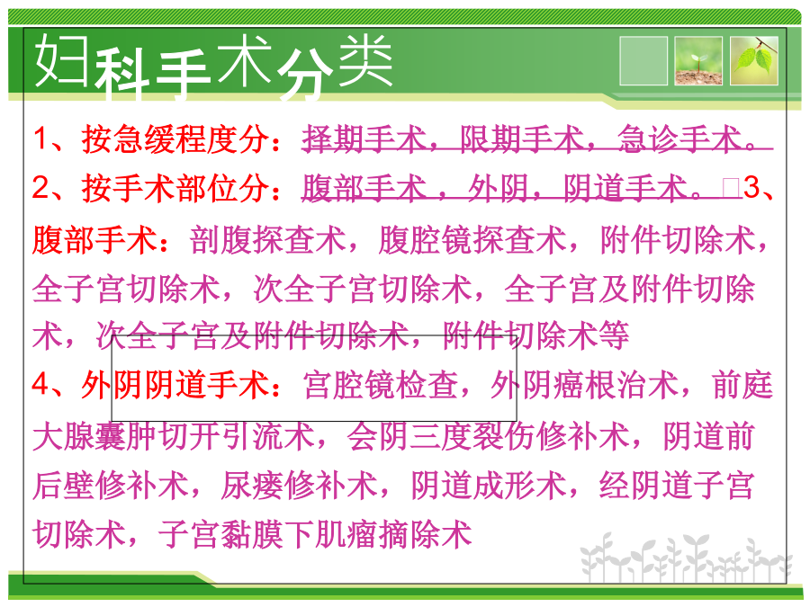妇科腹部手术的围手术期医疗医疗护理学习目标定义妇科手术分类1、按急缓程度分:择期手术,限期手术,急诊手术。2、按手术部位分:腹部手术,外阴,阴道手术。3、腹部手术:剖腹探查术,腹腔镜探查术,附件切除术,全子宫切除术,次全子宫切除术,全子宫及附件切除术,次全子宫及附件切除术,附件切除术等4、外阴阴道手术:宫腔镜检查,外阴癌根治术,前庭大腺囊肿切开引流术,会阴三度裂伤修补术,阴道前后壁修补术,尿瘘修补术,阴道成形术,经阴道子宫切除术,子宫黏膜下肌瘤摘除术 一般情况:年龄、婚姻状况、文化程度、名族;住址、电话; 当前情况:疾病诊断、治疗方案、护理措施; 手术的理由和目的;拟实行的手术;手术的迫切性; 月经史、婚育史、过敏史 既往史、疾病史; 饮食、睡眠等 健康信念(二)身体状况 症状、体征 生命体征 身高、体重、营养状况 原发病的治疗情况 (三)心理社会状况 (四)辅助检查三大常规、出凝血功能、生化、肺功能、ECG、影像学检查护理诊断:1.一般护理2.心理护理3.术前指导4.术前准备:4.术前准备:4.术前准备:4.术前准备:4.术前准备:4.术前准备:4.术前准备:灌肠药剂测T、P、R、BP 皮肤准备:腹部手术备皮范围:上自剑突下,下至两大腿上1/3,包括外阴部。外阴,阴道手术备皮范围上至耻骨联合上10CM,下至会阴部,肛门周围,腹股沟及大腿内侧上1/3,注意清洁脐部。 取下假牙、假发、眼镜、发夹、手表、首饰等。 备好去手术室携带物品:病例、术前用药、X线、CT等摄片等。 按手术需要置胃管,导尿管。 术前半小时给基础麻醉药 与手术室护士交接患者 密切观察病情变化 大出血患者,一边抗休克一边手术。 迅速做好定血型、配血、备皮、药物过敏试验等准备。 禁忌灌肠,不用泻药,不做复杂检查和特殊检查。 做好解释,稳定情绪。 医护人员密切配合,工作迅速、准确。全子宫切除者手术前3日 消毒液的选择:霉菌性阴道炎、 宫颈癌中晚期 手术日晨予以阴道擦洗及 留置导尿。抗生素皮试 利多卡因皮试手术后病人的护理 了解手术类型和麻醉方式,术中情况 (二)身体状况 生命体征:T、P、R(保持呼吸道通畅)、BP 神志 皮肤 疼痛 引流管护理诊断 1、知识缺乏:缺乏有关术后方面的知识。 2、疼痛:与手术创伤、安置引流管有关。 3、尿潴留:与麻醉剂残余作用未完全消失、切口疼痛、病人不习惯在床上排尿有关。1.准备环境2.交接患者根据麻醉方式安置卧位手术后回房即给予腰背部垫薄枕,减轻骶尾部受压,预防压疮,1-2小时更换一次; 回房6-8小时后血压平稳,可定时翻身; 手术12小时后血压平稳,可取半卧位;4.病情观察切口护理:切口愈合分级建立疼痛评估单,评估患者疼痛的部位,程度,频率,性质,时间,必要时遵医嘱给予镇痛药,针剂半小时评估用药效果。 一般术后24小时内疼痛最剧烈,2—3日后逐渐减轻。三、手术后护理引流管种类熟知引流管的作用和通向,切勿接错; 妥当固定,以免脱落或滑入体腔内; 观察、记录引流液的颜色、性状及量; 保持引流通畅,避免压迫或扭曲,必要时采用负压吸引; 保持引流装置无菌,防止污染,引流管皮肤出口处按无菌技术换药,每天更换引流袋; 掌握各类引流管的拔管指征、拔管时间及拔管方法。 护理措施留置尿管护理留置尿管异常情况处理留置尿管异常情况处理7.一般护理(1)术后饮食(2)术后活动(2)术后活动原因原因:若病人术后6—8小时尚未排尿,耻骨上区叩诊有浊音区,基本可确诊为尿潴留。病史汇报诊断:多发性子宫肌瘤 入院后首次护理评估结果:大小便正常,无慢性病史手术史及过敏史,自理能力评分:100分,Braden评分:23分,跌倒评分:0分,营养初筛:0分►术前准备及指导◄►术前准备及指导◄►术前准备及指导◄(4)嘱患者取下首饰,剪指甲,6月9日晨换上宽松的衣裤,准备好术前用物 (5)6月9日7:30留置导尿管,遵医嘱给予术前使用抗生素 (6)6月9日8:10进入手术室前再次检查发卡及首饰未佩戴,与手术交接人员核对病人手腕带、各项检查报告,手术带药及手术名称将病人及病历交给手术室接手术人员,标注手术时间.►术后准备及指导◄术后护理术后护理及指导►出院指导◄病例分析(围手术期病人的整体护理)思考题 1.你从现有资料上有哪些评估发现? 2.为了更好地进行术前准备,还应该评估哪些内容? 3.提出王先生当前的主要护理诊断或医护合作性问题。 4.对王先生的术前护理工作应从哪些方面展开? 王先生护理评估 (一)王先生护理评估的一般情况: 72岁,农民,半年前上腹部时时隐痛不适,伴反酸、嗳气,因担心疾病花费,户外活动减少,常一人睡在床,情绪低落,未去医院诊治。近2月来,上腹疼痛明显,饮食不能缓解,食欲下降、邻居发觉其严重消瘦。 (二)王先生护理评估的身体状况: 近2月来,上腹疼痛