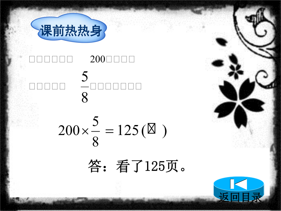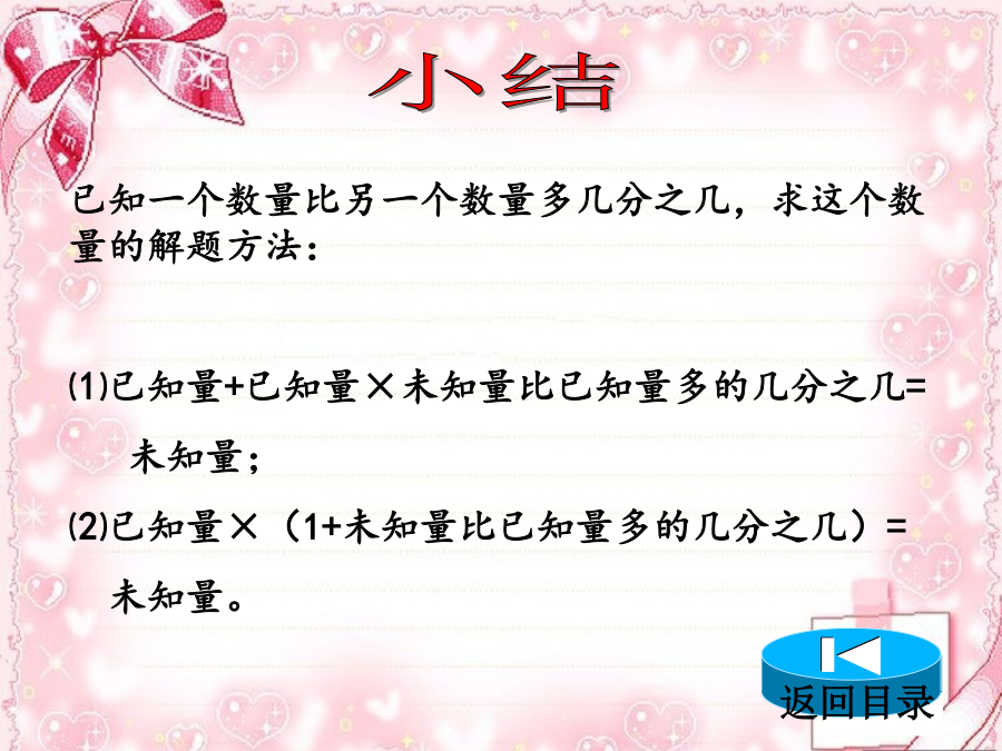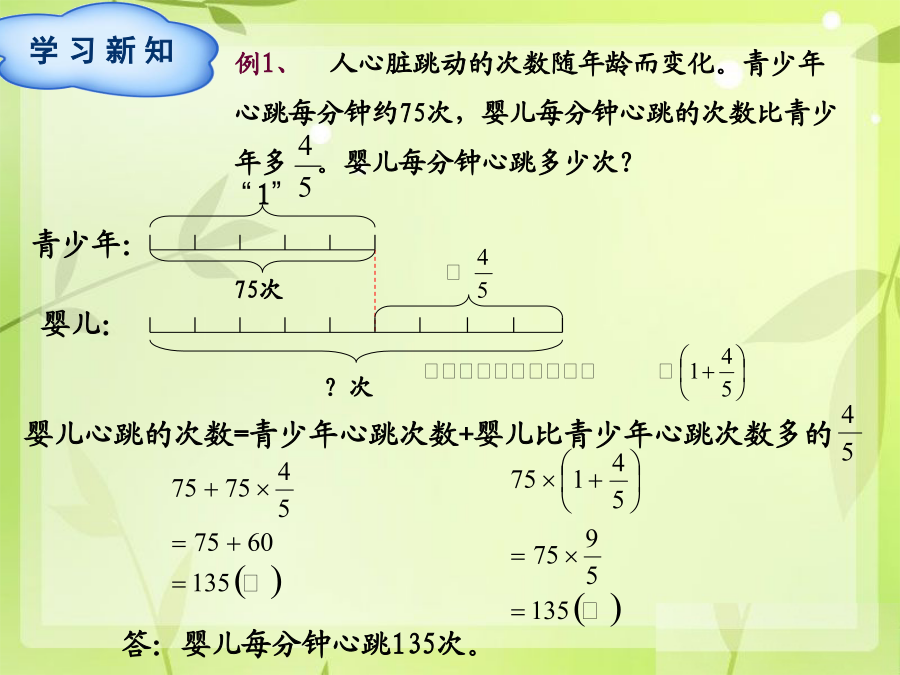 分数乘法解决问题宣讲课前热热身例1、人心脏跳动的次数随年龄而变化。青少年心跳每分钟约75次,婴儿每分钟心跳的次数比青少年多。婴儿每分钟心跳多少次?小结1、(基础题)某养鸡场母鸡有800只,公鸡只数比 母鸡少,公鸡有()只。 列式为: 。 母鸡比公鸡多()只。 列式为: 。 夯实基础3、(重点题)三名同学跳远的测验成绩如下:小东360厘米,小红比小东近,小明比小东远。4、(情景题)六年组三个班去植树,一班植树39棵,二班植的棵树是一班的,三班比二班多植, 三班植树多少棵?5、(易错题)十一黄金周,中山公园第一天门票收入为960元,第二天比第一天多,由于下雨,第三天的门票收入比第二天少,第三天的门票收入是多少钱?6、(竞赛题)甲、乙两车从A,B两地相对开出,经过8小时相遇,甲车行480km,已知乙的速度比甲快。A,B两地相距多少千米?你有什么收获? 还有什么遗憾?谢谢!