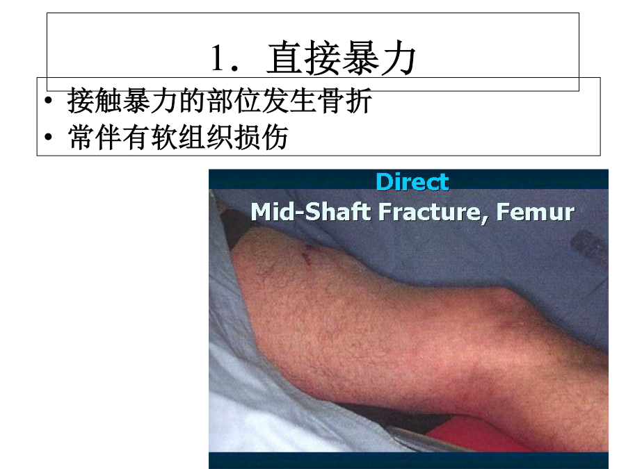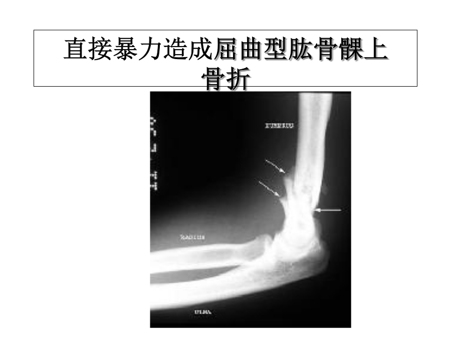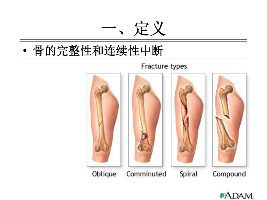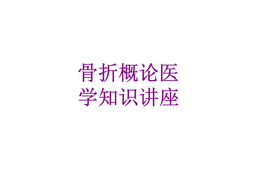 骨折概论医学知识讲座一、定义二、成因1.直接暴力直接暴力造成屈曲型肱骨髁上骨折2.间接暴力间接暴力造成伸直型肱骨髁上骨折3.积累性劳损4.骨骼疾病骨质疏松,轻微外力造成股骨粗隆间骨折三、分类闭合性骨折开放性骨折不完全骨折完全骨折粉碎性骨折稳定性骨折不稳定性骨折骨骺骨折四、骨折段移位(远端相对于近端)原发移位多与外力方向相符 继发移位受肌肉牵拉影响明显 如股骨骨折移位明显且不稳定五、临床表现1.畸形桡骨远端骨折,背侧移位,称Colles骨折,餐叉样畸形股骨颈骨折,下肢外旋、缩短2.异常活动3.骨擦音或骨擦感4.局部疼痛压痛5.肿胀和瘀斑6.活动障碍7.全身表现六、X线检查七、常见并发症1.脂肪栓塞综合征(1)表现(2)处理2.骨筋膜室综合征(1)骨筋膜室(2)病理(3)早期表现(4)晚期表现—5p’s(6)后果很严重!(7)防治3.关节僵硬持续被动功能锻炼八、骨折愈合过程1.血肿机化演进期(约骨折后2周)2.原始骨痂形成期(通常4~8周)3.骨痂改造塑型期(约需8~12周)4.影响骨折愈合的因素治疗方法的影响:股骨颈骨折、股骨头血供破坏,易发生骨不连或缺血坏死胫骨中下段骨折,损伤滋养动脉,血供不足,愈合慢九、骨折急救1.ABC’s2.检查神经血管功能股骨下段骨折腘动脉受压手、足的运动检查手、足的感觉检查肱骨中段骨折损伤桡神经,产生垂腕腓骨头骨折损伤腓总神经,足下垂3.包扎伤口、控制出血4.临时固定5.转运十、治疗骨折的原则1.复位(1)手法复位复位后需检查复位情况,观察肢体外形,抚摸骨折处的轮廓,与健侧对比,并测量患肢的长度,即可了解复位后的大概情况。 X线透视或摄片检查,可进一步正确肯定复位的情况。(2)持续牵引复位骨牵引用不锈钢针穿过骨质,通过牵引弓、绳子及滑车进行牵引。根据需要,调整牵引重量及方向,重量一般用体重的1/7~1/8,对位后要减重量保持对位。牵引时间也可延长到2~3月,适用于一切有移位的成人骨折。 常用的牵引部位有上肢的尺骨鹰咀,尺、桡骨下端,指骨远端;下肢为股骨髁上,胫骨结节,胫骨下端及跟骨。脊柱骨折可行头颅牵引。 (3)手术切开复位解剖复位功能复位的标准2、固定外固定(externalfixation)2)石膏外固定3)持续牵引(皮牵引、骨牵引):可用于复位,也可用来固定,方法及特点在前已述。 牵引的指征: ①股骨闭合性骨折。 ②股骨、胫骨开放性骨折。 ③已感染的开放性骨折。 ④颈椎骨折或脱位。应用牵引时,必须注意按病人年龄、性别、肌肉发达程度及软组织损伤的情况,随时调整牵引的重量,即要达到复位和固定的目的,又要防止过牵和畸形愈合。 内固定3.功能锻炼(1)早期阶段(2)中期阶段(3)晚期阶段骨折临床愈合标准骨折临床愈合时间运动系统解剖生理概要1.骨胳skeleton2.骨胳肌3.关节关节类型谢谢聆听!
