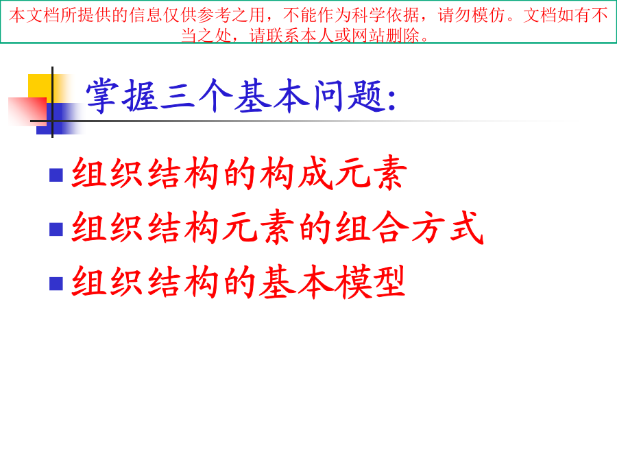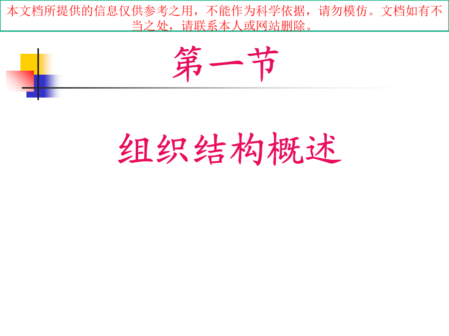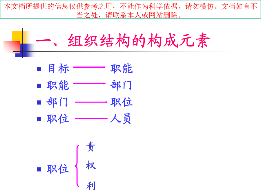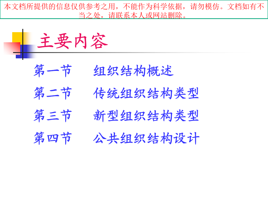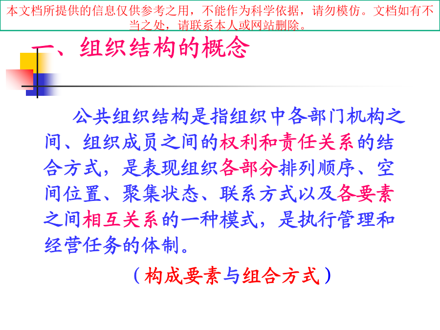 主要内容第一节掌握三个基本问题:一、组织结构的概念一、组织结构的构成元素二、组织结构元素的组合方式四、组织结构的功能第二节掌握两个问题:传统组织结构类型有:一、直线制二、职能制校长省长思考并画出:四、事业部制五、矩阵制提问:第三节新型组织结构类型主要有:委员会制(民主决策导向)团队型(平等协作导向)虚拟型(弹性运行导向)网络型(无边界导向)任务型(任务效率导向)第四节主要内容一、公共组织结构的设计思路2.影响因素 组织环境 组织战略 组织规模 组织技术 权力体制3.设计内容 职能 部门管理幅度和层次设计 职权设计(管理体制) 管理规范设计 二、公共组织结构基本模式——科层制三、公共组织结构现状(以我国政府组织为案例)我国政府组织的纵向层级: 国务院一、国务院秘书机构(1个)国务院办公厅二、国务院组成部委(25个)三、国务院直属机构(16个)四、国务院直属特设机构(1个) 国务院国有资产监督管理委员会五、国务院办事机构(7个)国务院侨务办公室六、国务院直属事业单位(13个)新华通讯社国务院部委管理的局(19个)国务院办公厅——国家信访局国务院议事协调机构(19个)国家国防动员委员会 国家边海防委员会 国务院中央军委空中交通管制委员会 全国爱国卫生运动会 全国绿化委员会 国务院学位委员会 国家防汛抗旱总指挥部 国务院妇女儿童工作委员会 全国拥军优属拥政爱民工作领导小组 国务院残疾人工作委员会 国务院扶贫开发领导小组 国务院关税税则委员会 国家减灾委员会 国家科技教育领导小组 国家军队干部转业安置领导小组 国家禁毒委员会 全国老龄工作委员会 国务院西部地区开发领导小组 国务院抗震救灾指挥部 国家信息化领导小组 国务院安全生产委员会 国务院防治艾滋病工作委员会 国家森林防火指挥部 国务院三峡工程建设委员会 国务院南水北调工程建设委员会 国务院纠正行业不正之风办公室 国务院防范和处理邪教办公室 国务院反垄断委员会 国务院食品安全委员会 国务院深化医药卫生体制改革领导小组 国务院新型农村社会养老保险试点工作领导小组 国务院促进中小企业发展领导小组 中央机构编制委员会 管理体制: 同级组织权力归属关系——行政首长负责制 各级行政部门权力隶属关系——分离制(双重领导) 中央与地方权力分配关系——民主集中制 管理规范: 中华人民共和国宪法 中华人民共和国国务院组织法 中华人民共和国地方各级人民政府组织法我国政府组织结构的生长趋势:课外作业:四、我国公共组织结构改造案例分析案例一:2008年国务院机构改革(横向)本次国务院机构改革主要内容:本次机构改革重点——大部门制的试点推行大部门制改革的背景大部门制改革的必要性大部门制改革的目的本次改革与以往改革的比较2013年国务院机构改革(横向)2013大部制改革方案案例二:省直管县改革(纵向)改革起因:改革进展:改革动因:“市管县”体制的弊端一是过多的行政层级造成管理效率低下,出现“市卡县”现象。 “市管县”体制增加了行政管理的层级,造成行政管理效率的损失。一方面,行政层级的增加,导致信息传递速度的降低和信息失真风险的扩大,上情难以及时准确地下达,下情也难以及时准确地上达,影响行政效率。行政管理的层次增加必然导致更多的政府干预,不利于市场作用的充分发挥。二是城市偏向导致市与县争利,出现“市刮县”现象,县域发展机能弱化。 “市管县”体制实际上是缩小了县级政府的自主权,而扩大了市级政府的管理权限,带有明显的城市偏向性,社会经济资源主要被市所汲取,县只能听命于市,地位被矮化,发展机能弱化;一些中心城市以“摊大饼”的方式盲目无序扩张的现象,与县争资源、争土地、争项目。由此带来耕地流失、农民失地等一系列问题。三是县乡财权与事权不对称,县乡财力弱化。 权力特别是财权集中在市级政府的后果是县财权减少,事权却无法推卸。“市管县”的体制下市级政府上提财权,下压事权的空间很大。县域财政的财源结构单一,财政实力弱;同时财权与事权不对称,财权及财力向上集中,事权及责任不断下移,县级财政处于“小斗进,大斗出”的尴尬境地,个别地市成了县财力的“抽水机”。转移支付制度不完善,中央财政和省市级财政对县乡财政转移支付的规模较小,分配不规范,各种转移支付形式之间缺乏协调。一些地方还存在市级政府截留的现象,县乡财政负债严重。四是“小马拉大车”的城乡格局使市难以带县。 在我国现有的地级市中,除了一部分本身经济实力较强,对周边县具有天然的辐射带动作用的市以外,还有很大部分是在“合并、升格”的大趋势中通过行政指定的方式形成的,经济实力有限,辐射带动作用不强,出现“小马拉大车”的局面,有些市级政府基本上无暇顾及所辖县域经济发展。国务院机构改革和职能转变方案计划表课外思考题: