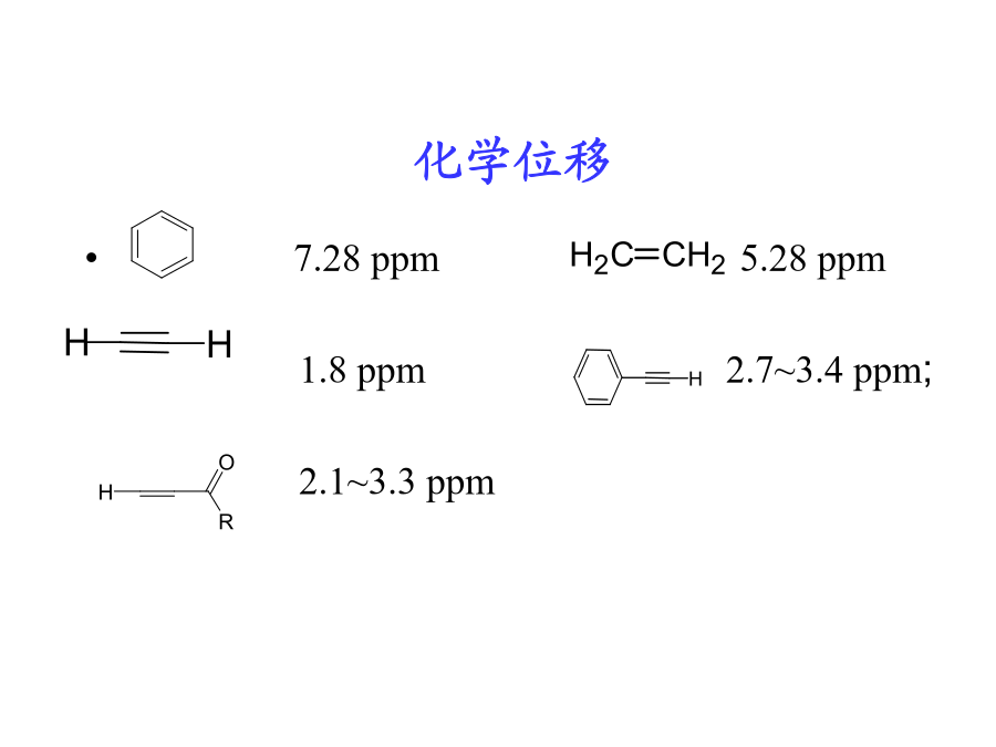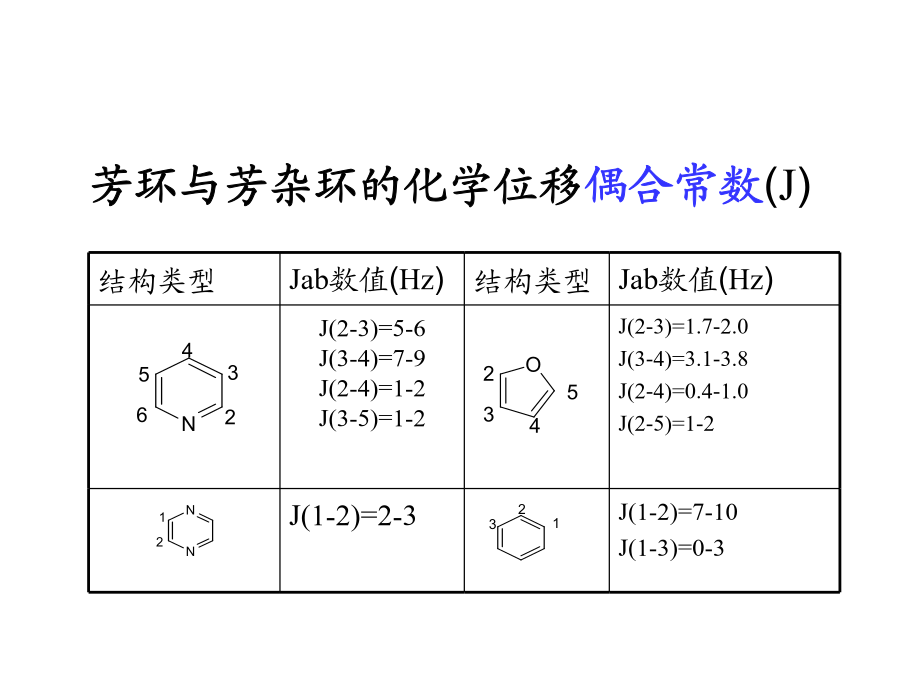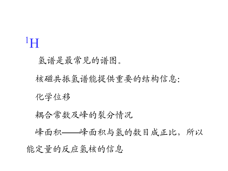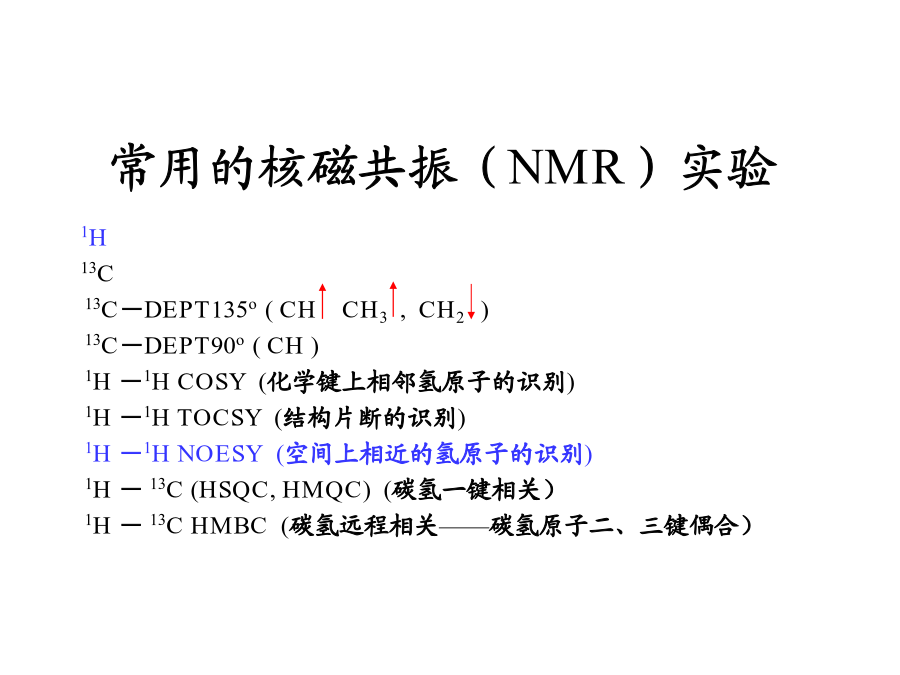 核磁共振谱图解析常用的核磁共振(NMR)实验氢谱是最常见的谱图。 核磁共振氢谱能提供重要的结构信息: 化学位移 耦合常数及峰的裂分情况 峰面积——峰面积与氢的数目成正比,所以能定量的反应氢核的信息 芳环与芳杂环的化学位移偶合常数(J)如何计算耦合常数如何利用耦合常数来区分异构体活泼氢 与O、S、N相连的氢是活泼氢.切记想看活泼氢一定选择氘代氯仿或DMSO做溶剂.在DMSO中活泼氢的出峰位置要比CDCl3中偏低场些.活泼氢由于受氢键、浓度、温度等因素的影响,化学位移值会在一个范围内变化.有时分子内氢键的作用会使峰型变得尖锐.后面附注一些常见活泼氢的核磁谱图。A重水交换在核磁管里加入1-2滴重水即可将活泼氢交换掉CH3(CH2)15CH2CH2SH氟对氢的偶合1H和19F的耦合常数关于手性化合物和前手性化合物中CH2上两个氢的化学位移下面是四氢糖醇的结构图,可以看出手性碳对2,3,4,5位氢的空间上的影响.在前手性化合物当中如:两个乙基是化学等价的,而2与3两个亚甲基中CH2的两个氢是不等价的,由此化学位移不同,两个氢同碳偶合,又受邻位CH3的偶合若无谱线重叠,此CH2可以观察到十六条谱线。请看下面的谱图:用NOESY方法对异构体的鉴别解析:两个通过氢谱难以辨别此化合物是哪个 结构,但用过NOESY可以看到叔丁基只和a一个氢 有NOE相关信号,所以可以确定结构为 如果结构是那么叔丁基应该与a`,b`两 个氢有NOE相关信号。 NOESY 通过羰基对苯环的拉电子作用可以区分1,1`和2,2`的化学位移;但通过3位置氢与1,1`氢有noe,而与2,2`氢没有noe,通过这一点也可以区分1,1`和2,2`的化学位移