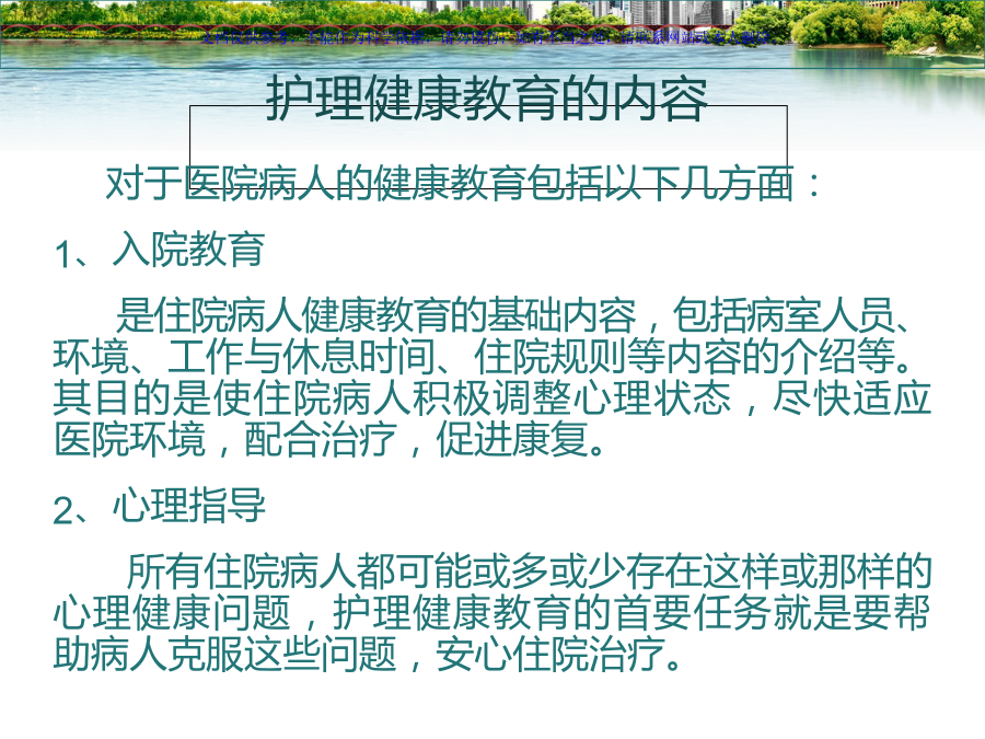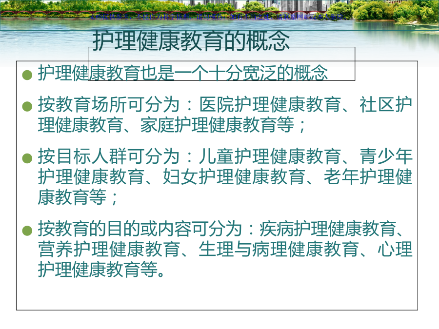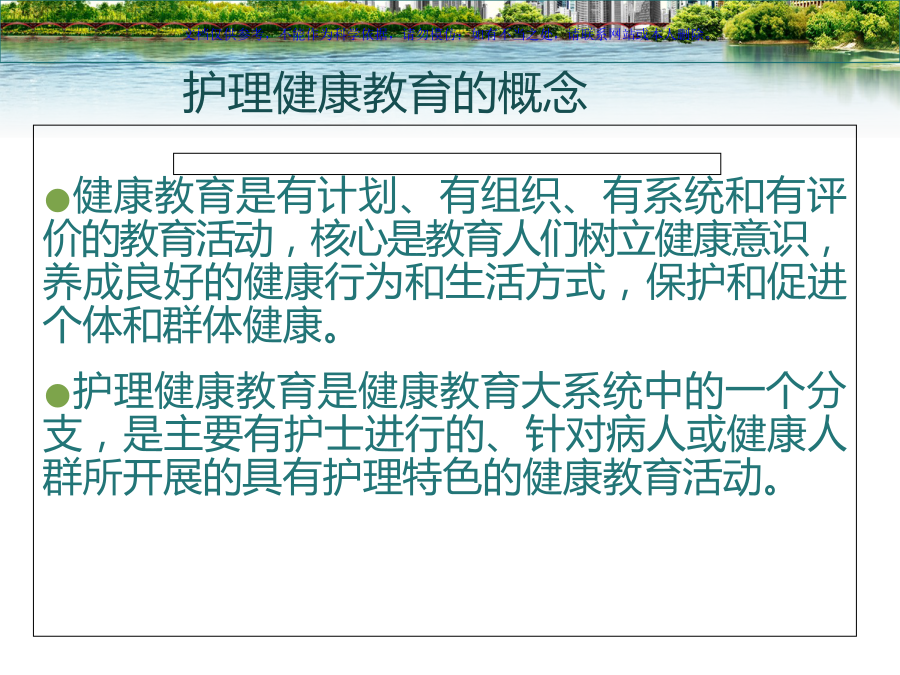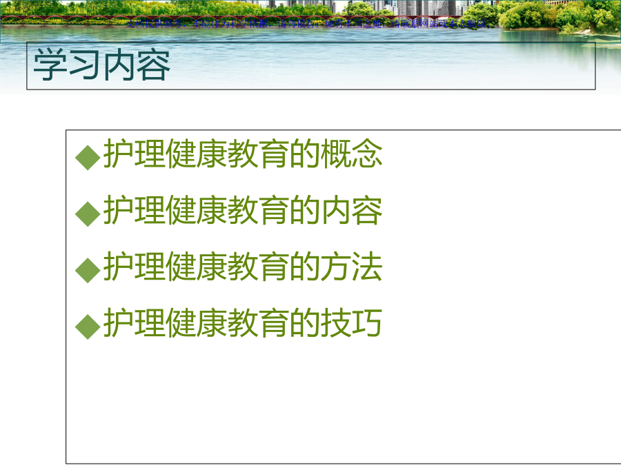 学习内容护理健康教育的概念护理健康教育的概念护理健康教育的概念护理健康教育的内容护理健康教育的基本方法护理健康教育的基本技巧护理健康教育的基本技巧