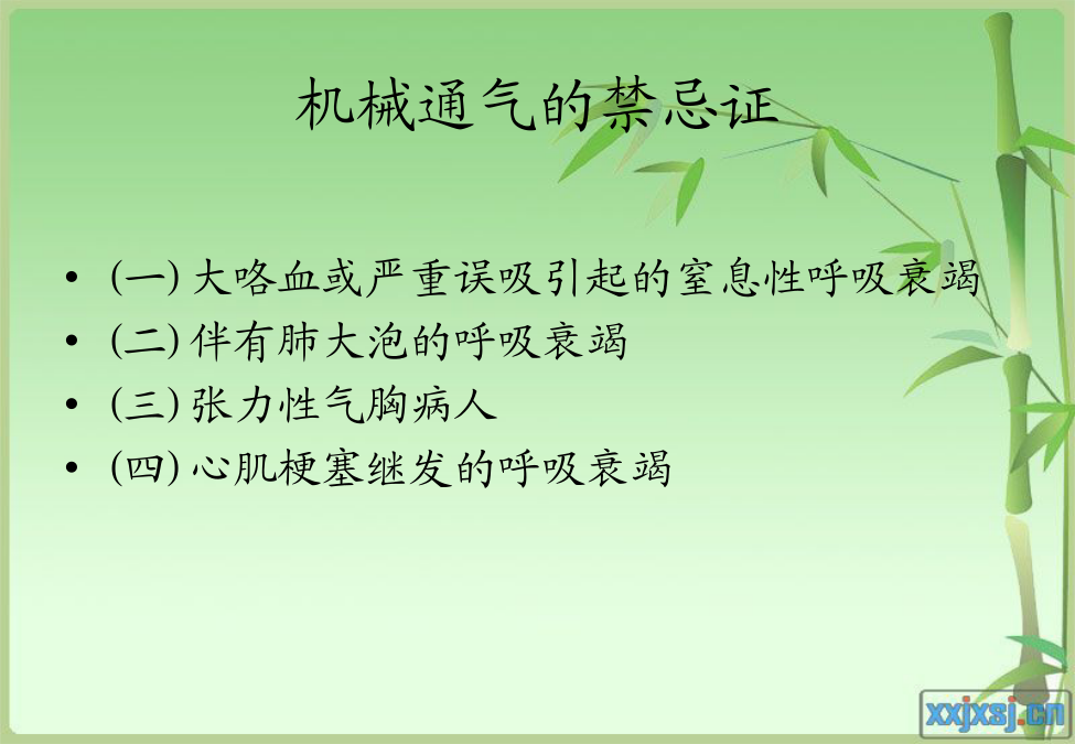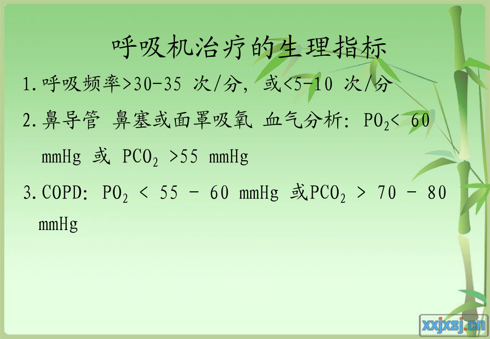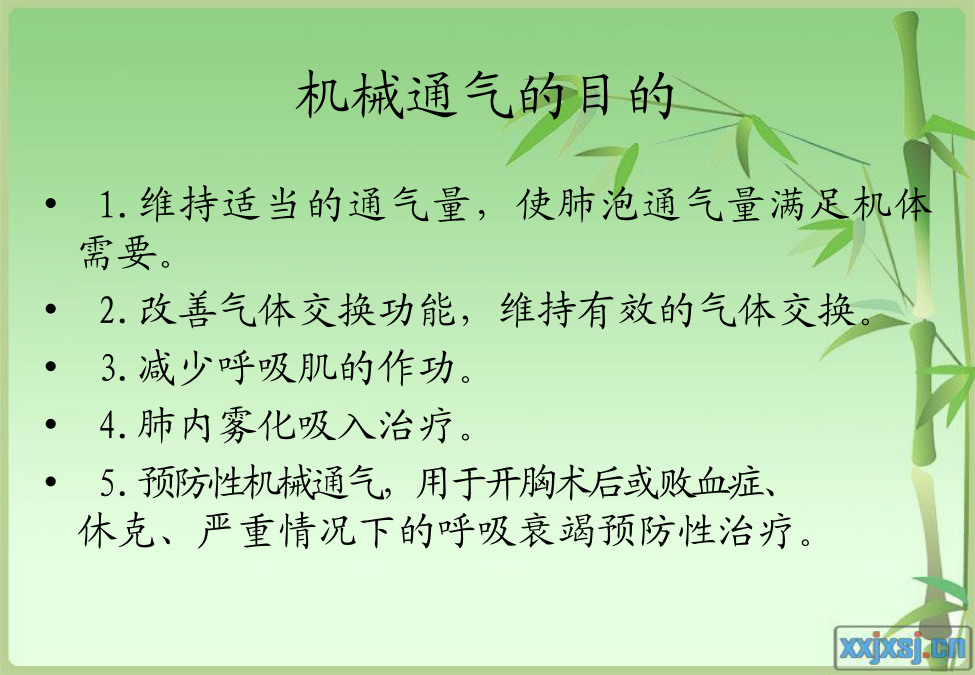 呼吸机使用方法机械通气的目的机械通气的禁忌证呼吸机治疗的生理指标1.确定是否有机械通气的指征。 2.判断是否有机械通气的相对禁忌症, 进行必要的处理。 3.连接电源,打开压缩机及主机开关。 4.首先确定呼吸模式。(A/CSIMVSIMV+叹气) 使用呼吸机的基本步骤2使用呼吸机的基本步骤3患者行呼吸机辅助呼吸后,一般要求在上机半小时,行血气分析,根据其结果调整呼吸机参数,以后每2小时重复检查,防止并发通气过度或通气不足。 一般患者在吸氧浓度40%以下,而血氧分压在60mmHg时,允许24小时行一次血气分析 在行血气分析同时应标注患者抽血时的体温以及吸氧浓度.呼吸机使用中维护呼吸机的消毒湿化器的消毒其他日常消毒呼吸机终末消毒