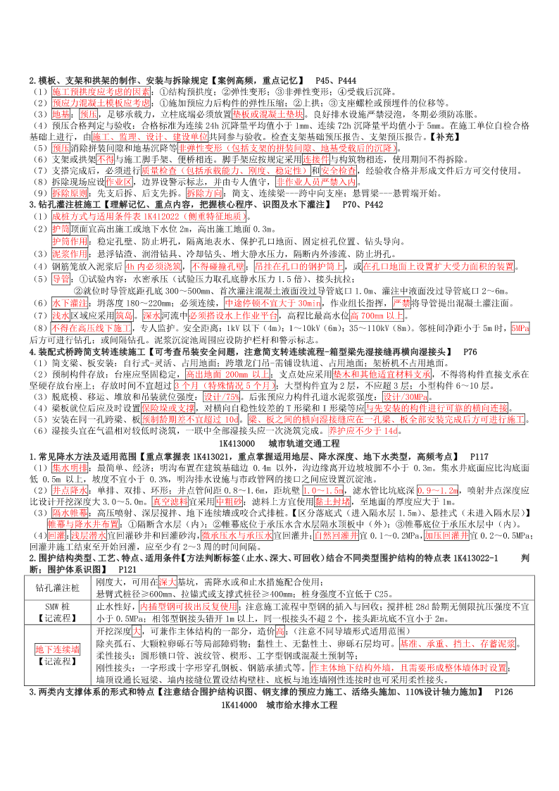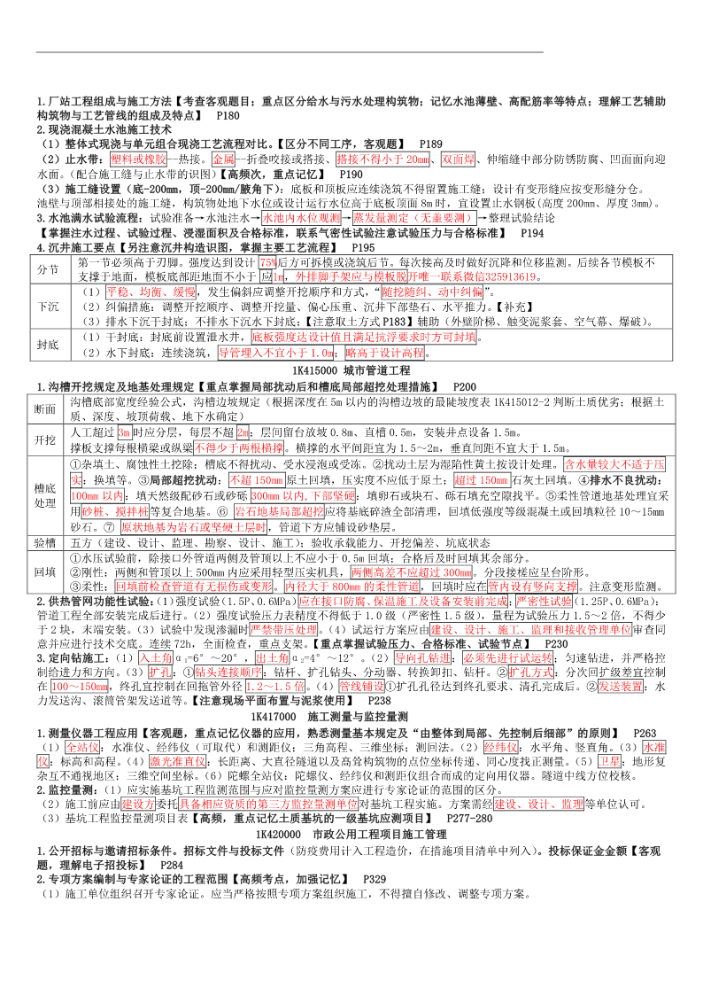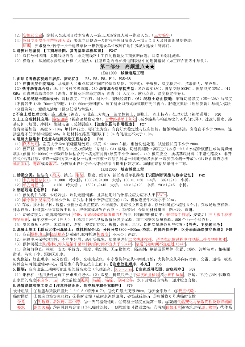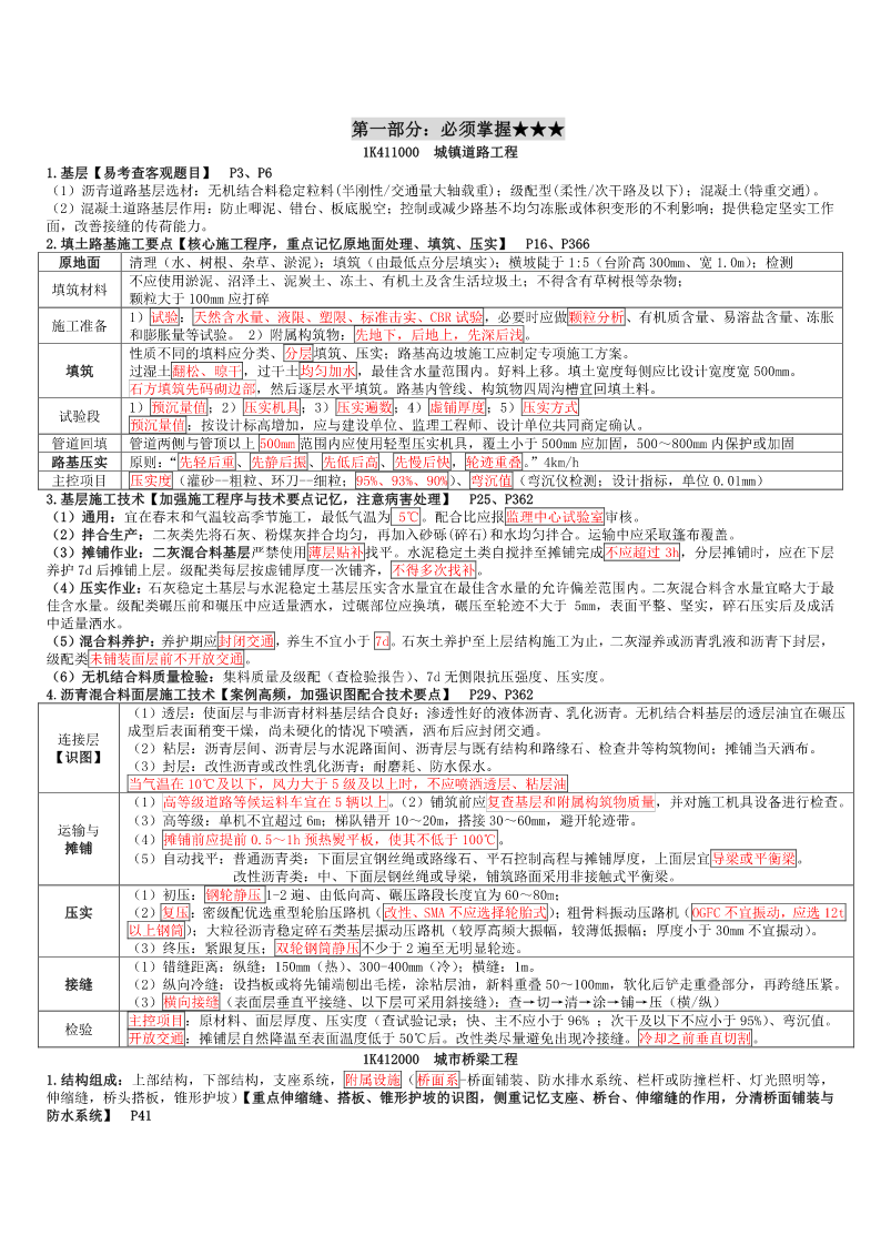 2023年一级建造师《市政实务》考试 重点考点汇总 第一部分:必须掌握★★★ 1K411000城镇道路工程 1.基层【易考查客观题目】P3、P6 (1)沥青道路基层选材:无机结合料稳定粒料(半刚性/交通量大轴载重);级配型(柔性/次干路及以下);混凝土(特重交通)。 (2)混凝土道路基层作用:防止唧泥、错台、板底脱空;控制或减少路基不均匀冻胀或体积变形的不利影响;提供稳定坚实工作 面,改善接缝的传荷能力。 2.填土路基施工要点【核心施工程序,重点记忆原地面处理、填筑、压实】P16、P366 原地面清理(水、树根、杂草、淤泥);填筑(由最低点分层填实);横坡陡于1:5(台阶高300mm、宽1.0m);检测 不应使用淤泥、沼泽土、泥炭土、冻土、有机土及含生活垃圾土;不得含有草树根等杂物; 填筑材料 颗粒大于100mm应打碎 1)试验:天然含水量、液限、塑限、标准击实、CBR试验,必要时应做颗粒分析、有机质含量、易溶盐含量、冻胀 施工准备 和膨胀量等试验。2)附属构筑物:先地下,后地上,先深后浅。 性质不同的填料应分类、分层填筑、压实;路基高边坡施工应制定专项施工方案。 填筑过湿土翻松、晾干,过干土均匀加水,最佳含水量范围内。好料上移。填土宽度每侧应比设计宽度宽500mm。 石方填筑先码砌边部,然后逐层水平填筑。路基内管线、构筑物四周沟槽宜回填土料。 1)预沉量值;2)压实机具;3)压实遍数;4)虚铺厚度;5)压实方式 试验段 预沉量值:按设计标高增加,应与建设单位、监理工程师、设计单位共同商定确认。 管道回填管道两侧与管顶以上500mm范围内应使用轻型压实机具,覆土小于500mm应加固,500~800mm内保护或加固 路基压实原则:“先轻后重、先静后振、先低后高、先慢后快,轮迹重叠。”4km/h 主控项目压实度(灌砂--粗粒、环刀--细粒;95%、93%、90%)、弯沉值(弯沉仪检测;设计指标,单位0.01mm) 3.基层施工技术【加强施工程序与技术要点记忆,注意病害处理】P25、P362 (1)通用:宜在春末和气温较高季节施工,最低气温为5℃。配合比应报监理中心试验室审核。 (2)拌合生产:二灰类先将石灰、粉煤灰拌合均匀,再加入砂砾(碎石)和水均匀拌合。运输中应采取篷布覆盖。 (3)摊铺作业:二灰混合料基层严禁使用薄层贴补找平。水泥稳定土类自搅拌至摊铺完成不应超过3h,分层摊铺时,应在下层 养护7d后摊铺上层。级配类每层按虚铺厚度一次铺齐,不得多次找补。 (4)压实作业:石灰稳定土基层与水泥稳定土基层压实含水量宜在最佳含水量的允许偏差范围内。二灰混合料含水量宜略大于最 佳含水量。级配类碾压前和碾压中应适量洒水,过碾部位应换填,碾压至轮迹不大于5mm,表面平整、坚实,碎石压实后及成活 中适量洒水。 (5)混合料养护:养护期应封闭交通,养生不宜小于7d。石灰土养护至上层结构施工为止,二灰湿养或沥青乳液和沥青下封层, 级配类未铺装面层前不开放交通。 (6)无机结合料质量检验:集料质量及级配(查检验报告)、7d无侧限抗压强度、压实度。 4.沥青混合料面层施工技术【案例高频,加强识图配合技术要点】P29、P362 (1)透层:使面层与非沥青材料基层结合良好;渗透性好的液体沥青、乳化沥青。无机结合料基层的透层油宜在碾压 成型后表面稍变干燥,尚未硬化的情况下喷洒,洒布后应封闭交通。 连接层 (2)粘层:沥青层间、沥青层与水泥路面间、沥青层与既有结构和路缘石、检查井等构筑物间;摊铺当天洒布。 【识图】 (3)封层:改性沥青或改性乳化沥青;耐磨耗、防水保水。 当气温在10℃及以下,风力大于5级及以上时,不应喷洒透层、粘层油 (1)高等级道路等候运料车宜在5辆以上。(2)铺筑前应复查基层和附属构筑物质量,并对施工机具设备进行检查。 (3)高等级:单机不宜超过6m;梯队错开10~20m,搭接30~60mm,避开轮迹带。 运输与 (4)摊铺前应提前0.5~1h预热熨平板,使其不低于100℃。 摊铺 (5)自动找平:普通沥青类:下面层宜钢丝绳或路缘石、平石控制高程与摊铺厚度,上面层宜导梁或平衡梁。 改性沥青类:中、下面层钢丝绳或导梁,铺筑路面采用非接触式平衡梁。 (1)初压:钢轮静压1-2遍、由低向高、碾压路段长度宜为60~80m; 压实(2)复压:密级配优选重型轮胎压路机(改性、SMA不应选择轮胎式);粗骨料振动压路机(OGFC不宜振动,应选12t 以上钢筒);大粒径沥青稳定碎石类基层振动压路机(较厚高频大振幅,较薄低振幅;厚度小于30mm不宜振动)。 (3)终压:紧跟复压;双轮钢筒静压不少于2遍至无明显轮迹。 (1)错缝距离:纵缝:150mm(热)、300-400mm(冷);横缝:1m。 接缝(2)纵向冷缝:设挡板或将先铺端刨出毛槎,涂