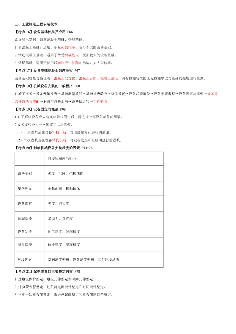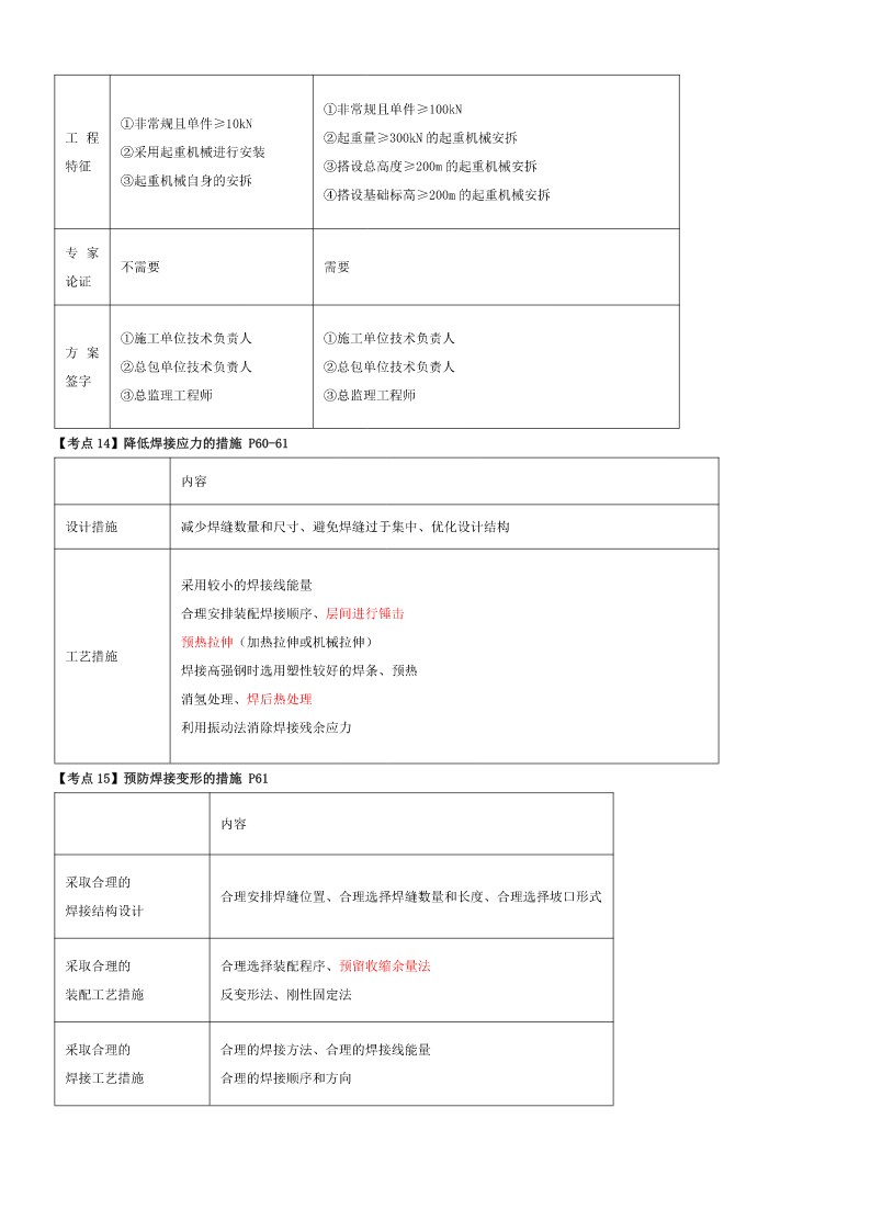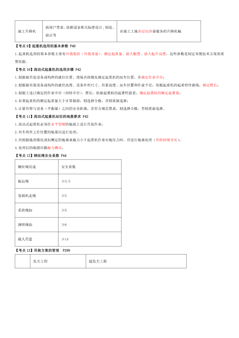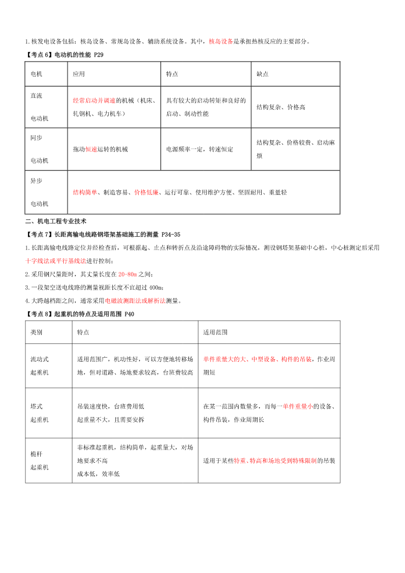2023年一级建造师《机电工程》高频考点汇总 第一章机电工程技术 一、机电工程常用材料及工程设备 【考点1】非金属板材的应用P9 名称适用范围 酚醛复合风管低、中压空调系统及潮湿环境 聚氨酯复合风管低、中、高压洁净空调系统及潮湿环境 玻璃纤维复合风管中压以下空调系统 硬聚氯乙烯风管洁净室含酸碱的排风系统 【考点2】母线槽的分类P15 1.按绝缘方式可分为空气型母线槽、紧密型母线槽和高强度母线槽三种; 2.按导电材料分为铜母线槽和铝母线槽; 3.按防火性能可分为普通母线槽和耐火型母线槽。 (1)空气型母线槽不能用于垂直安装,因存在烟囱效应。 (2)紧密型母线槽可用于树干式供电系统,在高层建筑中广泛应用。 (3)高强度母线槽有一定机械强度,相对紧密型母线槽,其防潮和散热功能有明显的提高。 【考点3】泵、风机、压缩机的性能参数P16-19 名称性能参数 泵扬程、流量、轴功率、效率、转速、必需汽蚀余量 压力(动压静压全压)、流量、功率、效率、 风机 转速、噪声和振动大小 容积、吸气压力、排气压力、流量、工作效率、 压缩机 输入功率、输出功率、性能系数和噪声 【考点4】锅炉的主要参数P20 1.压力和温度; 2.蒸发量:每小时产生的额定蒸汽量,反应锅炉容量大小的指标;热水锅炉用额定热功率来表明其容量的大小。 3.锅炉受热面蒸发率:蒸汽锅炉每平方米受热面每小时产生的蒸汽量。锅炉受热面发热率:热水锅炉每平方米每小时受热面产生的热 量。反应锅炉工作强度的指标; 4.锅炉热效率:锅炉有效利用热量与单位时间内输入热量的百分比,反应锅炉热经济性的指标; 5.锅炉可靠性:锅炉可靠性一般用五项指标考核,即运行可用率、等效可用率、容量系数、强迫停运率和出力系数。 【考点5】核能发电设备P21 1.核发电设备包括:核岛设备、常规岛设备、辅助系统设备。其中,核岛设备是承担热核反应的主要部分。 【考点6】电动机的性能P29 电机应用特点缺点 直流 经常启动并调速的机械(机床、具有较大的启动转矩和良好的 结构复杂、价格高 轧钢机、电力机车)启动、制动性能 电动机 同步 结构复杂、价格较贵、启动麻 拖动恒速运转的机械电源频率一定,转速恒定 烦 电动机 异步 结构简单、制造容易、价格低廉、运行可靠、使用维护方便、坚固耐用、重量轻 电动机 二、机电工程专业技术 【考点7】长距离输电线路钢塔架基础施工的测量P34-35 1.长距离输电线路定位并经检查后,可根据起、止点和转折点及沿途障碍物的实际情况,测设钢塔架基础中心桩,中心桩测定后采用 十字线法或平行基线法进行控制; 2.采用钢尺量距时,其丈量长度在20-80m之间; 3.一段架空送电线路的测量视距长度不宜超过400m; 4.大跨越档距之间,通常采用电磁波测距法或解析法测量。 【考点8】起重机的特点及适用范围P40 类别特点适用范围 流动式适用范围广,机动性好,可以方便地转移场单件重量大的大、中型设备、构件的吊装,作业周 起重机地,但对道路、场地要求较高,台班费较高期短 塔式吊装速度快,台班费用低在某一范围内数量多,而每一单件重量小的设备、 起重机起重量不大,且需要安拆构件吊装,作业周期长 非标准起重机,结构简单,起重量大,对场 桅杆 地要求不高适用于某些特重、特高和场地受到特殊限制的吊装 起重机 成本低,效率低 按用户需求,依据国家相关标准设计、制造、 施工升降机在施工工地各层站停靠服务的升降机械 验证等 【考点9】起重机选用的基本参数P40 1.起重机选用的基本参数主要有吊装载荷(吊装重量)、额定起重量、最大幅度、最大起升高度,这些参数是制定吊装技术方案的重 要依据。 【考点10】流动式起重机的选用步骤P42 1.根据被吊装设备或构件的就位位置、现场具体情况确定起重机的站车位置,在确定作业半径; 2.根据被吊装设备或构件的就位高度、设备外形尺寸、吊索高度、站车位置和作业半径,依据起重机的起重特性曲线,确定臂长; 3.根据上述已确定的作业半径(回转半径)、臂长,依据起重机的起重性能表,确定起重机的额定起重量; 4.如果起重机的额定起重量大于计算载荷,则选择合格,否则重新选择; 5.计算吊臂与设备(平衡梁)之间的安全距离,若符合规范要求,则选择合格,否则重新选择。 【考点11】流动式起重机站位的地基要求P42 1.流动式起重机必须在水平坚硬的地面上进行吊装作业; 2.吊车所在工作位置的地基应进行处理; 3.应根据地质情况或如测定的地基承载力小于起重机作业对地压力时,应进行地基处理(开挖回填夯实); 4.处理后的地面应做耐力测试。 【考点12】钢丝绳安全系数P44 钢丝绳用途安全系数