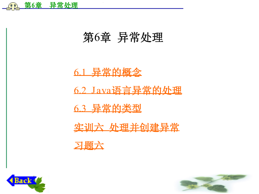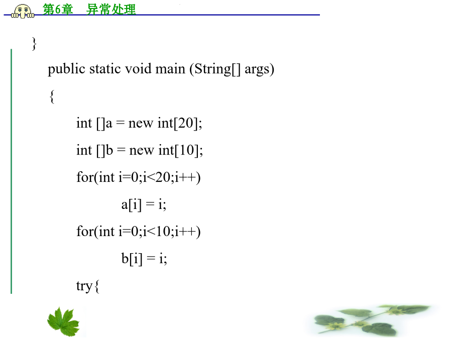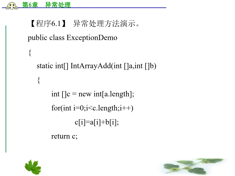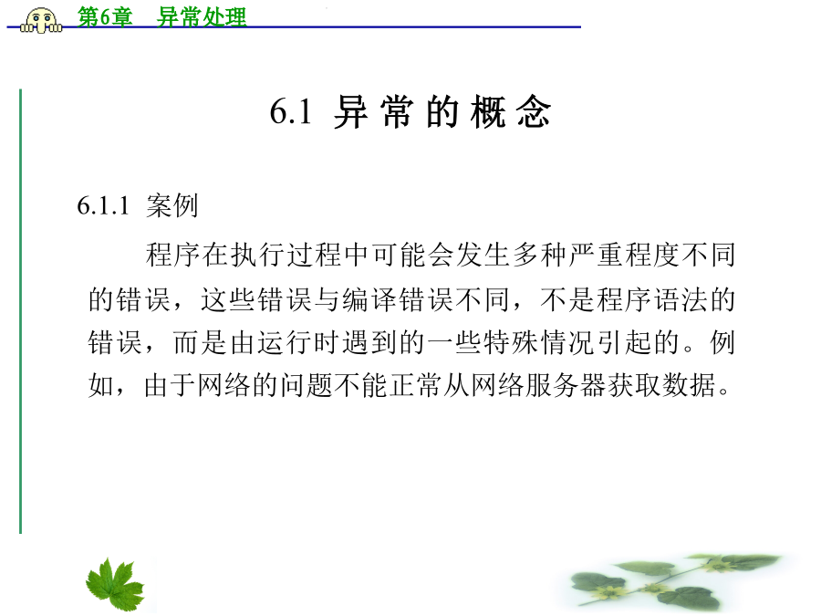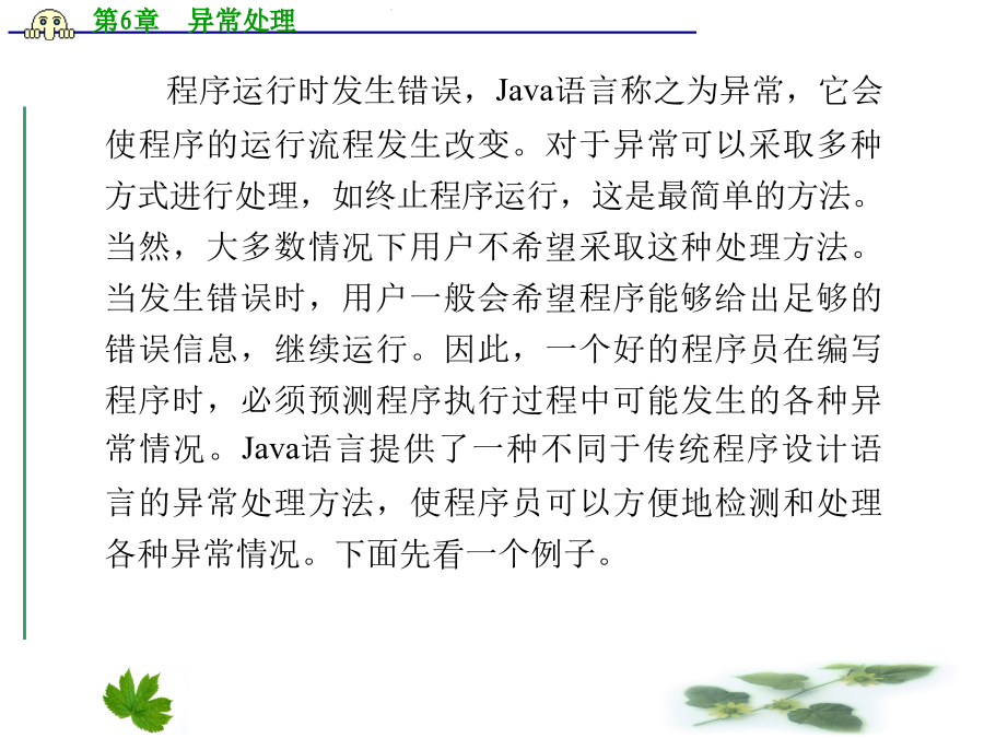 第6章异常处理6.1异常的概念程序运行时发生错误,Java语言称之为异常,它会使程序的运行流程发生改变。对于异常可以采取多种方式进行处理,如终止程序运行,这是最简单的方法。当然,大多数情况下用户不希望采取这种处理方法。当发生错误时,用户一般会希望程序能够给出足够的错误信息,继续运行。因此,一个好的程序员在编写程序时,必须预测程序执行过程中可能发生的各种异常情况。Java语言提供了一种不同于传统程序设计语言的异常处理方法,使程序员可以方便地检测和处理各种异常情况。下面先看一个例子。 【程序6.1】异常处理方法演示。 publicclassExceptionDemo { staticint[]IntArrayAdd(int[]a,int[]b) { int[]c=newint[a.length]; for(inti=0;i<c.length;i++) c[i]=a[i]+b[i]; returnc; } publicstaticvoidmain(String[]args) { int[]a=newint[20]; int[]b=newint[10]; for(inti=0;i<20;i++) a[i]=i; for(inti=0;i<10;i++) b[i]=i; try{int[]c=IntArrayAdd(a,b); for(inti=0;i<c.length;i++) System.out.print(""+c[i]); }catch(Exceptione){ System.out.println("Thereisanerror!"); } } }程序运行结果为: Thereisanerror! 从第3章有关数组的知识可以知道,程序6.1的main方法在调用方法IntArrayAdd对数组b访问时下标超界,产生一个异常。由于程序6.1采用了Java语言中的异常处理方法,程序执行流程发生变化,转到语句System.out.println(“Thereisanerror!”)执行。 6.1.2异常处理 传统的程序设计语言,例如C,需要程序员检测错误发生的原因并进行处理,这样,就需要在正常执行流程中增加一些if-else语句或switch-case语句来检测函数的返回值或全局的错误代码,判断发生了什么类型的错误。这种处理方法使得程序的流程变得复杂,难以阅读理解,而Java语言的异常处理机制使得错误信息的处理和流程控制变得很简单。 观察一下程序6.1可以发现,程序中的错误在IntArrayAdd方法中发生,但是该方法中并没有错误处理语句,既没有用返回值标志错误发生,也没有设置一个main方法和IntArrayAdd方法可以共同访问的变量用于传递错误信息。那么,错误信息是怎样从IntArrayAdd方法传递到main方法的呢? 实际上IntArrayAdd方法在超界访问数组元素时抛掷了一个异常,创建了一个异常对象用于存储错误信息,由于IntArrayAdd方法没有处理该异常,Java虚拟机终止IntArrayAdd方法的执行,然后自动返回到main方法,将流程转入异常处理部分。 与传统的错误处理方法相比,Java语言的异常处理机制有很多优点。它将错误处理代码从常规代码中分离出来,例如程序6.1的main方法中先调用IntArrayAdd方法然后输出结果,中间并没有插入错误处理的代码,而按照传统的方法程序的结构应该是这样的: 调用IntArrayAdd方法 if(发生错误) 输出错误信息 else 输出结果 当错误类型较多,需要分别处理时,采用这种方法很显然会使程序流程变得十分复杂。 异常处理机制带来的另一个好处是错误的传播,Java异常会自动在方法调用堆栈中传播,例如程序6.1异常从IntArrayAdd方法自动传递到main方法。 另外,Java异常处理机制克服了传统方法的错误信息有限的问题,可以针对不同的错误类型定义不同的异常类,异常处理机制会根据异常对象的类型寻找匹配的错误处理代码。 6.2Java语言异常的处理//错误的处理 } finally{ //如果try部分代码执行完或catch部分代码执行完,则执行该部分代码 } try块为程序正常的流程,如果发生异常,则终止try块的执行转入catch块。对于一个try块,可以有多个catch块,每个catch后的异常类名应不同,Java语言根据异常对象的类型从上向下匹配,执行第一个与之匹配的catch块。Java语言中所有的异常类都是Throwable类的子类,用户可以从已有的异常类派生新的类型用于处理用户程序中特有的错误类型。如果找不到匹配的catch块,则该异常继续在调用堆栈中传播,传递