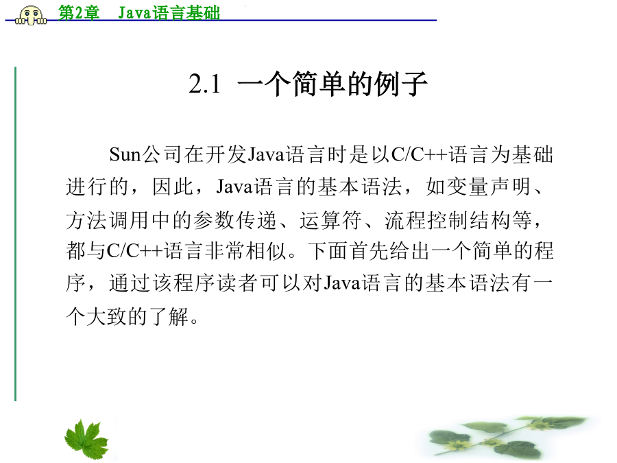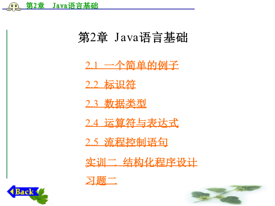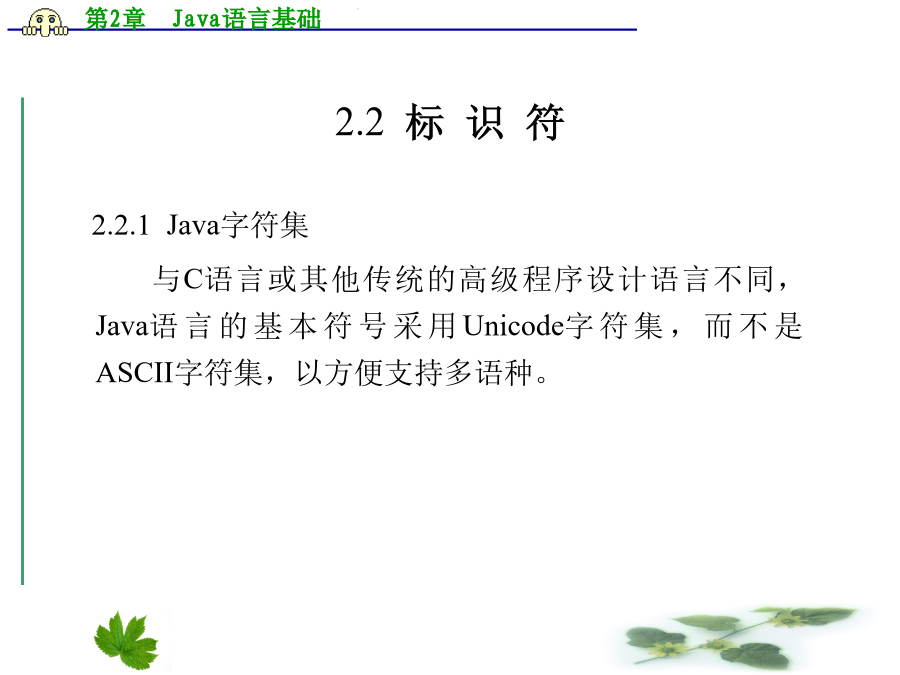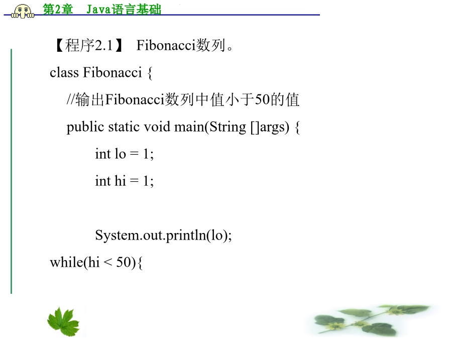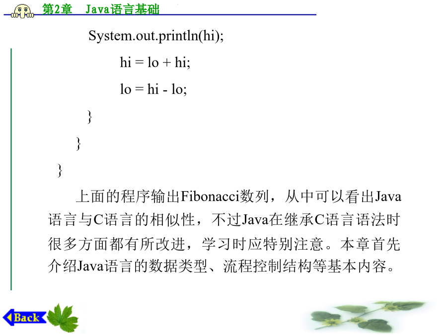 第2章Java语言基础2.1一个简单的例子【程序2.1】Fibonacci数列。 classFibonacci{ //输出Fibonacci数列中值小于50的值 publicstaticvoidmain(String[]args){ intlo=1; inthi=1; System.out.println(lo); while(hi<50){ System.out.println(hi); hi=lo+hi; lo=hi-lo; } } } 上面的程序输出Fibonacci数列,从中可以看出Java语言与C语言的相似性,不过Java在继承C语言语法时很多方面都有所改进,学习时应特别注意。本章首先介绍Java语言的数据类型、流程控制结构等基本内容。 2.2标识符在Unicode字符集中,字母不仅仅限于英语,还包括其他语言的字符,包括汉字。Unicode字符集采用16位编码,一个字符在内存中占用两个字节。虽然现有的多数程序使用ASCII编码,但在运行前都被转换为Unicode字符。 2.2.2标识符构成规则 标识符是变量、类、方法、标号及其他各种用户自定义对象的命名。Java语言的标识符可以由字母、数字、下划线或$符号组成,以字母、下划线或$符开头,区分大小写,对标识符的长度没有特别限定。 Unicode字符集中的字母包括英文字母以及序号大于十六进制数0xC0的字符,因此可以使用汉字作标识符。以下都是合法的Java语言标识符: 变量1,$Str,_var1,myVar 2.2.3关键字 与大多数程序设计语言一样,Java语言也有一些系统保留的标识符,称为关键字或保留字。 目前Java语言用到的关键字有:abstract、boolean、break、byte、byvalue、case、catch、char、class、continue、default、do、double、else、extends、final、finally、float、for、if、implements、import、inner、instanceof、int、interface、long、native、new、null、package、private、protected、public、return、short、static、super、switch、synchronized、this、throw、throws、transient、try、var、volatile、void、while。cast、const、future、generic、goto、operator、outer、rest等也被列为系统保留字,但目前的Java规范并未用到。另外,在VisualJ++中true和false也作为关键字使用。2.3数据类型2.3.1整型 Java语言的整型分为byte、short、int、long四种,它们占用的内存大小及表示范围见表2.1。 表2.1Java整型数据字节数和表示范围与C语言相似,Java语言中的数据也分为常量和变量,常量在程序执行的过程中其值不可改变,而变量的值可以改变。 Java语言中的常量分为两种:一种称为直接量,其字面代表了该常量的值;另一种用标识符表示,定义方法与变量的定义类似,只是需要用关键字final修饰,表示该数据在执行过程中不可修改,Java语言编译器会作相应的检查,如果发现程序中有改变该常量值的语句,编译器将指出错误。 Java语言中的整型直接量可以用十进制、八进制和十六进制表示。十进制表示方法最为常见,如:123、-780。在书写十进制常量时,注意不能以0为打头字符,因为Java语言中以0开始的整型常量被当作八进制处理,例如:017、-0234,都是八进制表示的整型常量。八进制数据使用的数字字符只能是0~7,不能出现8、9。十六进制整型常量以0x或0X开始,例如:0x123、0X1AB,十六进制数据使用的数字字符是0~9和A~F(或a~f)。整型常量中,byte、short、int表示方法相同,而长整型(long)常量必须在数后加字母L或l,表示该数是长整型,例如:0L、306l。 整型变量的定义与C语言相似,例如: byteb;//指定变量b为byte型 shorts;//指定变量s为short型 inti;//指定变量i为int型 longl;//指定变量l为long型 Java语言中的变量与C/C++程序一样,也必须先定义后才能使用,同样,它们也有各自的作用域。Java语言中的变量定义有两种形式:一种是类的成员,将在第3章介绍;另一种是局部变量,在方法或复合语句(由大括号括起的若干语句)中定义,分别在所定义的方法或复合语句中起作用,与C语言的局部变量类似。图2.1是一个简单的例子。 图2.1变量的作