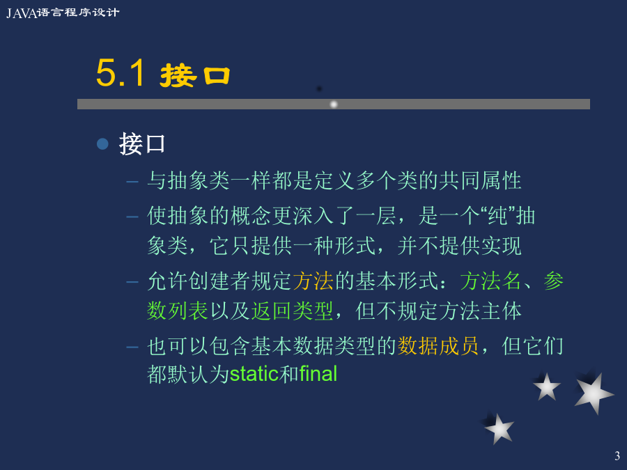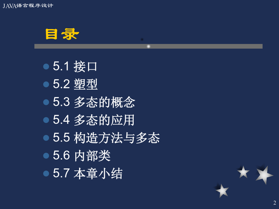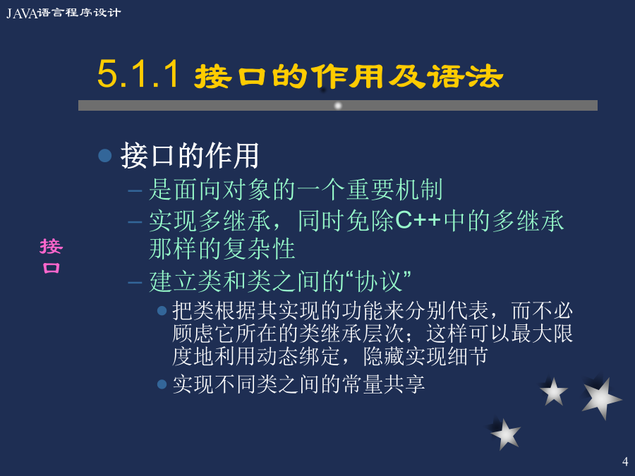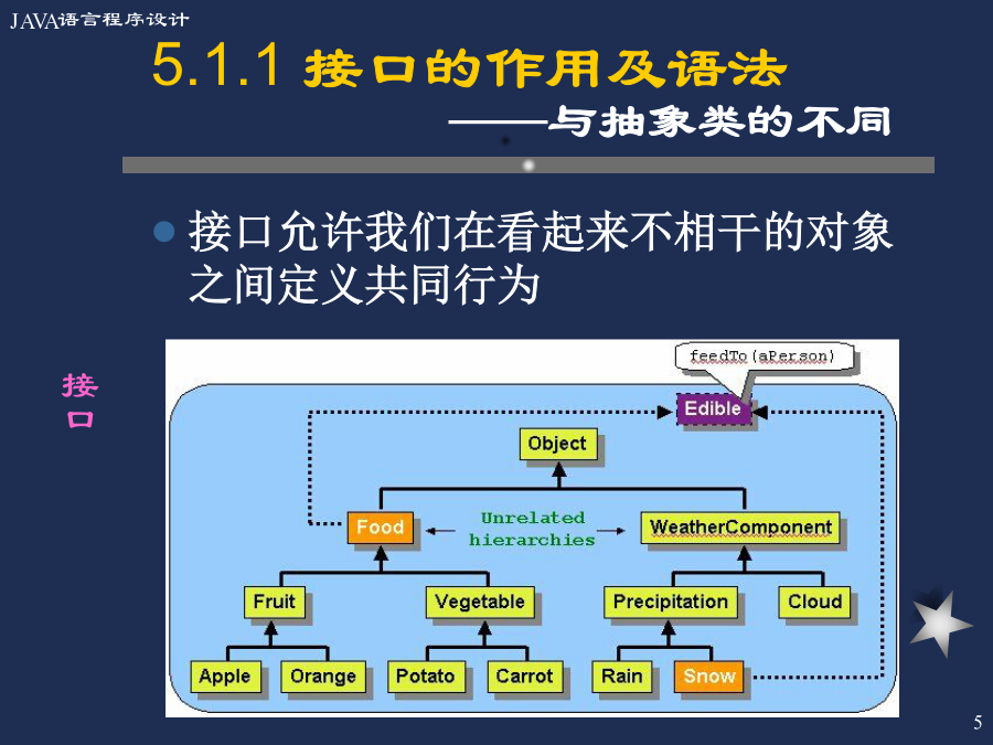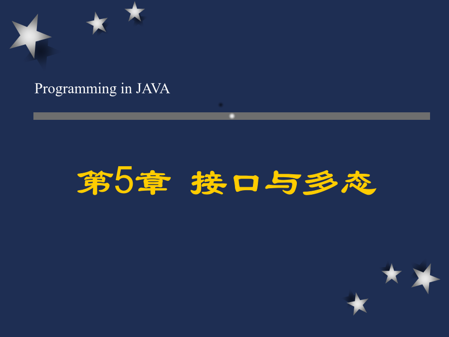 第5章接口与多态目录5.1接口5.1.1接口的作用及语法接口允许我们在看起来不相干的对象之间定义共同行为保险公司的例子 具有车辆保险、人员保险、公司保险等多种保险业务,在对外提供服务方面具有相似性,如都需要计算保险费(premium)等,因此可声明一个Insurable接口 在UML图中,实现接口用带有空三角形的虚线表示接口的语法 声明格式为 [接口修饰符]interface接口名称[extends父接口名]{ …//方法的原型声明或静态常量 } 接口的数据成员一定要赋初值,且此值将不能再更改,允许省略final关键字 接口中的方法必须是“抽象方法”,不能有方法体,允许省略public及abstract关键字例5.1中的Insurable接口声明如下,可见其中的方法都是抽象方法 publicinterfaceInsurable{ publicintgetNumber(); publicintgetCoverageAmount(); publicdoublecalculatePremium(); publicDategetExpiryDate(); }声明一个接口Shape2D,可利用它来实现二维的几何形状类Circle和Rectangle 把计算面积的方法声明在接口里 pi值是常量,把它声明在接口的数据成员里 interfaceShape2D{//声明Shape2D接口 finaldoublepi=3.14;//数据成员一定要初始化 publicabstractdoublearea();//抽象方法 } 在接口的声明中,允许省略一些关键字,也可声明如下 interfaceShape2D{ doublepi=3.14; doublearea(); }5.1.2实现接口实现接口Insurable,声明汽车类实现例5.1中的Insurable接口,实现接口中的所有抽象方法 publicclassCarimplementsInsurable{ publicintgetPolicyNumber(){ //writecodehere } publicdoublecalculatePremium(){ //writecodehere } publicDategetExpiryDate(){ //writecodehere } publicintgetCoverageAmount(){ //writecodehere } publicintgetMileage(){//新添加的方法 //writecodehere } }对象可以被转型为其所属类实现的接口类型 getPolicyNumber、calculatePremium是Insurable接口中声明的方法 getMileage是Car类新添加的方法,Insurable接口中没有声明此方法 Carjetta=newCar(); Insurableitem=(Insurable)jetta;//对象转型为接口类型 item.getPolicyNumber(); item.calculatePremium(); item.getMileage();//接口中没有声明此方法,不可以 jetta.getMileage();//类中有此方法,可以 ((Car)item).getMileage();//转型回原类,可调用此方法了 5.1.2实现接口 ——例5_4测试类 publicclassInterfaceTester{ publicstaticvoidmain(Stringargs[]){ Rectanglerect=newRectangle(5,6); System.out.println("Areaofrect="+rect.area()); Circlecir=newCircle(2.0); System.out.println("Areaofcir="+cir.area()); } } 运行结果 Areaofrect=30.0 Areaofcir=12.56声明接口类型的变量,并用它来访问对象 publicclassVariableTester{ publicstaticvoidmain(String[]args) { Shape2Dvar1,var2; var1=newRectangle(5,6); System.out.println("Areaofvar1="+var1.area()); var2=newCircle(2.0); System.out.println("Areaofvar2="+var2.area()); } } 输出结果 Areaofvar1=30.0 Areaofvar2=12.56 MovableObject接口定义了所有“可