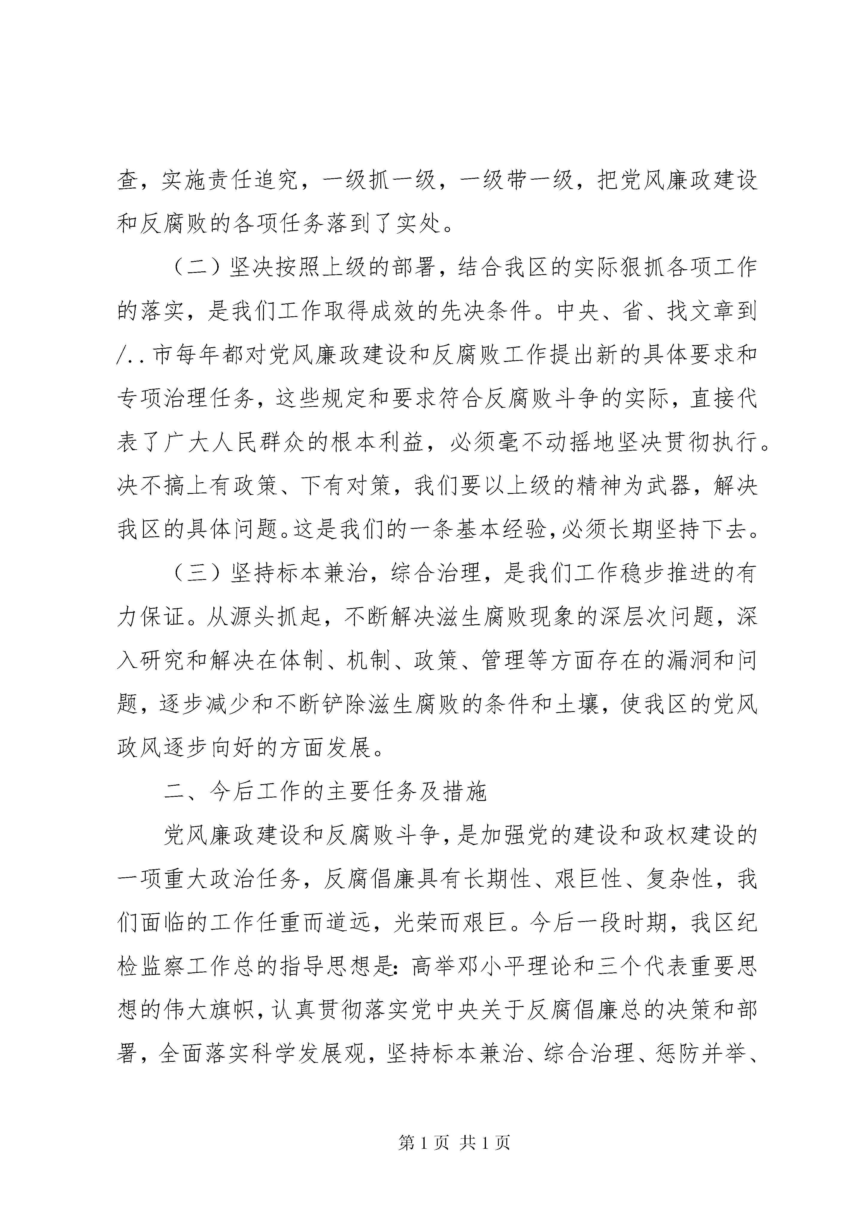 区纪委四年届满工作报告(3)回顾过去的四年,我区党风廉政建设和反腐败斗争之所以取得以上的成绩,是区委和市纪委正确领导的结果;是全区纪检干部勤奋工作的结果;是社会各届和广大人民群众积极支持的结果;也是在座各位代表全力配合的结果。在此,我谨代表区纪委向在座的各位代表,并通过你们向全区广大党员干部和人民群众表示衷心的感谢。同时,我们也应清醒地看到,纪检监察工作还存在不少困难和问题:一是违纪人员的作案手段呈智能化倾向,我们执纪办案的能力与之难相适应;二是反腐倡廉是一项常抓不懈的工作,而个别部门和单位在执纪上有时失之于软、失之于宽;三是少数地方和部门损害群众利益的风气还没有根本好转,服务态度差、办事效率低、群众反映强烈的问题仍然突出。这些问题,有待在今后的工作中认真加以解决。通过过去几年的工作实践,我们对搞好全区的党风廉政建设和反腐败工作有以下三点深切体会。(一)认真落实好党风廉政建设责任制,是我们做好全部工作的关键所在。实践证明,抓党风廉政建设责任制的落实,就等于抓住了龙头,牵住了牛鼻子,就能起到纲举目张的作用,达到事半功倍的效果。过去的四年,全区各级各单位始终坚持党委统一领导,党政齐抓共管,纪委组织协调,部门各负其责,依靠广大群众积极参与的领导体制和工作机制,通过责任分解,督促检查,实施责任追究,一级抓一级,一级带一级,把党风廉政建设和反腐败的各项任务落到了实处。(二)坚决按照上级的部署,结合我区的实际狠抓各项工作的落实,是我们工作取得成效的先决条件。中央、省、找文章到/..市每年都对党风廉政建设和反腐败工作提出新的具体要求和专项治理任务,这些规定和要求符合反腐败斗争的实际,直接代表了广大人民群众的根本利益,必须毫不动摇地坚决贯彻执行。决不搞上有政策、下有对策,我们要以上级的精神为武器,解决我区的具体问题。这是我们的一条基本经验,必须长期坚持下去。(三)坚持标本兼治,综合治理,是我们工作稳步推进的有力保证。从源头抓起,不断解决滋生腐败现象的深层次问题,深入研究和解决在体制、机制、政策、管理等方面存在的漏洞和问题,逐步减少和不断铲除滋生腐败的条件和土壤,使我区的党风政风逐步向好的方面发展。二、今后工作的主要任务及措施党风廉政建设和反腐败斗争,是加强党的建设和政权建设的一项重大政治任务,反腐倡廉具有长期性、艰巨性、复杂性,我们面临的工作任重而道远,光荣而艰巨。今后一段时期,我区纪检监察工作总的指导思想是:高举邓小平理论和三个代表重要思想的伟大旗帜,认真贯彻落实党中央关于反腐倡廉总的决策和部署,全面落实科学发展观,坚持标本兼治、综合治理、惩防并举、注重预防的方针,大力推进惩治和预防腐败体系建设,从教育、制度、监督、查处等方面进一步加大防治腐败的力度,推动全区党风廉政建设和反腐败斗争深入开展,为建设工业xx、商贸xx、城市xx和社会主义新农村,实现全区经济社会发展的新跨越提供纪律保证。(一)深入开展反腐倡廉教育,促进领导干部廉洁从政。一是要进一步建立健全反腐倡廉大宣教的格局。坚持党委统一领导、纪委组织协调、部门各司其职的工作格局,充分发挥区委组织部、宣传部、党校以及教育、广电等部门的作用,形成宣教合力。利用各种宣传载体灵活多样地开展宣教活动,加强对广大党员干部理想信念和从政道德教育、党的优良传统和作风教育、党内法规和国家法律教育、勤政廉政和警示教育;加强对领导干部权力观、政绩观、群众观的教育;继续打造反腐倡廉地方剧和廉政歌曲精品,让廉政文化进机关、进校园、进社区、进街道、进村组,营造全社会崇尚清廉的良好氛围。二是要坚决执行领导干部廉洁从政的各项规定。①进一步落实领导干部不准收送现金、有价证券、支付凭证的规定,严格执行领导干部礼品上交登记制度。②进一步落实关于领导干部配偶、子女及身边工作人员经商办企业或从事中介活动的有关规定。③严格执行关于规范领导干部婚丧喜庆事宜的有关规定,严禁领导干部借婚丧嫁娶之机收钱敛财。④严格执行领导干部重大事项报告和个人收入申报制度。⑤认真落实公务接待、公费出国(境)、公务用车、修建装修办公楼等方面的制度规定。对上述违规者我们决不姑息迁就,一定依纪依规严肃查处。各单位年度接待费总额要按有关规定和制度执行,并定期向群众公示,接受监督。对外出学习考察实行计划管理,对出国(境)实行提前申报,严防违规出国(境)。严格执行车辆增编和换购车辆监督管理办法,从严控制公务用车的编制和换购。三是要针对领导干部廉洁自律上存在的一些问题进行专项治理。根据上级精神,结合我区实际,今年及今后一个时期重点抓好以下几项工作:①治理好以各种名义用公款旅游的问题;②认真解决用公款吃喝玩乐高消费的问题;③防止和解决用公款请客送礼等不正之风。此外,要进一步改进领导干部廉洁自律专题民主生活会形式,提高会议质量。积极探索述职述廉、民