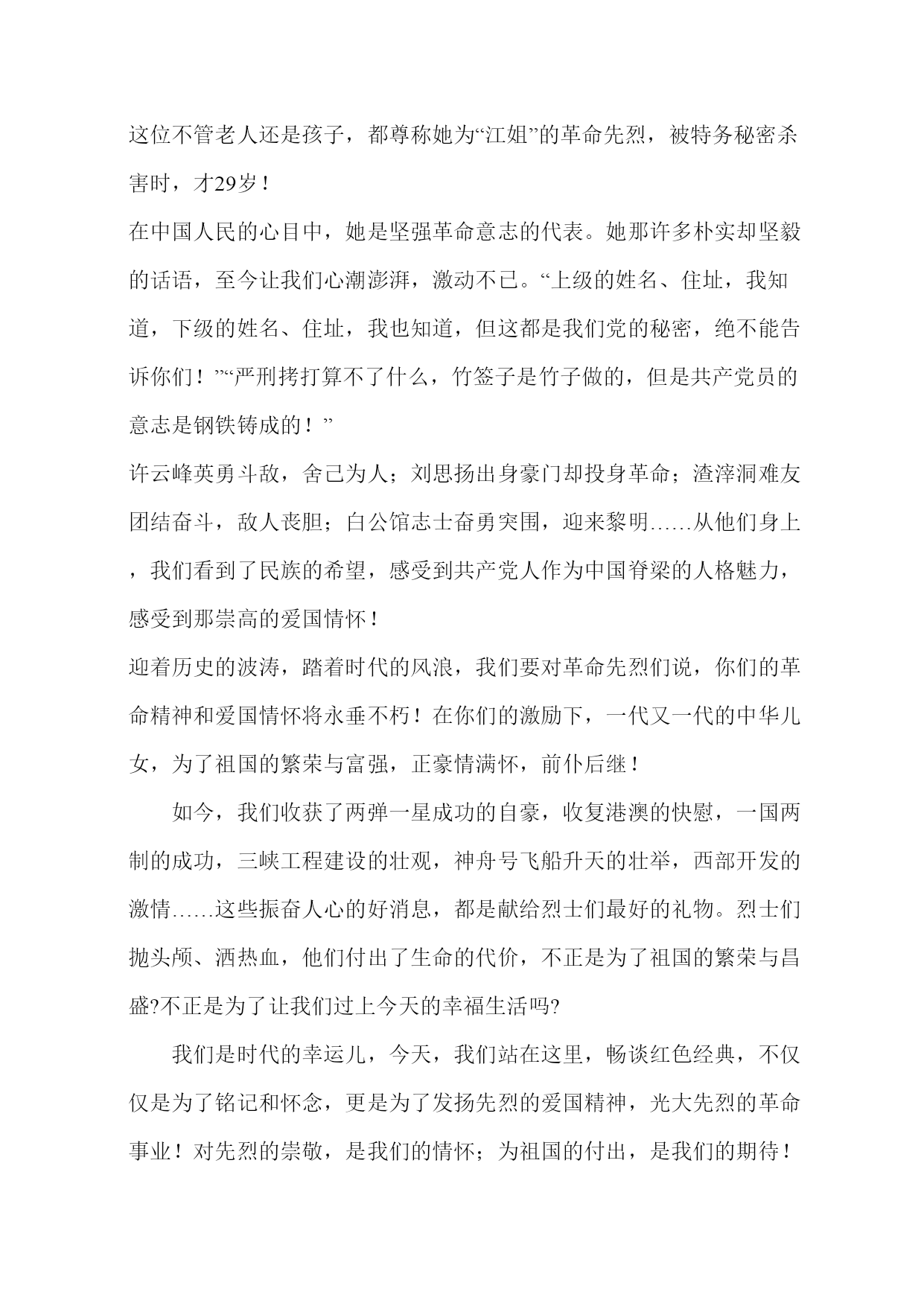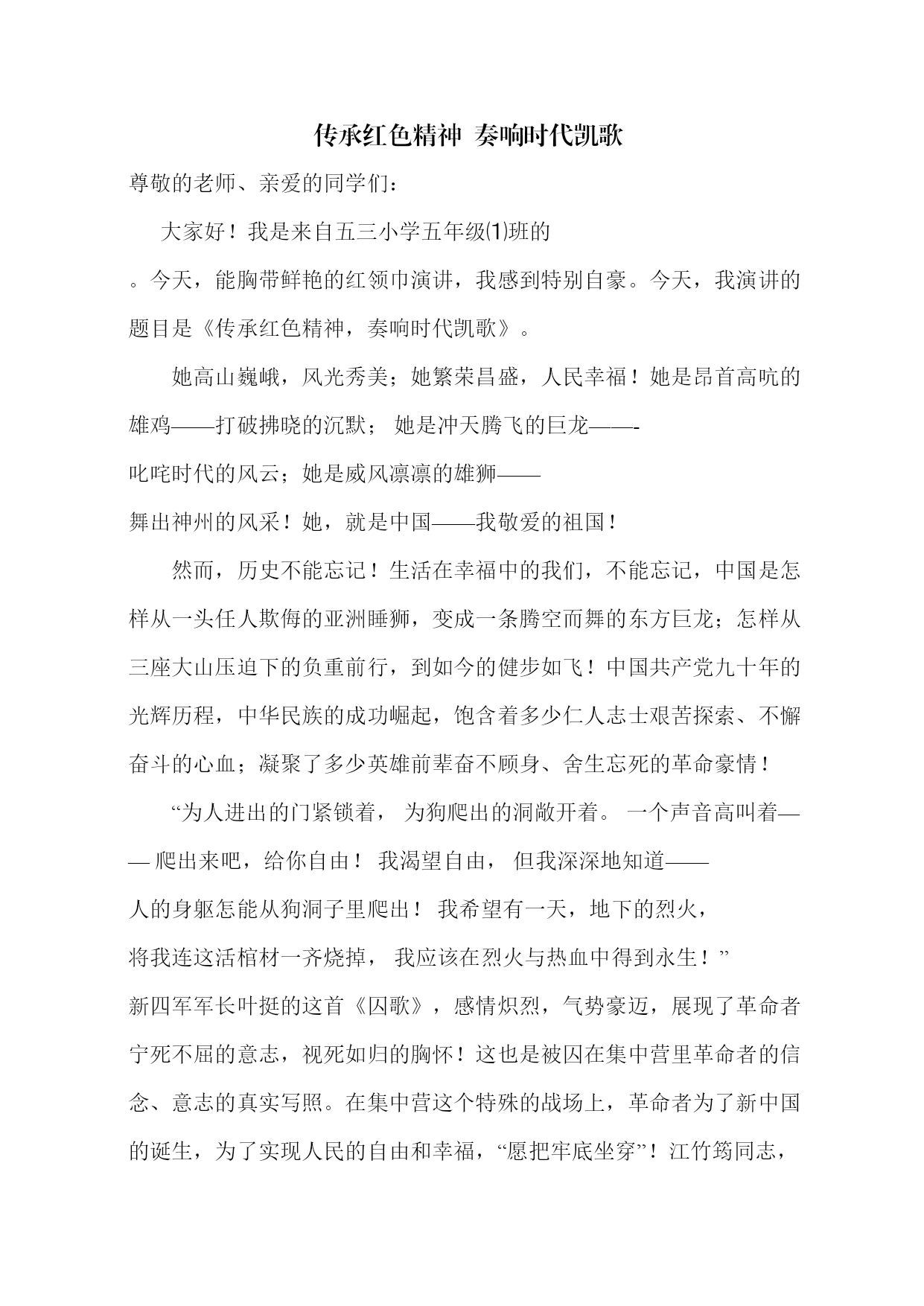 传承红色精神奏响时代凯歌 尊敬的老师、亲爱的同学们: 大家好!我是来自五三小学五年级⑴班的。今天,能胸带鲜艳的红领巾演讲,我感到特别自豪。今天,我演讲的题目是《传承红色精神,奏响时代凯歌》。 她高山巍峨,风光秀美;她繁荣昌盛,人民幸福!她是昂首高吭的雄鸡——打破拂晓的沉默;她是冲天腾飞的巨龙——-叱咤时代的风云;她是威风凛凛的雄狮——舞出神州的风采!她,就是中国——我敬爱的祖国! 然而,历史不能忘记!生活在幸福中的我们,不能忘记,中国是怎样从一头任人欺侮的亚洲睡狮,变成一条腾空而舞的东方巨龙;怎样从三座大山压迫下的负重前行,到如今的健步如飞!中国共产党九十年的光辉历程,中华民族的成功崛起,饱含着多少仁人志士艰苦探索、不懈奋斗的心血;凝聚了多少英雄前辈奋不顾身、舍生忘死的革命豪情! “为人进出的门紧锁着,为狗爬出的洞敞开着。一个声音高叫着——爬出来吧,给你自由!我渴望自由,但我深深地知道——人的身躯怎能从狗洞子里爬出!我希望有一天,地下的烈火,将我连这活棺材一齐烧掉,我应该在烈火与热血中得到永生!”新四军军长叶挺的这首《囚歌》,感情炽烈,气势豪迈,展现了革命者宁死不屈的意志,视死如归的胸怀!这也是被囚在集中营里革命者的信念、意志的真实写照。在集中营这个特殊的战场上,革命者为了新中国的诞生,为了实现人民的自由和幸福,“愿把牢底坐穿”!江竹筠同志,这位不管老人还是孩子,都尊称她为“江姐”的革命先烈,被特务秘密杀害时,才29岁!在中国人民的心目中,她是坚强革命意志的代表。她那许多朴实却坚毅的话语,至今让我们心潮澎湃,激动不已。“上级的姓名、住址,我知道,下级的姓名、住址,我也知道,但这都是我们党的秘密,绝不能告诉你们!”“严刑拷打算不了什么,竹签子是竹子做的,但是共产党员的意志是钢铁铸成的!”许云峰英勇斗敌,舍己为人;刘思扬出身豪门却投身革命;渣滓洞难友团结奋斗,敌人丧胆;白公馆志士奋勇突围,迎来黎明……从他们身上,我们看到了民族的希望,感受到共产党人作为中国脊梁的人格魅力,感受到那崇高的爱国情怀!迎着历史的波涛,踏着时代的风浪,我们要对革命先烈们说,你们的革命精神和爱国情怀将永垂不朽!在你们的激励下,一代又一代的中华儿女,为了祖国的繁荣与富强,正豪情满怀,前仆后继! 如今,我们收获了两弹一星成功的自豪,收复港澳的快慰,一国两制的成功,三峡工程建设的壮观,神舟号飞船升天的壮举,西部开发的激情……这些振奋人心的好消息,都是献给烈士们最好的礼物。烈士们抛头颅、洒热血,他们付出了生命的代价,不正是为了祖国的繁荣与昌盛?不正是为了让我们过上今天的幸福生活吗? 我们是时代的幸运儿,今天,我们站在这里,畅谈红色经典,不仅仅是为了铭记和怀念,更是为了发扬先烈的爱国精神,光大先烈的革命事业!对先烈的崇敬,是我们的情怀;为祖国的付出,是我们的期待!立足本职,扎实工作,勇于开拓,坚持创新!我们的国家将成为世界的强国,我们的民族将成为宇宙的骄子,让我们携起手来,书写崭新的历史,奏响未来更有力的强音! 内容总结 (1)传承红色精神奏响时代凯歌 尊敬的老师、亲爱的同学们: 大家好 (2)江竹筠同志,这位不管老人还是孩子,都尊称她为“江姐”的革命先烈,被特务秘密杀害时,才29岁 (3)“上级的姓名、住址,我知道,下级的姓名、住址,我也知道,但这都是我们党的秘密,绝不能告诉你们 (4)在你们的激励下,一代又一代的中华儿女,为了祖国的繁荣与富强,正豪情满怀,前仆后继 (5)立足本职,扎实工作,勇于开拓,坚持创新