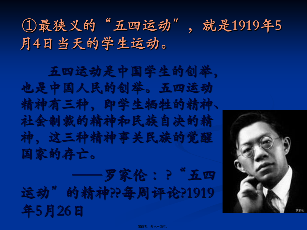 一、什么是五四精神? 二、陈独秀创办?青年杂志?与新文化运动的兴起 三、北京大学与?新青年?的结合 四、?新青年?杂志的主要撰稿人——新文化运动的主要代表人物 五、?新青年?对民主和科学精神的传播 六、新文化阵营的分裂与?新青年?迁回上海 1、三种意义上的五四运动 和五四精神解读 ①最狭义的“五四运动〞,就是1919年5月4日当天的学生运动。陈独秀论五四精神: 五四运动特有的精神是“直接行动〞和“牺牲精神〞。 所谓“直接行动〞,就是“对于社会国家的黑暗,由人民直接行动,加以制裁,不诉诸法律,不利用特殊势力,不依赖代表。因为法律是强权的护符,特殊势力是民权的仇敌,代议员是欺骗者,决不能代表公众的意见〞。所谓“牺牲精神〞,那么是“出了研究室就入监狱,出了监狱就入研究室〞的精神。②中间意义的五四运动,指的是1919年5月4日至6月28日的全国范围的群众性反帝爱国运动。③更大范畴的“五四运动〞,也称“五四新文化运动〞,从时间段而言大约是从1915年到1926年。五四精神包括三个方面,即“爱国运动〞、“以批判的态度重新估价一切〞和“思想界的自由开展〞。 “五四的根本精神——提倡民主和提倡科学〞。 〔——周策纵:纪念五四运动60周年讲话〕五四精神包括爱国精神、民主精神、科学精神、创造精神和奋斗精神。这五个精神是相互渗透的,其中最根本的那么是民主精神和科学精神。 ——许全兴:?简论五四精神? 从政治取向看,其所强调的五四精神是侧重于反对外国侵略、争取民族独立方面,而如从文化思想取向看,那么所强调的是民主与科学的精神。五四运动是爱国的。 ——萧超然:?论五四精神与祖国统一?中国共产党对五四精神的概括:2、?新青年?与五四精神“那个时候有?新青年?杂志,是陈独秀主编的。被这个杂志和‘五四’运动警醒起来的人,后来有一局部进了共产党。这些人受陈独秀和他周围一群人的影响很大,可以说是由他们集合起来,这才成立了党。〞 ——毛泽东在中共七大预备会上的讲话 “?新青年?是有名的新文化运动的杂志,由陈独秀主编。我在师范学校学习的时候,就开始读这个杂志了。我非常钦佩胡适和陈独秀的文章,他们代替已经被我抛弃的梁启超和康有为,一时成了我的楷模。〞 ——毛泽东“?新青年?是中国文学史和思想史上划分一个时代的刊物,最近20年中的文学运动和思想改革,差不多都是从这个刊物出发的。〞——胡适,1935 新文化运动的兴起陈独秀〔1879—1942〕,名乾生,字仲甫,安徽怀宁〔今安庆〕人。17岁中秀才——乡试科考失败——康党——留学日本——革命党。此后,他几乎参加了中国资产阶级民主革命的全过程。例如,拒俄运动、辛亥革命、反袁斗争等;参加过励志会、青年会、暗杀团等革命小团体。新文化运动兴起的标志:1915年9月15日,陈独秀在上海创办?青年杂志?。第二卷第一期起易名为?新青年?。办杂志缘于对辛亥革命失败的反思:他的思维路向和结论与很多人不同,即不是就政治而谈政治,而是从思想文化、民众觉悟的角度着眼。其结论是:中国的出路首先不在于政治制度的改革,而在于思想文化的转换,在于国民性的改造。 要稳固共和政体,就要把布满国民脑子中的“腐旧思想〞洗刷干净,否者,“不但共和政治不能进行,就是这块共和招牌,也是挂不住的〞。 杂志的目标读者:青年“青年如初春,如朝日,如百卉之萌动,如利刃之新发于硎,人生最可珍贵之时期也。青年之于社会,犹新鲜活泼细胞之在人身。〞 ——陈独秀:?敬告青年?早期的刊物文章,主打方向是中西文化比较,陈独秀写了很多文章,如?法兰西人与近世文明?,?中西民族根本思想之差异?等,热情歌颂西方现代文明,严厉批判中国的文化传统以及以此为根基的现实。 ?新青年?创刊之初影响并不大。三、北京大学与?新青年?的结合?新青年?的特别之处,正在于其以北京大学为依托,因而获得丰厚的资源。杂志主编被教育部任命为全国最高学府的文科学长,本身就是一种无形的“广告〞。 胡适后来分析文学革命成功的因素时指出:陈独秀担任北京大学文科学长后,其文学革命主张乃成了“全国的东西〞,成了一个“严重的问题〞。 陈独秀入北大后,一批北大教授加盟?新青年?,使杂志真正以全国最高学府为依托,在它周围聚集了一批优秀的思想者和文化先驱。正是这一校一刊的完美结合,使新文化运动得以迅速展开。四、?新青年?杂志的主要撰稿人——新文化运动的主要代表人物“北京新建成的皇城根遗址公园中段紧挨旧北大‘红楼’的五四大街路口,修建了一座大型不锈钢雕塑,名为‘翻开历史新的一页’,纪念五四新文化运动。但这座雕塑的浮雕局部镌刻着青年毛泽东、李大钊、鲁迅、蔡元培等人的头像,却独缺五四新文化运动两位最重要的领袖人物陈独秀、胡适。〞 ——雷颐: ?这是“历史新的一页〞吗?? 载于?南方周末?,2002年3月14日陈独秀是中共党史乃至中国近代史上充满