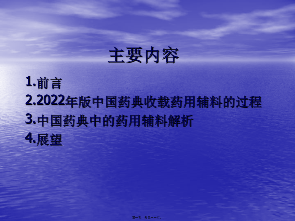 主要内容一.前言一我国药用辅料标准状况兴旺国家药用辅料状况口崩片:我国制剂之痛!!一FRCs的演变〔供注射用〕聚山梨酯80的现状国际上药用辅料的管理关注DEG:二甘醇〔DEG〕引发的药物〔食物〕事件儿童用制剂辅料的平安性应引起关注儿童用辅料常见问题中国药典2022年版有关药用辅料的修、增订目标、原那么附录“药用辅料〞的增订过程药用辅料增修订:团队的成功三、中国药典中药用辅料的解析中国药典附录?药用辅料?解析:辅料定义中国药典附录?药用辅料?解析:辅料定义药用辅料的作用例1:-包衣的选择和材料的应用薄膜包衣薄膜衣应注意的问题药用辅料对药物有效性、平安性的影响例2以环氧乙烷为起始原料的药用辅料关注点:药用辅料对药物稳定性的影响QbD:从辅料到处方设计高危制剂中药用辅料的关注点药用辅料的平安性问题食品添加剂作为药用辅料的接受问题常见药用辅料的有关物质内容总结