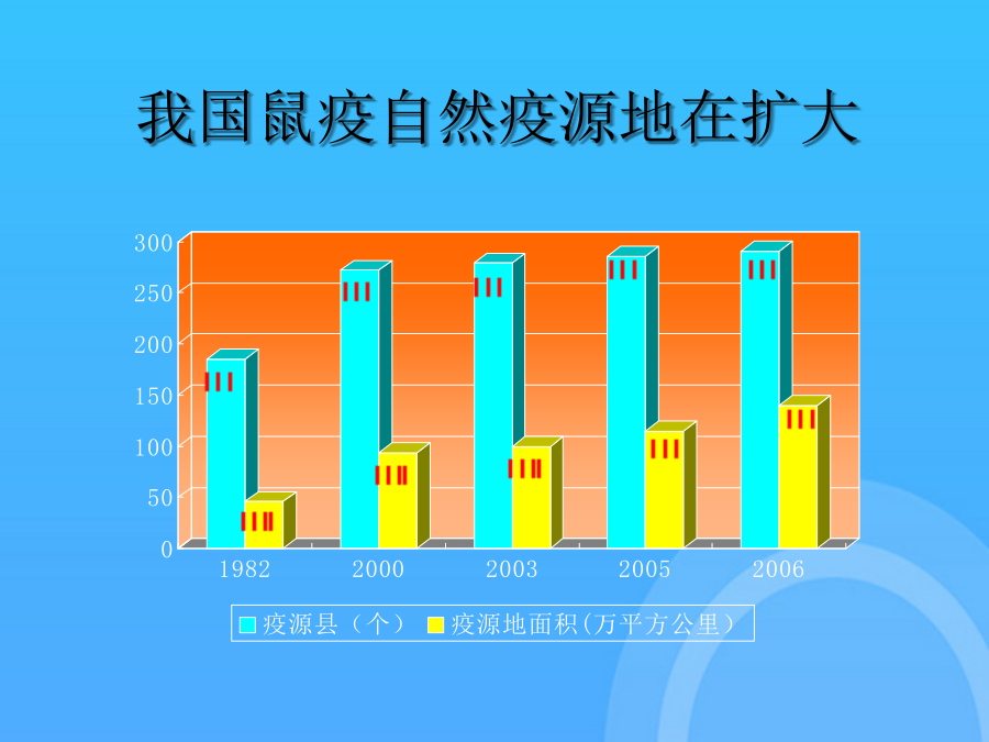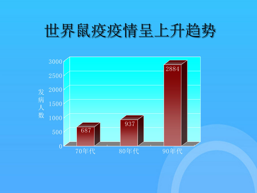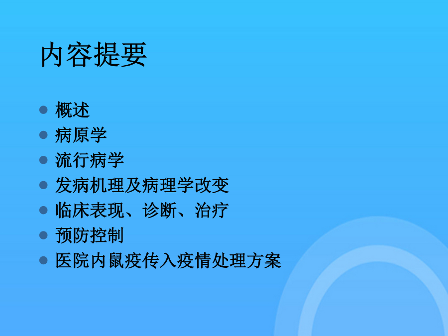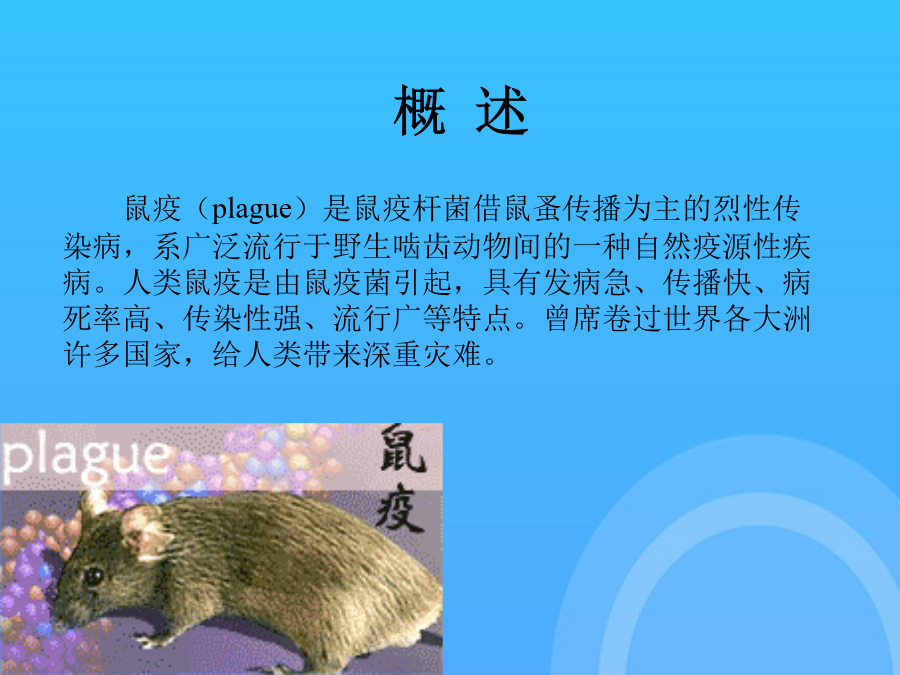 鼠疫防治知识内容提要鼠疫(plague)是鼠疫杆菌借鼠蚤传播为主的烈性传染病,系广泛流行于野生啮齿动物间的一种自然疫源性疾病。人类鼠疫是由鼠疫菌引起,具有发病急、传播快、病死率高、传染性强、流行广等特点。曾席卷过世界各大洲许多国家,给人类带来深重灾难。世界鼠疫疫情呈上升趋势我国鼠疫自然疫源地在扩大中国鼠疫自然疫源地名称青藏铁路沿线省份地图鼠疫耶尔森氏菌于1894年在香港首次分离,属肠杆菌科,耶尔森氏菌属,是革兰氏染色阴性的兼性厌氧菌,显微镜下观为两头钝园的短小杆菌,有荚膜,无鞭毛,无芽孢,菌落中心隆起,有粗糙颗粒,边缘不整齐。它生长的最适PH为,温度28-30℃,对高温和化学消毒剂敏感。流行病学喜马拉雅旱獭喜马拉雅旱獭长爪沙鼠达乌尔黄鼠(二)传播途径人群对鼠疫普遍易感 预防接种可获一定免疫力(四)流行特征发病机理病理变化皮肤粘膜有出血点,浆膜腔发生血性积液 腺型及其他型鼠疫病人经治疗体温恢复正常,全身症状消失,肿大淋巴结完全吸收或残留小块硬结。 蚤叮咬,经血传播:啮齿动物→蚤→人,多为腺鼠疫 登记后方可离去,并由辖区内的疾病控制机构对其进行跟踪医学观察。 恶寒,高热达40-41℃ 用抗生素治疗后,病死率可降至5~10%。 世界鼠疫疫情呈上升趋势 淋巴结肿大常与周围组织融合,形成肿块 人间鼠疫多由野鼠传至家鼠,由家鼠传染于人引起。 直接吸入含鼠疫菌的空气飞沫感染 因下肢被蚤咬机会较多,故腹股沟淋巴结炎最多见,约占70%; 4、关闭中央空调系统。 恶寒,高热达40-41℃ 松辽平原达乌尔黄鼠鼠疫自然疫源地临床表现(二)一般症状:危重的全身中毒症状 发病急剧,恶寒战栗。体温骤升至39℃~40℃,呈稽留热 头痛剧烈,有时出现中枢神经性呕吐、头晕,呼吸促迫,很快陷入极度虚弱状态 心动过速,心律不齐,心音弱,脉博每分钟120次以上 血压下降,多在~/~6.67Kpa(80~90/45~50mmHg)范围 重症病人早期出现神经系统症状,意识不清,昏睡,狂燥不安,谵语,步行蹒跚,颜面潮红或苍白,有时甚至发青,有重病感或恐怖不安,眼睑结膜及球结膜充血,出现所谓的鼠疫颜貌 (三)各型鼠疫的特殊症状1.腺鼠疫:2.肺鼠疫(2)继发性: 由腺鼠疫或败血型鼠疫经血行播散而引起 在原发腺鼠疫或败血型鼠疫基础上,病情突然加剧出现咳嗽、胸闷、呼吸困难,随之咳出鲜红色血痰,痰中含大量鼠疫菌,可成为引起原发性肺鼠疫流行的传染源死亡的肺鼠疫病人3.败血型鼠疫鼠疫的诊断飞沫或气溶胶传播:剥离旱獭等染疫动物时吸入, 隐性感染在疫区已发现有无症状的咽部携带者。 (一)腺鼠疫应与下列疾病鉴别。 必要时采取交通封锁或交通检疫。 当腺型或其他型鼠疫未经治疗或治疗不当时,病情恶化发展为继发性败血症鼠疫。 及时治疗,减少死亡 (三)加用磺胺类药物作为辅助治疗或人群的预防投药。 预防接种可获一定免疫力 皮肤粘膜有出血点,浆膜腔发生血性积液 松辽平原达乌尔黄鼠鼠疫自然疫源地 疾病控制人员进行流行病学调查,追查传染源,查清接触者、污染物品及污染范围,采取控制措施。 偶因狩猎(捕捉旱獭)、考查、施工、军事活动进入疫区而被感染。 (2)留验观察人员被隔离9日,无续发病例发生。 加强动物间疫情监测,并严密注视周边省份疫情动态,及时发布预测、预报、预警信息。 鼠疫(plague)是鼠疫杆菌借鼠蚤传播为主的烈性传染病,系广泛流行于野生啮齿动物间的一种自然疫源性疾病。 恶寒,高热达40-41℃鼠疫的治疗(一)就地隔离病人,严格控制病人与外界接触。 (二)首选链霉素治疗,以早期足量投药为益。 (三)加用磺胺类药物作为辅助治疗或人群的预防投药。 (四)用特效抗菌素的同时,加用强心和利尿剂,以缓解鼠疫菌释放的毒素对心、肾功能的影响。病人治愈出院标准病人治愈出院标准病人治愈出院标准鼠疫的预防与控制二.预防措施:三.控制措施医院内鼠疫传入疫情处理方案3、接触者的隔离与跟踪观察。 (1)将医院划分为隔离观察区域。 (2)密切接触者,包括发热门诊的医务人员及就诊人员应就地隔离,隔离期间每日测量被隔离人员的体温,每日3次。被对隔离人员进行口服磺胺类药物的预防性投药。(成人首次2g,其后4~6小时服1g,连服5日) (3)医院内其他工作人员及住院病人就地隔离,由医院对其进行医学观察。 (4)同一诊区的门诊病人由医院对其进行详细登记,包括姓名、详细住址、单位、电话等。登记后方可离去,并由辖区内的疾病控制机构对其进行跟踪医学观察。 4、关闭中央空调系统。 (三)解除隔离: 1、在下列情况下解除隔离: (1)病人诊断明确,鼠疫诊断被排除。 (2)留验观察人员被隔离9日,无续发病例发生。 2、由市政府发布解除隔离命令。 3、解除隔离时,对隔离治疗和隔离观察的场所实施终末消毒。谢谢观看!感谢观看