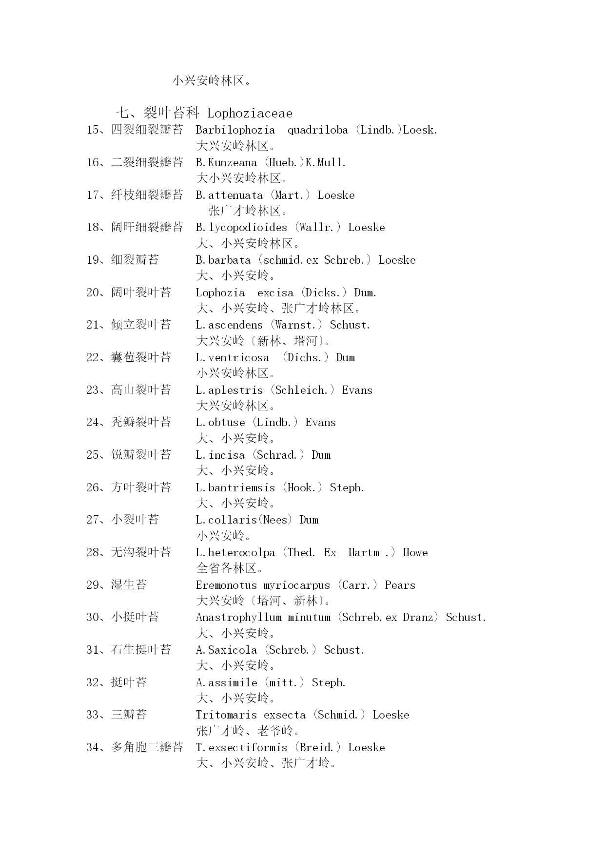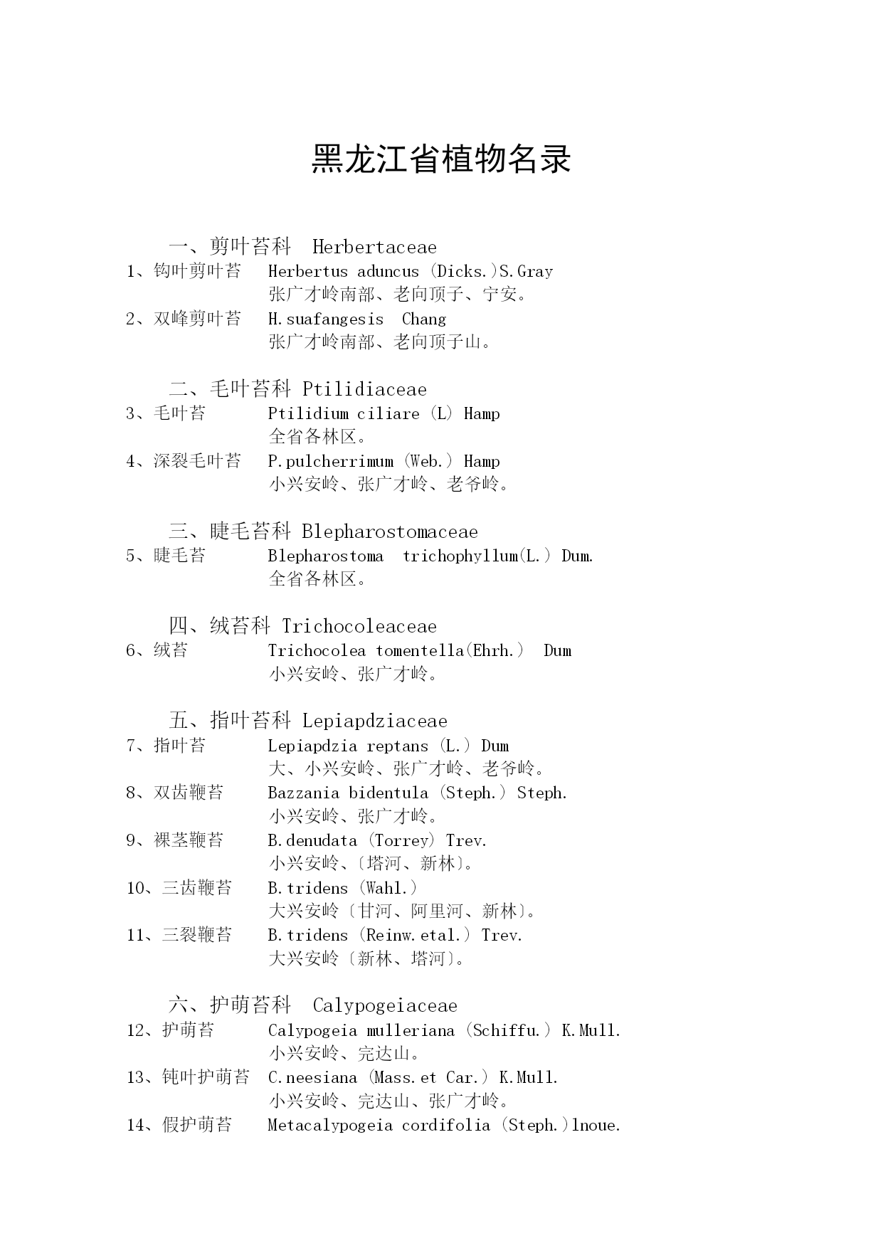 黑龙江省城市生物多样性保护规划——基础资料汇编【完整版】 (文档可以直接使用,也可根据实际需要修订后使用,可编辑放心下载) 黑龙江省城市生物多样性保护规划 (根底资料汇编) 组织:黑龙江省建设厅 编制:黑龙江省风景园林协会 黑龙江省城市规划勘测设计研究院 2006年10月 目录 TOC\o"1-3"\h\zHYPERLINK\l"_Toc158191526"黑龙江省植物名录 PAGEREF_Toc158191526\h1 HYPERLINK\l"_Toc158191527"黑龙江省野生动物、兽类、鸟类、两栖类、 PAGEREF_Toc158191527\h139 HYPERLINK\l"_Toc158191528"爬行类、鱼类、昆虫名录 PAGEREF_Toc158191528\h139 HYPERLINK\l"_Toc158191529"黑龙江省大型经济真菌名录 PAGEREF_Toc158191529\h177 HYPERLINK\l"_Toc158191530"嫩江水系河流监测结果统计表 PAGEREF_Toc158191530\h185 HYPERLINK\l"_Toc158191531"黑龙江水系河流监测结果统计表 PAGEREF_Toc158191531\h186 HYPERLINK\l"_Toc158191532"甘河加格达奇段流监测结果统计表 PAGEREF_Toc158191532\h187 HYPERLINK\l"_Toc158191533"嫩水水系河流监测结果 PAGEREF_Toc158191533\h188 HYPERLINK\l"_Toc158191534"黑龙江水系河流监测结果 PAGEREF_Toc158191534\h189 HYPERLINK\l"_Toc158191535"甘河加格达奇段流监测结果 PAGEREF_Toc158191535\h190 黑龙江省植物名录 一、剪叶苔科Herbertaceae 1、钩叶剪叶苔Herbertusaduncus(Dicks.)S.Gray 张广才岭南部、老向顶子、宁安。 2、双峰剪叶苔H.suafangesisChang 张广才岭南部、老向顶子山。 二、毛叶苔科Ptilidiaceae 3、毛叶苔Ptilidiumciliare(L)Hamp 全省各林区。 4、深裂毛叶苔P.pulcherrimum(Web.)Hamp 小兴安岭、张广才岭、老爷岭。 三、睫毛苔科Blepharostomaceae 5、睫毛苔Blepharostomatrichophyllum(L.)Dum. 全省各林区。 四、绒苔科Trichocoleaceae 6、绒苔Trichocoleatomentella(Ehrh.)Dum 小兴安岭、张广才岭。 五、指叶苔科Lepiapdziaceae 7、指叶苔Lepiapdziareptans(L.)Dum 大、小兴安岭、张广才岭、老爷岭。 8、双齿鞭苔Bazzaniabidentula(Steph.)Steph. 小兴安岭、张广才岭。 9、裸茎鞭苔B.denudata(Torrey)Trev. 小兴安岭、〔塔河、新林〕。 10、三齿鞭苔B.tridens(Wahl.) 大兴安岭〔甘河、阿里河、新林〕。 11、三裂鞭苔B.tridens(Reinw.etal.)Trev. 大兴安岭〔新林、塔河〕。 六、护萌苔科Calypogeiaceae 12、护萌苔Calypogeiamulleriana(Schiffu.)K.Mull. 小兴安岭、完达山。 13、钝叶护萌苔C.neesiana(Mass.etCar.)K.Mull. 小兴安岭、完达山、张广才岭。 14、假护萌苔Metacalypogeiacordifolia(Steph.)lnoue. 小兴安岭林区。 七、裂叶苔科Lophoziaceae 15、四裂细裂瓣苔Barbilophoziaquadriloba(Lindb.)Loesk. 大兴安岭林区。 16、二裂细裂瓣苔B.Kunzeana(Hueb.)K.Mull. 大小兴安岭林区。 17、纤枝细裂瓣苔B.attenuata(Mart.)Loeske 张广才岭林区。 18、阔旰细裂瓣苔B.lycopodioides(Wallr.)Loeske 大、小兴安岭林区。 19、细裂瓣苔B.barbata(schmid.exSchreb.)Loeske 大、小兴安岭。 20、阔叶裂叶苔Lophoziaexcisa(Dicks.)Dum. 大、小兴安岭、张广才岭林区。 21、倾立裂