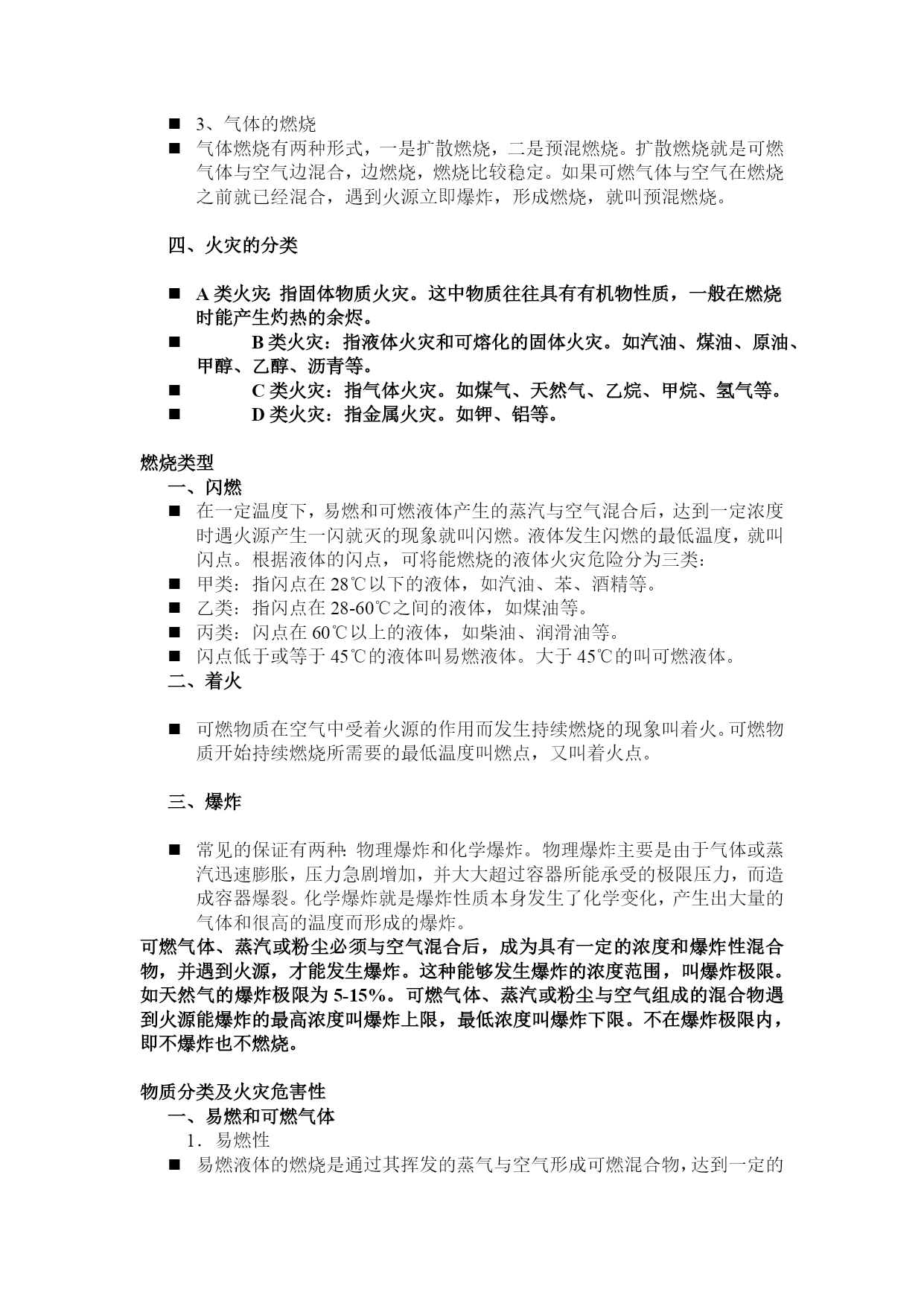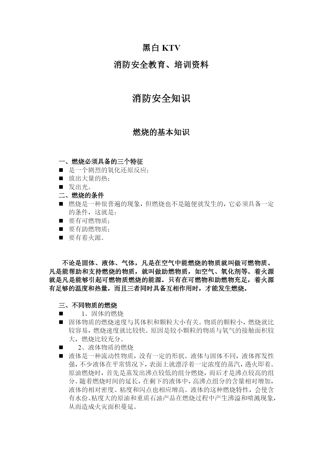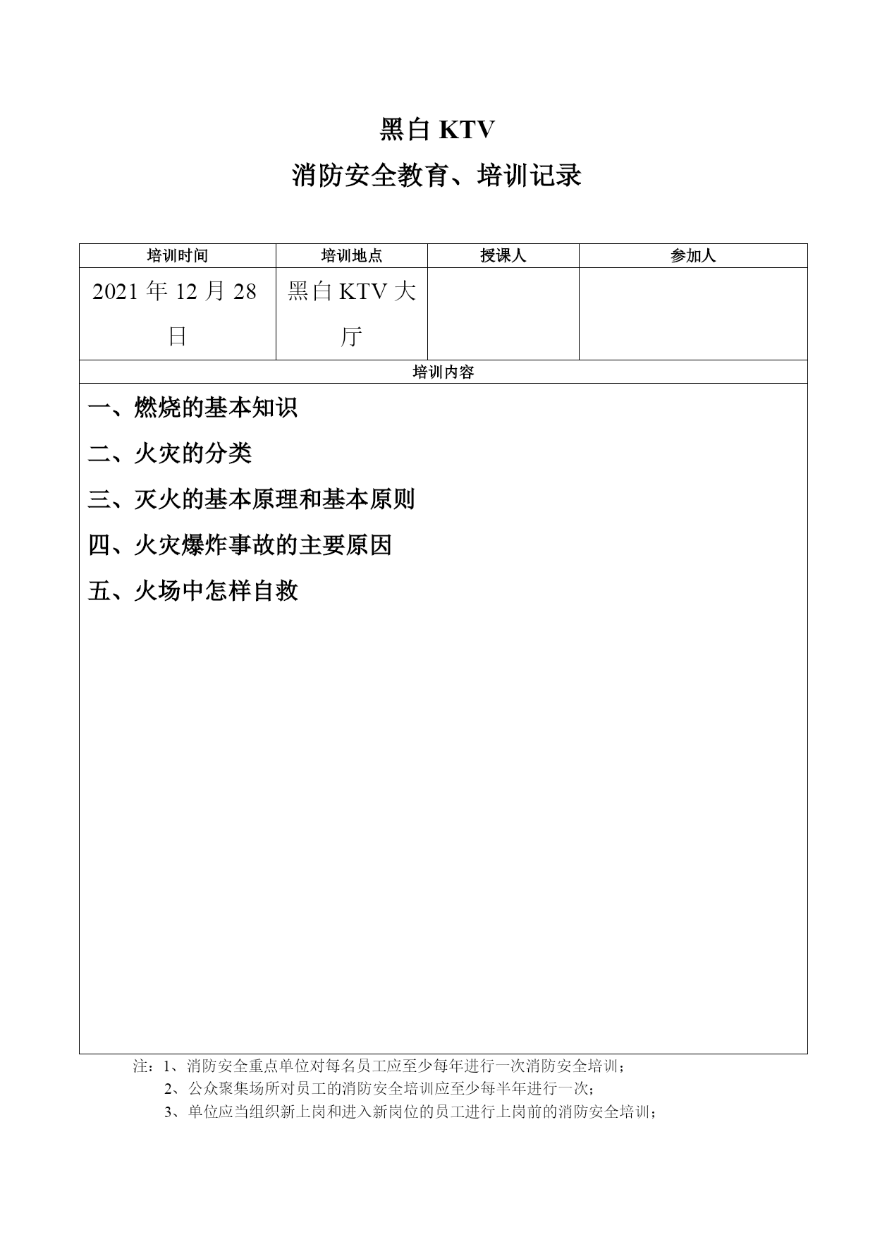 黑白KTV 消防安全教育、培训记录 培训时间培训地点授课人参加人2021年12月28日黑白KTV大厅培训内容一、燃烧的基本知识 二、火灾的分类 三、灭火的基本原理和基本原则 四、火灾爆炸事故的主要原因 五、火场中怎样自救 注:1、消防安全重点单位对每名员工应至少每年进行一次消防安全培训; 2、公众聚集场所对员工的消防安全培训应至少每半年进行一次; 3、单位应当组织新上岗和进入新岗位的员工进行上岗前的消防安全培训; 黑白KTV 消防安全教育、培训资料 消防安全知识 燃烧的基本知识 一、燃烧必须具备的三个特征 是一个剧烈的氧化还原反应; 放出大量的热; 发出光。 二、燃烧的条件 燃烧是一种很普遍的现象,但燃烧也不是随便就发生的,它必须具备一定的条件,这就是: 要有可燃物质; 要有助燃物质; 要有着火源。 不论是固体、液体、气体,凡是在空气中能燃烧的物质就叫做可燃物质。凡是能帮助和支持燃烧的物质,就叫做助燃物质,如空气、氧化剂等。着火源就是凡是能够引起可燃物质燃烧的能源。只有在可燃物和助燃物充足,着火源有足够的温度和热量,而且三者同时具备互相作用时,才能发生燃烧。 三、不同物质的燃烧 1、固体的燃烧 固体物质的燃烧速度与其体积和颗粒大小有关。物质的颗粒小,燃烧就比较容易,燃烧速度就比较快。原因是较小颗粒的物质与氧气的接触面积较大,燃烧比较充分。 2、液体物质的燃烧 液体是一种流动性物质,没有一定的形状。液体与固体不同,液体挥发性强,不少液体在平常情况下,表面上就漂浮着一定浓度的蒸汽,遇火即着。原油燃烧时,首先是蒸发出沸点较低的组分燃烧,而后才是沸点较高的组分。随着燃烧时间的延长,在剩下的液体中,高沸点组分的含量相对增加,液体的相对密度、粘度和闪点也相应增高。液体的这种燃烧特性,会使含有水份、粘度大的原油和重质石油产品在燃烧过程中产生沸溢和喷溅现象,从而造成火灾面积蔓延。 3、气体的燃烧 气体燃烧有两种形式,一是扩散燃烧,二是预混燃烧。扩散燃烧就是可燃气体与空气边混合,边燃烧,燃烧比较稳定。如果可燃气体与空气在燃烧之前就已经混合,遇到火源立即爆炸,形成燃烧,就叫预混燃烧。 四、火灾的分类 A类火灾:指固体物质火灾。这中物质往往具有有机物性质,一般在燃烧时能产生灼热的余烬。 B类火灾:指液体火灾和可熔化的固体火灾。如汽油、煤油、原油、甲醇、乙醇、沥青等。 C类火灾:指气体火灾。如煤气、天然气、乙烷、甲烷、氢气等。 D类火灾:指金属火灾。如钾、铝等。 燃烧类型 一、闪燃 在一定温度下,易燃和可燃液体产生的蒸汽与空气混合后,达到一定浓度时遇火源产生一闪就灭的现象就叫闪燃。液体发生闪燃的最低温度,就叫闪点。根据液体的闪点,可将能燃烧的液体火灾危险分为三类: 甲类:指闪点在28℃以下的液体,如汽油、苯、酒精等。 乙类:指闪点在28-60℃之间的液体,如煤油等。 丙类:闪点在60℃以上的液体,如柴油、润滑油等。 闪点低于或等于45℃的液体叫易燃液体。大于45℃的叫可燃液体。 二、着火 可燃物质在空气中受着火源的作用而发生持续燃烧的现象叫着火。可燃物质开始持续燃烧所需要的最低温度叫燃点,又叫着火点。 三、爆炸 常见的保证有两种:物理爆炸和化学爆炸。物理爆炸主要是由于气体或蒸汽迅速膨胀,压力急剧增加,并大大超过容器所能承受的极限压力,而造成容器爆裂。化学爆炸就是爆炸性质本身发生了化学变化,产生出大量的气体和很高的温度而形成的爆炸。 可燃气体、蒸汽或粉尘必须与空气混合后,成为具有一定的浓度和爆炸性混合物,并遇到火源,才能发生爆炸。这种能够发生爆炸的浓度范围,叫爆炸极限。如天然气的爆炸极限为5-15%。可燃气体、蒸汽或粉尘与空气组成的混合物遇到火源能爆炸的最高浓度叫爆炸上限,最低浓度叫爆炸下限。不在爆炸极限内,即不爆炸也不燃烧。 物质分类及火灾危害性 一、易燃和可燃气体 1.易燃性 易燃液体的燃烧是通过其挥发的蒸气与空气形成可燃混合物,达到一定的浓度后遇火源而实现的,实质上是液体蒸气与氧发生的氧化反应。由于易燃液体的沸点都很低,易燃液体很容易挥发出易燃蒸气,其着火所需的能量极小,因此,易燃液体都具有高度的易燃性。 2.蒸气的爆炸性 由于易燃液体具有挥发性,挥发的蒸气易与空气形成爆炸性混合物,所以易燃液体存在着爆炸的危险性。挥发性越强,爆炸的危险就越大。不同的液体的蒸发速度因温度、沸点、比重、压力的不同而发生变化。 3.热膨胀性 易燃液体和其它液体一样,也有受热膨胀性。储存于密闭容器中的易燃液体受热后,体积膨胀,蒸气压力增加,若超过容器的压力限度,就会造成容器膨胀,以致爆破。因此,利用易燃液体的热膨胀性,可以对易燃液体的容器进行检查,检查容器是否留有不少于5%的空隙,夏天是否储存在阴凉处或是否采取了降温措施加以保护。 4.流