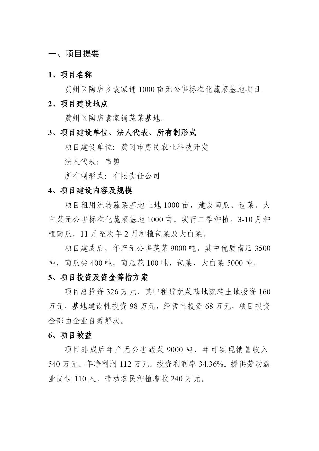黄冈惠民亩无公害蔬菜基地项目建议书(完整版) (文档可以直接使用,也可根据实际需要修改使用,可编辑欢迎下载) 袁家铺1000亩无公害标准化蔬菜基地 项 目 建 议 书 目录 TOC\o"1-1"\h\z\uHYPERLINK\l"_Toc272187327"一、项目提要 PAGEREF_Toc272187327\h1 HYPERLINK\l"_Toc272187328"二、项目建设单位基本情况 PAGEREF_Toc272187328\h2 HYPERLINK\l"_Toc272187329"三、项目建设背景及必要性 PAGEREF_Toc272187329\h2 HYPERLINK\l"_Toc272187330"四、项目建设条件 PAGEREF_Toc272187330\h4 HYPERLINK\l"_Toc272187331"五、市场分析 PAGEREF_Toc272187331\h6 HYPERLINK\l"_Toc272187332"六、项目建设方案 PAGEREF_Toc272187332\h6 HYPERLINK\l"_Toc272187333"七、投资估算与资金筹措 PAGEREF_Toc272187333\h7 HYPERLINK\l"_Toc272187334"八、项目经济和社会效益 PAGEREF_Toc272187334\h9 一、项目提要 1、项目名称 黄州区陶店乡袁家铺1000亩无公害标准化蔬菜基地项目。 2、项目建设地点 黄州区陶店袁家铺蔬菜基地。 3、项目建设单位、法人代表、所有制形式 项目建设单位:黄冈市惠民农业科技开发 法人代表:韦勇 所有制形式:有限责任公司 4、项目建设内容及规模 项目租用流转蔬菜基地土地1000亩,建设南瓜、包菜、大白菜无公害标准化蔬菜基地1000亩。实行二季种植,3-10月种植南瓜,11月至次年2月种植包菜及大白菜。 项目建成后,年产无公害蔬菜9000吨,其中优质南瓜3500吨,南瓜尖400吨,南瓜花100吨,包菜、大白菜5000吨。 5、项目投资及资金筹措方案 项目总投资326万元,其中租赁蔬菜基地流转土地投资160万元,基地建设性投资98万元,经营性投资68万元,项目投资全部由企业自筹解决。 6、项目效益 项目建成后年产无公害蔬菜9000吨,年可实现销售收入540万元。年净利润112万元。投资利润率34.36%。提供劳动就业岗位110人,带动农民种植增收240万元。 二、项目建设单位基本情况 黄冈市惠民农业科技开发成立于2007年12月,是一家以经营农、林、水产品的种植、养殖、繁育、加工、回收、销售为一体的“产供销、科工贸”综合性农业科技开发型企业。现有固定资产达6000万元。现有员工80人,其中各种高管人员10人;高级农技师、园艺师、畜牧师10人。大专学历以上员工占80%。 项目单位自2021年起开始实施“黄冈市营卯立体、生态种植、养殖示范基地项目”,该项目已经湖北省人民政府、黄冈市人民政府批准立项。项目总投资2128万元,主要建设年出栏20万只商品獭兔基地,建设年出栏1万头牲猪养殖基地,建设金银花基地800亩,建设300亩水库网箱养鱼。 项目单位通过推行“公司+基地+农户”的农业产业化经营发展模式,走立体、环保循环种植、养殖之路,坚持资源综合利用及开发,使公司在三到五年内,成为黄冈地区内集种植,养殖、繁育、加工、回收、销售、农业旅游观光为一体的立体生态、种植、养殖综合性企业。 三、项目建设背景及必要性 1、项目建设背景 黄州区1996年建区以后,区委、区政府根据黄州人多地少的区情实际,充分利用城郊区位优势,确立了主攻蔬菜、水产、畜禽、林果花卉四大产业的发展思路,制定了以发展蔬菜产业为先导的奋斗目标和具体措施,从而使黄州区蔬菜生产步入了快速发展轨道。1996年至2021年,全区蔬菜种植面积由3.12万亩发展到10万亩以上,年生产总量由8.5万吨增加到25万吨以上;蔬菜产值占种植业产值的比重由33.2%提高到56%。已建成的东湖、陶店、禹王、南湖“四大”蔬菜生产基地面积达5万多亩。蔬菜已成为黄州农村经济发展、农民增收的主导产业。 蔬菜是人们日常饮食中必不可少的食物之一,可提供人体所必须的多种维生素和矿物质,近几年来,随着蔬菜业适应新的国际形势需要及食品安全需要,蔬菜栽培的发展趋势逐渐向绿色、无公害种植转化。党的十六大,把“健全农产品质量安全体系,增强农业的市场竞争力”写进了报告,农业部也根据中共中央、国务院关于加快实施“无公害食品行动计划”的要求和全国“菜篮子”工作会议精神,在全国范围内推进“无公害食品行动计划”。 正是