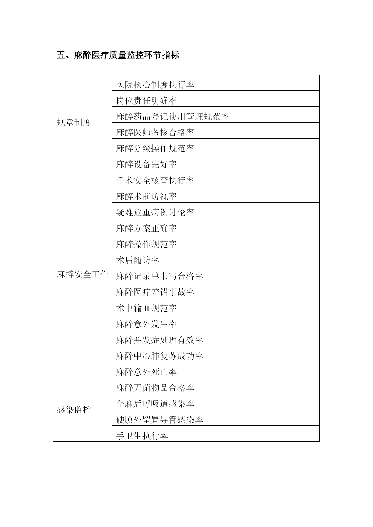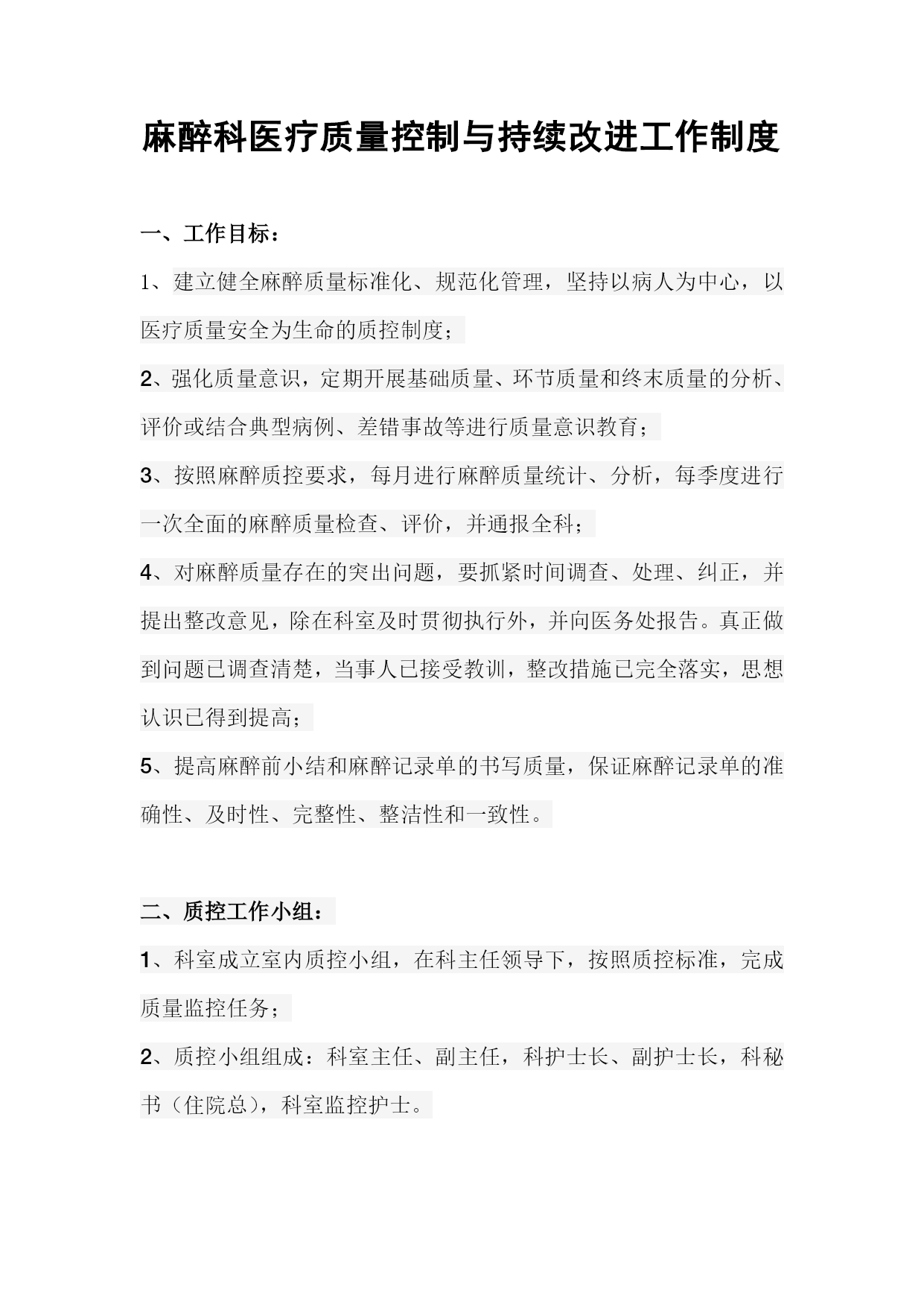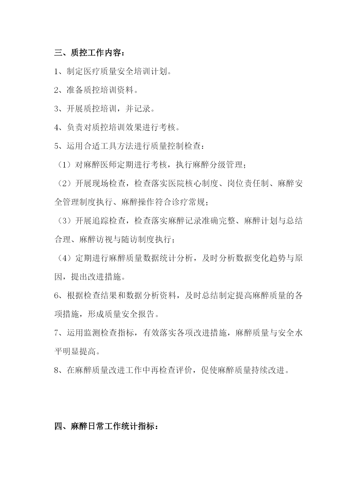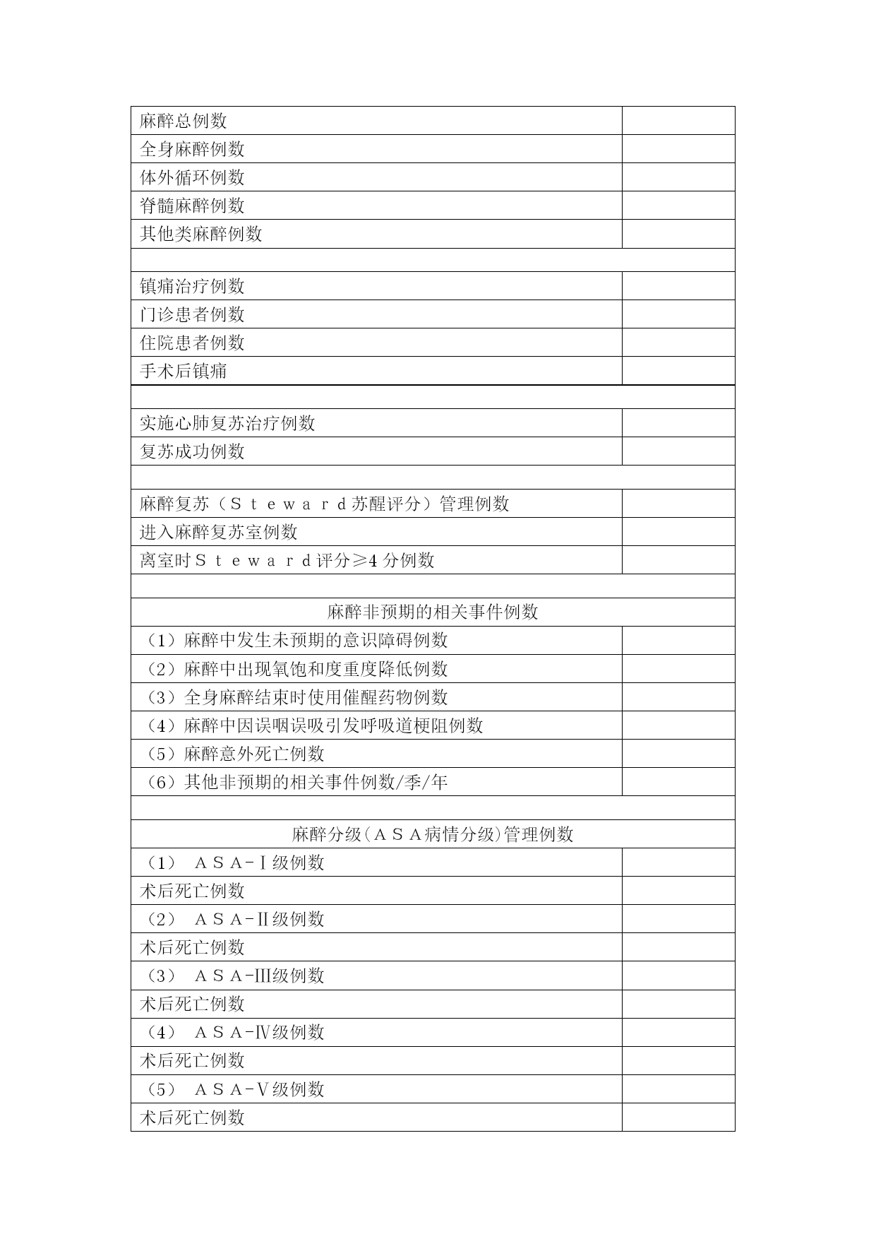 麻醉科医疗质量控制与持续改进工作制度优质资料 (可以直接使用,可编辑优质资料,欢迎下载) 麻醉科医疗质量控制与持续改进工作制度 一、工作目标: 1、建立健全麻醉质量标准化、规范化管理,坚持以病人为中心,以医疗质量安全为生命的质控制度; 2、强化质量意识,定期开展基础质量、环节质量和终末质量的分析、评价或结合典型病例、差错事故等进行质量意识教育; 3、按照麻醉质控要求,每月进行麻醉质量统计、分析,每季度进行一次全面的麻醉质量检查、评价,并通报全科; 4、对麻醉质量存在的突出问题,要抓紧时间调查、处理、纠正,并提出整改意见,除在科室及时贯彻执行外,并向医务处报告。真正做到问题已调查清楚,当事人已接受教训,整改措施已完全落实,思想认识已得到提高; 5、提高麻醉前小结和麻醉记录单的书写质量,保证麻醉记录单的准确性、及时性、完整性、整洁性和一致性。 二、质控工作小组: 1、科室成立室内质控小组,在科主任领导下,按照质控标准,完成质量监控任务; 2、质控小组组成:科室主任、副主任,科护士长、副护士长,科秘书(住院总),科室监控护士。 三、质控工作内容: 1、制定医疗质量安全培训计划。 2、准备质控培训资料。 3、开展质控培训,并记录。 4、负责对质控培训效果进行考核。 5、运用合适工具方法进行质量控制检查: (1)对麻醉医师定期进行考核,执行麻醉分级管理; (2)开展现场检查,检查落实医院核心制度、岗位责任制、麻醉安全管理制度执行、麻醉操作符合诊疗常规; (3)开展追踪检查,检查落实麻醉记录准确完整、麻醉计划与总结合理、麻醉访视与随访制度执行; (4)定期进行麻醉质量数据统计分析,及时分析数据变化趋势与原因,提出改进措施。 6、根据检查结果和数据分析资料,及时总结制定提高麻醉质量的各项措施,形成质量安全报告。 7、运用监测检查指标,有效落实各项改进措施,麻醉质量与安全水平明显提高。 8、在麻醉质量改进工作中再检查评价,促使麻醉质量持续改进。 四、麻醉日常工作统计指标: 麻醉总例数全身麻醉例数体外循环例数脊髓麻醉例数其他类麻醉例数镇痛治疗例数门诊患者例数住院患者例数手术后镇痛实施心肺复苏治疗例数复苏成功例数麻醉复苏(Steward苏醒评分)管理例数进入麻醉复苏室例数离室时Steward评分≥4分例数麻醉非预期的相关事件例数(1)麻醉中发生未预期的意识障碍例数(2)麻醉中出现氧饱和度重度降低例数(3)全身麻醉结束时使用催醒药物例数(4)麻醉中因误咽误吸引发呼吸道梗阻例数(5)麻醉意外死亡例数(6)其他非预期的相关事件例数/季/年麻醉分级(ASA病情分级)管理例数(1)ASA-Ⅰ级例数术后死亡例数(2)ASA-Ⅱ级例数术后死亡例数(3)ASA-Ⅲ级例数术后死亡例数(4)ASA-Ⅳ级例数术后死亡例数(5)ASA-Ⅴ级例数术后死亡例数五、麻醉医疗质量监控环节指标 规章制度医院核心制度执行率岗位责任明确率麻醉药品登记使用管理规范率麻醉医师考核合格率麻醉分级操作规范率麻醉设备完好率麻醉安全工作手术安全核查执行率麻醉术前访视率疑难危重病例讨论率麻醉方案正确率麻醉操作规范率术后随访率麻醉记录单书写合格率麻醉医疗差错事故率术中输血规范率麻醉意外发生率麻醉并发症处理有效率麻醉中心肺复苏成功率麻醉意外死亡率感染监控麻醉无菌物品合格率全麻后呼吸道感染率硬膜外留置导管感染率手卫生执行率麻醉科质量与安全管理指标统计分析表 (__月份) 序号指标内容同期比变化趋势1 科室运行 (一)(1)总收入:______元;去年同期收入:______元。(2)科室支出:_______元;去年同期支出:______元。(3)药占比:_____;科室考核线:_____。2科室运行 (二)(1)全身麻醉例数:______;去年同期麻醉例数:______。(2)神经阻滞麻醉例数:_______;去年同期神经阻滞麻醉例数:______。(3)硬膜外局部麻醉例数:_______;去年同期硬膜外局部麻醉例数:______。麻醉医师去门诊实施无痛胃镜麻醉例数:______;去年同期例数:_____。麻醉医师去门诊实施无痛人流麻醉例数:_____;去年同期例数:_____。(6)由麻醉医师实施心肺复苏治疗例数:______;去年同期例数:______。(7)进入麻醉复苏室例数:______;去年同期例数:______。(8)离开麻醉复苏室时Steward评分≥4分的例数:______。3医疗质量与安全(一)(1)麻醉中发生未预期的意识障碍例数:______;去年同期例数:______。(2)麻醉中出现氧饱和度的重度降低例数:______;去年同期例数:______。(3)全麻结束时使用催醒药物例数:______;去年同期例数:______。(4)麻醉中因为误咽误吸引发呼吸道梗阻例数:_