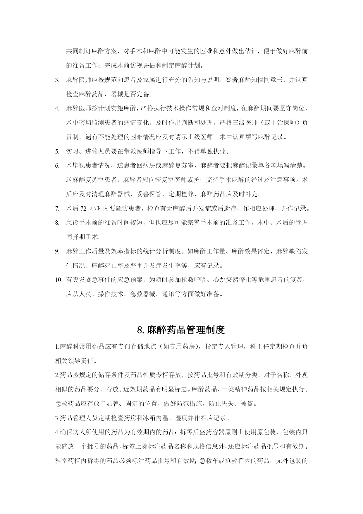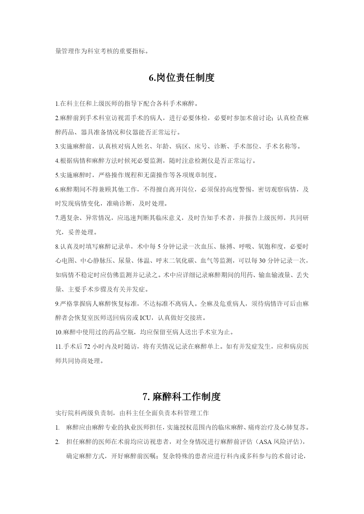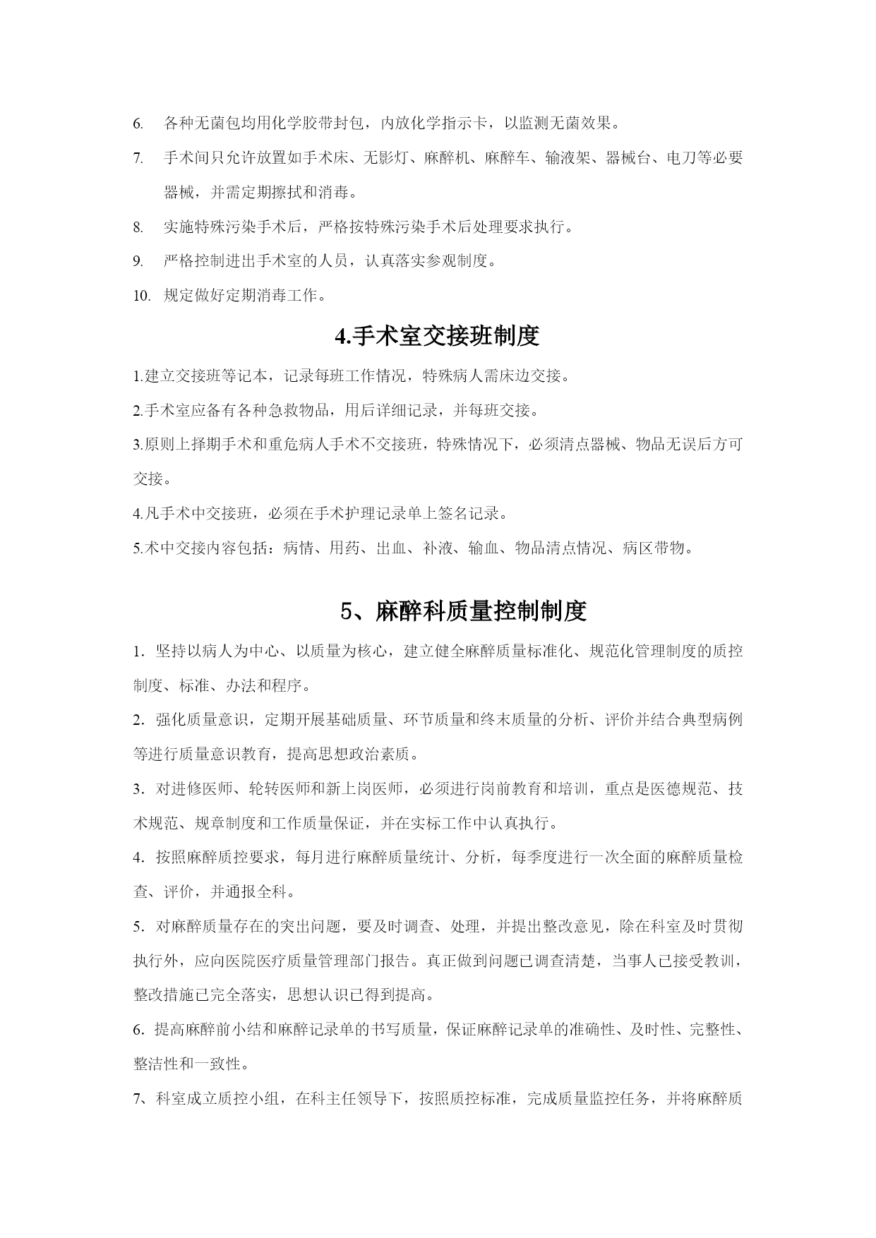 麻醉手术部制度优质资料 (可以直接使用,可编辑优质资料,欢迎下载) 1.手术室参观制度 1外院参观人员需经医务处或本科室领导同意,方可入内。 2参观人员必须更换手术衣、裤、鞋和戴口罩、帽子后方可进入。 3参观人者应该在本院或本科室工作人员指引、管理下参观,不得随意走动和出入。 4参观者必须严格遵守无菌操作原则,与手术者保持一定的距离,不得少于30cm,未经允许不得随意搬动手术室器械、设备和物品。 5医学生在参观、见习前,应由负责带教老师与手术室事先联系,参观人员应服从手术室人员统一指挥。 6本科医生或进修医生参观手术时,需所在科主任提出申请,由手术室统一安排,原则上只限参观与本科室有关的手术。 2.手术室清洁制度 1手术室应用湿式打扫。 2手术室应保持整洁、无尘、无蝇,每天手术室前后擦拭室内物品表面,用消毒液拖地。 3每日用消毒液清洁限制区走廊两2次 4接送病人应采用交换车,无交换车的情况下应注意进出时车轮的清洁,每天清洁车辆并更换被服。 5每周对手术间彻底清扫一次,并进行空气消毒。 6所有进入限制区的物品设备均应拆除外包装,擦拭干净方可入内。 7若为清洁手术室,每周清洁回风口及滤网,设备层应有专人管理。 8手术室的拖把、敷料桶、抹布等清洁工具应固定使用,定期消毒处理。 3.手术室消毒隔离制度 严格区分限制区、半限制区、非限制区,手术人员按要求着装及活动。 专人负责消毒灭菌的效果监测、感染监控、资料储存和信息上报工作。 手术室应该划分急诊手术区与择期手术区,并专设感染手术间,应诊断不明在无菌手术间施感染手术后,必须进行彻底的清扫与消毒。 手术间污物分类放置,使用后的一次性医疗用品及器械均应视为感染性废物。 无菌物品应放在无菌室,分类定位放置,室内通风、干燥、清洁,做到无尘、无杂物,每日检查,定期消毒,确保无霉变、过期现象。 各种无菌包均用化学胶带封包,内放化学指示卡,以监测无菌效果。 手术间只允许放置如手术床、无影灯、麻醉机、麻醉车、输液架、器械台、电刀等必要器械,并需定期擦拭和消毒。 实施特殊污染手术后,严格按特殊污染手术后处理要求执行。 严格控制进出手术室的人员,认真落实参观制度。 规定做好定期消毒工作。 4.手术室交接班制度 1.建立交接班等记本,记录每班工作情况,特殊病人需床边交接。 2.手术室应备有各种急救物品,用后详细记录,并每班交接。 3.原则上择期手术和重危病人手术不交接班,特殊情况下,必须清点器械、物品无误后方可交接。 4.凡手术中交接班,必须在手术护理记录单上签名记录。 5.术中交接内容包括:病情、用药、出血、补液、输血、物品清点情况、病区带物。 5、麻醉科质量控制制度 1.坚持以病人为中心、以质量为核心,建立健全麻醉质量标准化、规范化管理制度的质控制度、标准、办法和程序。 2.强化质量意识,定期开展基础质量、环节质量和终末质量的分析、评价并结合典型病例等进行质量意识教育,提高思想政治素质。 3.对进修医师、轮转医师和新上岗医师,必须进行岗前教育和培训,重点是医德规范、技术规范、规章制度和工作质量保证,并在实标工作中认真执行。 4.按照麻醉质控要求,每月进行麻醉质量统计、分析,每季度进行一次全面的麻醉质量检查、评价,并通报全科。 5.对麻醉质量存在的突出问题,要及时调查、处理,并提出整改意见,除在科室及时贯彻执行外,应向医院医疗质量管理部门报告。真正做到问题已调查清楚,当事人已接受教训,整改措施已完全落实,思想认识已得到提高。 6.提高麻醉前小结和麻醉记录单的书写质量,保证麻醉记录单的准确性、及时性、完整性、整洁性和一致性。 7、科室成立质控小组,在科主任领导下,按照质控标准,完成质量监控任务,并将麻醉质量管理作为科室考核的重要指标。 6.岗位责任制度 1.在科主任和上级医师的指导下配合各科手术麻醉。 2.麻醉前到手术科室访视需手术的病人,进行必要体检,必要时参加术前讨论;认真检查麻醉药品、器具准备情况和仪器能否正常运行。 3.实施麻醉前,认真核对病人姓名、年龄、病区、床号、诊断、手术部位、手术名称等。 4.根据病情和麻醉方法时候死必要监测,随时注意检测仪是否正常运行。 5.实施麻醉时,严格操作规程和无菌操作等各项规章制度。 6.麻醉期间不得兼顾其他工作,不得擅自离开岗位,必须保持高度警惕,密切观察病情,及时发现病情变化,准确诊断,及时处理。 7.遇复杂、异常情况,应迅速判断其临床意义,及时告知手术者,并报告上级医师,共同研究,妥善处理。 8.认真及时填写麻醉记录单,术中每5分钟记录一次血压、脉搏、呼吸、氧饱和度,必要时心电图、中心静脉压、尿量、体温、呼末二氧化碳、血气等监测,可以每30分钟记录一次,如病情不稳定时应仿佛监测并记录之。术中应详细记录麻醉期间的用药、输血输液量、丢失量、主要手术步骤及有