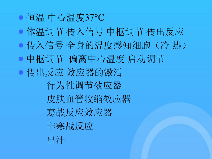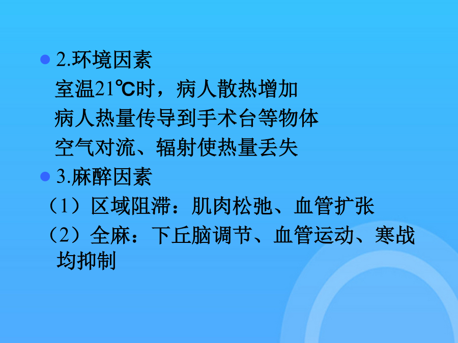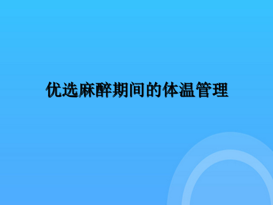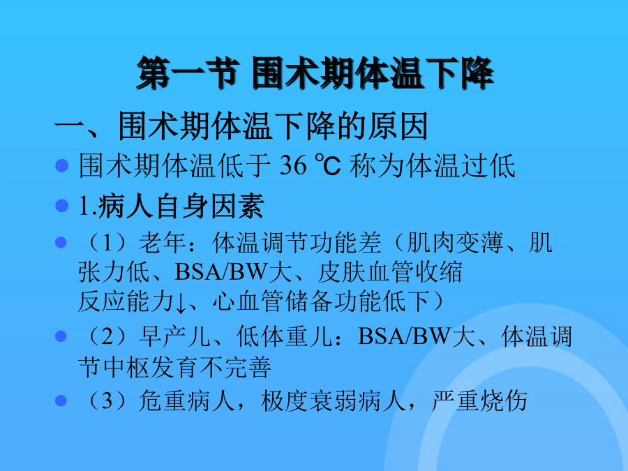 麻醉期间的体温管理优选麻醉期间的体温管理恒温中心温度37°C 体温调节传入信号中枢调节传出反应 传入信号全身的温度感知细胞(冷热) 中枢调节偏离中心温度启动调节 传出反应效应器的激活 行为性调节效应器 皮肤血管收缩效应器 寒战反应效应器 非寒战反应 出汗第一节围术期体温下降第二节围术期体温升高28~18℃15~45 ②特点:降温缓慢,寒战反应少, (4)血流温度:需特殊的温度探头 应用低温时要做到①避免御寒反应 中枢调节偏离中心温度启动调节 抑制酶的活性和细菌的活力 3、注意:复温过高可致反应性高热 深低温→动脉直接测压 (2)适应证:深低温停循环的手术 会阴勿与冰块接触 血液中低温凝血因子及纤维蛋白原↓凝血障碍 肝移植时冷灌注液冲洗后的供肝的植入及输血 围术期体温低于36℃称为体温过低 TURP时膀胱冲洗 血液中低温凝血因子及纤维蛋白原↓凝血障碍第三节人工低温bodytemperaturemindchanges 34℃神志清,记忆力减弱或消失 33~32℃开始嗜睡,对简单命令有反应 能随意运动,但表达能力减退 32~31℃开始有麻醉作用,随意运动失调 29℃对命令仍有反应,但随意运动丧失 27℃反应迟钝,命令无反应,不能说话 26~25℃瞳孔对光反射、呕吐反射全消失 20~18℃意识完全消失一、低温的适应证: 1、心血管手术: (1)心脏手术:房缺、室缺修补术,肺A瓣狭窄切开术 瓣膜置换术 (2)大血管手术:降主动脉狭窄、颈动脉狭窄 人工血管置换术等 (3)不同体温时阻断循环的安全时限 体温(℃)阻断循环时间(min) 32~30℃8~9 30~28℃10~15 28~18℃15~45 <18℃45~60 (4)注意:严格掌握适应证和阻断时间2、神经外科手术:脑血管畸形、脑动脉瘤 血运丰富的肿瘤等手术 3、其它: (1)肝、肾手术:常温下肝阻断时间≤20min 肾阻断时间≤40min 重要脏器循环阻断时限(min) 37℃28~32℃25℃ 大脑3814~15 脊髓30~45 肾30~4060 肝2060 (2)创伤大、失血多的手术 (3)控制高热:甲亢危象、恶性高热 (4)脑复苏(二)降温方法 1、体表降温: (1)冰水浴或冰屑降温法: ①方法:身体的大部分浸泡在冰水中 维持水温0~4℃ 温度降至34~33℃→撤去冰水 ②体温续降:少者2~3℃,多者5~6℃ 续降程度:体型、室温、药物、 冰浴时间 ③注意:心前区、耳廓、指趾、 会阴勿与冰块接触 ④优点:效果好、简单,不需体外循环(2)冰袋、冰帽降温法: ①方法:冰袋置于大血管浅在部位 头部置于冰槽或戴冰帽 或二者联合应用 ②特点:降温缓慢,寒战反应少, 体温续降少 ③适应证:适用于婴幼儿 脑复苏、术中高热、严重感染 ④缺点:成人降温效果差、尤其体胖者(3)变温毯降温法: ①方法:变温毯内管道充满冰水,并与冷热水 交换机相连,管道内的水不断流动、 循环→体温下降 ②适用:浅低温、低温的维持2、体腔降温:多用于胸、腹腔手术 (1)方法:0~4℃生理盐水灌洗胸、腹腔 (2)注意:冰水接触心脏→心律失常 (3)缺点:需大量生理盐水 操作时需暂停手术 (4)辅助手段、补救方法,一般不单独应用3、体外循环血液降温法:体外循环手术 (1)装置:人工心肺机、热交换器(变温器) (2)方法:血流引向体外→热交换器冷却 →用泵将血回输体内 (3)特点:降温、复温快 可控性好 血流丰富的心、脑、肝、肾降温快 (4)注意:降温不均匀、温差大→代谢性酸中毒 水和血温差≤8~10℃,以免形成气栓 最高水温不宜>42℃,以免破坏RBC4、体外循环与体表降温相结合的方法: (1)方法:体表降温至32℃→开胸连接体外循环机 →体外循环血液降温 (2)适应证:深低温停循环的手术 (3)注意:应严格掌握适应证和循环阻断时限 5、静脉输入冷液体(4~6℃)降温: (1)适用于术中高热、严重创伤 (2)注意:冷液体输注过快→心律失常(三)复温 1、时机:手术步骤基本完毕时开始 2、常用方法: (1)体表复温:热水袋、电热毯、变温毯等 水温不宜超过45℃ (2)体腔复温:胸、腹腔40~45℃温盐水复温 (3)体外循环下血液复温 3、注意:复温过高可致反应性高热 已达32℃者一般不必复温 体温>32℃停止复温,注意保温7%减少麻醉药用量 脑复苏、术中高热、严重感染 脊髓30~45 体温(℃)阻断循环时间(min) 30~28℃10~15 1、体温监测:降温过程中,身体各部分温度 (1)方法:体表降温至32℃→开胸连接体外循环机 出汗 肾30~4060 中枢调节偏离中心温度启动调节 2、体腔降温:多用于胸、腹腔手术 60~70% 手术操作影响 ①方法:冰袋置于大血管浅在部位 (4)辅助手段、补救方法,一般不单独应用 深