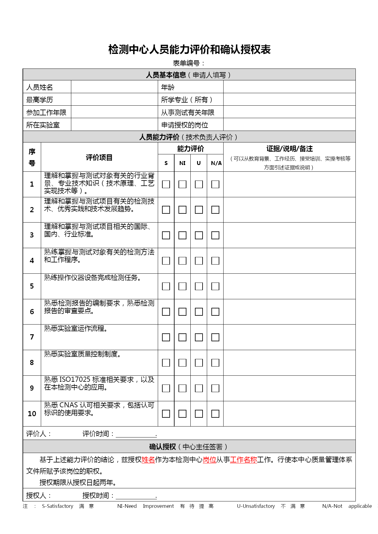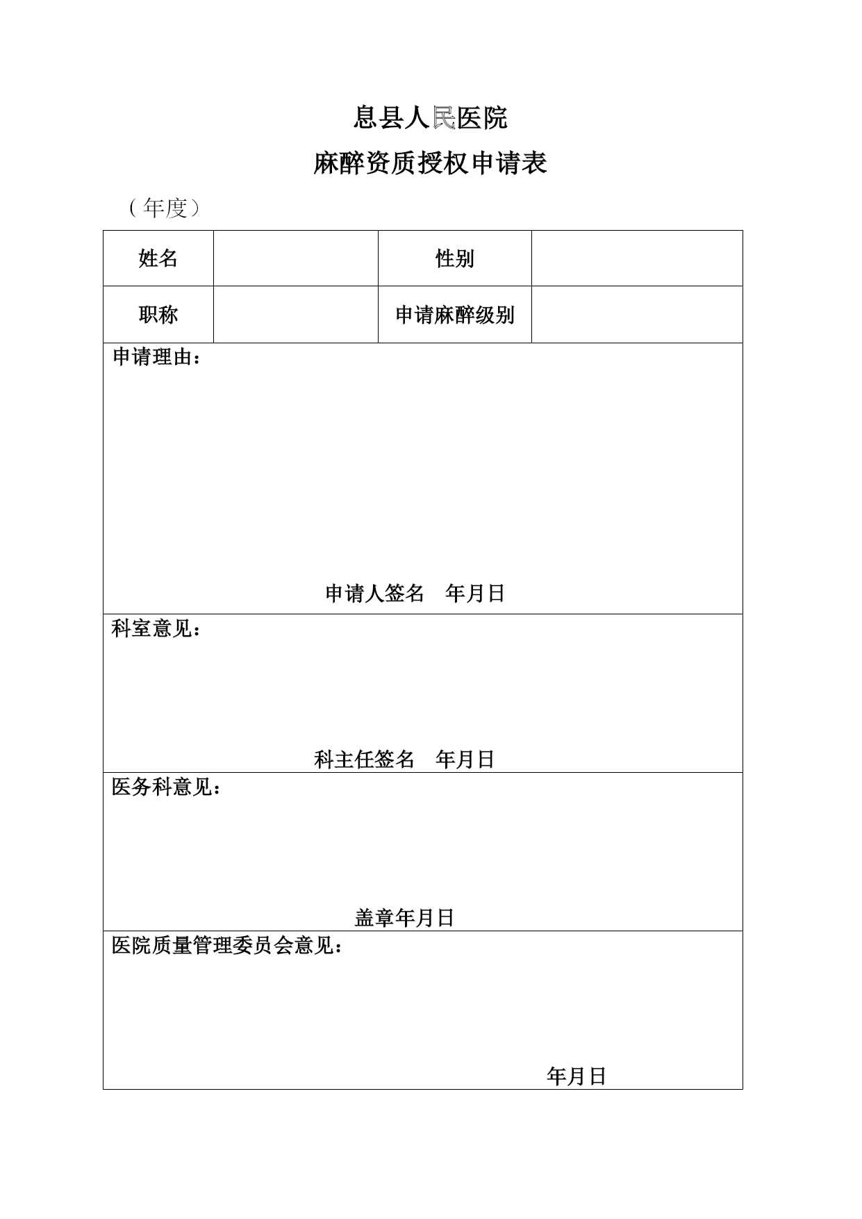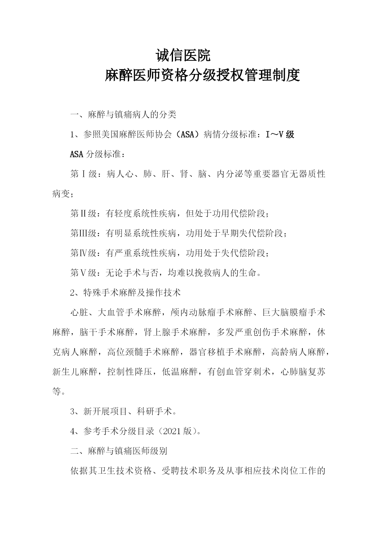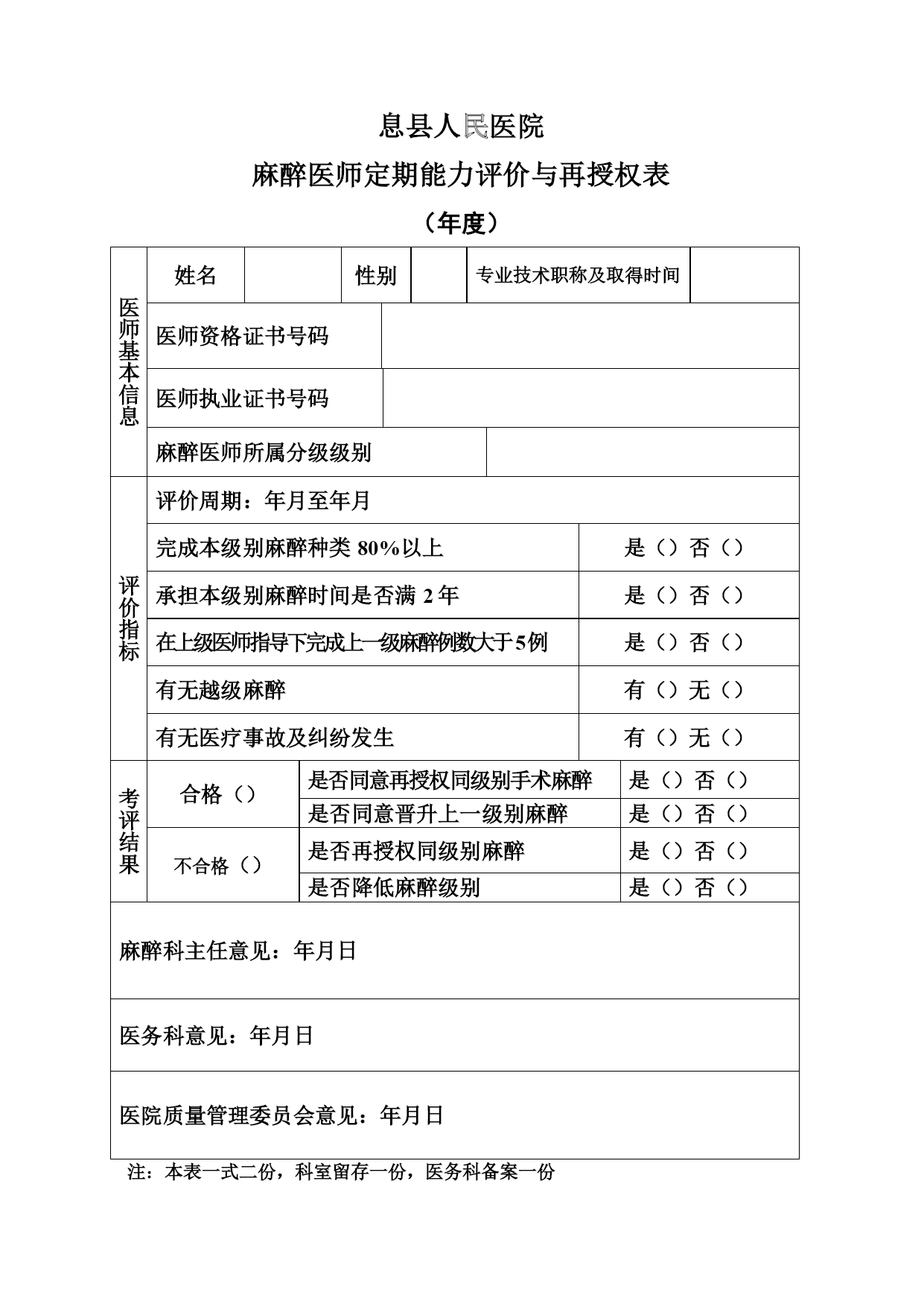 麻醉医师定期能力评价再授权表》《麻醉资质授权申请表》最新文档 (可以直接使用,可编辑最新文档,欢迎下载) 息县人民医院 麻醉医师定期能力评价与再授权表 (年度) 医师基本信息姓名性别专业技术职称及取得时间医师资格证书号码医师执业证书号码麻醉医师所属分级级别评价指标评价周期:年月至年月完成本级别麻醉种类80%以上是()否()承担本级别麻醉时间是否满2年是()否()在上级医师指导下完成上一级麻醉例数大于5例是()否()有无越级麻醉有()无()有无医疗事故及纠纷发生有()无()考评结果合格()是否同意再授权同级别手术麻醉是()否()是否同意晋升上一级别麻醉是()否()不合格()是否再授权同级别麻醉是()否()是否降低麻醉级别是()否()麻醉科主任意见:年月日医务科意见:年月日医院质量管理委员会意见:年月日注:本表一式二份,科室留存一份,医务科备案一份 息县人民医院 麻醉资质授权申请表 (年度) 姓名性别职称申请麻醉级别申请理由: 申请人签名年月日科室意见: 科主任签名年月日医务科意见: 盖章年月日医院质量管理委员会意见: 年月日检测中心人员能力评价和确认授权表 表单编号: 人员基本信息(申请人填写)人员姓名年龄最高学历所学专业(所有)参加工作年限从事测试有关年限所在实验室申请授权的岗位人员能力评价(技术负责人评价)序号评价项目能力评价证据/说明/备注 (可以从教育背景、工作经历、接受培训、实操考核等方面引述证据或说明)SNIUN/A1理解和掌握与测试对象有关的行业背景、专业技术知识(技术原理、工艺实现技术等)。FORMCHECKBOXFORMCHECKBOXFORMCHECKBOXFORMCHECKBOX2理解和掌握与测试项目有关的检测技术、优秀实践和技术发展趋势。FORMCHECKBOXFORMCHECKBOXFORMCHECKBOXFORMCHECKBOX3理解和掌握与测试项目相关的国际、国内、行业标准。FORMCHECKBOXFORMCHECKBOXFORMCHECKBOXFORMCHECKBOX4熟练掌握与测试对象有关的检测方法和工作程序。FORMCHECKBOXFORMCHECKBOXFORMCHECKBOXFORMCHECKBOX5熟练操作仪器设备完成检测任务。FORMCHECKBOXFORMCHECKBOXFORMCHECKBOXFORMCHECKBOX6熟悉检测报告的编制要求,熟悉检测报告的审查要点。FORMCHECKBOXFORMCHECKBOXFORMCHECKBOXFORMCHECKBOX7熟悉实验室运作流程。FORMCHECKBOXFORMCHECKBOXFORMCHECKBOXFORMCHECKBOX8熟悉实验室质量控制制度。FORMCHECKBOXFORMCHECKBOXFORMCHECKBOXFORMCHECKBOX9熟悉ISO17025标准相关要求,以及在本检测中心的应用。FORMCHECKBOXFORMCHECKBOXFORMCHECKBOXFORMCHECKBOX10熟悉CNAS认可相关要求,包括认可标识的使用要求。FORMCHECKBOXFORMCHECKBOXFORMCHECKBOXFORMCHECKBOX评价人:评价时间:.确认授权(中心主任签署)基于上述能力评价的结论,兹授权姓名作为本检测中心岗位从事工作名称工作。行使本中心质量管理体系文件所赋予该岗位的职权。 授权期限从授权日起两年。授权人:授权时间:.注:S-Satisfactory满意NI-NeedImprovement有待提高U-Unsatisfactory不满意N/A-Notapplicable不适用诚信医院 麻醉医师资格分级授权管理制度 一、麻醉与镇痛病人的分类 1、参照美国麻醉医师协会(ASA)病情分级标准:I~V级 ASA分级标准: 第Ⅰ级:病人心、肺、肝、肾、脑、内分泌等重要器官无器质性病变; 第Ⅱ级:有轻度系统性疾病,但处于功用代偿阶段; 第Ⅲ级:有明显系统性疾病,功用处于早期失代偿阶段; 第Ⅳ级:有严重系统性疾病,功用处于失代偿阶段; 第Ⅴ级:无论手术与否,均难以挽救病人的生命。 2、特殊手术麻醉及操作技术 心脏、大血管手术麻醉,颅内动脉瘤手术麻醉、巨大脑膜瘤手术麻醉,脑干手术麻醉,肾上腺手术麻醉,多发严重创伤手术麻醉,休克病人麻醉,高位颈髓手术麻醉,器官移植手术麻醉,高龄病人麻醉,新生儿麻醉,控制性降压,低温麻醉,有创血管穿刺术,心肺