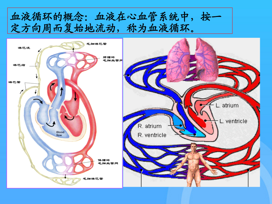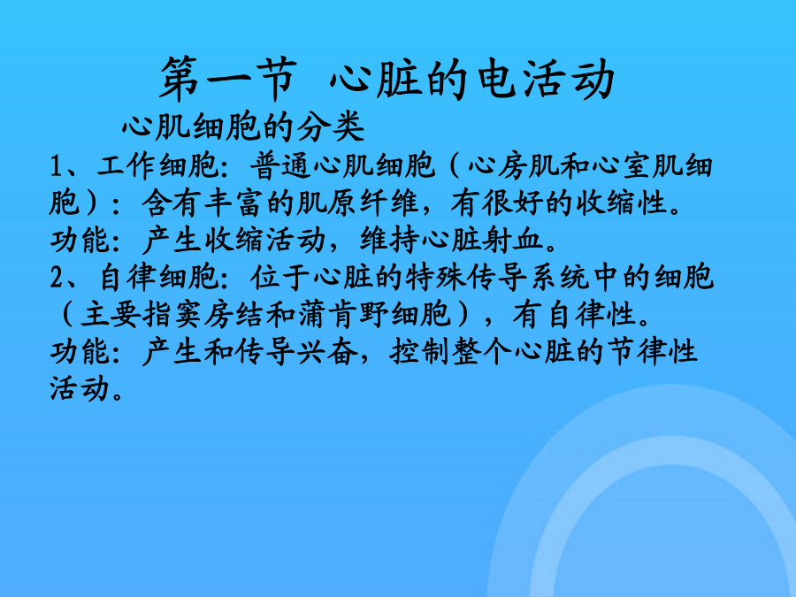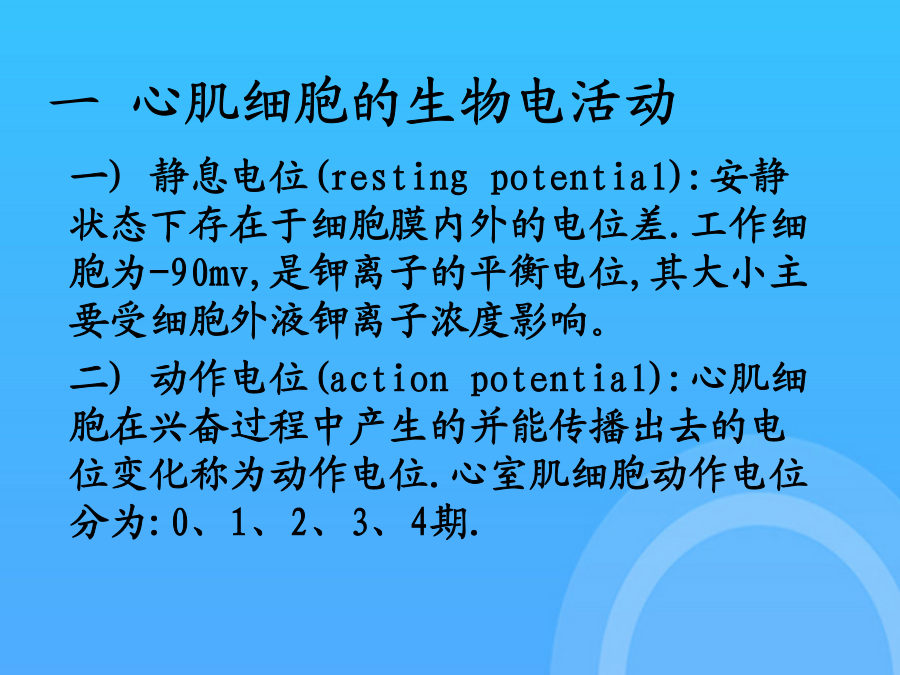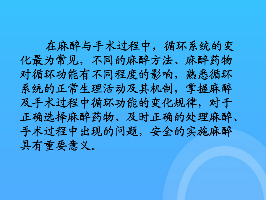 麻醉与循环在麻醉与手术过程中,循环系统的变化最为常见,不同的麻醉方法、麻醉药物对循环功能有不同程度的影响,熟悉循环系统的正常生理活动及其机制,掌握麻醉及手术过程中循环功能的变化规律,对于正确选择麻醉药物、及时正确的处理麻醉、手术过程中出现的问题,安全的实施麻醉具有重要意义。血液循环的概念:血液在心血管系统中,按一定方向周而复始地流动,称为血液循环。第一节心脏的电活动 心肌细胞的分类 1、工作细胞:普通心肌细胞(心房肌和心室肌细胞):含有丰富的肌原纤维,有很好的收缩性。 功能:产生收缩活动,维持心脏射血。 2、自律细胞:位于心脏的特殊传导系统中的细胞(主要指窦房结和蒲肯野细胞),有自律性。 功能:产生和传导兴奋,控制整个心脏的节律性活动。一心肌细胞的生物电活动0心室肌细胞AP的形成机制:1期+30mv_0mv 快Na+通道失活 + 激活Ito通道 ↓ K+一过性外流 ↓ 快速复极化 (1期)2期:0mv,100-150ms O期去极达-40mV时 慢Ca2+通道开始激活 + 激活IK通道 ↓ Ca2+缓慢内流与K+外流处于平衡状态↓ 缓慢复极化 (2期=平台期)3期0MV---90mv 慢Ca2+通道失活 + IK通道通透性↑ K+外流 ↓ 快速复极化 至RP水平 (3期)4期:静息期,膜电位基本稳定于静息 电位水平-90mV。 A、Na+-K+泵:排出3个Na+,摄入2个K+ 生电(外向电流) B、Na+-Ca2+交换:继发主动转运 内运3个Na+,运出1个Ca2+生电(内向电流) C、Ca2+泵:主动将Ca2+排出细胞。 心室肌细胞动作电位时程200-300mS。 心房肌细胞动作电位的形状与心室肌细胞相 似,但时间短,仅150mS。可能是心房肌细 胞对K+的通透性较大所致。 自律细胞的跨膜电位及形成机制 1.窦房结细胞(慢反应自律细胞)的跨膜电位 (1)电位特征: A、最大复极电位(-70mV)和阈电位(-40mV)低; B、0期去极化幅度小(由-70mV升至0~+15mV)、时间长(7MS)、速率慢(10V/S)(慢反应细胞、慢反应电位); C、没有明显的复极1、2期 D、4期自动去极化速度快。二心肌细胞的电生理特性与心律失常(一)兴奋性(excitability):指心肌细胞受到刺激时产生动作电位的能力。其大小用阈值来衡量。1.兴奋性的周期性变化:在一次兴奋过程中,心肌的兴奋性经历了:有效不应期、相对不应期、超长期等变化,其特点是有效不应期特别长(200-300mS)。2.影响兴奋性的因素:1).静息电位水平;2).阈电位水平;3).Na+、Ca2+通道的状态:如:心肌缺血可使细胞内k+外漏而细胞内k+浓度降低,细胞外k+浓度升高,引起心肌细胞除极化,若持续除极化于-50mv或更低时,Na+通道均处于失活状态而丧失产生动作电位的能力。3.兴奋性与心律失常:1.兴奋性的不均一性与心律失常易损期(vulnerableperiod):在整个心房或心室中,在相对不应期开始之初,有一个短暂的时间,应用较强的阈上刺激,容易发生纤维性颤动,称为易损期。心室的易损期在心电图的T波升支到达顶峰前约30ms的时间内,临床电击复律应避开易损期。原因:电异步状态(electricalasynchrony)。R-ON–T现象:在某些病理情况下,期前的兴奋出现在心电图的T波时,也易引起室颤,称为R落入T现象(R-on-Tphenomenon),易诱发室颤,应紧急处理。2.动作电位时程、有效不应期与心律失常 动作电位时程APD:从零期去极化开始到3期复极完毕恢复静息电位的过程。代表膜电位复极时间,反映膜的复极化速度; 有效不应期ERP:代表心肌兴奋性恢复过程,反映膜的再除极化能力。ERP/APD比值增大可抑制心律失常。 在动作电位时程内有效不应期延长或相对延长可减少期前兴奋引起反应的机会,具有抗心律失常作用。 (二)自律性(autorhythmicity)指心肌能够在没有外来刺激的条件下自发的产生节律性兴奋的特性。其高低用单位时间内产生自动兴奋的频率来衡量。1.自律性的产生机制:自律细胞4期自动除极化。2.影响自律性的因素:4期自动除极化速度、最大复极电位水平、阈电位水平。3.自律性与心律失常:1)正常自律性改变:有窦性心动过速、过缓、窦性心律不齐。2)异常自律性当膜内电位由正常水平升至-60--50mv时,正常情况下无自律性的心房心室肌,也可发生4期自动除极而表现出自律性,称为异常自律性。机制:由于膜的除极化导致Ca2+内流的激活和K+外流的衰减所致。3)触发活动(triggeractivity)由后除极引起。后除极(afterdepolarization):是指在动作电位复极化过程中或复极化完毕后出现的膜电位震荡,它是一种阈下除极,若除极