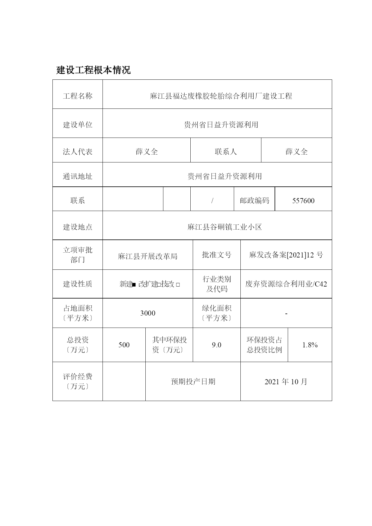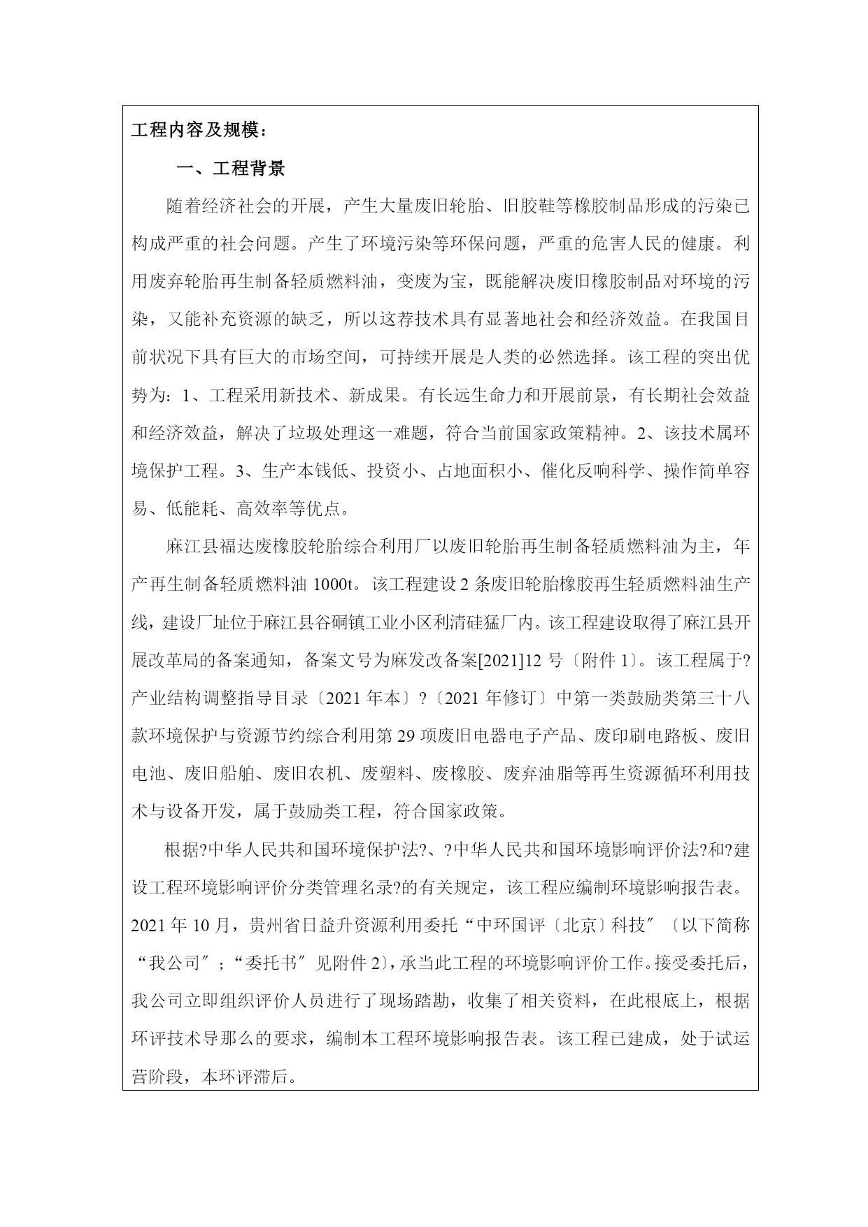 麻江县福达废橡胶轮胎综合利用厂建设项目环境影响评价报告全本【完整版】 (文档可以直接使用,也可根据实际需要修订后使用,可编辑放心下载) 建设工程环境影响报告表 〔报批〕 工程名称:麻江县福达废橡胶轮胎综合利用厂建设工程 建设单位:贵州省日益升资源利用〔盖章〕 编制日期:2021年11月 国家环境保护总局制 ?建设工程环境影响报告表?编制说明 ?建设工程环境影响报告表?由具有从事环境影响评价工作资质的单位编制。 1、工程名称—指工程立项批复时的名称,应不超过30个字〔两个英文字段作一个汉字〕。 2、建设地点—指工程所在地详细地址,公路、铁路应填写起止地点。 3、行业类别—按国标填写。 4、总投资—指工程投资总额。 5、主要环境保护目标—指工程区周围一定范围内集中居民住宅区、学校医院、保护文物、风景名胜区、水源地和生态敏感点等,应尽可能给出保护目标、性质、规模和距厂界距离等。 6、结论与建议—给出本工程清洁生产、达标排放和总量控制的分析结论,确定污染防治措施的有效性,说明本工程对环境造成的影响,给出建设工程环境可行性的明确结论。同时提出减少环境影响的其它建议。 7、预审意见—由行业主管部门填写答复意见,无主管部门工程,可不填。 8、审批意见—由负责审批该工程的环境保护行政主管部门批复建设工程根本情况 工程名称麻江县福达废橡胶轮胎综合利用厂建设工程建设单位贵州省日益升资源利用法人代表薛义全联系人薛义全通讯地址贵州省日益升资源利用联系/邮政编码557600建设地点麻江县谷硐镇工业小区立项审批 部门麻江县开展改革局批准文号麻发改备案[2021]12号建设性质新建■改扩建□技改□行业类别 及代码废弃资源综合利用业/C42占地面积 〔平方米〕3000绿化面积 〔平方米〕-总投资 〔万元〕500其中环保投资〔万元〕9.0环保投资占总投资比例1.8%评价经费 〔万元〕预期投产日期2021年10月 工程内容及规模: 一、工程背景 随着经济社会的开展,产生大量废旧轮胎、旧胶鞋等橡胶制品形成的污染已构成严重的社会问题。产生了环境污染等环保问题,严重的危害人民的健康。利用废弃轮胎再生制备轻质燃料油,变废为宝,既能解决废旧橡胶制品对环境的污染,又能补充资源的缺乏,所以这荐技术具有显著地社会和经济效益。在我国目前状况下具有巨大的市场空间,可持续开展是人类的必然选择。该工程的突出优势为:1、工程采用新技术、新成果。有长远生命力和开展前景,有长期社会效益和经济效益,解决了垃圾处理这一难题,符合当前国家政策精神。2、该技术属环境保护工程。3、生产本钱低、投资小、占地面积小、催化反响科学、操作简单容易、低能耗、高效率等优点。 麻江县福达废橡胶轮胎综合利用厂以废旧轮胎再生制备轻质燃料油为主,年产再生制备轻质燃料油1000t。该工程建设2条废旧轮胎橡胶再生轻质燃料油生产线,建设厂址位于麻江县谷硐镇工业小区利清硅猛厂内。该工程建设取得了麻江县开展改革局的备案通知,备案文号为麻发改备案[2021]12号〔附件1〕。该工程属于?产业结构调整指导目录〔2021年本〕?〔2021年修订〕中第一类鼓励类第三十八款环境保护与资源节约综合利用第29项废旧电器电子产品、废印刷电路板、废旧电池、废旧船舶、废旧农机、废塑料、废橡胶、废弃油脂等再生资源循环利用技术与设备开发,属于鼓励类工程,符合国家政策。 根据?中华人民共和国环境保护法?、?中华人民共和国环境影响评价法?和?建设工程环境影响评价分类管理名录?的有关规定,该工程应编制环境影响报告表。2021年10月,贵州省日益升资源利用委托“中环国评〔北京〕科技〞〔以下简称“我公司〞;“委托书〞见附件2〕,承当此工程的环境影响评价工作。接受委托后,我公司立即组织评价人员进行了现场踏勘,收集了相关资料,在此根底上,根据环评技术导那么的要求,编制本工程环境影响报告表。该工程已建成,处于试运营阶段,本环评滞后。 二、工程内容及规模 1、工程概况 麻江县福达废橡胶轮胎综合利用厂以废旧轮胎再生制备轻质燃料油为主,工程新建2条废旧轮胎橡胶再生轻质燃料油生产线,年产轻质燃料油10000t、炭黑1500t、副产品铁丝3000t。建设厂址位于麻江县谷硐镇工业小区利清硅猛厂内。租用原利清硅猛厂场地建设,占地面积3000m2。 2、生产规模 年产轻质燃料油10000t、炭黑1500t、副产品铁丝3000t。 炭黑性质:是一种HYPERLINK"://baike.baidu/view/1109356.htm"\t"_blank"无定形碳。轻、松而极细的黑色粉末,外表积非常大,范围从10-3000m2/g,是含碳物质〔煤、HYPERLINK"://baike.baidu/view/1093.htm"\t"_bla