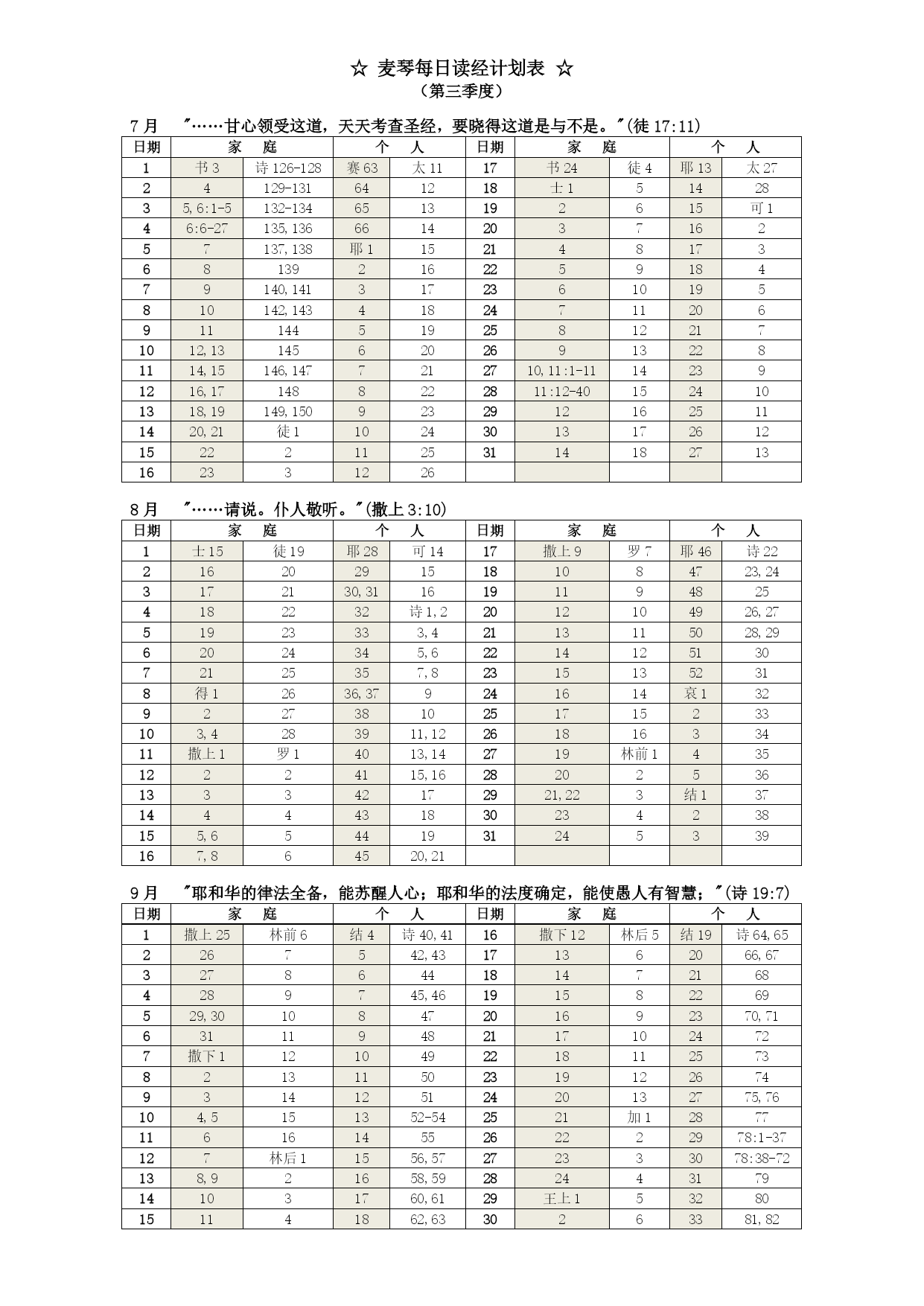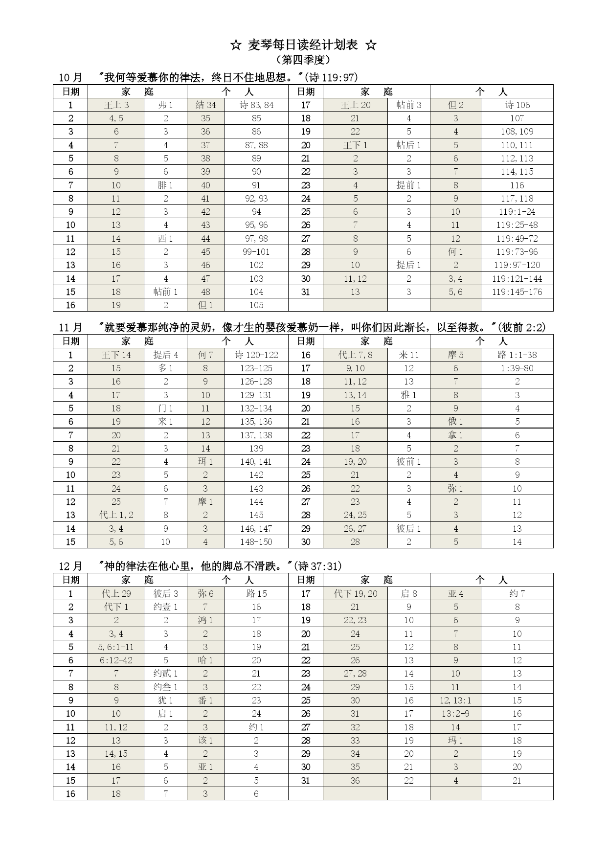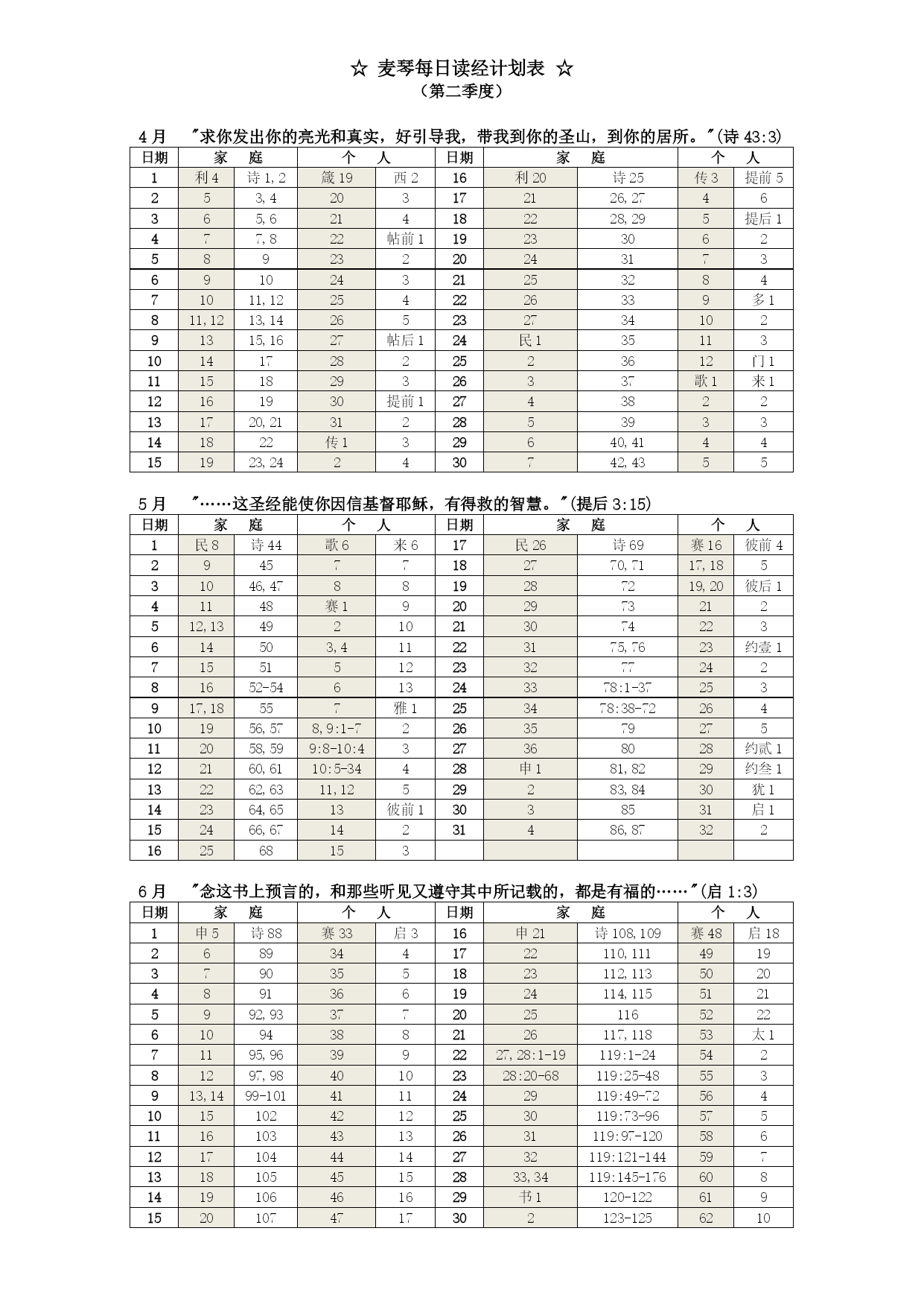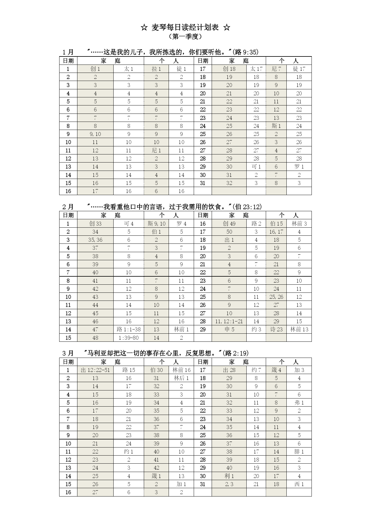麦琴每日读经计划表优质资料 (可以直接使用,可编辑优质资料,欢迎下载) ☆麦琴每日读经计划表☆ (第一季度) 1月"……这是我的儿子,我所拣选的,你们要听他。"(路9:35)日期家庭个人日期家庭个人1创1太1拉1徒117创18太17尼7徒17222221819188183333319201991944444202120102055555212221112166666222322122277777232423132388888242524斯12499,109992526252251011101010262726326111211尼1112728274271213122122829285281314133132930可16罗114151441430312721516155153132383161716616 2月"……我看重他口中的言语,过于我需用的饮食。"(伯23:12)日期家庭个人日期家庭个人1创33可4斯9,10罗416创49路2伯15林前32345伯151750316,174335,3662618出141854377371925196538848203620763995921472187401061022582298411171123692310942128122471024111043139132581125,261211441410142691227131245151115271013281413461612162811,12:1-211429151447路1:1-3813林前129申5约3诗23林前1315481:39-80142 3月"马利亚却把这一切的事存在心里,反复思想。"(路2:19)日期家庭个人日期家庭个人1出12:22-51路15伯30林前1617出28约7箴4加32131631林后118298543141732219309654151833320311076516193442132118弗161720355223312927182136623341310381922377243514114920233882536151251021243992637161361122约1401027381714腓112232411128391815213243421229401916314254箴11330利120174152652加1312,32118西11627632☆麦琴每日读经计划表☆ (第二季度) 4月"求你发出你的亮光和真实,好引导我,带我到你的圣山,到你的居所。"(诗43:3)日期家庭个人日期家庭个人1利4诗1,2箴19西216利20诗25传3提前5253,4203172126,2746365,6214182228,295提后1477,822帖前1192330625892322024317369102432125328471011,122542226339多1811,1213,1426523273410291315,1627帖后124民1351131014172822523612门111151829326337歌1来112161930提前12743822131720,213122853933141822传1329640,4144151923,242430742,4355 5月"……这圣经能使你因信基督耶稣,有得救的智慧。"(提后3:15)日期家庭个人日期家庭个人1民8诗44歌6来617民26诗69赛16彼前4294577182770,7117,18531046,478819287219,20彼后141148赛19202973212512,1349210213074223614503,411223175,7623约壹17155151223327724281652-54613243378:1-37253917,18557雅1253478:38-72264101956,578,9:1-72263579275112058,599:8-10:4327368028约贰1122160,6110:5-34428申181,8229约叁1132262,6311,12529283,8430犹1142364,6513彼前13038531启1152466,6714231486,87322162568153 6月"念这书上预言的,和那些听见又遵守其中所记载的,都是有福的……"(启1:3)日期家庭个人日期家庭个人1申5诗88赛33启316申21诗108,109赛48启1826893441722110,111491937903551823112,113502048913661924114,11551215992,9337720251165222610943882126117,11853太171195,963992227,28:1-19