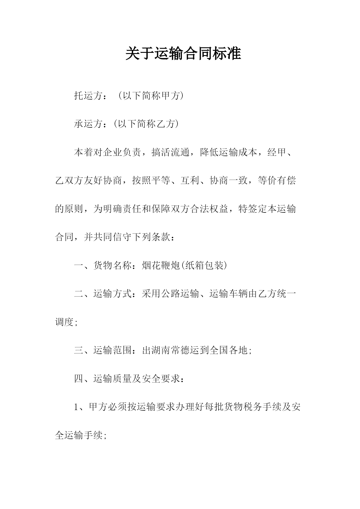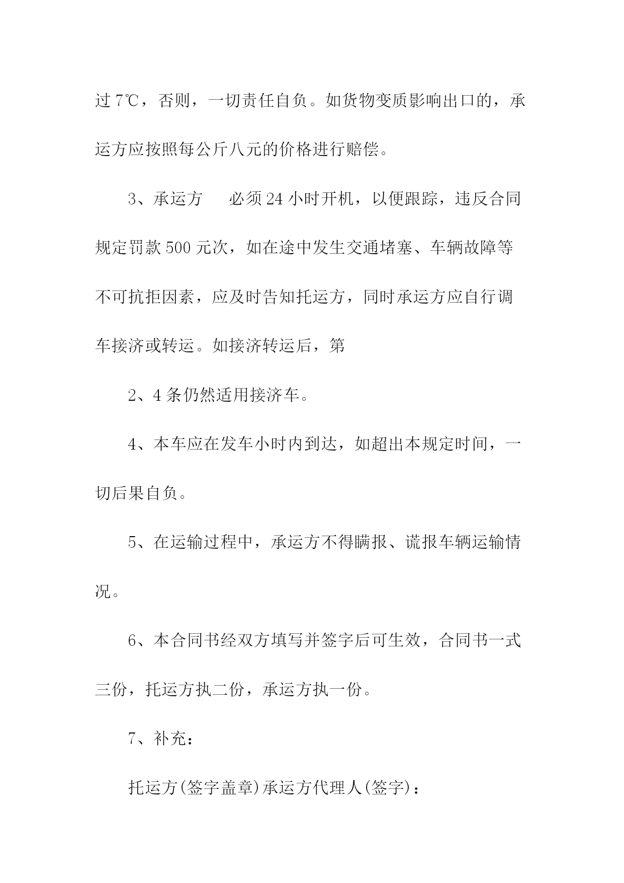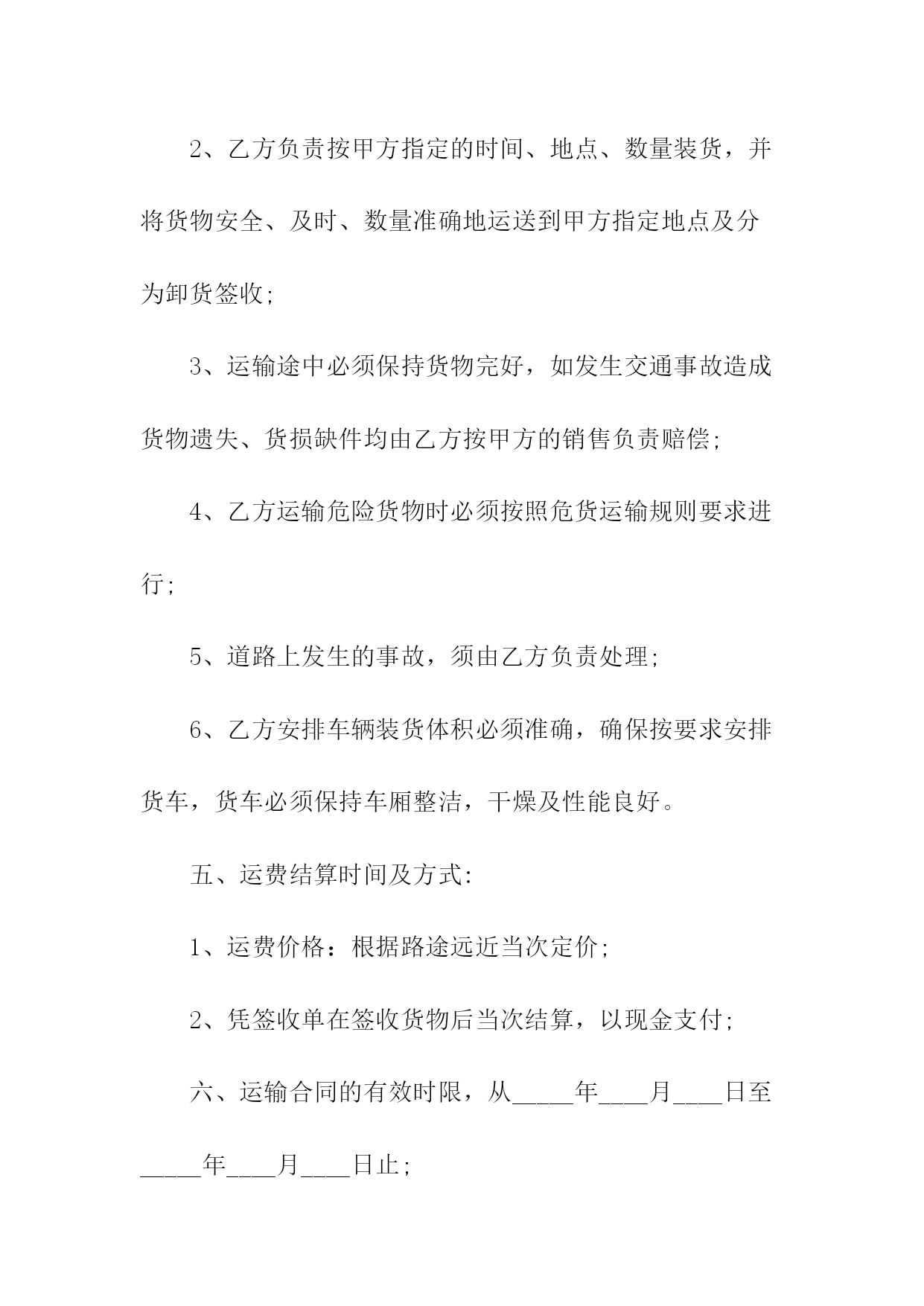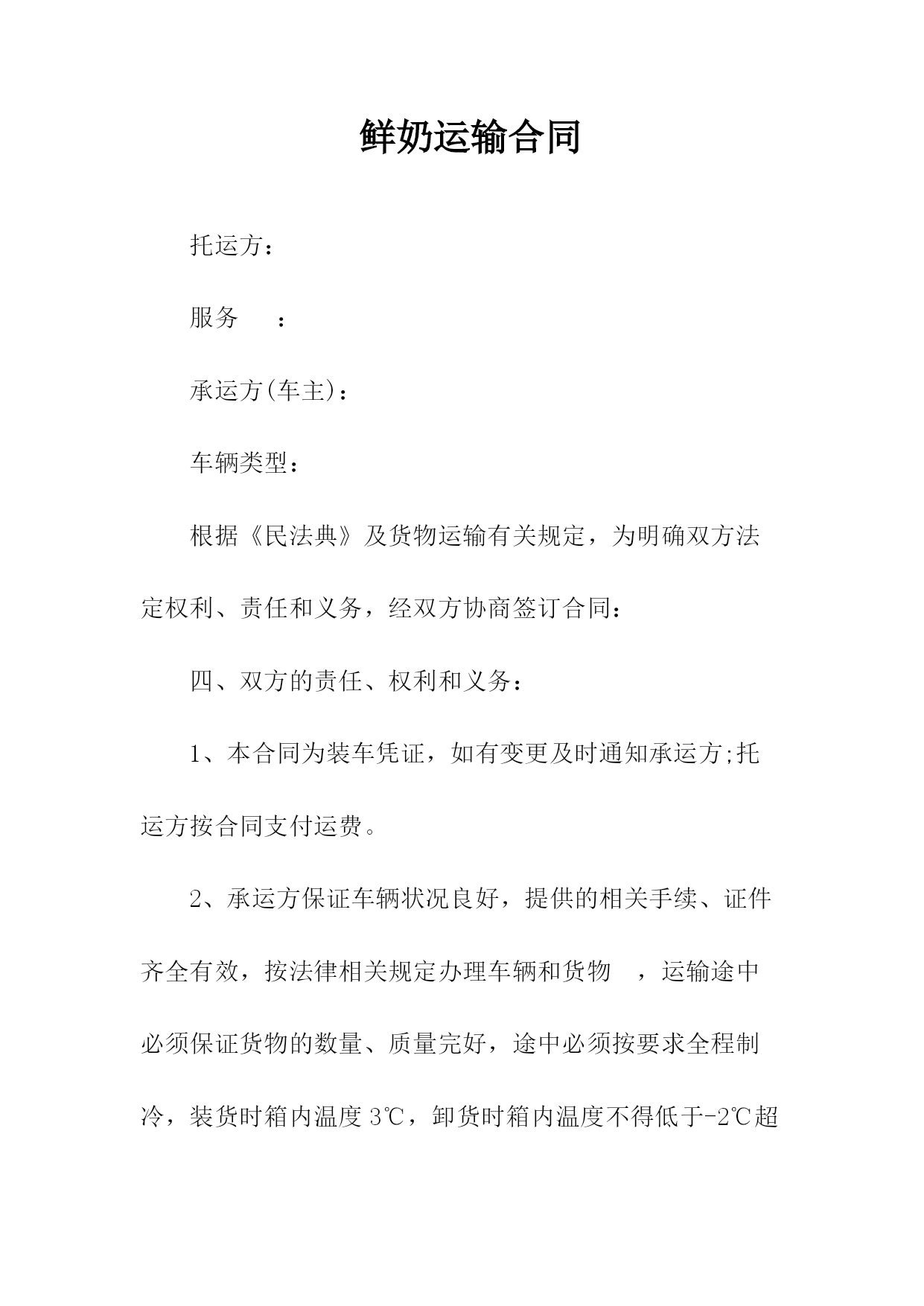 鲜奶运输合同 托运方:服务:承运方(车主):车辆类型:根据《民法典》及货物运输有关规定,为明确双方法定权利、责任和义务,经双方协商签订合同:四、双方的责任、权利和义务:1、本合同为装车凭证,如有变更及时通知承运方;托运方按合同支付运费。2、承运方保证车辆状况良好,提供的相关手续、证件齐全有效,按法律相关规定办理车辆和货物,运输途中必须保证货物的数量、质量完好,途中必须按要求全程制冷,装货时箱内温度3℃,卸货时箱内温度不得低于-2℃超过7℃,否则,一切责任自负。如货物变质影响出口的,承运方应按照每公斤八元的价格进行赔偿。3、承运方必须24小时开机,以便跟踪,违反合同规定罚款500元次,如在途中发生交通堵塞、车辆故障等不可抗拒因素,应及时告知托运方,同时承运方应自行调车接济或转运。如接济转运后,第2、4条仍然适用接济车。4、本车应在发车小时内到达,如超出本规定时间,一切后果自负。5、在运输过程中,承运方不得瞒报、谎报车辆运输情况。6、本合同书经双方填写并签字后可生效,合同书一式三份,托运方执二份,承运方执一份。7、补充:托运方(签字盖章)承运方代理人(签字):车次:_____年____月____日关于运输合同标准 托运方:(以下简称甲方)承运方:(以下简称乙方)本着对企业负责,搞活流通,降低运输成本,经甲、乙双方友好协商,按照平等、互利、协商一致,等价有偿的原则,为明确责任和保障双方合法权益,特签定本运输合同,并共同信守下列条款:一、货物名称:烟花鞭炮(纸箱包装)二、运输方式:采用公路运输、运输车辆由乙方统一调度;三、运输范围:出湖南常德运到全国各地;四、运输质量及安全要求:1、甲方必须按运输要求办理好每批货物税务手续及安全运输手续;2、乙方负责按甲方指定的时间、地点、数量装货,并将货物安全、及时、数量准确地运送到甲方指定地点及分为卸货签收;3、运输途中必须保持货物完好,如发生交通事故造成货物遗失、货损缺件均由乙方按甲方的销售负责赔偿;4、乙方运输危险货物时必须按照危货运输规则要求进行;5、道路上发生的事故,须由乙方负责处理;6、乙方安排车辆装货体积必须准确,确保按要求安排货车,货车必须保持车厢整洁,干燥及性能良好。五、运费结算时间及方式:1、运费价格:根据路途远近当次定价;2、凭签收单在签收货物后当次结算,以现金支付;六、运输合同的有效时限,从_____年____月____日至_____年____月____日止;七、本合同共二页一式二份,由甲、乙双方各执一份。甲方(公章):______乙方(公章):______法定代表人(签字):______法定代表人(签字):___________年____月____日_____年____月____日关于运输公司合同 委托方(甲方):山东XX公司承运方(乙方):____县路顺达物流运输经甲乙双方共同协商,特订立此合同,供双方共同遵守。一、货物名称:真空断路器二、运输地点:____县苟村工业园目的地:____省____县、____市车号:鲁6788四、签订运输合同日期:_____年____月10____日预定运输日期:_____年____月____日、____月____日五、包装要求:甲方应按乙方要求进行标准包装。也可以由乙方进行包装,但包装前应检查物品,保证安全运输。六、乙方责任:保证在合同规定期限内将货物安全运抵指定地点。对承运的货物要负责安全,保证货物无短缺、无损坏、无人为变质。在装卸、运输途中一旦出现货物丢失、短少、变质、损坏等情况,原则上按到达地的市场价格进行赔偿。但如果货物的缺失和损坏是由不可抗力、货物自身属性决定的合理损耗或是甲方过错造成、则乙方不承担备尝责任。七、一般货物由乙方负责,贵重货物由甲方负责。甲方应及时对送达货物进行检测,逾期未收货,应向甲方支付保管费用。八、包装运输总费用:5元__。结算方式:已付定金0元余下金额:3元_九、甲方违约责任:乙方按要求将货物送达后,甲方如不足额支付运输费和保管费,乙方对货物享有留置权。十、本合同一式两份:委托方(甲方)和运输公司(乙方)各执一份。甲方签名:________乙方签名:________合同订立日期:_____年____月____日包机运输合同 编号:____________(以下简称包机人)为包用飞机与中国民用航空______售票服务处(以下简称承运人)签订本协议书,双方同意遵守下列条款:(一)包机人于______月______日起包用______型飞机______架次,其航程如下:______月______日自______至______,停留______日______包机费用总共______元。(二)根据包机航程及经停站。可供包机人使用的最大载量为______公斤(内______座位)。如因气象原因或其他特殊