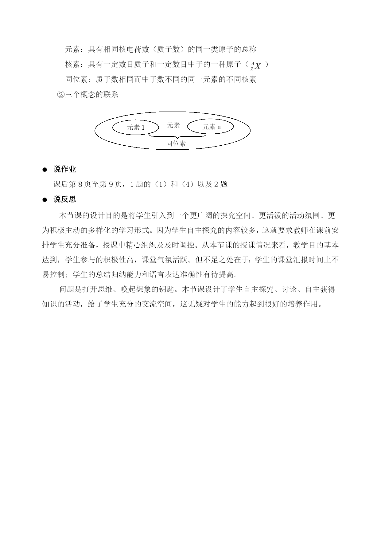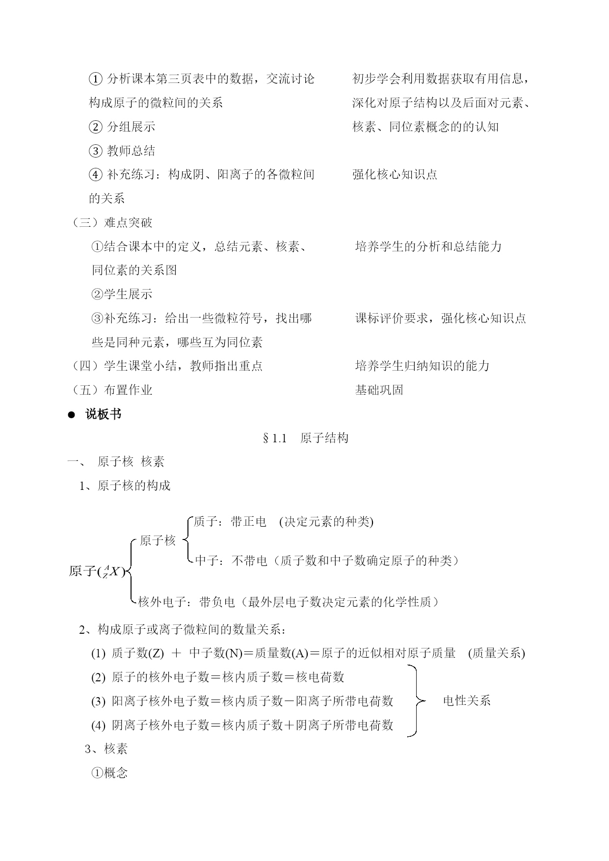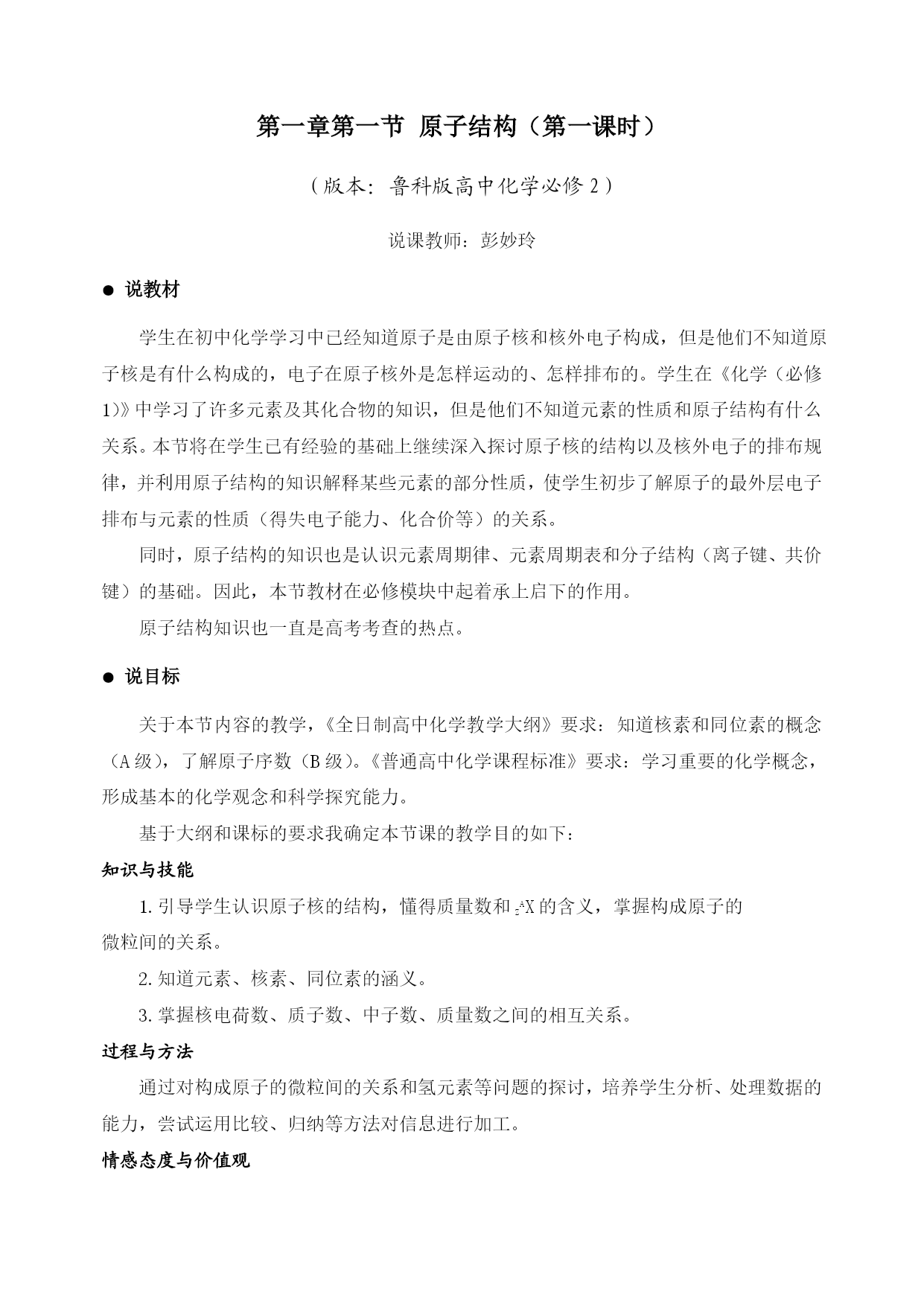 第一章第一节原子结构(第一课时) (版本:鲁科版高中化学必修2) 说课教师:彭妙玲 ●说教材 学生在初中化学学习中已经知道原子是由原子核和核外电子构成,但是他们不知道原子核是有什么构成的,电子在原子核外是怎样运动的、怎样排布的。学生在《化学(必修1)》中学习了许多元素及其化合物的知识,但是他们不知道元素的性质和原子结构有什么关系。本节将在学生已有经验的基础上继续深入探讨原子核的结构以及核外电子的排布规律,并利用原子结构的知识解释某些元素的部分性质,使学生初步了解原子的最外层电子排布与元素的性质(得失电子能力、化合价等)的关系。 同时,原子结构的知识也是认识元素周期律、元素周期表和分子结构(离子键、共价键)的基础。因此,本节教材在必修模块中起着承上启下的作用。 原子结构知识也一直是高考考查的热点。 ●说目标 关于本节内容的教学,《全日制高中化学教学大纲》要求:知道核素和同位素的概念(A级),了解原子序数(B级)。《普通高中化学课程标准》要求:学习重要的化学概念,形成基本的化学观念和科学探究能力。 基于大纲和课标的要求我确定本节课的教学目的如下: 知识与技能 1.引导学生认识原子核的结构,懂得质量数和ZAX的含义,掌握构成原子的 微粒间的关系。 2.知道元素、核素、同位素的涵义。 3.掌握核电荷数、质子数、中子数、质量数之间的相互关系。 过程与方法 通过对构成原子的微粒间的关系和氢元素等问题的探讨,培养学生分析、处理数据的能力,尝试运用比较、归纳等方法对信息进行加工。 情感态度与价值观 通过对构成物质的基本微粒的质量、电性的认识,了解微观世界的物质性,从而 进一步认识物质世界的微观本质;通过原子中存在电性不同的两种微粒的关系,认识原子是矛盾的对立统一体。 通过人类探索原子结构的的介绍,是学生了解假说、模型等科学研究方法和 科学研究的历程,培养他们的科学态度和科学精神,体验科学研究的艰辛与喜悦。 ●说重点和难点 重点:构成原子的微粒间的关系 难点:元素、核素、同位素概念的理解与区分 说教法和学法 教法 采用诱思探究教学法,通过联想质疑、实验探究、分组讨论以及数据分析促进学 生学习能力的全面发展。多媒体辅助教学。 学法 探究法、讨论法、归纳法 说课时 本节知识分为两课时 第一课时:原子结构 第二课时:核外电子排布 说教学过程 教学环节设计意图 导入 学生回忆初中学习的原子结构,然后引出核心知识和科学研究方法,根 多媒体动画演示“卢瑟福α粒子散射实验”。据实验现象提出原子结构模型,初 与葡萄干蛋糕模型的进行的预测对比,步体会假说、模型在科学研究中的 分组讨论两者不同的原因何在。作用 学生代表发言。 重点突破 分析课本第三页表中的数据,交流讨论初步学会利用数据获取有用信息, 构成原子的微粒间的关系深化对原子结构以及后面对元素、 分组展示核素、同位素概念的的认知 教师总结 补充练习:构成阴、阳离子的各微粒间强化核心知识点 的关系 (三)难点突破 ①结合课本中的定义,总结元素、核素、培养学生的分析和总结能力 同位素的关系图 ②学生展示 ③补充练习:给出一些微粒符号,找出哪课标评价要求,强化核心知识点 些是同种元素,哪些互为同位素 (四)学生课堂小结,教师指出重点培养学生归纳知识的能力 (五)布置作业基础巩固 说板书 §1.1原子结构 一、原子核核素 1、原子核的构成 原子核 质子:带正电(决定元素的种类) 中子:不带电(质子数和中子数确定原子的种类) 核外电子:带负电(最外层电子数决定元素的化学性质) 2、构成原子或离子微粒间的数量关系: (1)质子数(Z)+中子数(N)=质量数(A)=原子的近似相对原子质量(质量关系) (2)原子的核外电子数=核内质子数=核电荷数 电性关系 (3)阳离子核外电子数=核内质子数-阳离子所带电荷数 (4)阴离子核外电子数=核内质子数+阴离子所带电荷数 3、核素 ①概念 元素:具有相同核电荷数(质子数)的同一类原子的总称 核素:具有一定数目质子和一定数目中子的一种原子() 同位素:质子数相同而中子数不同的同一元素的不同核素 ②三个概念的联系 元素1 元素n 同位素 元素 说作业 课后至,1题的(1)和(4)以及2题 说反思 本节课的设计目的是将学生引入到一个更广阔的探究空间、更活泼的活动氛围、更为积极主动的多样化的学习形式。因为学生自主探究的内容较多,这就要求教师在课前安排学生充分准备,授课中精心组织及及时调控。从本节课的授课情况来看,教学目的基本达到,学生参与的积极性高,课堂气氛活跃。但不足之处在于:学生的课堂汇报时间上不易控制;学生的总结归纳能力和语言表达准确性有待提高。 问题是打开思维、唤起想象的钥匙。本节课设计了学生自主探究、讨论、自主获得知识的活动,给了学生充分的交流空间,这无疑对学生