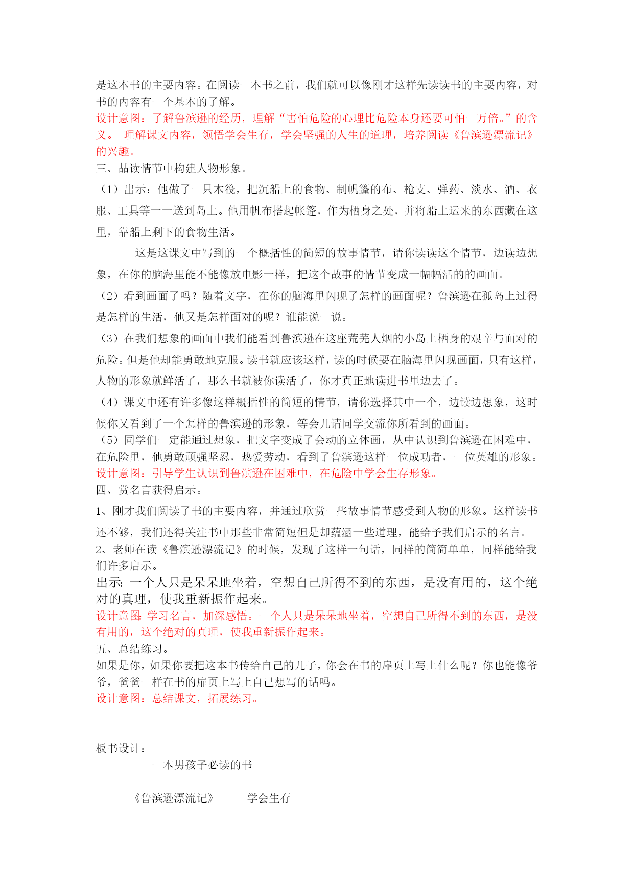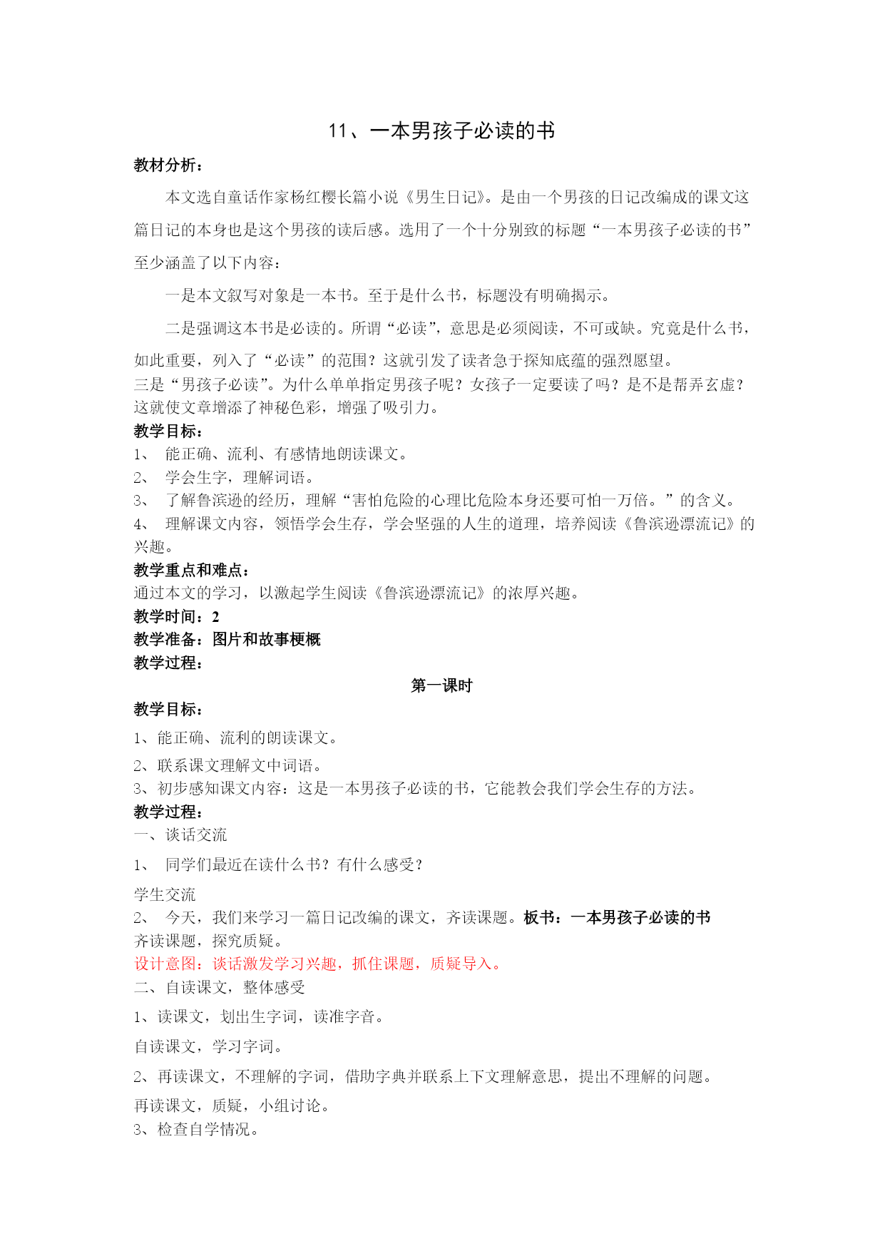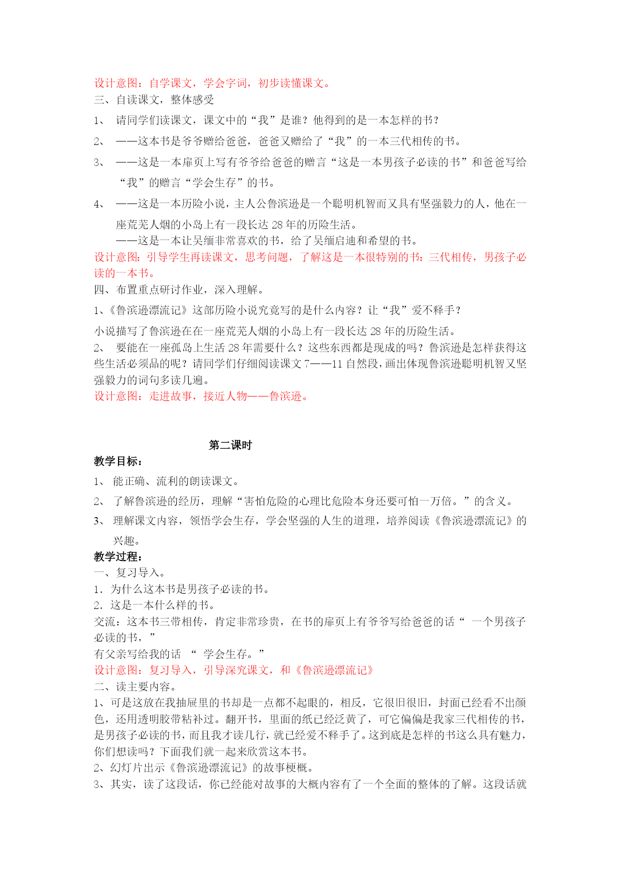 11、一本男孩子必读的书 教材分析: 本文选自童话作家杨红樱长篇小说《男生日记》。是由一个男孩的日记改编成的课文这篇日记的本身也是这个男孩的读后感。选用了一个十分别致的标题“一本男孩子必读的书”至少涵盖了以下内容: 一是本文叙写对象是一本书。至于是什么书,标题没有明确揭示。 二是强调这本书是必读的。所谓“必读”,意思是必须阅读,不可或缺。究竟是什么书,如此重要,列入了“必读”的范围?这就引发了读者急于探知底蕴的强烈愿望。 三是“男孩子必读”。为什么单单指定男孩子呢?女孩子一定要读了吗?是不是帮弄玄虚?这就使文章增添了神秘色彩,增强了吸引力。 教学目标: 1、能正确、流利、有感情地朗读课文。 2、学会生字,理解词语。 3、了解鲁滨逊的经历,理解“害怕危险的心理比危险本身还要可怕一万倍。”的含义。 4、理解课文内容,领悟学会生存,学会坚强的人生的道理,培养阅读《鲁滨逊漂流记》的兴趣。 教学重点和难点: 通过本文的学习,以激起学生阅读《鲁滨逊漂流记》的浓厚兴趣。 教学时间:2 教学准备:图片和故事梗概 教学过程: 第一课时 教学目标: 1、能正确、流利的朗读课文。 2、联系课文理解文中词语。 3、初步感知课文内容:这是一本男孩子必读的书,它能教会我们学会生存的方法。 教学过程: 谈话交流 1、同学们最近在读什么书?有什么感受? 学生交流 2、今天,我们来学习一篇日记改编的课文,齐读课题。板书:一本男孩子必读的书 齐读课题,探究质疑。 设计意图:谈话激发学习兴趣,抓住课题,质疑导入。 自读课文,整体感受 1、读课文,划出生字词,读准字音。 自读课文,学习字词。 2、再读课文,不理解的字词,借助字典并联系上下文理解意思,提出不理解的问题。 再读课文,质疑,小组讨论。 3、检查自学情况。 设计意图:自学课文,学会字词,初步读懂课文。 自读课文,整体感受 请同学们读课文,课文中的“我”是谁?他得到的是一本怎样的书? ——这本书是爷爷赠给爸爸,爸爸又赠给了“我”的一本三代相传的书。 ——这是一本扉页上写有爷爷给爸爸的赠言“这是一本男孩子必读的书”和爸爸写给“我”的赠言“学会生存”的书。 ——这是一本历险小说,主人公鲁滨逊是一个聪明机智而又具有坚强毅力的人,他在一座荒芜人烟的小岛上有一段长达28年的历险生活。 ——这是一本让吴缅非常喜欢的书,给了吴缅启迪和希望的书。 设计意图:引导学生再读课文,思考问题,了解这是一本很特别的书:三代相传,男孩子必读的一本书。 布置重点研讨作业,深入理解。 1、《鲁滨逊漂流记》这部历险小说究竟写的是什么内容?让“我”爱不释手? 小说描写了鲁滨逊在在一座荒芜人烟的小岛上有一段长达28年的历险生活。 2、要能在一座孤岛上生活28年需要什么?这些东西都是现成的吗?鲁滨逊是怎样获得这些生活必须品的呢?请同学们仔细阅读课文7——11自然段,画出体现鲁滨逊聪明机智又坚强毅力的词句多读几遍。 设计意图:走进故事,接近人物——鲁滨逊。 第二课时 教学目标: 能正确、流利的朗读课文。 了解鲁滨逊的经历,理解“害怕危险的心理比危险本身还要可怕一万倍。”的含义。 理解课文内容,领悟学会生存,学会坚强的人生的道理,培养阅读《鲁滨逊漂流记》的兴趣。 教学过程: 一、复习导入。 1.为什么这本书是男孩子必读的书。 2.这是一本什么样的书。 交流:这本书三带相传,肯定非常珍贵,在书的扉页上有爷爷写给爸爸的话“一个男孩子必读的书,” 有父亲写给我的话“学会生存。” 设计意图:复习导入,引导深究课文,和《鲁滨逊漂流记》 二、读主要内容。 1、可是这放在我抽屉里的书却是一点都不起眼的,相反,它很旧很旧,封面已经看不出颜色,还用透明胶带粘补过。翻开书,里面的纸已经泛黄了,可它偏偏是我家三代相传的书,是男孩子必读的书,而且我才读几行,就已经爱不释手了。这到底是怎样的书这么具有魅力,你们想读吗?下面我们就一起来欣赏这本书。 2、幻灯片出示《鲁滨逊漂流记》的故事梗概。 3、其实,读了这段话,你已经能对故事的大概内容有了一个全面的整体的了解。这段话就是这本书的主要内容。在阅读一本书之前,我们就可以像刚才这样先读读书的主要内容,对书的内容有一个基本的了解。 设计意图:了解鲁滨逊的经历,理解“害怕危险的心理比危险本身还要可怕一万倍。”的含义。理解课文内容,领悟学会生存,学会坚强的人生的道理,培养阅读《鲁滨逊漂流记》的兴趣。 三、品读情节中构建人物形象。 (1)出示:他做了一只木筏,把沉船上的食物、制帆篷的布、枪支、弹药、淡水、酒、衣服、工具等一一送到岛上。他用帆布搭起帐篷,作为栖身之处,并将船上运来的东西藏在这里,靠船上剩下的食物生活。 这是这课文中写到的一个概括性的简短的故事情节,请你读读这个情节,边读边想象,在你的脑海里能不能像放电影一样,把这个故事的情