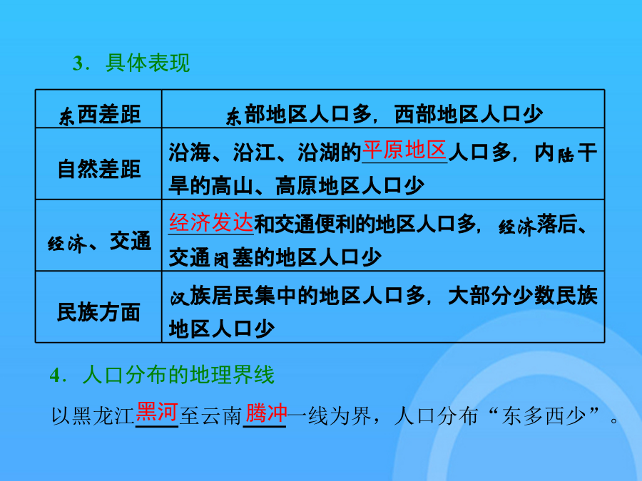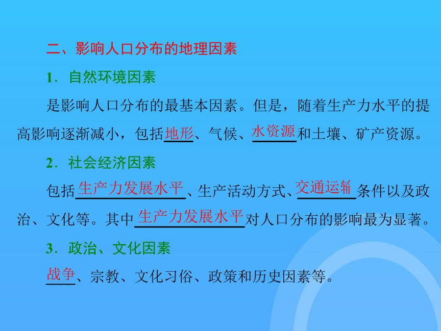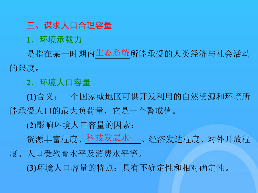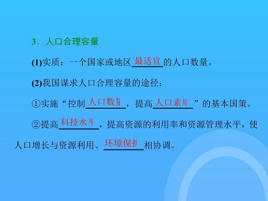 鲁教高考一轮复习地理必修课件人口分布与人口合理容量PPT东西差距世界人口分布“多练提能·熟生巧”见“课时跟踪检测(三)” 煤矿、油田等工矿点也是居民密集点 土层贫瘠,交通不便,气候寒冷,风力较大,人口较稀疏 工农业生产大多集中在平原地区,50%以上的人口居住在平原区 地区的对外开放程度越高,环境人口容量越大,反之越小 自然资源的承载力、经济、社会发展、消费水平 我国人口集中分布在地势的第三级阶梯上 交通对一地经济的发展起重要作用 一般来讲,降水多,人口密集; 土壤肥力、性状不同,人口的分布不同 干旱地区的人类往往逐水而居,人口稠密区依水源多呈点状、线状和片状分布 科技水平越低,环境人口容量越小 高山寒冷区、干旱沙漠区、湿热地区 北美洲东北部(特别是五大湖区) 东部地区人口多,西部地区人口少 煤矿、油田等工矿点也是居民密集点自然环境因素自然环境因素自然环境因素影响因素因素因素我国人口集中分布在地势的第三级阶梯上 北半球温带地区适宜农业生产和人类居住,80%的人口分布于这一地带 受教育水平越低,环境人口容量越小 工农业生产大多集中在平原地区,50%以上的人口居住在平原区 土壤肥力、性状不同,人口的分布不同 一般来讲,降水多,人口密集; 科技水平越低,环境人口容量越小 但在具体时期,制约因素相对不变的情况下,可以对人口容量进行相对定量估计,即具有相对确定性 科技水平越高,环境人口容量越大; 我国西北干旱区,人口集中分布在水资源充足的绿洲地区 东部地区人口多,西部地区人口少 是影响环境人口容量的主要因素。 资源越贫乏,环境人口容量越小 工农业生产大多集中在平原地区,50%以上的人口居住在平原区 科技水平越低,环境人口容量越小最多能供养的人口数量 “多练提能·熟生巧”见“课时跟踪检测(三)” (单击进入电子文档) 谢谢观看!感谢观看