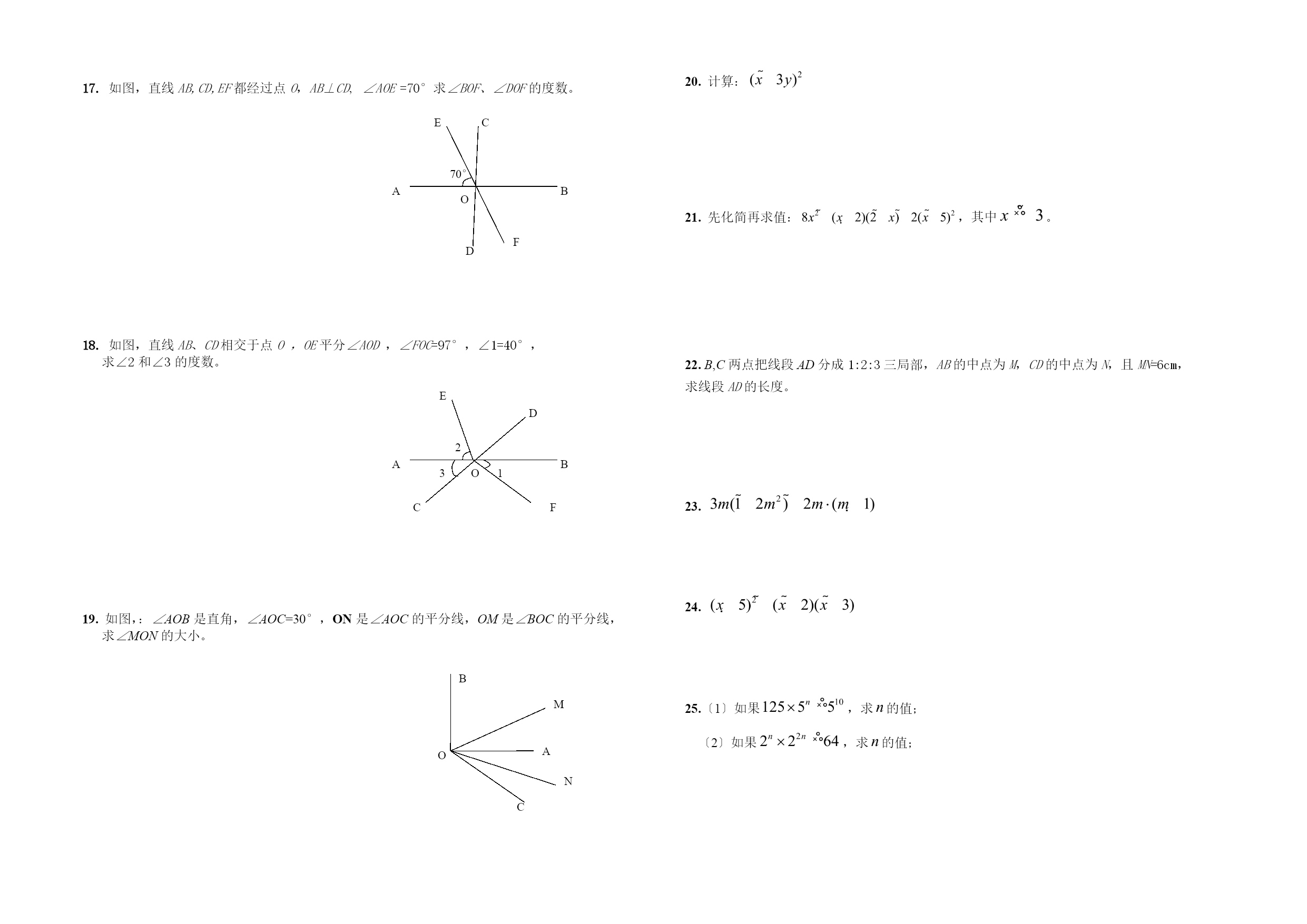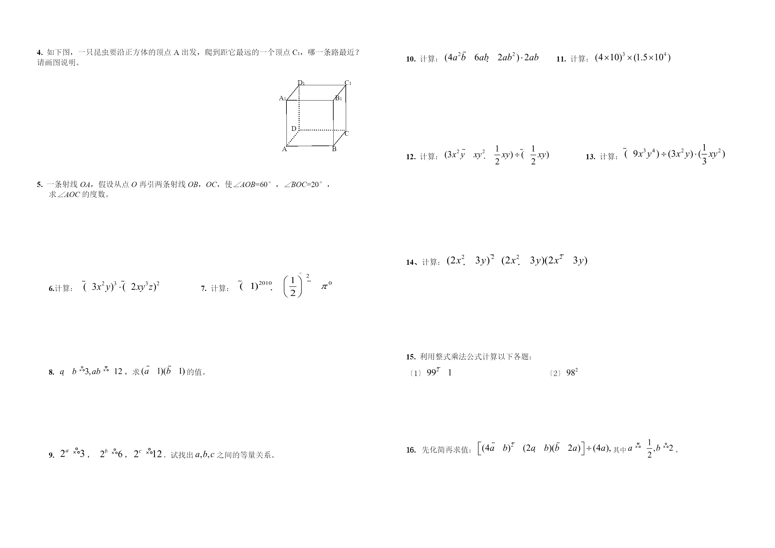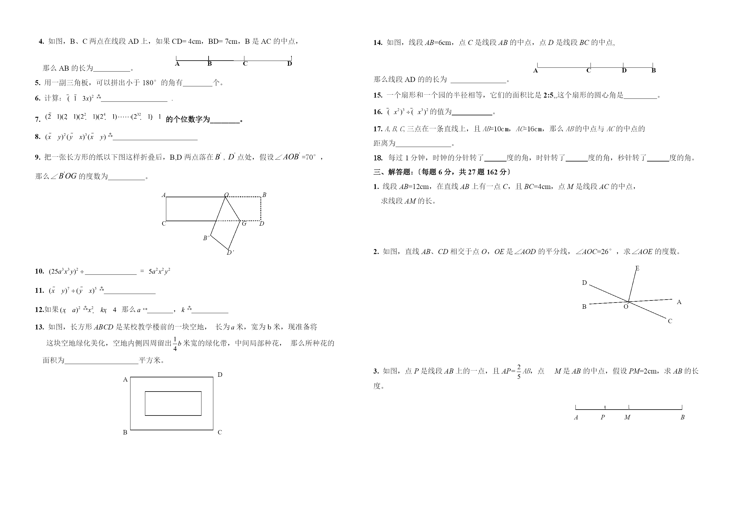 鲁教版初中一年级数学错题集(含答案)【完整版】 (文档可以直接使用,也可根据实际需要修订后使用,可编辑放心下载) 鲁教版六年级下册数学错题集〔—期中考试〕 一.选择题〔每题3分,共15题45分〕 1.如果点C在线段AB上,那么以下各式中: 能说明点C是线段AB中点的有〔〕A.1个B.2个C.3个D.4个 2.如果线段AB=5cm,线段BC=4cm,那么A,C连点之间的距离是〔 〕 A.9cm B.1cmC.1cm或9cm D.以上答案都不对 3.不能用一副三角板拼出的角是〔〕 A.150° B.105°C.15° D.110° 4.同一个平面内互不重合的三条直线的公共点的个数是〔〕 A.可能是0个,1个,2个B.可能是0个,2个,3个 C.可能是0个,1个,2个,3个D.可能是1个,3个 5.如图,一个圆,任意画出它的三条半径,能得到的扇形的个数为〔〕 C B A O A.4个B.5个C.6个D.8个 6.以下说法正确的选项是〔〕 A.两点之间的连线中,直线最短B.假设点P是线段AB的中点,那么AP=BP C.假设AP=BP,那么P是线段AB的中点D.两点之间的线段叫做两点之间的距离 7.从十边形的一个顶点出发,分别连接这个顶点与其余各顶点,可以把这个十边形分成的 三角形的个数是〔〕 A.6B.7C.8D.9 8.如果线段AB=5cm,BC=3cm,那么A,C两点间的距离是〔〕 A.12cm B.11cmC.10cm D.不确定 9.假设,那么代数式的值是〔〕 A.一定为正 B.一定为负C.一定为非负数 D.不能确定 10.〔〕 A.9 B.-9C.3 D.-3 11.那么的值为〔〕 A.3 B.-3C. D. 12.如图,从边长为a的大正方形中挖去一个边长为b的小正方形,小明将左图中的 阴影局部拼成了一个如右图所示的矩形,这一过程可以验证〔〕 b a a b A.B. C.D. 13.以下各式中,能用平方差公式计算的是〔〕 A.B. C.D. 14.经过A,B,C,三点可连接直线的条数为:〔〕 A.只能1条B.只能3条 C.3条或1条D.不能确定 15.延长线段AB到C,以下说法中正确的选项是〔〕 A.点C在线段AB上B.点C在直线AB上 C.点C不在直线AB上D.点C在直线AB的延长线上 二.填空题〔每题3分,共18题54分〕 1.如果一个角的补角是120°,那么这个角的余角是。 2.如以下图所示,共有线段条;共有射线条;有直线条。 3.如图,线段,那么图中所有线段的长度之和等于cm. ABCDE 4.如图,B、C两点在线段AD上,如果CD=4cm,BD=7cm,B是AC的中点, 那么AB的长为。D C B A 5.用一副三角板,可以拼出小于180°的角有个。 6.计算:. 7.的个位数字为________。 8. 9.把一张长方形的纸以下图这样折叠后,B,D两点落在,点处,假设∠=70°, 那么∠的度数为。 D’ B’ G O B D C A 10.= 11. 12.如果那么, 13.如图,长方形ABCD是某校教学楼前的一块空地,长为米,宽为b米,现准备将 这块空地绿化美化,空地内侧四周留出米宽的绿化带,中间局部种花,那么所种花的 面积为平方米。 B D C A 14.如图,线段AB=6cm,点C是线段AB的中点,点D是线段BC的中点, 那么线段AD的的长为。B D C A 15.一个扇形和一个园的半径相等,它们的面积比是2:5,,这个扇形的圆心角是。 16.的值为。 17.A,B,C,三点在一条直线上,且AB=10cm,AC=16cm,那么AB的中点与AC的中点的 距离为。 18.每过1分钟,时钟的分针转了度的角,时针转了度的角,秒针转了度的角。 三、解答题:〔每题6分,共27题162分〕 1.线段AB=12cm,在直线AB上有一点C,且BC=4cm,点M是线段AC的中点, 求线段AM的长。 2.如图,直线AB、CD相交于点O,OE是∠AOD的平分线,∠AOC=26°,求∠AOE的度数。 C D A B E O 3.如图,点P是线段AB上的一点,且AP=AB,点 M是AB的中点,假设PM=2cm,求AB的长度。 P M B A 4.如下图,一只昆虫要沿正方体的顶点A出发,爬到距它最远的一个顶点C1,哪一条路最近? 请画图说明。 D1 C1 A1 B1 C B A D 5.一条射线OA,假设从点O再引两条射线OB,OC,使∠AOB=60°,∠BOC=20°, 求∠AOC的度数。 6.计算:7.计算: 8.,求的值。 9.,,,试找出之间的等量关系。 10.计算:11.计算: 12.计算:13.