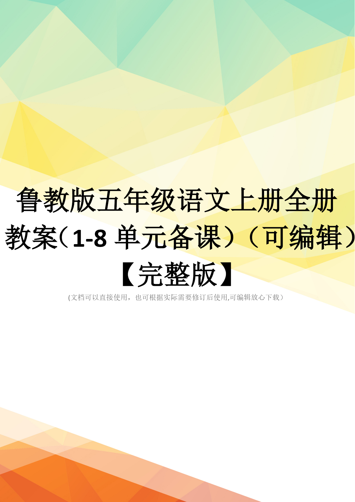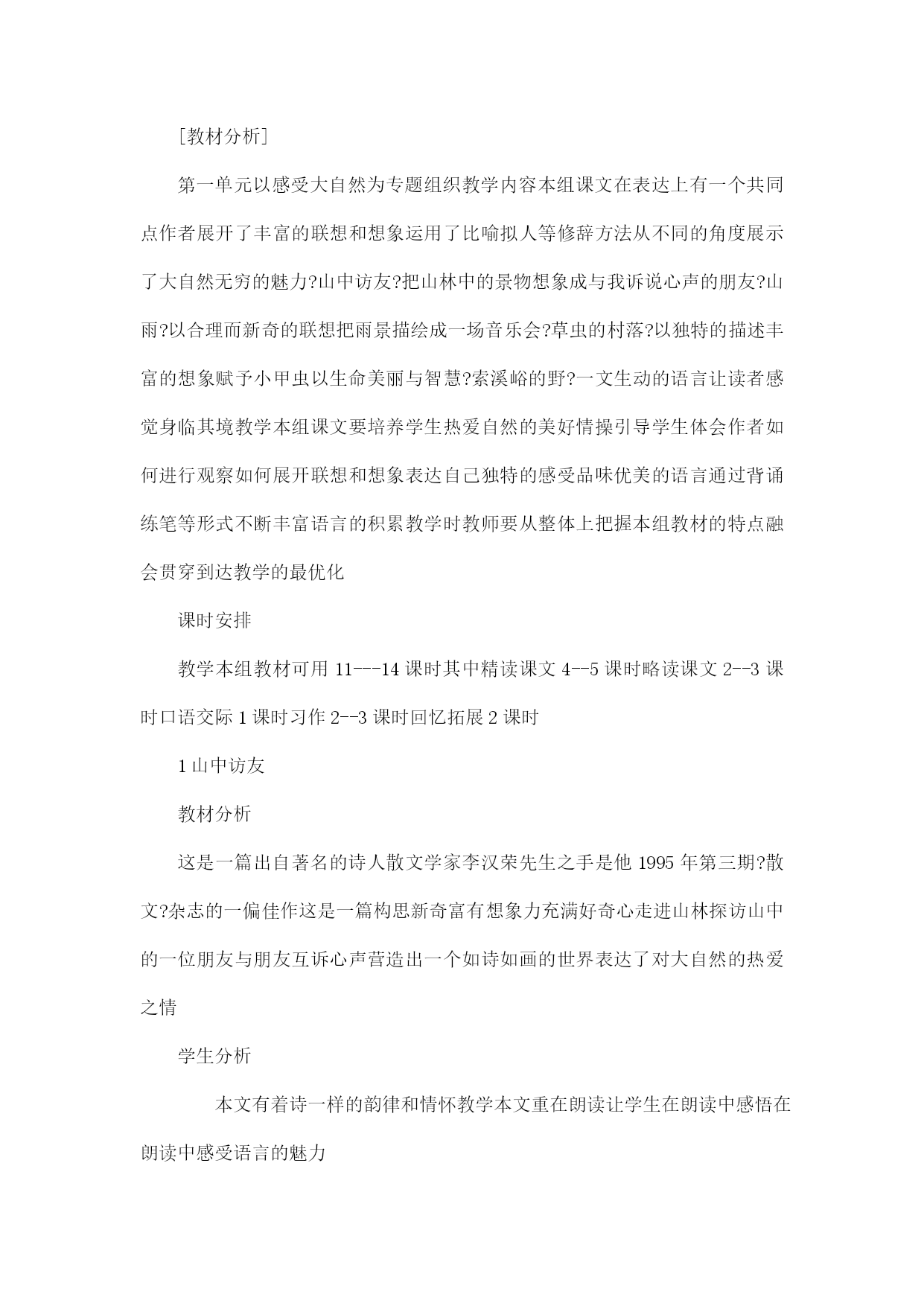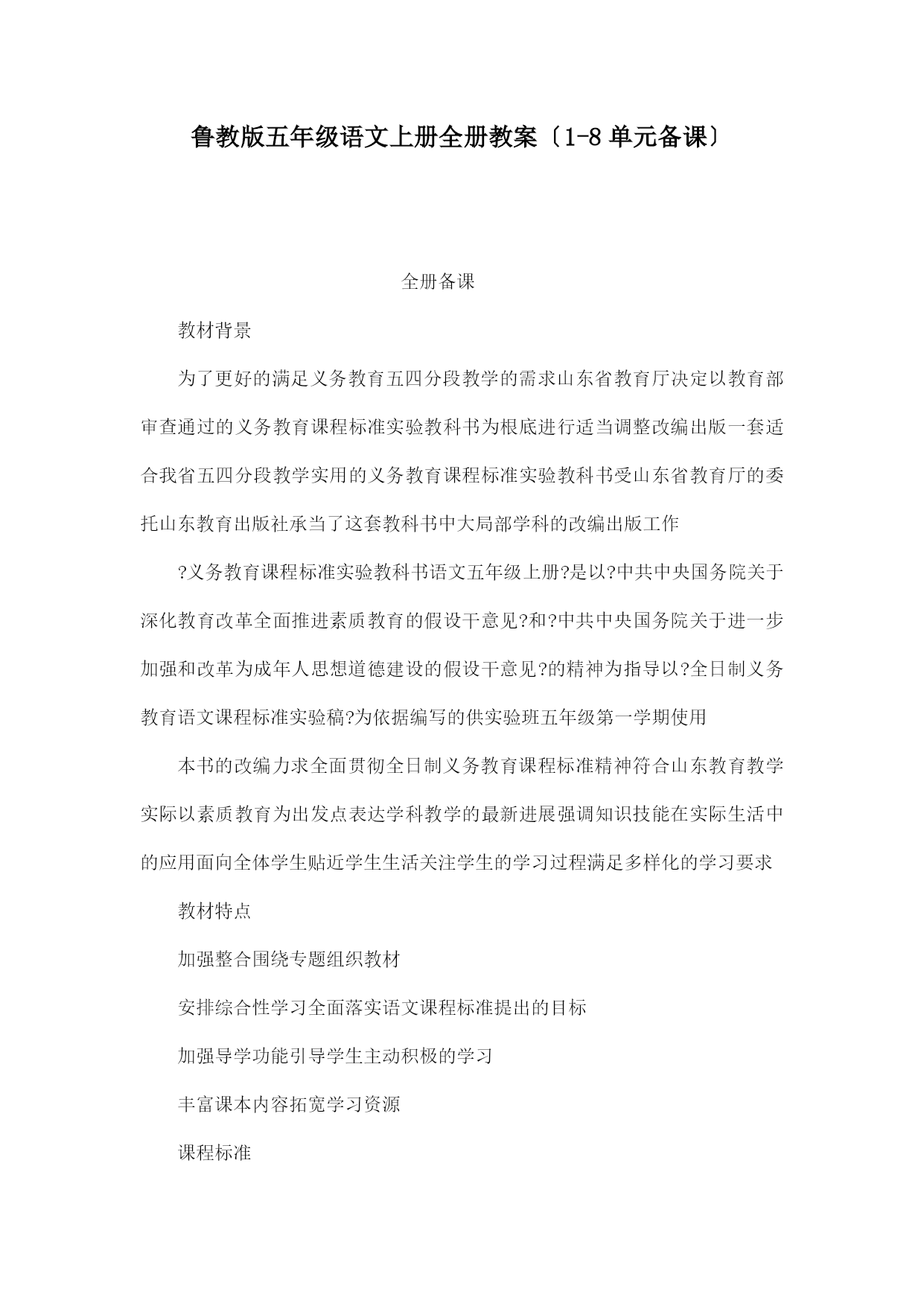 鲁教版五年级语文上册全册教案(1-8单元备课)(可编辑)【完整版】 (文档可以直接使用,也可根据实际需要修订后使用,可编辑放心下载) 鲁教版五年级语文上册全册教案〔1-8单元备课〕 全册备课 教材背景 为了更好的满足义务教育五四分段教学的需求山东省教育厅决定以教育部审查通过的义务教育课程标准实验教科书为根底进行适当调整改编出版一套适合我省五四分段教学实用的义务教育课程标准实验教科书受山东省教育厅的委托山东教育出版社承当了这套教科书中大局部学科的改编出版工作 ?义务教育课程标准实验教科书语文五年级上册?是以?中共中央国务院关于深化教育改革全面推进素质教育的假设干意见?和?中共中央国务院关于进一步加强和改革为成年人思想道德建设的假设干意见?的精神为指导以?全日制义务教育语文课程标准实验稿?为依据编写的供实验班五年级第一学期使用 本书的改编力求全面贯彻全日制义务教育课程标准精神符合山东教育教学实际以素质教育为出发点表达学科教学的最新进展强调知识技能在实际生活中的应用面向全体学生贴近学生生活关注学生的学习过程满足多样化的学习要求 教材特点 加强整合围绕专题组织教材 安排综合性学习全面落实语文课程标准提出的目标 加强导学功能引导学生主动积极的学习 丰富课本内容拓宽学习资源 课程标准 小学语文课程标准分阶段要求高年级 在教学中要紧贴教材完成小学语文课程标准规定对本年级的教学目标 学习目标 一识字与写字 1有较强的独立识字能力累计认识常用汉字201个其中180个左右会写 2硬笔书写楷体行款整齐有一定的速度 3能用毛笔书写楷书在书写中体会汉字的美感 二阅读教学 1继续加强阅读根本功的训练 2发现语言规律学习表达方法①通过课后思考练习题引导学生理解内容领会表达方法②在课文中发现语言表达的特点③在交流平台中总结某些规律性的东西 3把握每个单元丰富的人文内涵把情感态度价值观的目标落到实处 ①体验文本与个性化感悟的关系②把握内涵与语言文字训练的关系 要根据课文的不同特点设计和采用灵活多样的教学过程与方法策略 三口语交际教学 1要激发兴趣引起学生交流的欲望 2要创设特定的情境 3要表达上相互动 4要不断提高学生的口语水平 四习作教学 1进一步明确小学生作文的性质 2作文指导从内容入手作文讲评重在鼓励 3观察思维表达三种能力结合起来培养 4加强平时练笔的指导 五综合性学习 高年级的综合性学习要比拟充分的表达其综合性实践性开放性和自主性的特点注重提高学生筹划规划自己学习的能力用多种途径方式解决实际问题的能力以及语文的综合运用能力 教材内容及衔接 本册教材以专题组织单元共八组分别是第一组感受自然第二组祖国在我心中第三组语言的艺术第四组中国名典之旅第五组走进信息世界第六组走进毛泽东第七组异域风情第八组他们让我感动 本册教材安排了两次综合性学习第一次是在祖国在我心中这一组以课文学习为主同时安排了一些语文实践活动简称为小综合第二次是在第五组走进信息世界突破了以课文为主体的教材结构改为围绕主题任务驱动活动贯穿始终的编排形式简称为大综合 除去第五组全册共有课文28篇精度和略读各14篇这七组教材每组由导语课例口语交际·习作回忆·拓展四局部组成在每组课文后设词语盘点一些课文的后面还安排了资料袋和阅读链接全册还安排了8篇选读课文并附两个生字表生字表一是要求认识的201个字生字表二是要求写的180个字 本册是在四年级下册根底上编写的教材的结构及思路是共同的表达出整套教材的一致性 第一单元 [教材分析] 第一单元以感受大自然为专题组织教学内容本组课文在表达上有一个共同点作者展开了丰富的联想和想象运用了比喻拟人等修辞方法从不同的角度展示了大自然无穷的魅力?山中访友?把山林中的景物想象成与我诉说心声的朋友?山雨?以合理而新奇的联想把雨景描绘成一场音乐会?草虫的村落?以独特的描述丰富的想象赋予小甲虫以生命美丽与智慧?索溪峪的野?一文生动的语言让读者感觉身临其境教学本组课文要培养学生热爱自然的美好情操引导学生体会作者如何进行观察如何展开联想和想象表达自己独特的感受品味优美的语言通过背诵练笔等形式不断丰富语言的积累教学时教师要从整体上把握本组教材的特点融会贯穿到达教学的最优化 课时安排 教学本组教材可用11---14课时其中精读课文4--5课时略读课文2--3课时口语交际1课时习作2--3课时回忆拓展2课时 1山中访友 教材分析 这是一篇出自著名的诗人散文学家李汉荣先生之手是他1995年第三期?散文?杂志的一偏佳作这是一篇构思新奇富有想象力充满好奇心走进山林探访山中的一位朋友与朋友互诉心声营造出一个如诗如画的世界表达了对大自然的热爱之情 学生分析 本文有着诗一样的韵律和情怀教学本文重在朗读让学生在朗读中感悟在朗读中感受语言的魅力 教学目标 1.理解积累湛蓝清澈唱和玄奥德高望重津津乐道