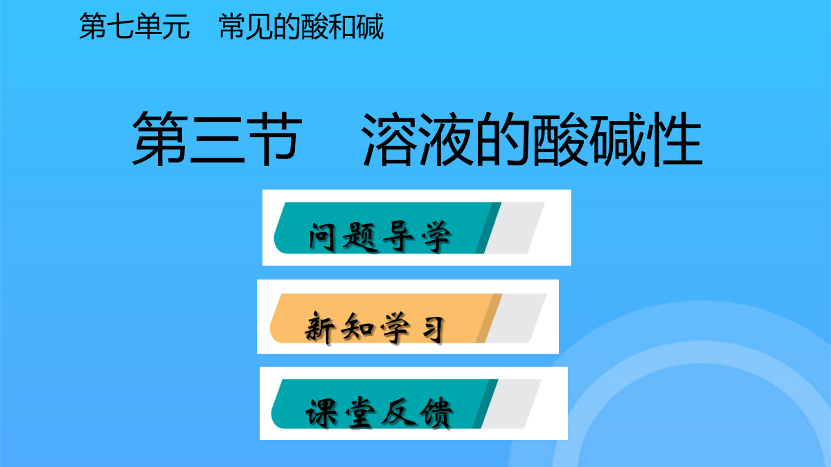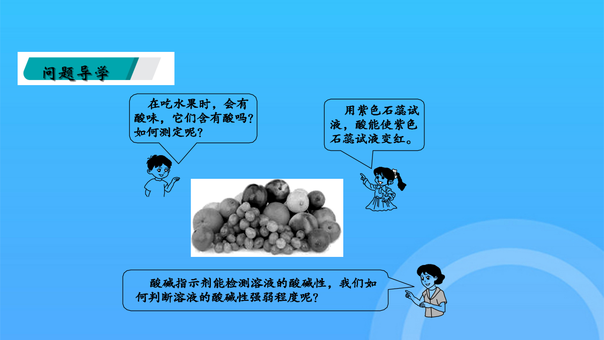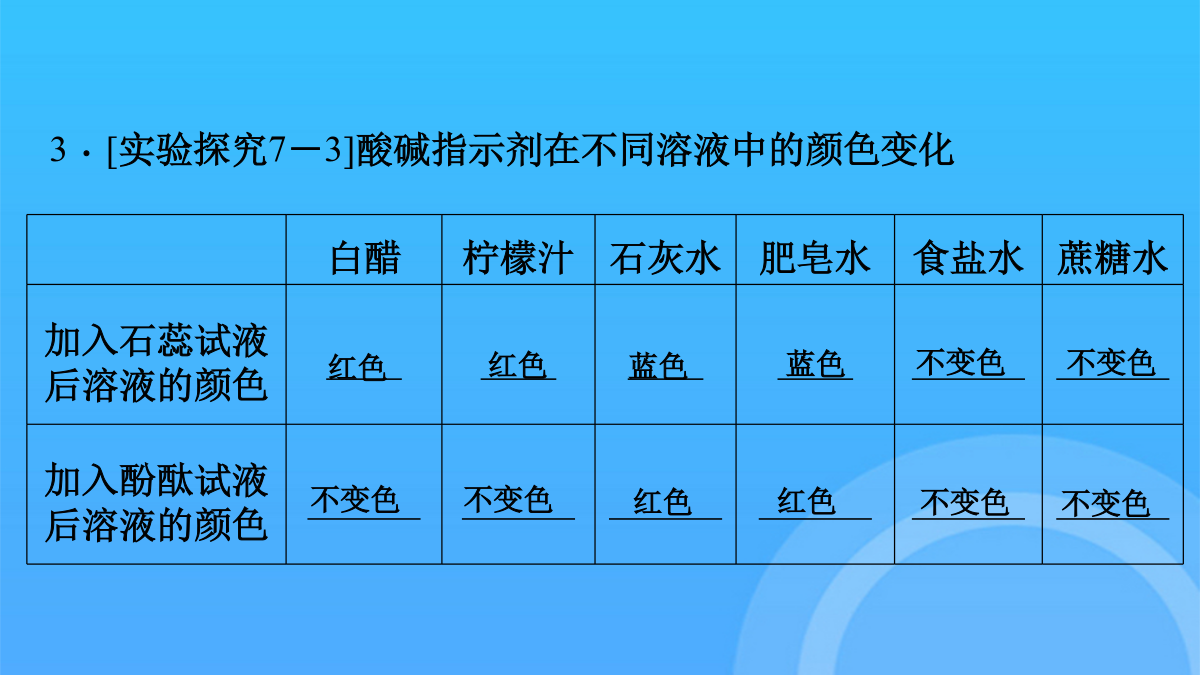 鲁教九级化学全册同步导学课件溶液的酸碱性PPT新知学习问题导学知识点一如何检验溶液的酸碱性3.[实验探究7-3]酸碱指示剂在不同溶液中的颜色变化实验结论:(1)紫色石蕊试液遇到酸性溶液变成________色,遇到碱性溶液变成________色,简记为:石蕊酸________碱中________。 (2)无色酚酞试液遇到酸性溶液________色,遇到碱性溶液变成________色,简记为:酚酞碱________酸________。 (3)紫色石蕊试液和无色酚酞试液遇到中性溶液都________色。4.间接观察 借助酸碱指示剂,通过观察试液________的变化,能帮助人们确定溶液的________,这种方法属于间接观察法。 5.石蕊试纸 蓝色石蕊试纸遇酸性溶液变成________色,红色石蕊试纸遇碱性溶液变成________色。[情景展示][问题探究][归纳提升]pH=7的溶液呈________性 酸溶液一定呈酸性,但是呈酸性的不一定是酸,碱溶液一定呈碱性,但是呈碱性的溶液不一定是碱。 物质的酸碱性对生命活动的意义 知识点1如何检验溶液的酸碱性 【方法点拨】pH<7的溶液呈酸性,pH越小,酸性越强; 酸溶液是指溶质是酸的溶液,其一定显酸性,能使紫色石蕊变红,不能使无色酚酞变色; 探究点一如何检验溶液的酸碱性 第七单元常见的酸和碱 知识点二怎样判断溶液酸碱性的强弱 ②不要预先将试纸润湿,否则测得的酸性物质的pH偏大,碱性物质的pH偏小。 在家庭中,我们可以取植物的花瓣或果实(如紫罗兰花、牵牛花、月季花、紫卷心菜和紫萝卜等)来制作酸碱指示剂。 2.(1)溶液的酸碱性用________来检验,溶液的酸碱性强弱用________来测定。 在一定量的水溶液中,________越多酸性越强,________越多碱性越强 同样碱溶液一定显碱性,能使紫色石蕊变蓝,使无色酚酞变红; pH=7的溶液呈中性;[归纳总结]实验室常用的酸碱指示剂是紫色石蕊试液与无色酚酞试液,石蕊遇酸变红遇碱变蓝,而酚酞遇酸不变色遇碱变红。酸溶液一定呈酸性,但是呈酸性的不一定是酸,碱溶液一定呈碱性,但是呈碱性的溶液不一定是碱。核心一如何检验溶液的酸碱性试回答下列问题。 (1)为检验生活中的食盐水、肥皂水、汽水、石灰水四种物质的酸碱性,应选择________花汁,不选用其他花汁的原因是________________________________________________________。 (2)取所选花汁少许分别滴入下列四种物质中,请将所显颜色填入下表中。【方法点拨】在酸性、中性、碱性溶液中能够呈现不同颜色的物质,可用来作酸碱指示剂。注意是酸碱指示剂遇酸或碱变色,而酸或碱不变色。知识点二怎样判断溶液酸碱性的强弱溶液的酸碱性强弱与pH的关系 [注意]用pH试纸测定溶液的酸碱度时,不能将试纸直接伸入待测液中;不能先将试纸用蒸馏水润湿;测定的结果只能是整数,不能精确到小数。[情景展示][问题探究][归纳总结]液涂于pH试纸上后,马上与标准比色卡比较。实验使用的pH试纸一般是广范pH试纸,测出的pH是1~14的整数,结果较粗略,要准确测量,可用精密pH试纸或pH计。核心二怎样判断溶液酸碱性的强弱 [解析]血浆的pH为~,大于7,显碱性;唾液的pH为~,可能显酸性、中性或碱性;胃液的pH为~,显酸性;尿液的pH为~,可能显酸性、中性或碱性。根据当溶液的pH小于7时,显酸性,且pH越小,酸性越强,胃液的pH最小,酸性最强。 【方法点拨】pH<7的溶液呈酸性,pH越小,酸性越强;pH=7的溶液呈中性;pH>7的溶液呈碱性,pH越大,碱性越强。 使用pH试纸的注意事项: ①不能直接把pH试纸浸入待测液中,以免污染待测液。 ②不要预先将试纸润湿,否则测得的酸性物质的pH偏大,碱性物质的pH偏小。③测得的pH为近似值,一般取整数,不能有小数。 ④取出试纸后,应将盛放pH试纸的容器盖严,以免pH试纸被实验室的一些气体污染。课堂反馈知识点2怎样判断溶液酸碱性的强弱3.在生活、生产和科学研究中,常用pH试纸测定溶液的pH。以下测定操作正确的是() A.将被测液滴到放在玻璃片上的pH试纸上,显色后,与标准比色卡比较 B.将pH试纸直接投入被测液中,显色后,取出与标准比色卡比较 C.先用少量水润湿试纸,然后滴上被测液,显色后,与标准比色卡比较 D.先用蒸馏水清洗滴管,随后吸取被测液滴到pH试纸上,显色后,与标准比色卡比较江西很多丘陵地区土壤为红色,呈弱酸性,你认为江西适宜种植() 3.[实验探究7-3]酸碱指示剂在不同溶液中的颜色变化 汽水呈酸性,大红花花汁显橙色; 酸溶液是指溶质是酸的溶液,其一定显酸性,能使紫色石蕊变红,不能使无色酚酞变色; pH>7的溶液呈碱性,pH越大,溶液的碱性越_