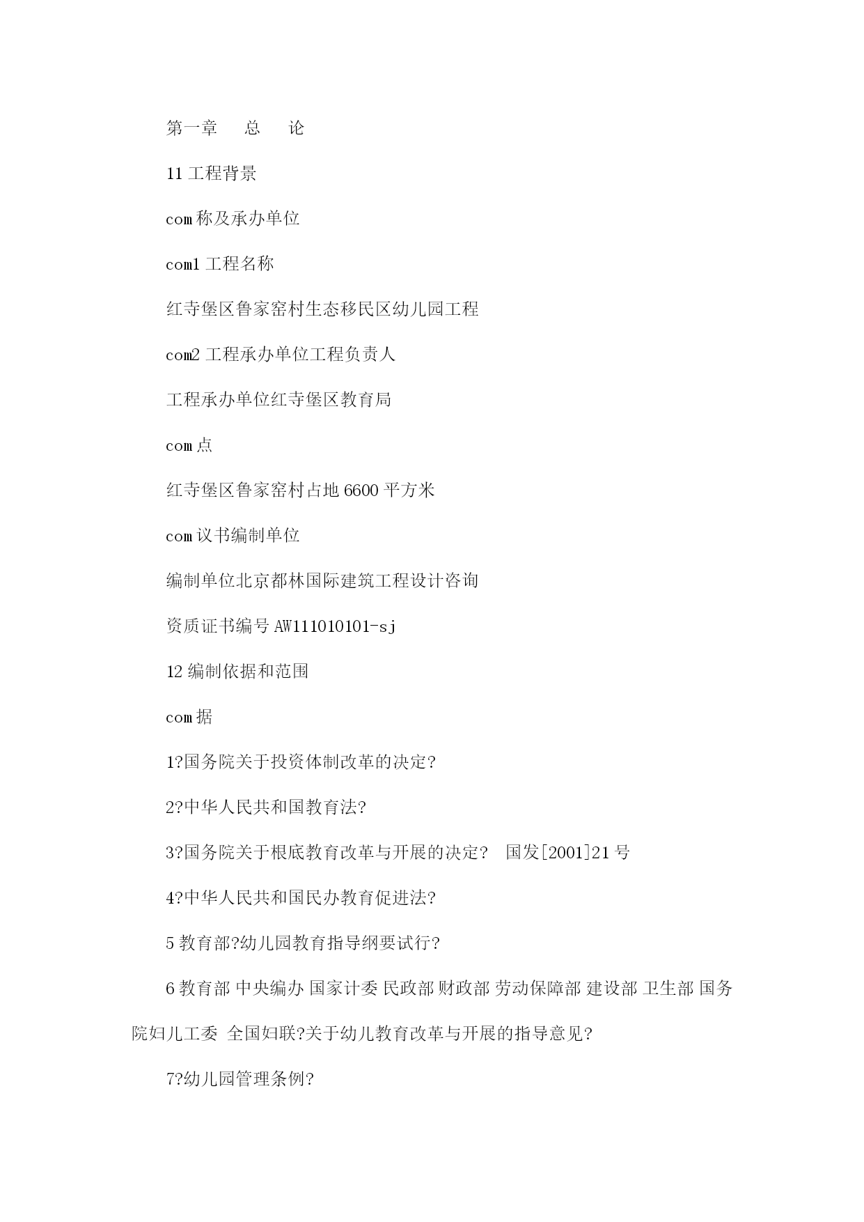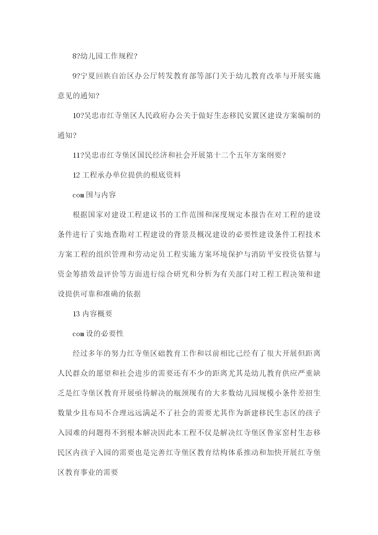 鲁家窑幼儿园项目可行性研究报告【完整版】 (文档可以直接使用,也可根据实际需要修订后使用,可编辑放心下载) 鲁家窑幼儿园工程可行性研究报告 红寺堡区鲁家窑村生态移民区幼儿园工程 可行性研究报告 北京都林国际建筑工程设计咨询 红寺堡区鲁家窑村生态移民区幼儿园工程 可行性研究报告 北京都林国际建筑工程设计咨询 二O一一年五月 目录 第一章总论1 第二章工程背景及建设必要性5 第三章工程区概况及建设条件9 第四章工程建设方案14 第五章环境保护消防与平安21 第六章组织机构与劳动定员25 第七章工程管理与实施进度26 第八章工程招投标28 第九章投资估算与资金筹措30 第十章结论与建议32 附表附图及附件 第一章总论 11工程背景 com称及承办单位 com1工程名称 红寺堡区鲁家窑村生态移民区幼儿园工程 com2工程承办单位工程负责人 工程承办单位红寺堡区教育局 com点 红寺堡区鲁家窑村占地6600平方米 com议书编制单位 编制单位北京都林国际建筑工程设计咨询 资质证书编号AW111010101-sj 12编制依据和范围 com据 1?国务院关于投资体制改革的决定? 2?中华人民共和国教育法? 3?国务院关于根底教育改革与开展的决定?国发[2001]21号 4?中华人民共和国民办教育促进法? 5教育部?幼儿园教育指导纲要试行? 6教育部中央编办国家计委民政部财政部劳动保障部建设部卫生部国务院妇儿工委全国妇联?关于幼儿教育改革与开展的指导意见? 7?幼儿园管理条例? 8?幼儿园工作规程? 9?宁夏回族自治区办公厅转发教育部等部门关于幼儿教育改革与开展实施意见的通知? 10?吴忠市红寺堡区人民政府办公关于做好生态移民安置区建设方案编制的通知? 11?吴忠市红寺堡区国民经济和社会开展第十二个五年方案纲要? 12工程承办单位提供的根底资料 com围与内容 根据国家对建设工程建议书的工作范围和深度规定本报告在对工程的建设条件进行了实地查勘对工程建设的背景及概况建设的必要性建设条件工程技术方案工程的组织管理和劳动定员工程实施方案环境保护与消防平安投资估算与资金筹措效益评价等方面进行综合研究和分析为有关部门对工程工程决策和建设提供可靠和准确的依据 13内容概要 com设的必要性 经过多年的努力红寺堡区础教育工作和以前相比已经有了很大开展但距离人民群众的愿望和社会进步的需要还有不少的距离尤其是幼儿教育供应严重缺乏是红寺堡区教育开展亟待解决的瓶颈现有的大多数幼儿园规模小条件差招生数量少且布局不合理远远满足不了社会的需要尤其作为新建移民生态区的孩子入园难的问题得不到根本解决因此本工程不仅是解决红寺堡区鲁家窑村生态移民区内孩子入园的需要也是完善红寺堡区教育结构体系推动和加快开展红寺堡区教育事业的需要 com设内容与规模 本工程占地6600平方米建设内容主要有幼儿教学综合楼食堂多功能活动室游戏活动室医务室洗衣房配电房等组本钱工程占地面积6600平方米建筑面积2158平方米 com述 本工程位于红寺堡区鲁家窑村中心位置工程规划区交通便利地势平坦环境优美适宜工程建设 com织与实施 本工程承办单位为红寺堡区教育局工程负责人方全建教育局拟成立工程建设领导小组下设办公室以确保工程高质量高标准按进度方案安排的工期完成 com及资金来源 本工程总投资5021万元资金筹措为国家投资 14主要经济技术指标 主要技术经济指标表 序号 指标 单位 数量 备注 1 用地 平方米 6600 2 占地面积 平方米 6600 3 建筑面积 平方米 2158 4 动力 ① 电 度年 ② 水 立方米年 4 劳动定员 人 5 全年生产天数 天 300 6 总投资 万元 5021 ① 土地投入 万元 ② 建设投资 万元 ② 流动资金 万元 7 年教育总本钱 万元 8 总收入 万元 9 年利润总额 万元 正常年份 10 销售税金及附加 万元 0 正常年份 13 投资回收期 年 含建设期 15结论建议 1红寺堡区鲁家窑村生态移民区幼儿园工程位于鲁家窑村中心紧邻住宅区域生源充足交通方便地理位置优势明显该地块地势平坦环境幽静周围无工业噪音无污染适合幼儿园建设 2该工程符合国家关于大力促进民办教育工作的要求符合国家产业政策和投资方向 3本工程总投资为5021万元建设周期一年教学生活设施符合教育部规定的生均指标要求 建议有关单位给予大力支持加快工程的前期工作进程积极落实建设资金落实设计和施工单位尽早开工保证质量按时完成工程建设及时投入使用尽快发挥工程应有的社会和经济效益 第二章工程背景及建设必要性 21工程提出的背景 二十一世纪初我国进入了构建社会主义和谐社会的重要历史时期加快幼儿教育事业的开展是构建社会