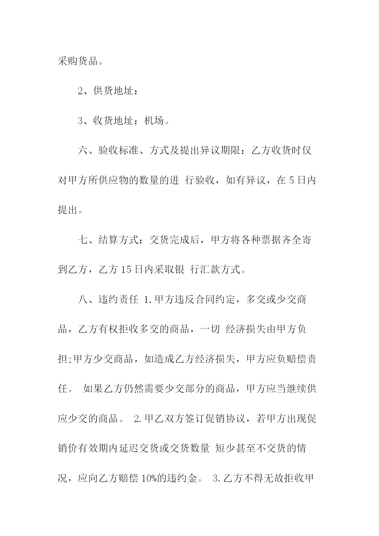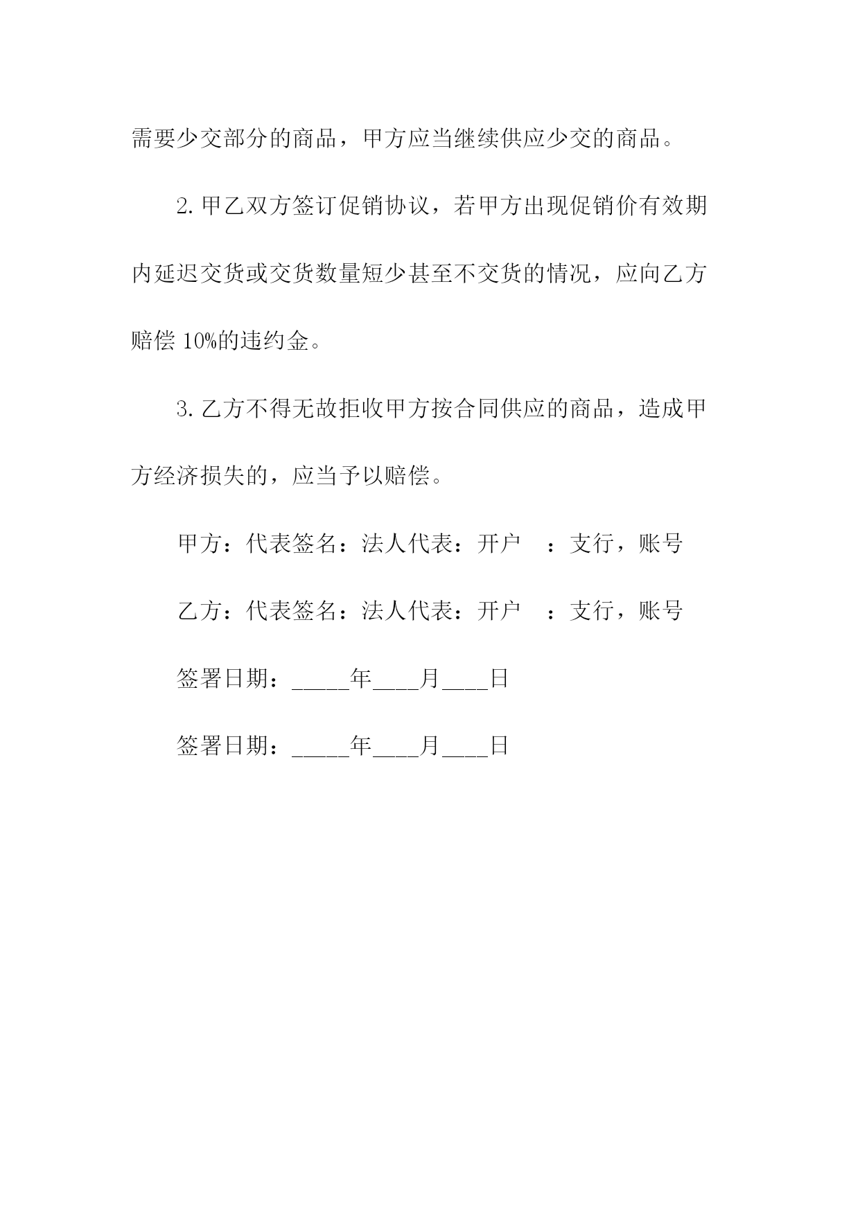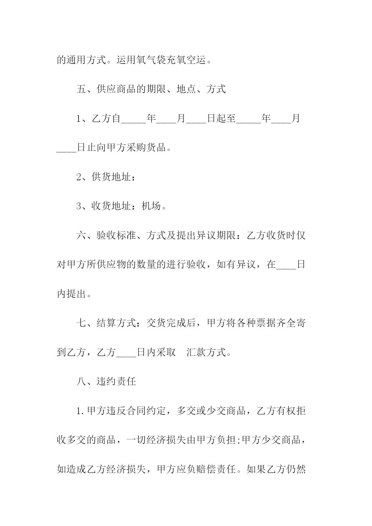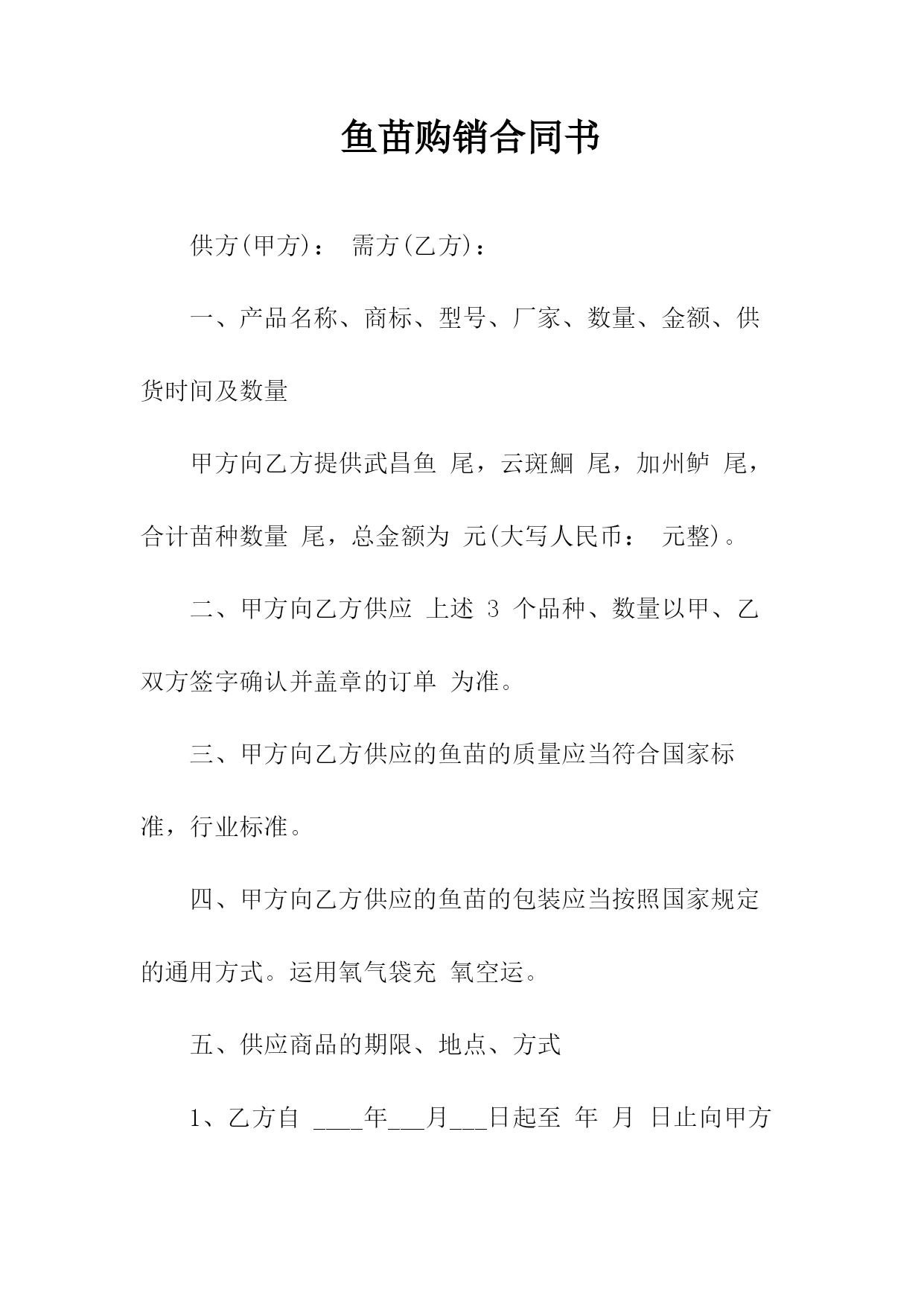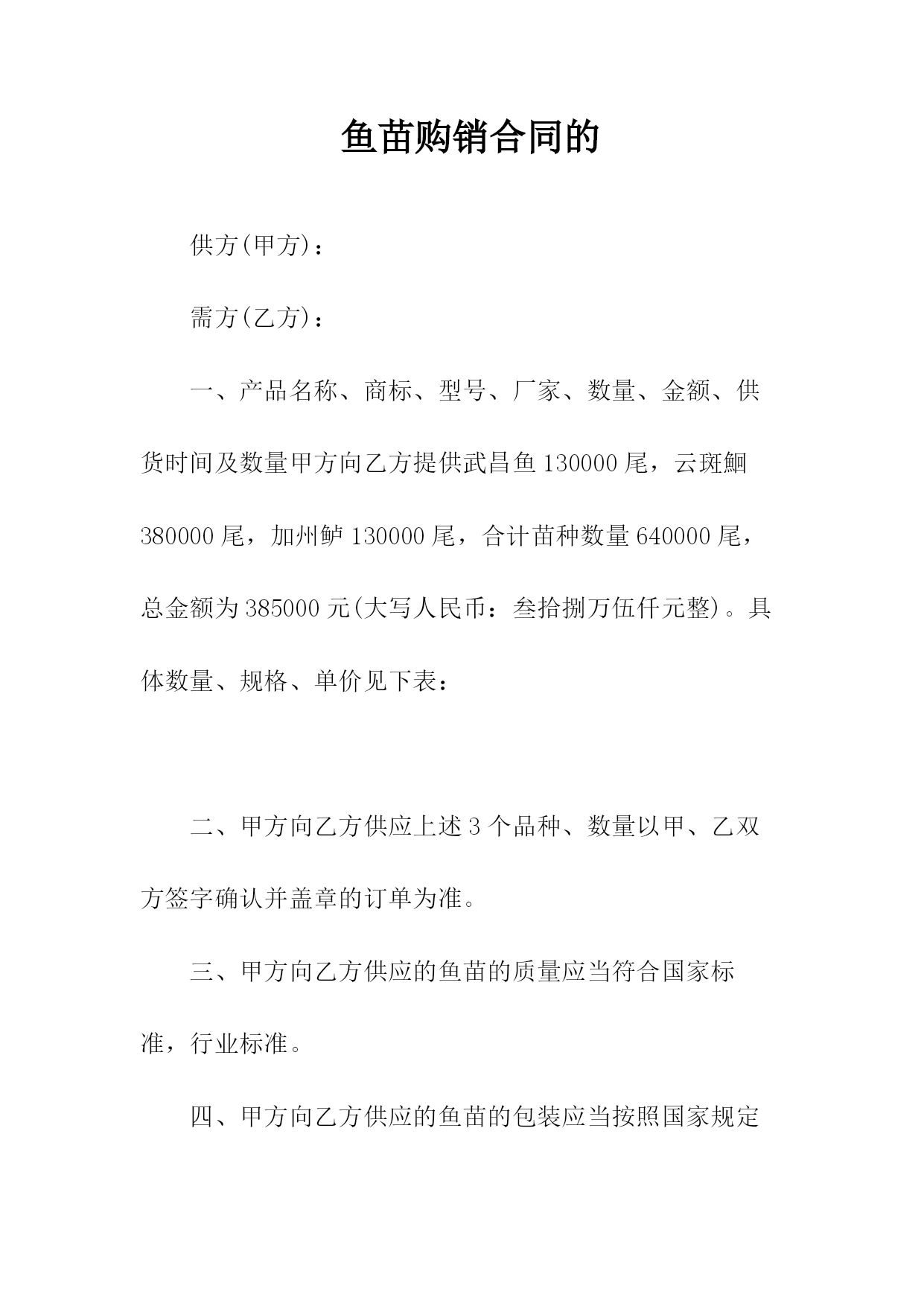 鱼苗购销合同的 供方(甲方):需方(乙方):一、产品名称、商标、型号、厂家、数量、金额、供货时间及数量甲方向乙方提供武昌鱼130000尾,云斑鮰380000尾,加州鲈130000尾,合计苗种数量640000尾,总金额为385000元(大写人民币:叁拾捌万伍仟元整)。具体数量、规格、单价见下表:二、甲方向乙方供应上述3个品种、数量以甲、乙双方签字确认并盖章的订单为准。三、甲方向乙方供应的鱼苗的质量应当符合国家标准,行业标准。四、甲方向乙方供应的鱼苗的包装应当按照国家规定的通用方式。运用氧气袋充氧空运。五、供应商品的期限、地点、方式1、乙方自_____年____月____日起至_____年____月____日止向甲方采购货品。2、供货地址:3、收货地址:机场。六、验收标准、方式及提出异议期限:乙方收货时仅对甲方所供应物的数量的进行验收,如有异议,在____日内提出。七、结算方式:交货完成后,甲方将各种票据齐全寄到乙方,乙方____日内采取汇款方式。八、违约责任1.甲方违反合同约定,多交或少交商品,乙方有权拒收多交的商品,一切经济损失由甲方负担;甲方少交商品,如造成乙方经济损失,甲方应负赔偿责任。如果乙方仍然需要少交部分的商品,甲方应当继续供应少交的商品。2.甲乙双方签订促销协议,若甲方出现促销价有效期内延迟交货或交货数量短少甚至不交货的情况,应向乙方赔偿10%的违约金。3.乙方不得无故拒收甲方按合同供应的商品,造成甲方经济损失的,应当予以赔偿。甲方:代表签名:法人代表:开户:支行,账号乙方:代表签名:法人代表:开户:支行,账号签署日期:_____年____月____日签署日期:_____年____月____日鱼苗购销合同书 供方(甲方):需方(乙方):一、产品名称、商标、型号、厂家、数量、金额、供货时间及数量甲方向乙方提供武昌鱼尾,云斑鮰尾,加州鲈尾,合计苗种数量尾,总金额为元(大写人民币:元整)。二、甲方向乙方供应上述3个品种、数量以甲、乙双方签字确认并盖章的订单为准。三、甲方向乙方供应的鱼苗的质量应当符合国家标准,行业标准。四、甲方向乙方供应的鱼苗的包装应当按照国家规定的通用方式。运用氧气袋充氧空运。五、供应商品的期限、地点、方式1、乙方自____年___月___日起至年月日止向甲方采购货品。2、供货地址:3、收货地址:机场。六、验收标准、方式及提出异议期限:乙方收货时仅对甲方所供应物的数量的进行验收,如有异议,在5日内提出。七、结算方式:交货完成后,甲方将各种票据齐全寄到乙方,乙方15日内采取银行汇款方式。八、违约责任1.甲方违反合同约定,多交或少交商品,乙方有权拒收多交的商品,一切经济损失由甲方负担;甲方少交商品,如造成乙方经济损失,甲方应负赔偿责任。如果乙方仍然需要少交部分的商品,甲方应当继续供应少交的商品。2.甲乙双方签订促销协议,若甲方出现促销价有效期内延迟交货或交货数量短少甚至不交货的情况,应向乙方赔偿10%的违约金。3.乙方不得无故拒收甲方按合同供应的商品,造成甲方经济损失的,应当予以赔偿。甲方:乙方:代表签名:代表签名:法人代表:法人代表:开户:开户:支行,账号签署日期:年月日签署日期:年月日鱼苗购销合同新编 供方(甲方):地址:需方(乙方):地址:一、交易内容品种:产地:数量:单价:总价:二、甲方向乙方供应上述_____个品种,数量以甲、乙双方签字确认并盖章的订单为准。三、甲方向乙方供应的鱼苗的质量应当符合国家标准,行业标准。四、甲方向乙方供应的鱼苗的包装应当按照国家规定的通用方式,运用氧气袋充氧空运。五、供应商品的期限、地点、方式1、乙方自_____年_____月_____日起至_____年_____月_____日止向甲方采购货品。2、供货地址:3、收货地址:六、验收标准、方式及提出异议期限乙方收货时须对甲方所供应物的数量的进行验收,如有异议,在_____日内提出。七、结算方式交货完成后,甲方将各种票据齐全寄到乙方,乙方_____日内采取汇款方式。八、违约责任1、甲方违反合同约定,多交或少交商品,乙方有权拒收多交的商品,一切经济损失由甲方负担;甲方少交商品,如造成乙方经济损失,甲方应负赔偿责任。如果乙方仍然需要少交部分的商品,甲方应当继续供应少交的商品。2、甲乙双方签订促销协议,若甲方出现促销价,合同有效期内出现延迟交货或交货数量短少甚至不交货的情况,应向乙方赔偿10%的违约金。3、乙方不得无故拒收甲方按合同供应的商品,造成甲方经济损失的,应当予以赔偿。甲方:代表签名:联系方式:开户:账号:签署日期:_____年_____月_____日乙方:开户:账号:签署日期:_____年_____月_____日鱼苗购销合同的 供方(甲方):需方(乙方):一、产品名称、商标、型号、厂家、数量、金额、供货时