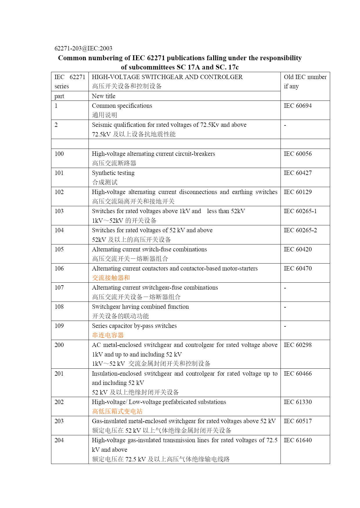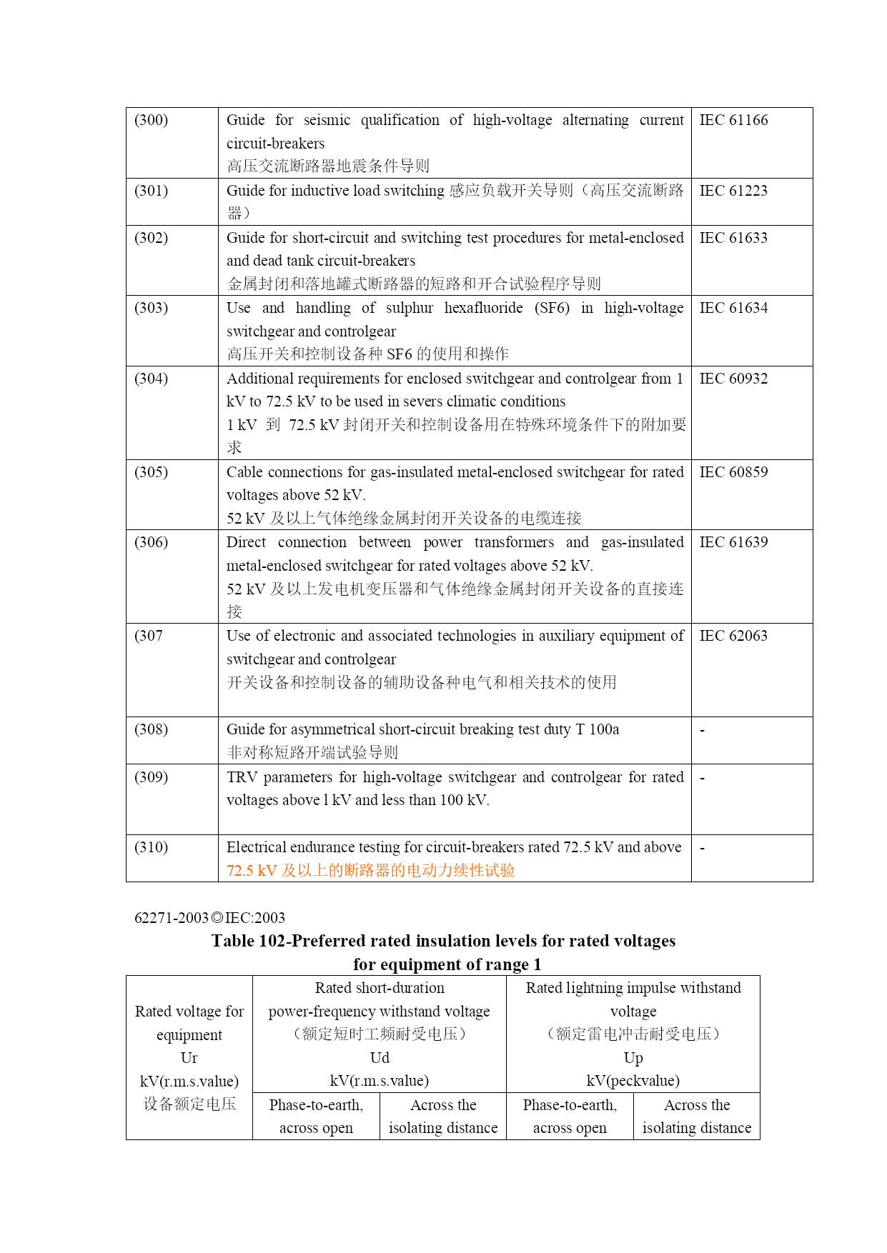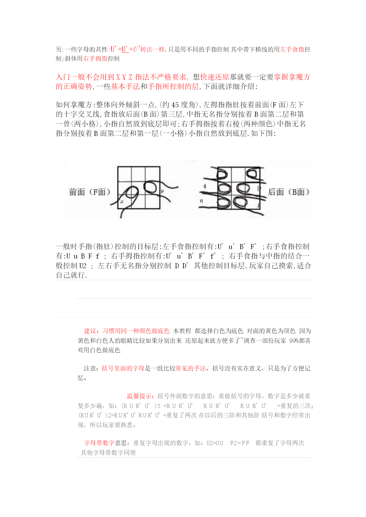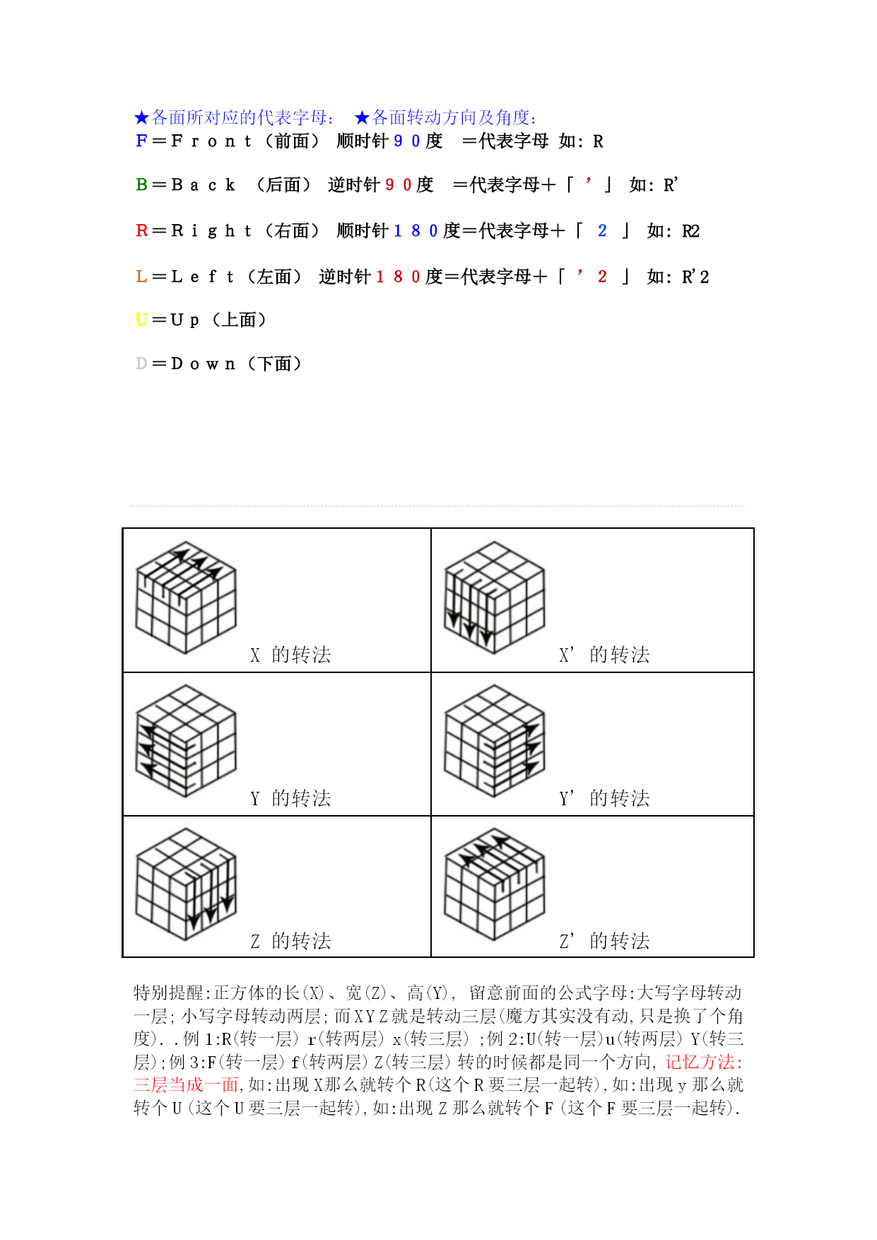 魔方各面所对应的代表字母优质资料 (可以直接使用,可编辑优质资料,欢迎下载) ★各面所对应的代表字母:★各面转动方向及角度:F=Front(前面)顺时针90度=代表字母如:R B=Back(后面)逆时针90度=代表字母+「’」如:R'R=Right(右面)顺时针180度=代表字母+「2」如:R2L=Left(左面)逆时针180度=代表字母+「’2」如:R'2 U=Up(上面) D=Down(下面) X的转法X'的转法Y的转法Y'的转法Z的转法Z'的转法特别提醒:正方体的长(X)、宽(Z)、高(Y),留意前面的公式字母:大写字母转动一层;小写字母转动两层;而XYZ就是转动三层(魔方其实没有动,只是换了个角度)..例1:R(转一层)r(转两层)x(转三层);例2:U(转一层)u(转两层)Y(转三层);例3:F(转一层)f(转两层)Z(转三层)转的时候都是同一个方向,记忆方法:三层当成一面,如:出现X那么就转个R(这个R要三层一起转),如:出现y那么就转个U(这个U要三层一起转),如:出现Z那么就转个F(这个F要三层一起转). 另:一些字母的共性:U'=U'=U'转法一样,只是用不同的手指控制其中带下横线的用左手食指控制;斜体用右手拇指控制 入门一般不会用到XYZ指法不严格要求,想快速还原那就要一定要掌握拿魔方的正确姿势,一些基本手法和手指所控制的层.下面就详细介绍: 如何拿魔方:整体向外倾斜一点,(约45度角),左拇指指肚按着前面(F面)左下的十字交叉线,食指放后面(B面)第三层,中指无名指分别按着B面第二层和第一曾(两小格),小指自然放到底层即可;右手拇指按着右棱(两种颜色)中指无名指分别按着B面第二层和第一层(一小格)小指自然放到底层.如下图: 一般时手指(指肚)控制的目标层:左手食指控制有:U'u'B'F';右手食指控制有:UuBFf;右手拇指控制有:U'u'B'F'f';右手食指与中指的结合一般控制U2;左右手无名指分别控制DD'其他控制目标层,玩家自己摸索,适合自己就行. 建议:习惯用同一种颜色做底色本教程都选择白色为底色对面的黄色为顶色因为黄色和白色人的眼睛比较如果分别出来还原起来就方便多了~调查一部份玩家99%都喜欢用白色做底色 注意:括号里面的字母是一组比较常见的手法,括号没有实在意义,只是为了方便记忆。 温馨提示:括号外面数字的意思:重做括号的字母,数字是多少就重复多少遍,如:(RUR'U')3=RUR'U'RUR'U'RUR'U'=重复的三次;(RUR'U')2=RUR'U'RUR'U'=重复了两次在以后的三阶和其他阶括号和数字经常出现,所以玩家要熟悉。 字母带数字意思:重复字母出现的数字,如:U2=UUF2=FF都重复了字母两次其他字母带数字同理 62271-203@IEC:2003 CommonnumberingofIEC62271publicationsfallingundertheresponsibilityofsubcommitteesSC17AandSC.17c IEC62271seriesHIGH-VOLTAGESWITCHGEARANDCONTROLGER 高压开关设备和控制设备OldIECnumberifanypartNewtitle1Commonspecifications 通用说明IEC606942Seismicqualificationforratedvoltagesof72.5Kvandabove 72.5kV及以上设备抗地震性能-100High-voltagealternatingcurrentcircuit-breakers 高压交流断路器IEC60056101Synthetictesting 合成测试IEC60427102High-voltagealternatingcurrentdisconnectionsandearthingswitches高压交流隔离开关和接地开关IEC60129103Switchesforratedvoltagesabove1kVandlessthan52kV 1kV~52kV的开关设备IEC60265-1104Switchesforratedvoltagesof52kVandabove 52kV及以上的高压开关设备IEC60265-2105Alternatingcurrentswitch-fusecombinations 高压交流开关-熔断器组合IEC60420106Alternatingcurrentcontactorsandcontactor-basedmotor-starters 交流接触器和IEC60470107Alternatingcurrentswitchgear-fusecombinations 高压交流开关设备-熔断器组合-
