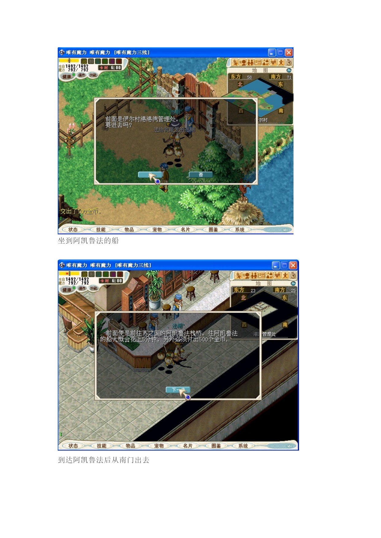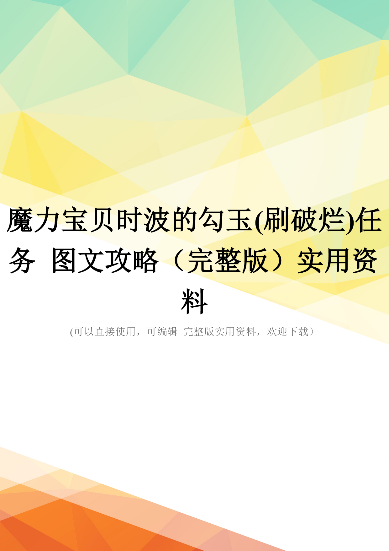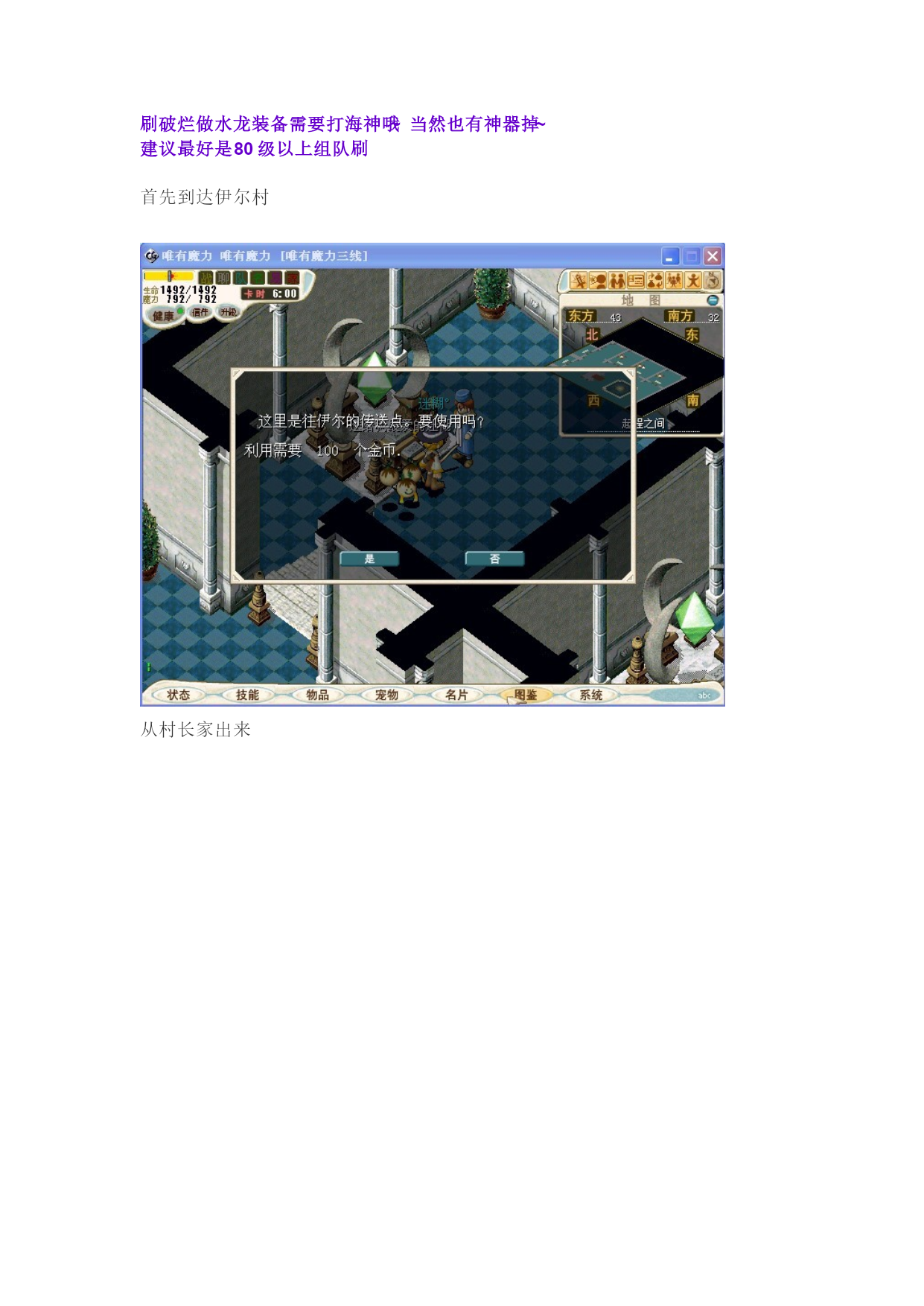 魔力宝贝时波的勾玉(刷破烂)任务图文攻略(完整版)实用资料 (可以直接使用,可编辑完整版实用资料,欢迎下载) 刷破烂做水龙装备需要打海神哦~当然也有神器掉~建议最好是80级以上组队刷首先到达伊尔村从村长家出来坐到阿凯鲁法的船到达阿凯鲁法后从南门出去按下面地图走南恰拉山第一通道地图01南恰拉山第一通道地图02南恰拉山第一通道地图03出了南恰拉山第一通道后,往上走点进入南恰拉山第二通道南恰拉山第二通道地图,走至【黄点】处黄点上的该老头为时波之祠入口NPC,与他对话进入10层的随机迷宫进入时波之祠后,遇敌杀鸟人(名字叫“纸垂”),可以得到勾玉的碎片在1楼/2遇敌,遇到的都是1-9级的敌人,轻松虐待。打鸟人掉勾玉勾玉的碎片,可交易,可叠加,一组10个打满10个勾玉的碎片后,到底层找海神打满10个勾玉,在第10层出迷宫后来到此处就是打这个大怪物掉破烂与之对话※若是生产系职业,持有十个勾玉与海神说话,可以学习水龙装备制作技能※若是战斗系职业,持有十个勾玉与海神说话,若选择【是】可以获得“勾玉的戒指”(此时传出“时波之祠”);选择【否】会进入战斗,战斗胜利后随机获得破烂装备或神器(千万别选“是”)※进入战斗的话,只没收队长的10个勾玉,其他人勾玉保留