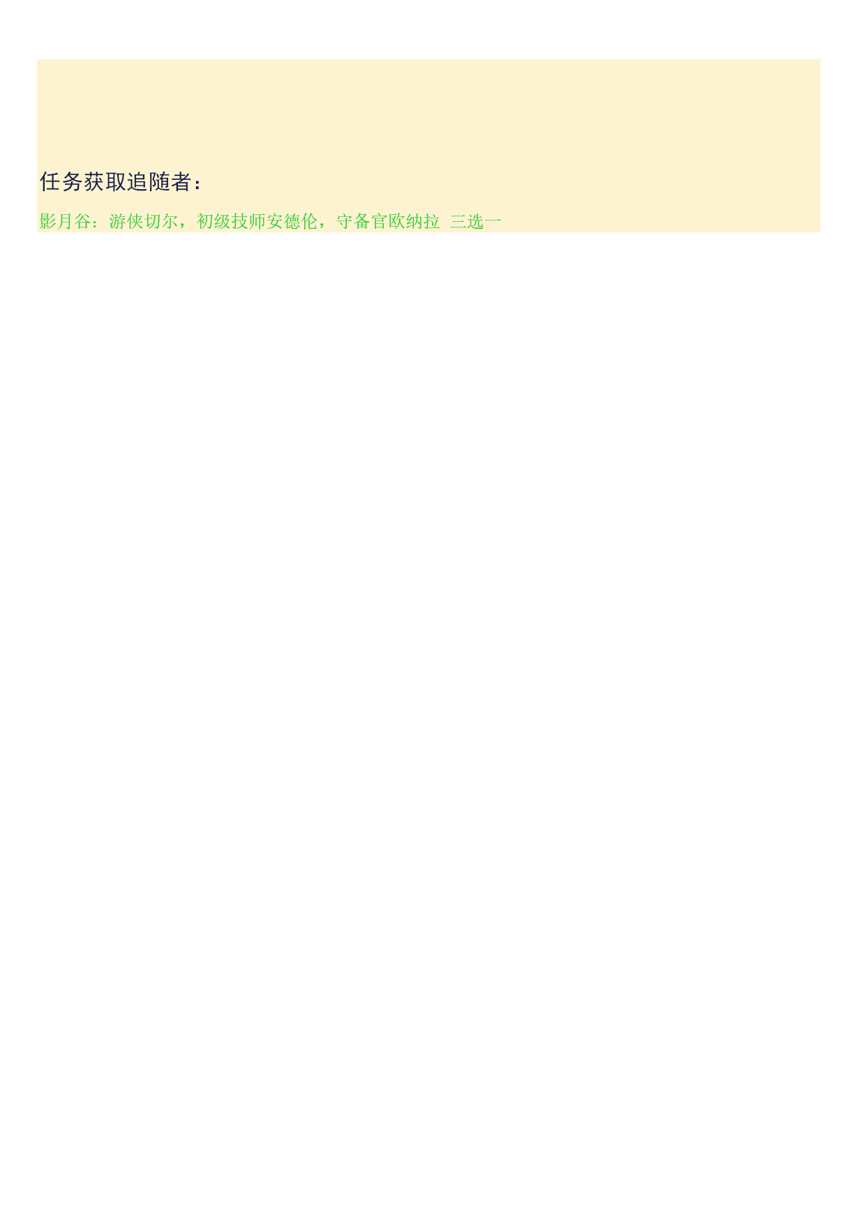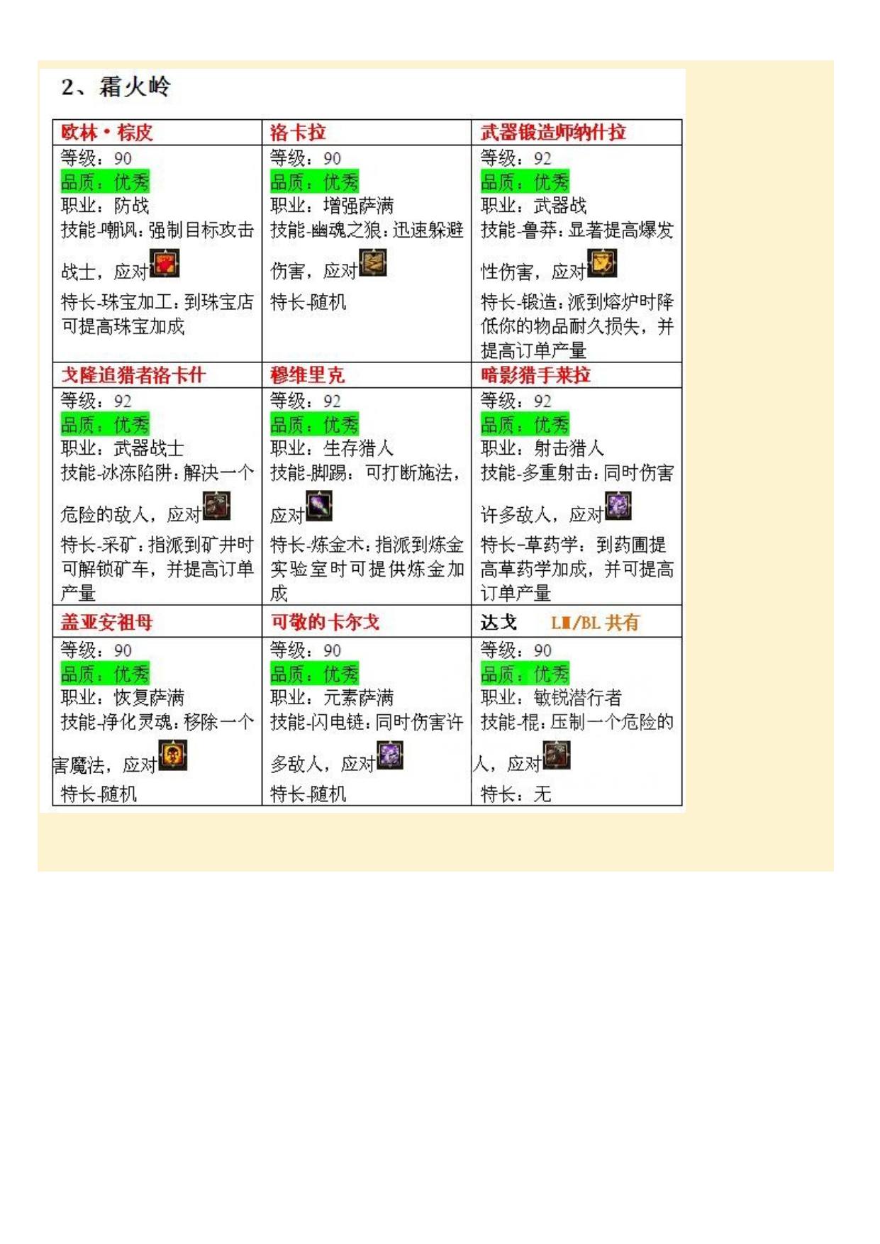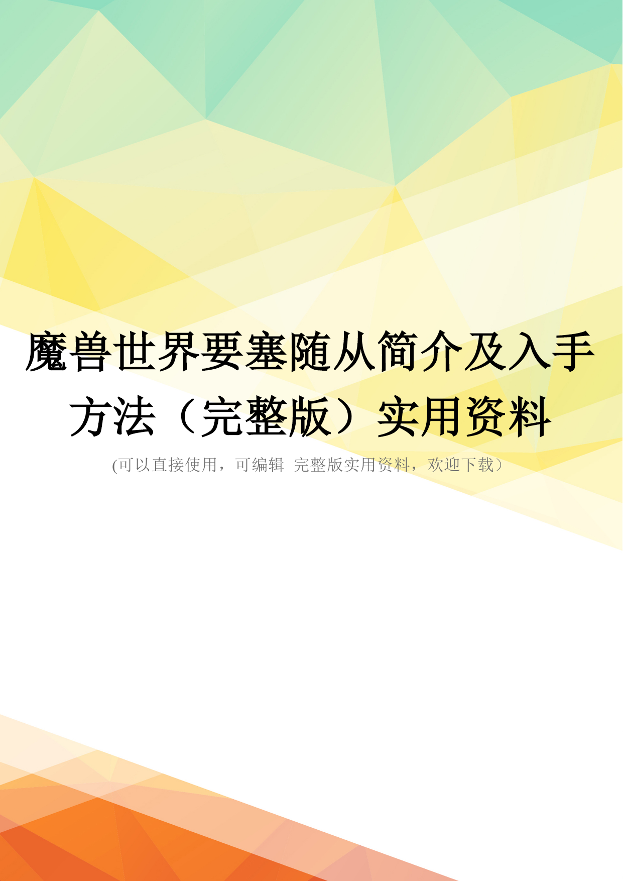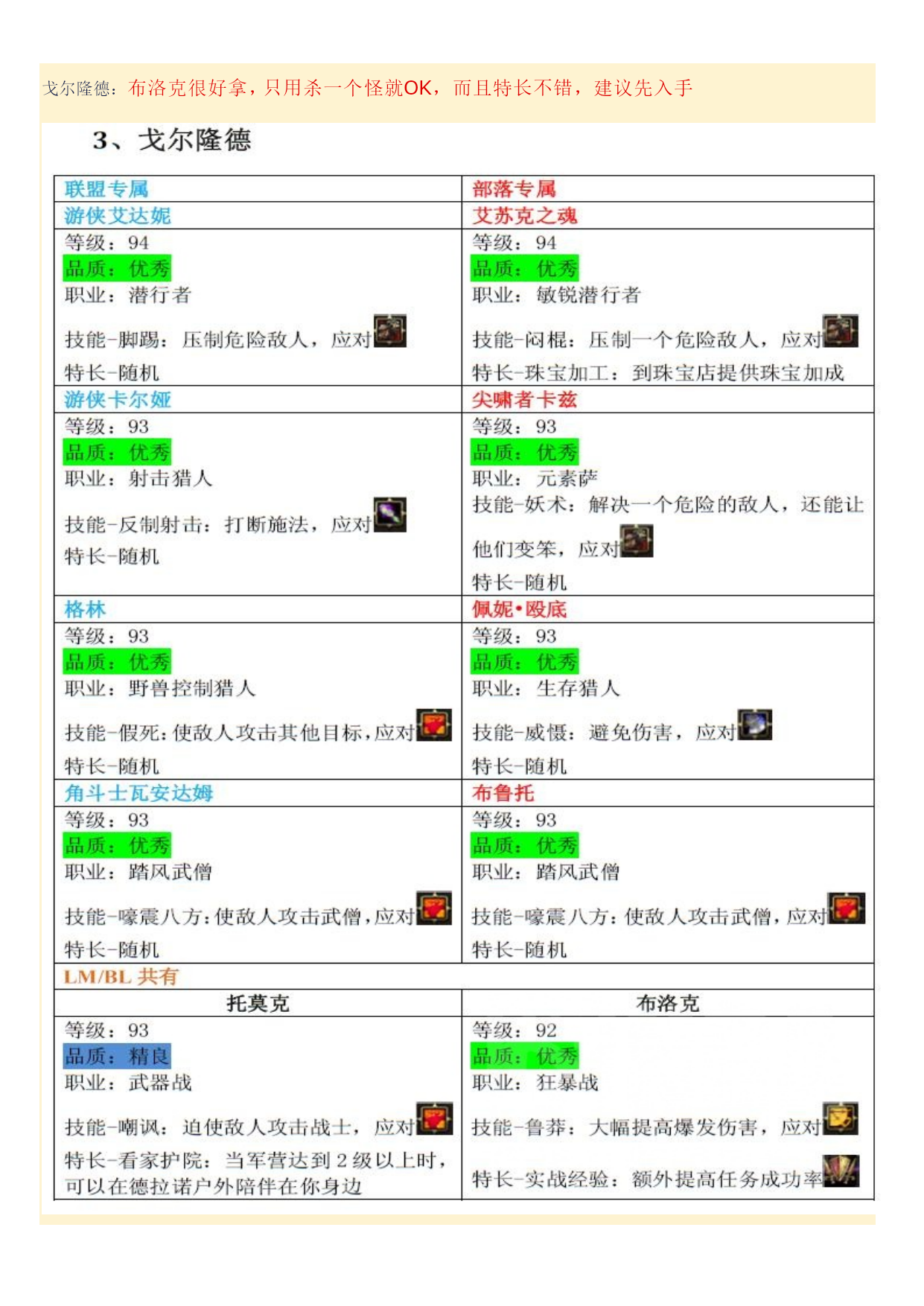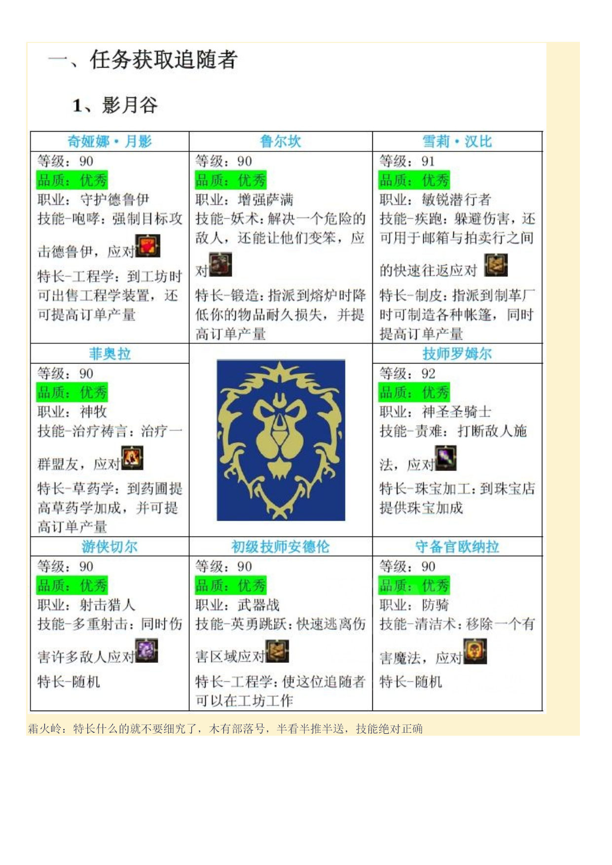 魔兽世界要塞随从简介及入手方法(完整版)实用资料 (可以直接使用,可编辑完整版实用资料,欢迎下载) 任务获取追随者:影月谷:游侠切尔,初级技师安德伦,守备官欧纳拉三选一霜火岭:特长什么的就不要细究了,木有部落号,半看半推半送,技能绝对正确 戈尔隆德:布洛克很好拿,只用杀一个怪就OK,而且特长不错,建议先入手塔拉多:阿兰卡峰林:开启废品站的任务地图纳格兰:3个随从都很好获得,除了剑圣要做任务... 随从任务奖励:据说失败了很难再刷出来,还是不要失败的好要塞建筑介绍:大型建筑:成就随从: