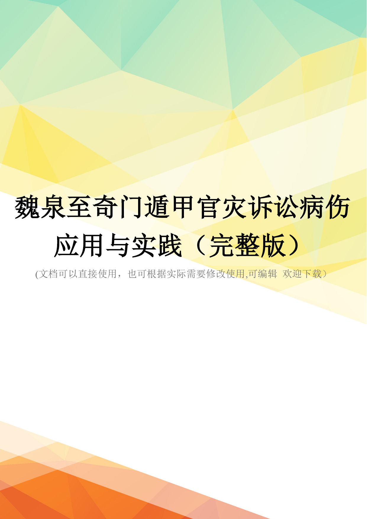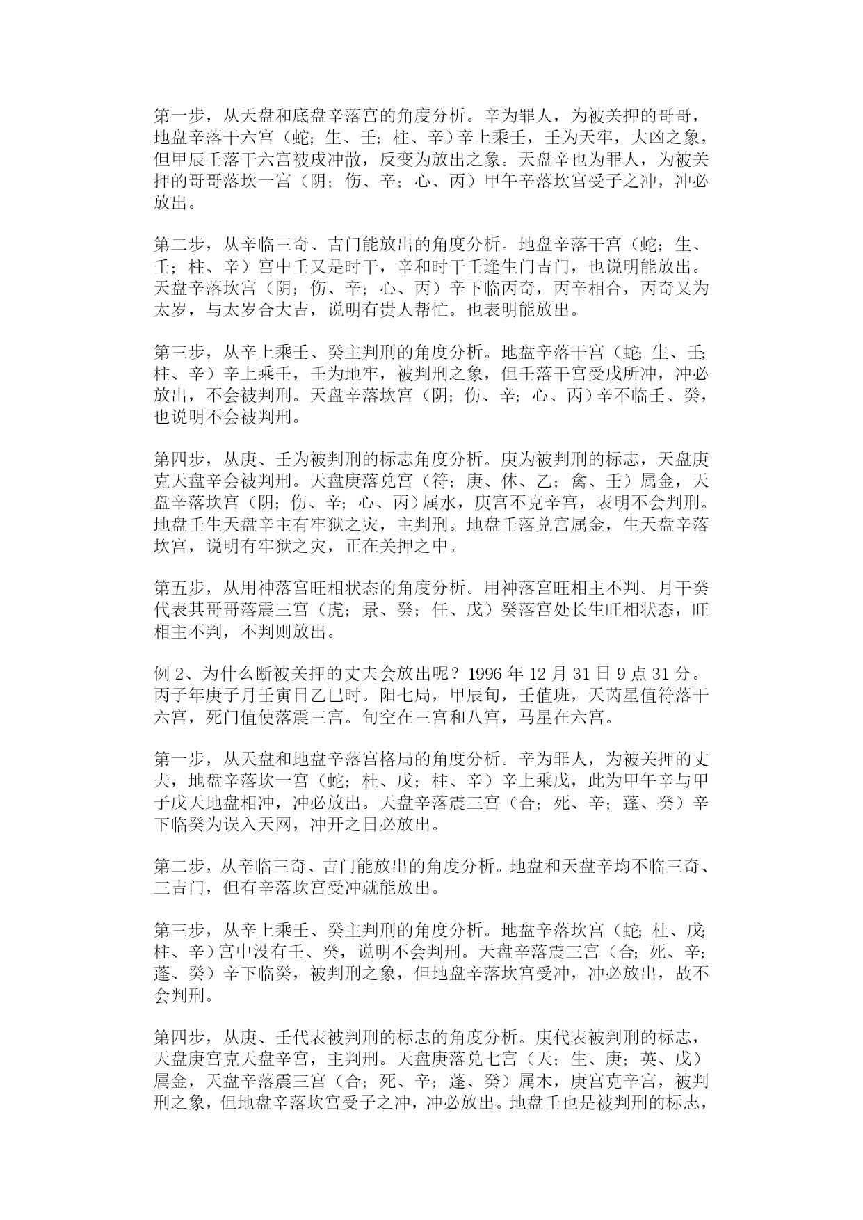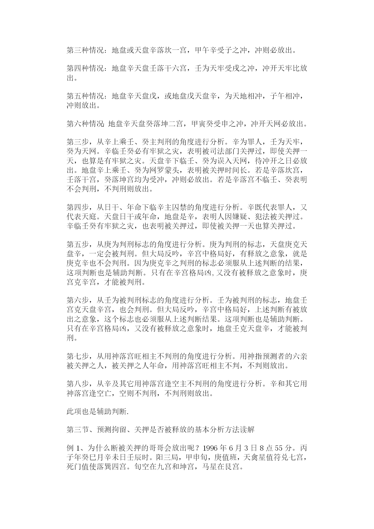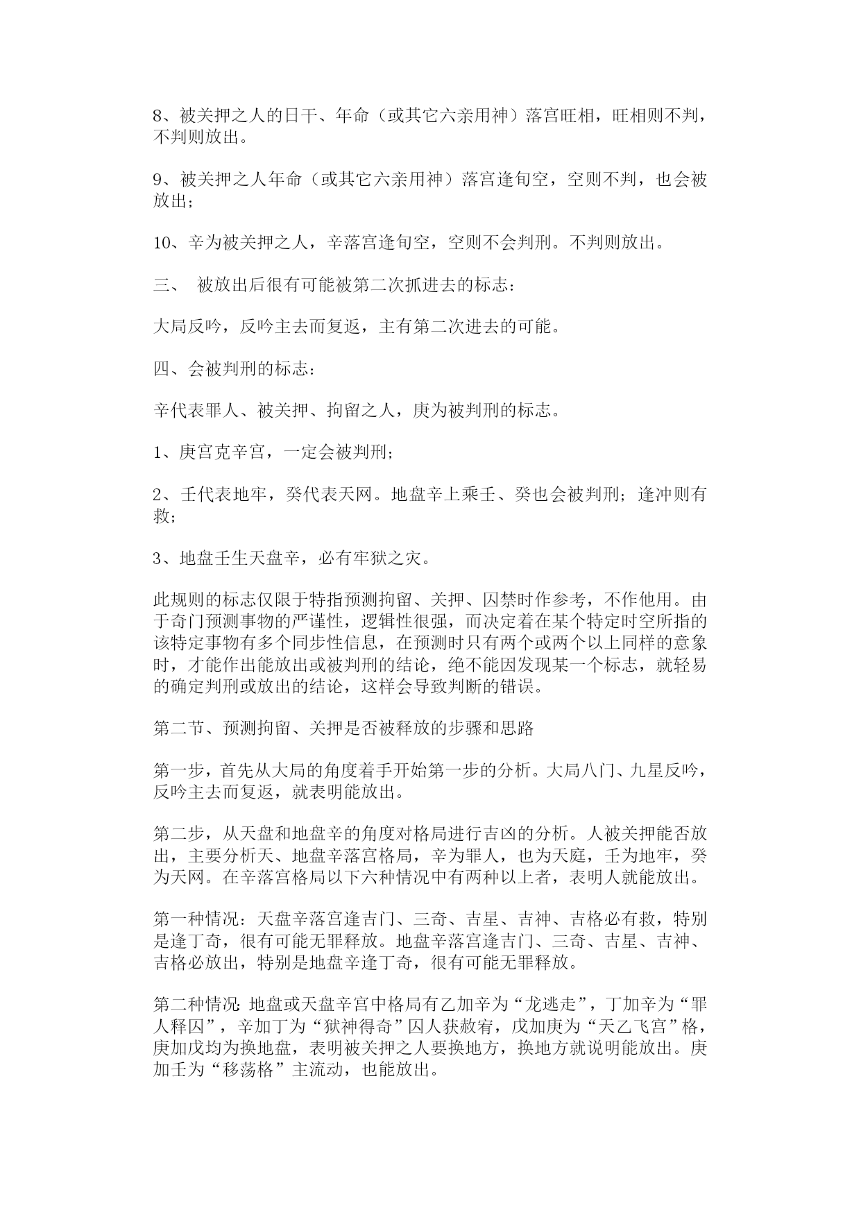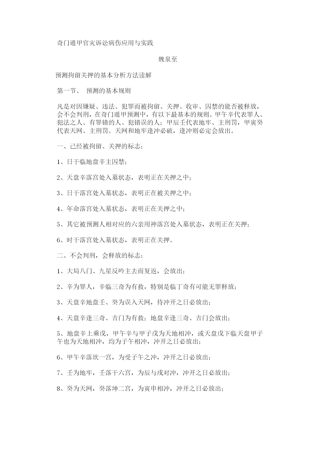 魏泉至奇门遁甲官灾诉讼病伤应用与实践(完整版) (文档可以直接使用,也可根据实际需要修改使用,可编辑欢迎下载) 奇门遁甲官灾诉讼病伤应用与实践 魏泉至 预测拘留关押的基本分析方法读解 第一节、预测的基本规则 凡是对因嫌疑、违法、犯罪而被拘留、关押、收审、囚禁的能否被释放,会不会判刑,在奇门遁甲预测中,有以下最基本的规则。甲午辛代表罪人、犯法之人、有罪错的人、犯错误的人;甲辰壬代表地牢、主刑罚,甲寅癸代表天网、主刑罚。天网和地牢逢冲必破,逢冲则必定会放出。 一、已经被拘留、关押的标志: 1、日干临地盘辛主囚禁; 2、天盘辛落宫处入墓状态,表明正在关押之中; 3、日干落宫处入墓状态,表明正在被关押之中; 4、年命落宫处入墓状态,表明正在关押之中; 5、其它被预测人相对应的六亲用神落宫处入墓状态,表明正在关押; 6、时干落宫处入墓状态,表明正在关押。 二、不会判刑,会释放的标志: 1、大局八门、九星反吟主去而复返,会放出; 2、辛为罪人,辛临三奇为有救,特别是临丁奇有可能无罪释放; 3、天盘辛地盘壬、癸为误入天网,待冲开之日必放出; 4、天盘辛逢三奇、吉门为有救;地盘辛逢三奇、吉门会放出; 5、地盘辛上乘戊,甲午辛与甲子戊为天地相冲,或天盘戊下临天盘甲子午也为天地相冲,均为子午相冲,冲开之日必放出; 6、甲午辛落坎一宫,为受子午之冲,冲开之日必放出; 7、壬为地牢,壬落干六宫,为辰与戌对冲,冲开之日必放出; 8、癸为天网,癸落坤二宫,为寅申相冲,冲开之日必放出; 8、被关押之人的日干、年命(或其它六亲用神)落宫旺相,旺相则不判,不判则放出。 9、被关押之人年命(或其它六亲用神)落宫逢旬空,空则不判,也会被放出; 10、辛为被关押之人,辛落宫逢旬空,空则不会判刑。不判则放出。 三、被放出后很有可能被第二次抓进去的标志: 大局反吟,反吟主去而复返,主有第二次进去的可能。 四、会被判刑的标志: 辛代表罪人、被关押、拘留之人,庚为被判刑的标志。 1、庚宫克辛宫,一定会被判刑; 2、壬代表地牢,癸代表天网。地盘辛上乘壬、癸也会被判刑;逢冲则有救; 3、地盘壬生天盘辛,必有牢狱之灾。 此规则的标志仅限于特指预测拘留、关押、囚禁时作参考,不作他用。由于奇门预测事物的严谨性,逻辑性很强,而决定着在某个特定时空所指的该特定事物有多个同步性信息,在预测时只有两个或两个以上同样的意象时,才能作出能放出或被判刑的结论,绝不能因发现某一个标志,就轻易的确定判刑或放出的结论,这样会导致判断的错误。 第二节、预测拘留、关押是否被释放的步骤和思路 第一步,首先从大局的角度着手开始第一步的分析。大局八门、九星反吟,反吟主去而复返,就表明能放出。 第二步,从天盘和地盘辛的角度对格局进行吉凶的分析。人被关押能否放出,主要分析天、地盘辛落宫格局,辛为罪人,也为天庭,壬为地牢,癸为天网。在辛落宫格局以下六种情况中有两种以上者,表明人就能放出。 第一种情况:天盘辛落宫逢吉门、三奇、吉星、吉神、吉格必有救,特别是逢丁奇,很有可能无罪释放。地盘辛落宫逢吉门、三奇、吉星、吉神、吉格必放出,特别是地盘辛逢丁奇,很有可能无罪释放。 第二种情况:地盘或天盘辛宫中格局有乙加辛为“龙逃走”,丁加辛为“罪人释囚”,辛加丁为“狱神得奇”囚人获赦宥,戊加庚为“天乙飞宫”格,庚加戊均为换地盘,表明被关押之人要换地方,换地方就说明能放出。庚加壬为“移荡格”主流动,也能放出。 第三种情况:地盘或天盘辛落坎一宫,甲午辛受子之冲,冲则必放出。 第四种情况:地盘辛天盘壬落干六宫,壬为天牢受戌之冲,冲开天牢比放出。 第五种情况:地盘辛天盘戊,或地盘戊天盘辛,为天地相冲,子午相冲,冲则放出。 第六种情况:地盘辛天盘癸落坤二宫,甲寅癸受申之冲,冲开天网必放出。 第三步,从辛上乘壬、癸主判刑的角度进行分析。辛为罪人,壬为天牢,癸为天网。辛临壬癸必有牢狱之灾,表明被司法部门关押过,即使关押一天,也算是有牢狱之灾。天盘辛下临壬、癸为误入天网,待冲开之日必放出。地盘辛上乘壬、癸为网罗蒙头,表明被关押时间长。若是辛落坎宫,壬落干宫,癸落坤宫均为受冲,冲则必放出。若是辛落宫不临壬、癸表明不会判刑,不判刑则放出。 第四步,从日干、年命下临辛主囚禁的角度进行分析。辛既代表罪人,又代表天庭。天盘日干或年命,地盘是辛,表明人因嫌疑、犯法被关押过。辛临壬癸有牢狱之灾,也表明被关押过,即使被关押一天也算关押过。 第五步,从庚为判刑标志的角度进行分析。庚为判刑的标志,天盘庚克天盘辛,一定会被判刑。但大局反吟,辛宫中格局好,有释放之意象,就是庚克辛也不会判刑。因为庚克辛之判刑的标志必须服从上述判断的结果,这项判断也是辅助判断。只有在辛宫格局凶,又没有被释放之意象时,庚宫克辛宫,才能被判刑。 第六步,从壬为被判刑标志的角度进行分析。壬为被判