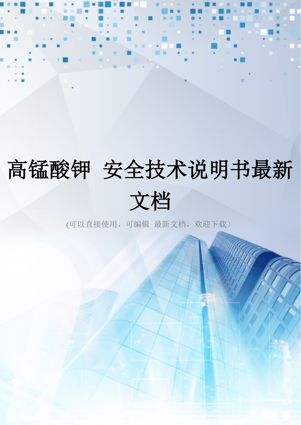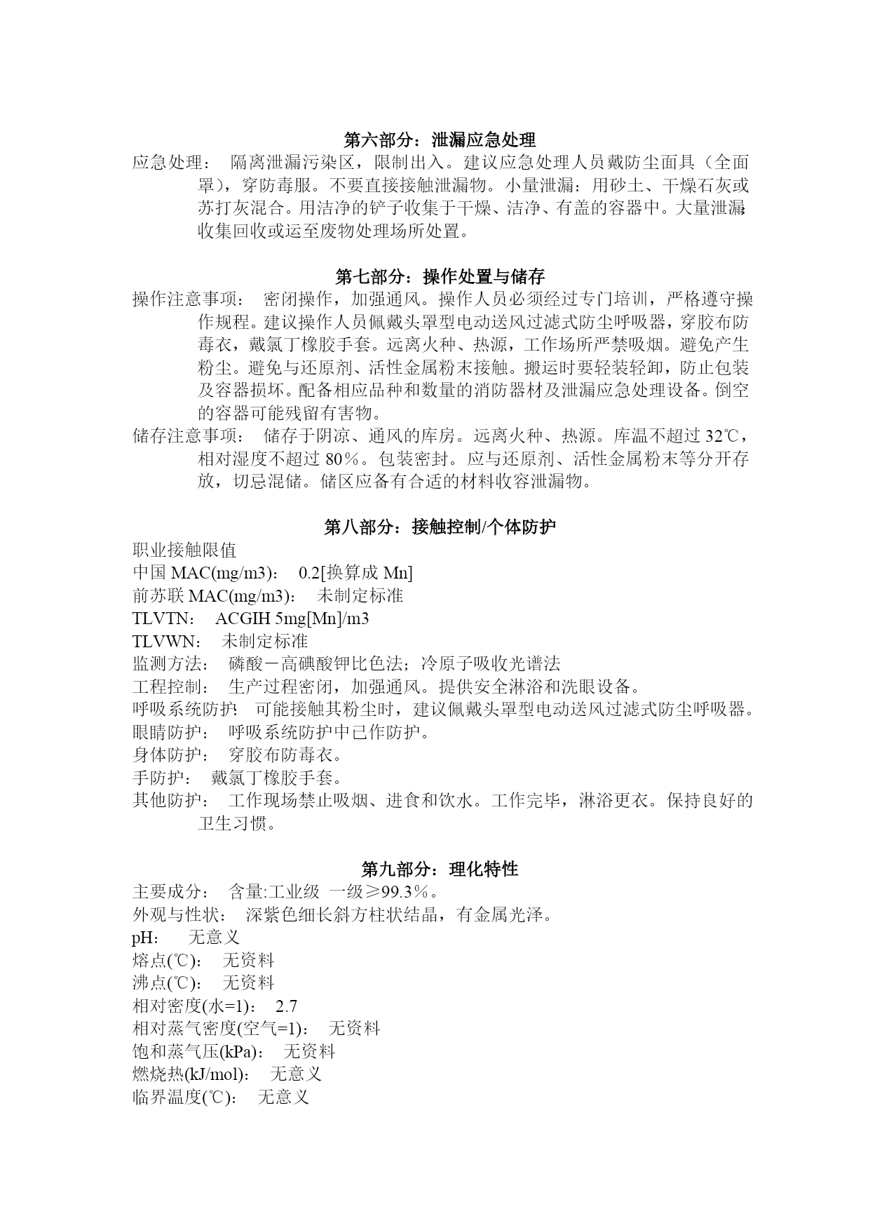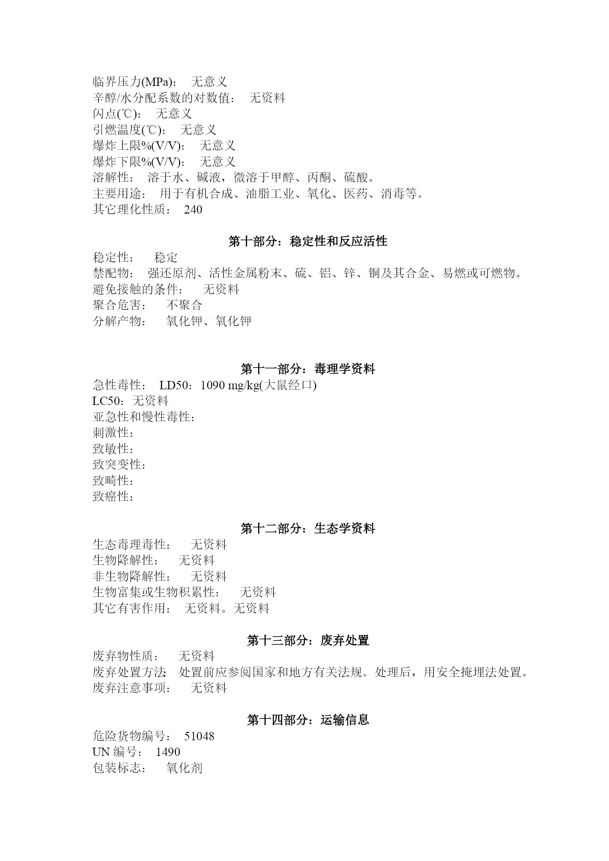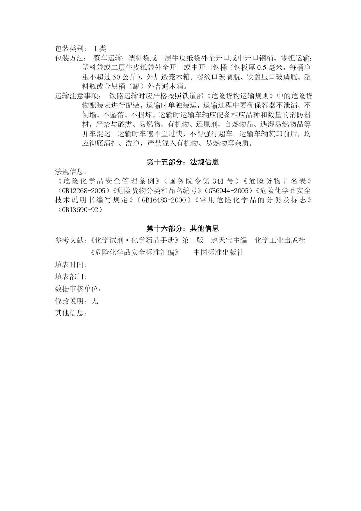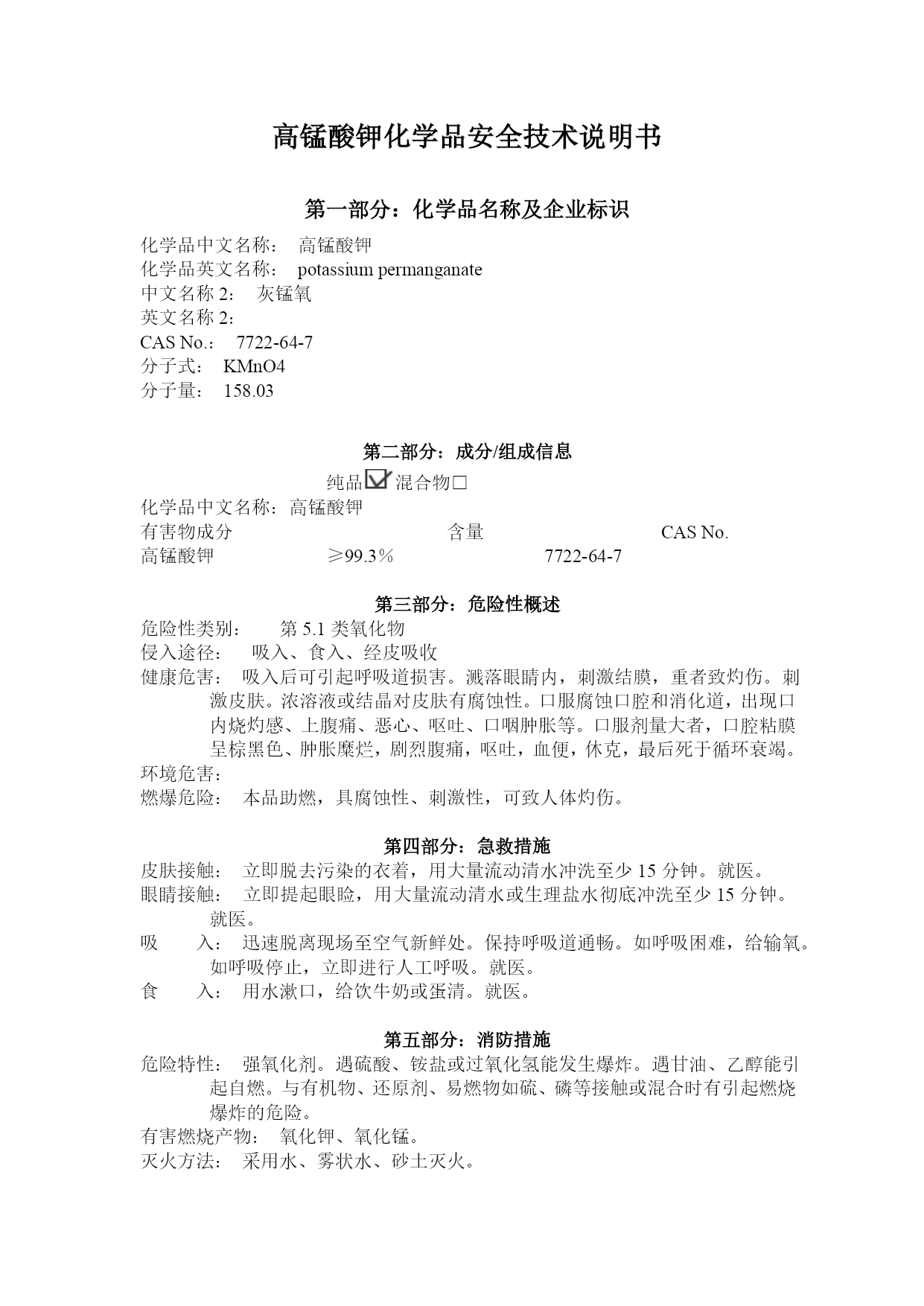 高锰酸钾安全技术说明书最新文档 (可以直接使用,可编辑最新文档,欢迎下载) 高锰酸钾化学品安全技术说明书 第一部分:化学品名称及企业标识 化学品中文名称:高锰酸钾 化学品英文名称:potassiumpermanganate 中文名称2:灰锰氧 英文名称2: CASNo.:7722-64-7 分子式:KMnO4 分子量:158.03 第二部分:成分/组成信息 纯品混合物□ 化学品中文名称:高锰酸钾 有害物成分含量CASNo. 高锰酸钾≥99.3%7722-64-7 第三部分:危险性概述 危险性类别:第5.1类氧化物 侵入途径:吸入、食入、经皮吸收 健康危害:吸入后可引起呼吸道损害。溅落眼睛内,刺激结膜,重者致灼伤。刺激皮肤。浓溶液或结晶对皮肤有腐蚀性。口服腐蚀口腔和消化道,出现口内烧灼感、上腹痛、恶心、呕吐、口咽肿胀等。口服剂量大者,口腔粘膜呈棕黑色、肿胀糜烂,剧烈腹痛,呕吐,血便,休克,最后死于循环衰竭。 环境危害: 燃爆危险:本品助燃,具腐蚀性、刺激性,可致人体灼伤。 第四部分:急救措施 皮肤接触:立即脱去污染的衣着,用大量流动清水冲洗至少15分钟。就医。 眼睛接触:立即提起眼睑,用大量流动清水或生理盐水彻底冲洗至少15分钟。就医。 吸入:迅速脱离现场至空气新鲜处。保持呼吸道通畅。如呼吸困难,给输氧。如呼吸停止,立即进行人工呼吸。就医。 食入:用水漱口,给饮牛奶或蛋清。就医。 第五部分:消防措施 危险特性:强氧化剂。遇硫酸、铵盐或过氧化氢能发生爆炸。遇甘油、乙醇能引起自燃。与有机物、还原剂、易燃物如硫、磷等接触或混合时有引起燃烧爆炸的危险。 有害燃烧产物:氧化钾、氧化锰。 灭火方法:采用水、雾状水、砂土灭火。 第六部分:泄漏应急处理 应急处理:隔离泄漏污染区,限制出入。建议应急处理人员戴防尘面具(全面罩),穿防毒服。不要直接接触泄漏物。小量泄漏:用砂土、干燥石灰或苏打灰混合。用洁净的铲子收集于干燥、洁净、有盖的容器中。大量泄漏:收集回收或运至废物处理场所处置。 第七部分:操作处置与储存 操作注意事项:密闭操作,加强通风。操作人员必须经过专门培训,严格遵守操作规程。建议操作人员佩戴头罩型电动送风过滤式防尘呼吸器,穿胶布防毒衣,戴氯丁橡胶手套。远离火种、热源,工作场所严禁吸烟。避免产生粉尘。避免与还原剂、活性金属粉末接触。搬运时要轻装轻卸,防止包装及容器损坏。配备相应品种和数量的消防器材及泄漏应急处理设备。倒空的容器可能残留有害物。 储存注意事项:储存于阴凉、通风的库房。远离火种、热源。库温不超过32℃,相对湿度不超过80%。包装密封。应与还原剂、活性金属粉末等分开存放,切忌混储。储区应备有合适的材料收容泄漏物。 第八部分:接触控制/个体防护 职业接触限值 中国MAC(mg/m3):0.2[换算成Mn] 前苏联MAC(mg/m3):未制定标准 TLVTN:ACGIH5mg[Mn]/m3 TLVWN:未制定标准 监测方法:磷酸-高碘酸钾比色法;冷原子吸收光谱法 工程控制:生产过程密闭,加强通风。提供安全淋浴和洗眼设备。 呼吸系统防护:可能接触其粉尘时,建议佩戴头罩型电动送风过滤式防尘呼吸器。 眼睛防护:呼吸系统防护中已作防护。 身体防护:穿胶布防毒衣。 手防护:戴氯丁橡胶手套。 其他防护:工作现场禁止吸烟、进食和饮水。工作完毕,淋浴更衣。保持良好的卫生习惯。 第九部分:理化特性 主要成分:含量:工业级一级≥99.3%。 外观与性状:深紫色细长斜方柱状结晶,有金属光泽。 pH:无意义 熔点(℃):无资料 沸点(℃):无资料 相对密度(水=1):2.7 相对蒸气密度(空气=1):无资料 饱和蒸气压(kPa):无资料 燃烧热(kJ/mol):无意义 临界温度(℃):无意义 临界压力(MPa):无意义 辛醇/水分配系数的对数值:无资料 闪点(℃):无意义 引燃温度(℃):无意义 爆炸上限%(V/V):无意义 爆炸下限%(V/V):无意义 溶解性:溶于水、碱液,微溶于甲醇、丙酮、硫酸。 主要用途:用于有机合成、油脂工业、氧化、医药、消毒等。 其它理化性质:240 第十部分:稳定性和反应活性 稳定性:稳定 禁配物:强还原剂、活性金属粉末、硫、铝、锌、铜及其合金、易燃或可燃物。 避免接触的条件:无资料 聚合危害:不聚合 分解产物:氧化钾、氧化钾 第十一部分:毒理学资料 急性毒性:LD50:1090mg/kg(大鼠经口) LC50:无资料 亚急性和慢性毒性: 刺激性: 致敏性: 致突变性: 致畸性: 致癌性: 第十二部分:生态学资料 生态毒理毒性:无资料 生物降解性:无资料 非生物降解性:无资料 生物富集或生物积累性:无资料 其它有害作用:无资料。无资料 第十三部分:废弃处置 废弃物性质:无资料 废弃处置方法:处置前应