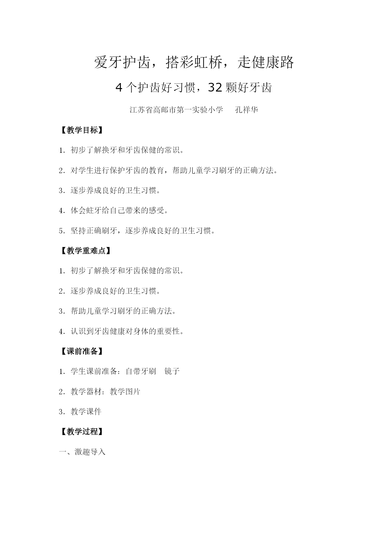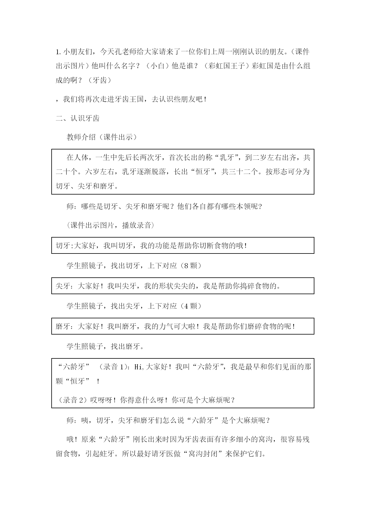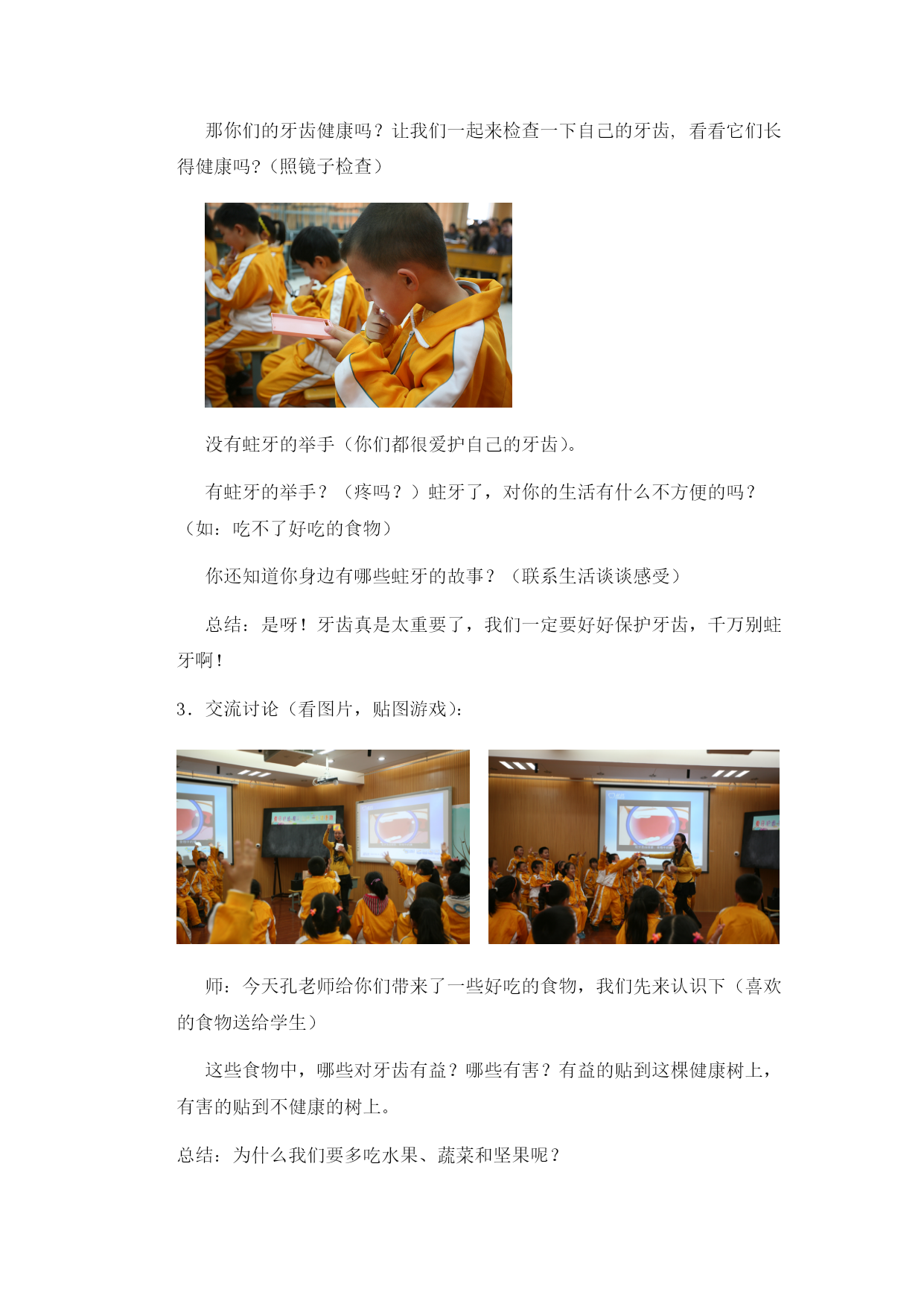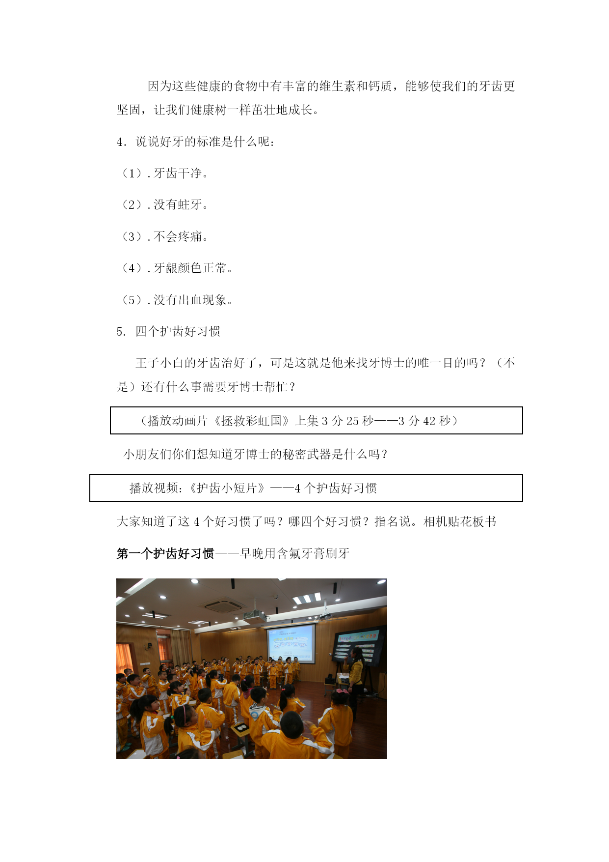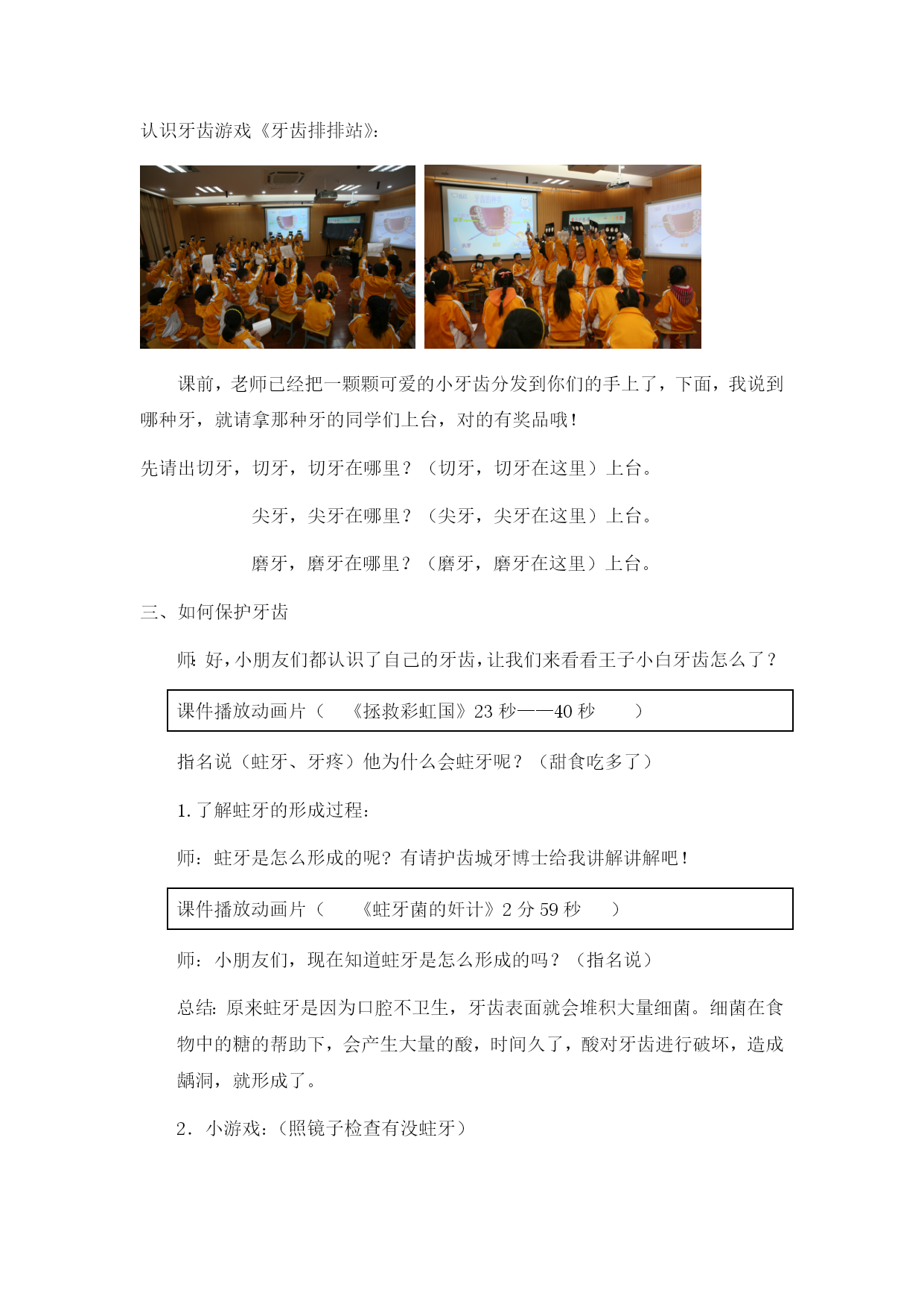 爱牙护齿,搭彩虹桥,走健康路 4个护齿好习惯,32颗好牙齿 江苏省高邮市第一实验小学孔祥华 【教学目标】 1.初步了解换牙和牙齿保健的常识。 2.对学生进行保护牙齿的教育,帮助儿童学习刷牙的正确方法。 3.逐步养成良好的卫生习惯。 4.体会蛀牙给自己带来的感受。 5.坚持正确刷牙,逐步养成良好的卫生习惯。 【教学重难点】 1.初步了解换牙和牙齿保健的常识。 2.逐步养成良好的卫生习惯。 3.帮助儿童学习刷牙的正确方法。 4.认识到牙齿健康对身体的重要性。 【课前准备】 1.学生课前准备:自带牙刷镜子 2.教学器材:教学图片 3.教学课件 【教学过程】 一、激趣导入 1.小朋友们,今天孔老师给大家请来了一位你们上周一刚刚认识的朋友。(课件出示图片)他叫什么名字?(小白)他是谁?(彩虹国王子)彩虹国是由什么组成的啊?(牙齿) ,我们将再次走进牙齿王国,去认识些朋友吧! 二、认识牙齿 教师介绍(课件出示) 在人体,一生中先后长两次牙,首次长出的称“乳牙”,到二岁左右出齐,共二十个。六岁左右,乳牙逐渐脱落,长出“恒牙”,共三十二个。按形态可分为切牙、尖牙和磨牙。 师:哪些是切牙、尖牙和磨牙呢?他们各自都有哪些本领呢? (课件出示图片,播放录音) 切牙:大家好,我叫切牙,我的功能是帮助你切断食物的哦! 学生照镜子,找出切牙,上下对应(8颗) 尖牙:大家好!我叫尖牙,我的形状尖尖的,我是帮助你捣碎食物的。 学生照镜子,找出尖牙,上下对应(4颗) 磨牙:大家好!我叫磨牙,我的力气可大啦!我是帮助你们磨碎食物的呢! 学生照镜子,找出磨牙。 “六龄牙”(录音1):Hi,大家好!我叫“六龄牙”,我是最早和你们见面的那颗“恒牙”! (录音2)哎呀呀!你得意什么呀!你可是个大麻烦呢? 师:咦,切牙,尖牙和磨牙们怎么说“六龄牙”是个大麻烦呢? 哦!原来“六龄牙”刚长出来时因为牙齿表面有许多细小的窝沟,很容易残留食物,引起蛀牙。所以最好请牙医做“窝沟封闭”来保护它们。 认识牙齿游戏《牙齿排排站》: 课前,老师已经把一颗颗可爱的小牙齿分发到你们的手上了,下面,我说到哪种牙,就请拿那种牙的同学们上台,对的有奖品哦! 先请出切牙,切牙,切牙在哪里?(切牙,切牙在这里)上台。 尖牙,尖牙在哪里?(尖牙,尖牙在这里)上台。 磨牙,磨牙在哪里?(磨牙,磨牙在这里)上台。 三、如何保护牙齿 师:好,小朋友们都认识了自己的牙齿,让我们来看看王子小白牙齿怎么了? 课件播放动画片(《拯救彩虹国》23秒——40秒) 指名说(蛀牙、牙疼)他为什么会蛀牙呢?(甜食吃多了) 1.了解蛀牙的形成过程: 师:蛀牙是怎么形成的呢?有请护齿城牙博士给我讲解讲解吧! 课件播放动画片(《蛀牙菌的奸计》2分59秒) 师:小朋友们,现在知道蛀牙是怎么形成的吗?(指名说) 总结:原来蛀牙是因为口腔不卫生,牙齿表面就会堆积大量细菌。细菌在食物中的糖的帮助下,会产生大量的酸,时间久了,酸对牙齿进行破坏,造成龋洞,就形成了。 2.小游戏:(照镜子检查有没蛀牙) 那你们的牙齿健康吗?让我们一起来检查一下自己的牙齿,看看它们长得健康吗?(照镜子检查) 没有蛀牙的举手(你们都很爱护自己的牙齿)。 有蛀牙的举手?(疼吗?)蛀牙了,对你的生活有什么不方便的吗?(如:吃不了好吃的食物) 你还知道你身边有哪些蛀牙的故事?(联系生活谈谈感受) 总结:是呀!牙齿真是太重要了,我们一定要好好保护牙齿,千万别蛀牙啊! 3.交流讨论(看图片,贴图游戏): 师:今天孔老师给你们带来了一些好吃的食物,我们先来认识下(喜欢的食物送给学生) 这些食物中,哪些对牙齿有益?哪些有害?有益的贴到这棵健康树上,有害的贴到不健康的树上。 总结:为什么我们要多吃水果、蔬菜和坚果呢? 因为这些健康的食物中有丰富的维生素和钙质,能够使我们的牙齿更坚固,让我们健康树一样茁壮地成长。 4.说说好牙的标准是什么呢: (1).牙齿干净。 (2).没有蛀牙。 (3).不会疼痛。 (4).牙龈颜色正常。 (5).没有出血现象。 5.四个护齿好习惯 王子小白的牙齿治好了,可是这就是他来找牙博士的唯一目的吗?(不是)还有什么事需要牙博士帮忙? (播放动画片《拯救彩虹国》上集3分25秒——3分42秒) 小朋友们你们想知道牙博士的秘密武器是什么吗? 播放视频:《护齿小短片》——4个护齿好习惯 大家知道了这4个好习惯了吗?哪四个好习惯?指名说。相机贴花板书 第一个护齿好习惯——早晚用含氟牙膏刷牙 (课件播放音频)唱刷牙儿歌 上牙从上往下刷; 下牙从下往上刷; 咬颌面来回的刷; 里里外外都要刷; 第二个护齿好习惯——保持饮食平衡 总结:我们要多吃水果,蔬菜和坚果类食品。 第三个护齿好习惯——吃完喝完嚼益达口香糖 嚼无糖口香糖到底有什么好处呢,来,我们一起来看看。 (
