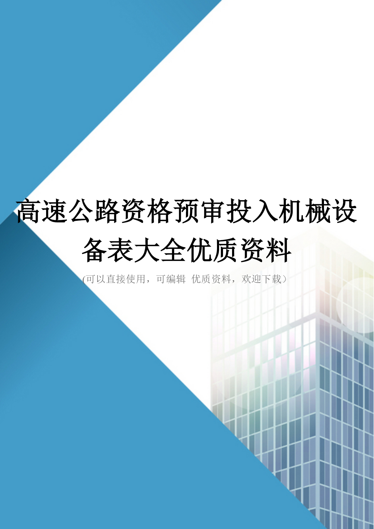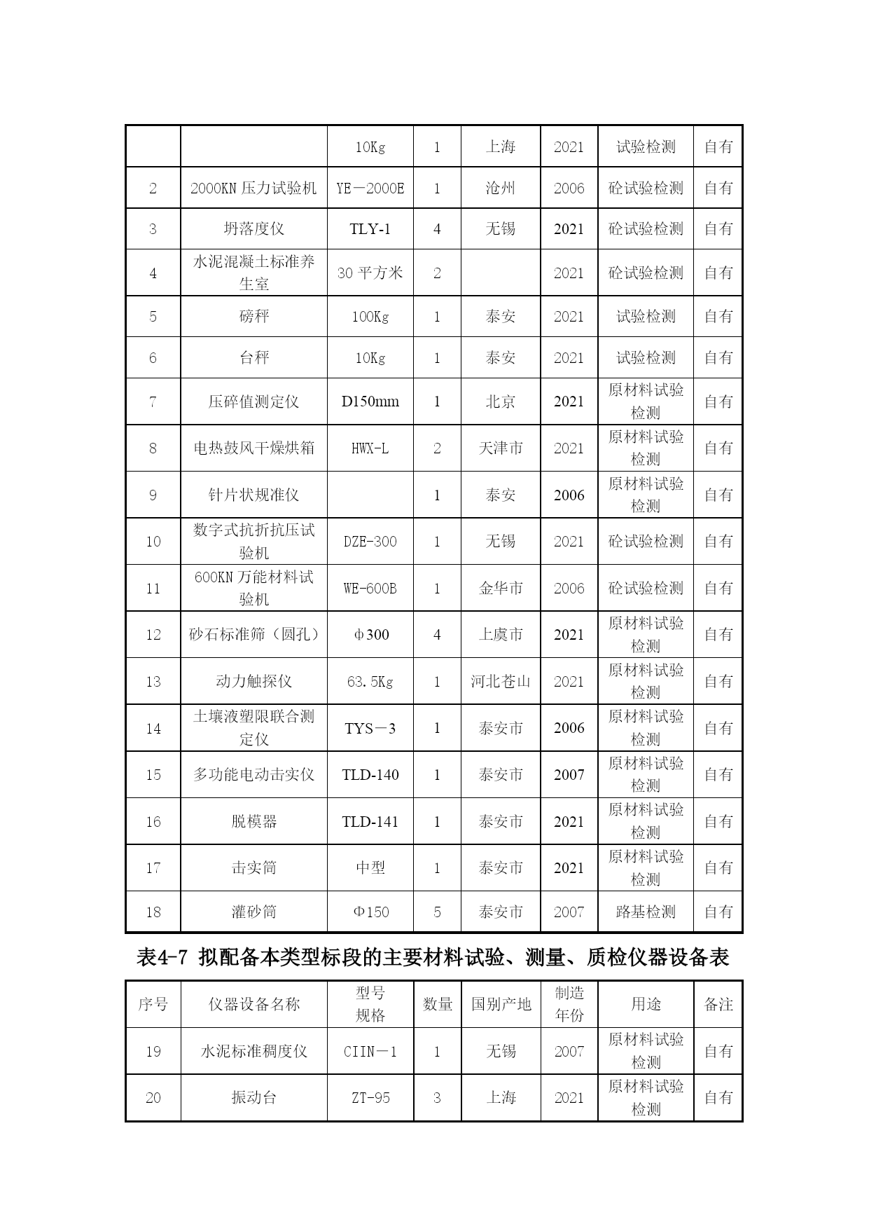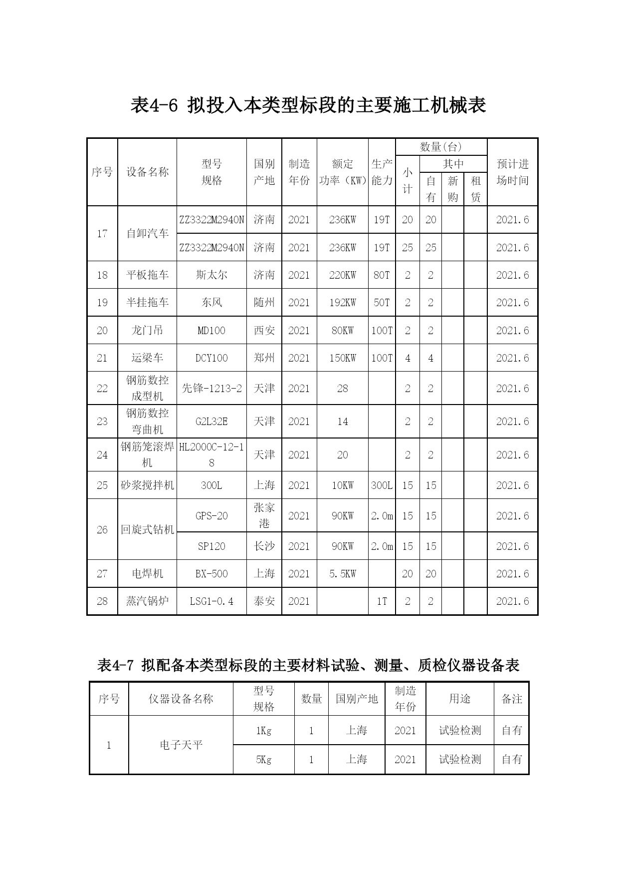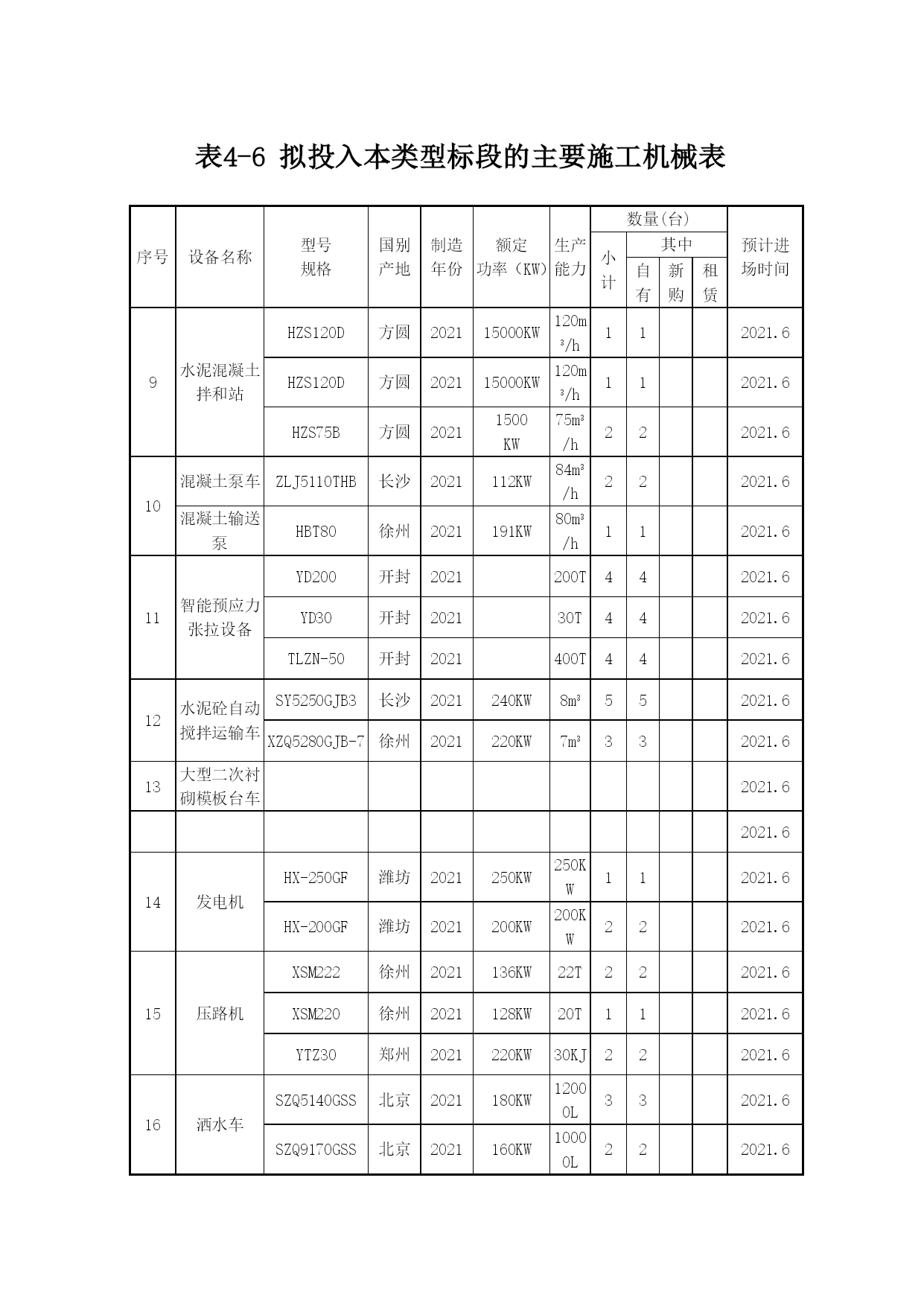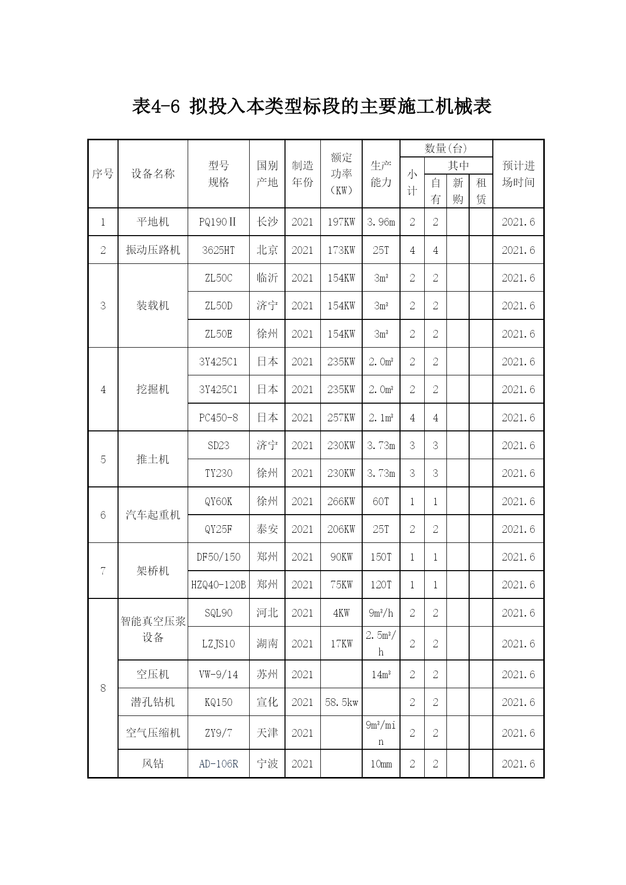 高速公路资格预审投入机械设备表大全优质资料 (可以直接使用,可编辑优质资料,欢迎下载) 表4-6拟投入本类型标段的主要施工机械表 序号设备名称型号 规格国别 产地制造年份额定 功率(KW)生产 能力数量(台)预计进 场时间小计其中自有新购租赁1平地机PQ190Ⅱ长沙2021197KW3.96m222021.62振动压路机3625HT北京2021173KW25T442021.63装载机ZL50C临沂2021154KW3m3222021.6ZL50D济宁2021154KW3m3222021.6ZL50E徐州2021154KW3m3222021.64挖掘机3Y425C1日本2021235KW2.0m3222021.63Y425C1日本2021235KW2.0m3222021.6PC450-8日本2021257KW2.1m3442021.65推土机SD23济宁2021230KW3.73m332021.6TY230徐州2021230KW3.73m332021.66汽车起重机QY60K徐州2021266KW60T112021.6QY25F泰安2021206KW25T222021.67架桥机DF50/150郑州202190KW150T112021.6HZQ40-120B郑州202175KW120T112021.68智能真空压浆设备SQL90河北20214KW9m3/h222021.6LZJS10湖南202117KW2.5m3/h222021.6空压机VW-9/14苏州202114m3222021.6潜孔钻机KQ150宣化202158.5kw222021.6空气压缩机ZY9/7天津20219m3/min222021.6风钻AD-106R宁波202110mm222021.6 表4-6拟投入本类型标段的主要施工机械表 序号设备名称型号 规格国别 产地制造年份额定 功率(KW)生产 能力数量(台)预计进 场时间小计其中自有新购租赁9水泥混凝土 拌和站HZS120D方圆202115000KW120m3/h112021.6HZS120D方圆202115000KW120m3/h112021.6HZS75B方圆20211500 KW75m3/h222021.610混凝土泵车ZLJ5110THB长沙2021112KW84m3/h222021.6混凝土输送泵HBT80徐州2021191KW80m3/h112021.611智能预应力 张拉设备YD200开封2021200T442021.6YD30开封202130T442021.6TLZN-50开封2021400T442021.612水泥砼自动搅拌运输车SY5250GJB3长沙2021240KW8m3552021.6XZQ5280GJB-7徐州2021220KW7m3332021.613大型二次衬砌模板台车2021.62021.614发电机HX-250GF潍坊2021250KW250KW112021.6HX-200GF潍坊2021200KW200KW222021.615压路机XSM222徐州2021136KW22T222021.6XSM220徐州2021128KW20T112021.6YTZ30郑州2021220KW30KJ222021.616洒水车SZQ5140GSS北京2021180KW12000L332021.6SZQ9170GSS北京2021160KW10000L222021.6表4-6拟投入本类型标段的主要施工机械表 序号设备名称型号 规格国别 产地制造年份额定 功率(KW)生产 能力数量(台)预计进 场时间小计其中自有新购租赁17自卸汽车ZZ3322M2940N济南2021236KW19T20202021.6ZZ3322M2940N济南2021236KW19T25252021.618平板拖车斯太尔济南2021220KW80T222021.619半挂拖车东风随州2021192KW50T222021.620龙门吊MD100西安202180KW100T222021.621运梁车DCY100郑州2021150KW100T442021.622钢筋数控 成型机先锋-1213-2天津202128222021.623钢筋数控 弯曲机G2L32E天津202114222021.624钢筋笼滚焊机HL2000C-12-18天津202120222021.625砂浆搅拌机300L上海202110KW300L15152021.626回旋式钻机GPS-20张家港202190KW2.0m15152021.6SP120长沙202190KW2.0m15152021.627电焊机BX-500上海20215.5KW20202021.628蒸汽锅炉LSG1-0.4泰安20211T222021.6 表4-7拟配备本类型标段的主要材料试验、测