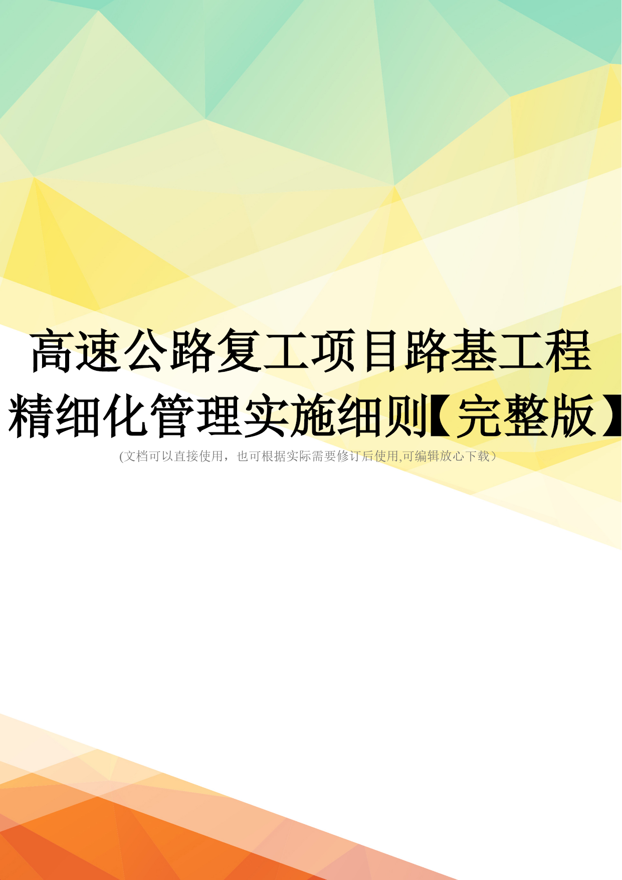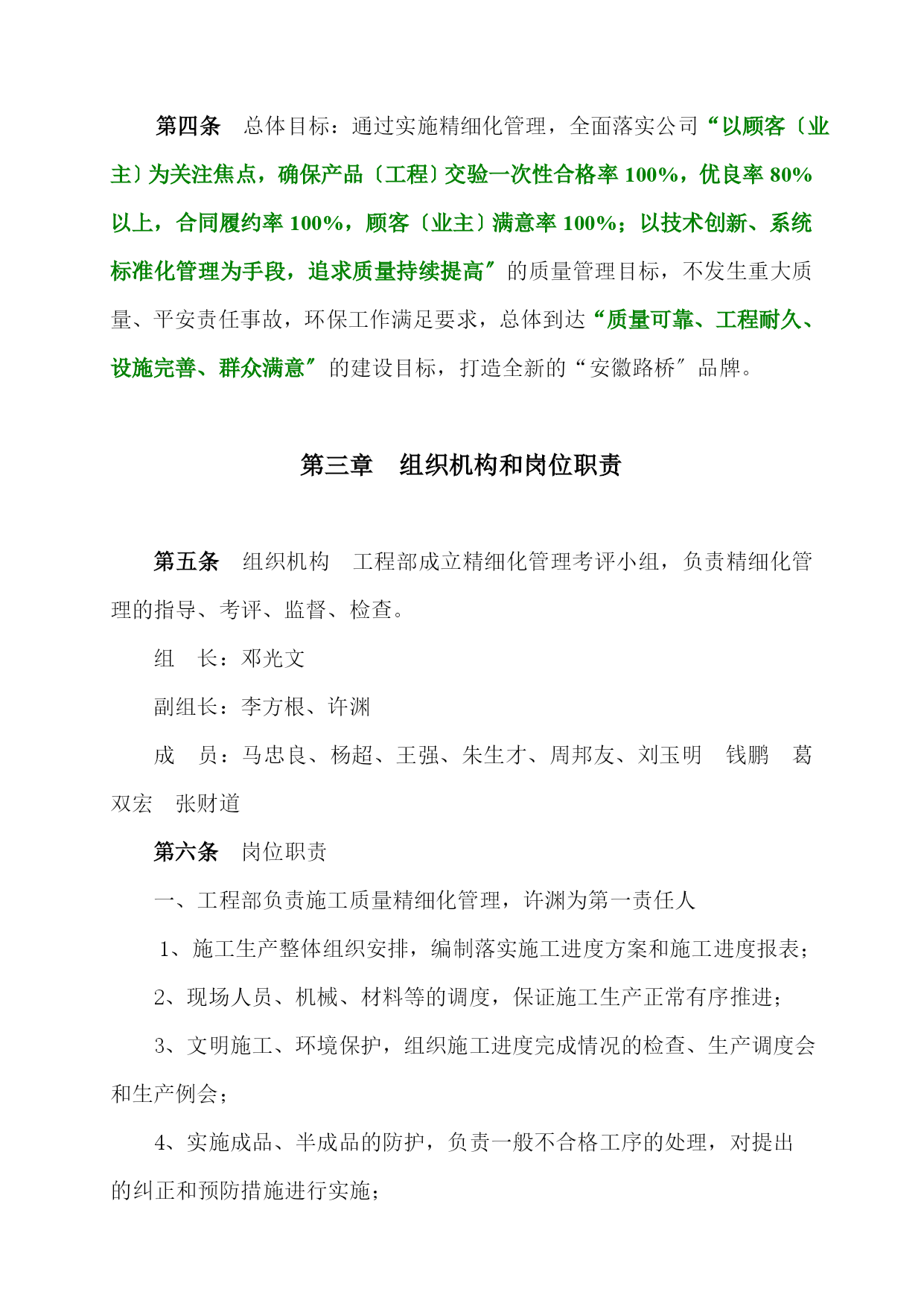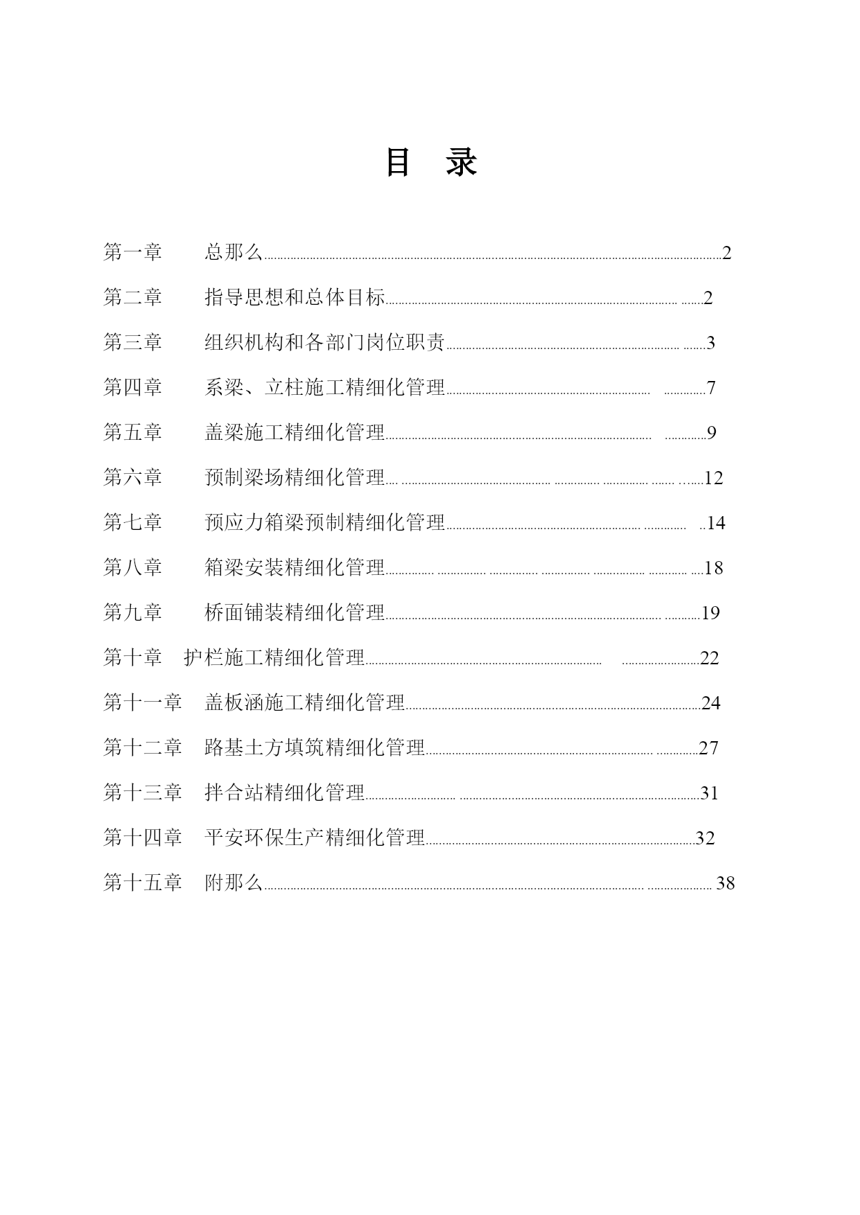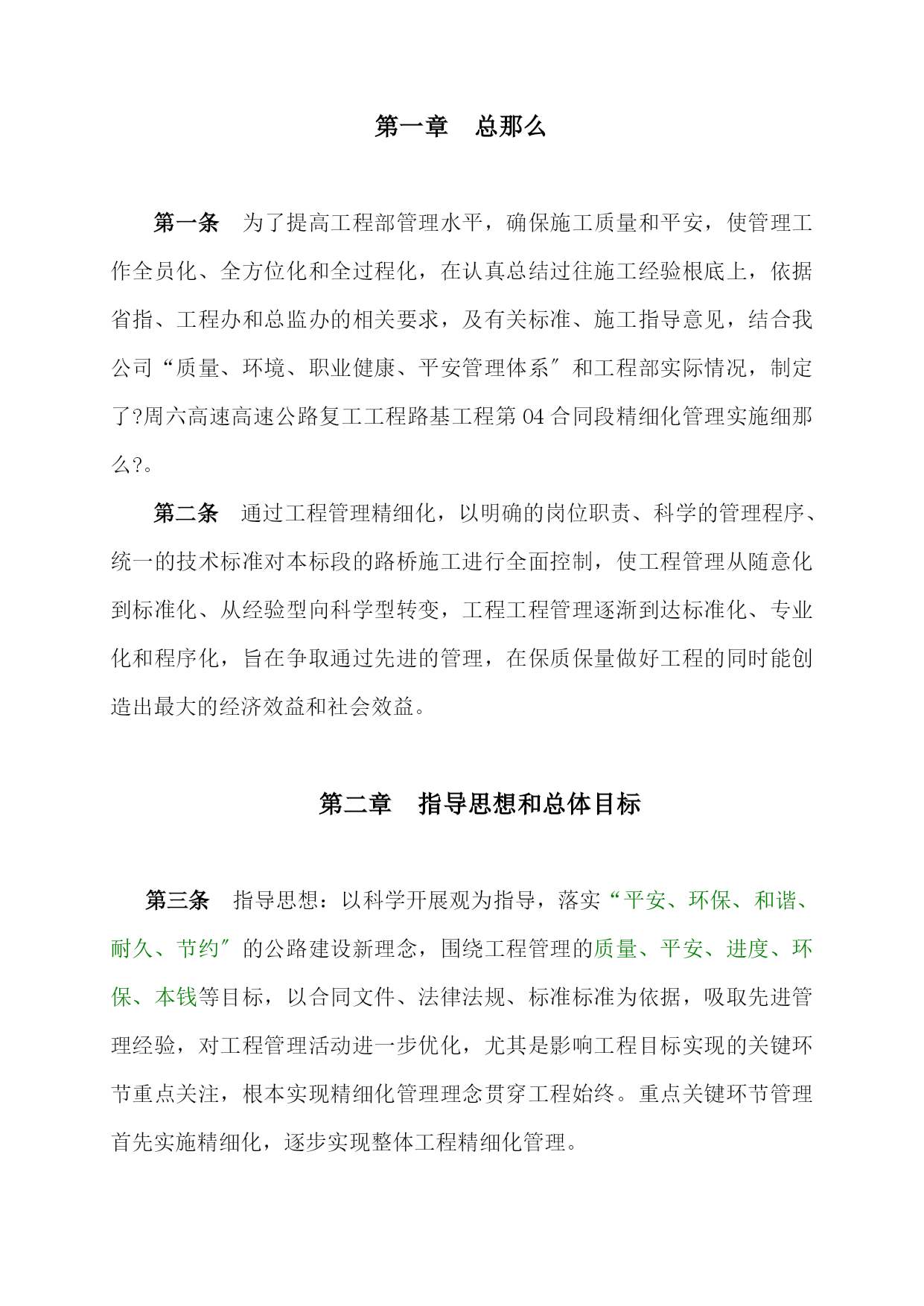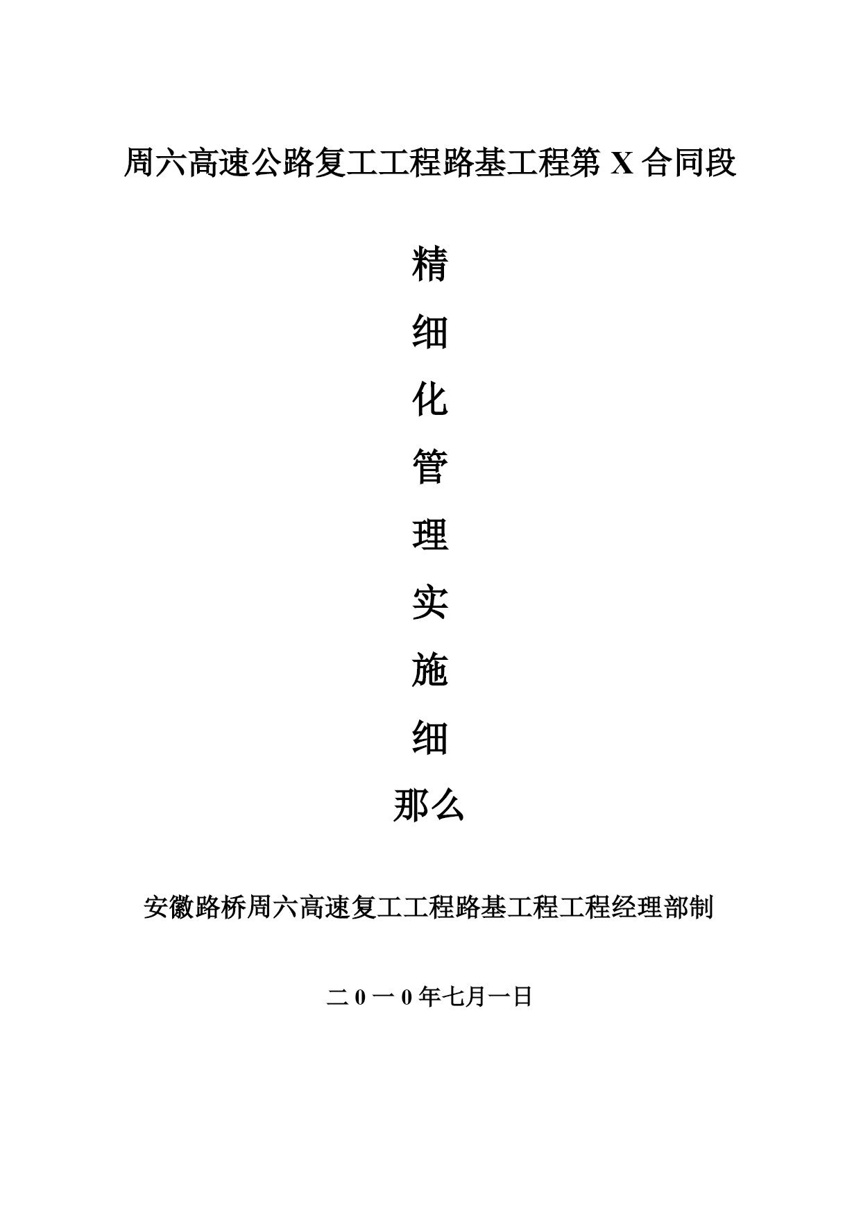 高速公路复工项目路基工程精细化管理实施细则【完整版】 (文档可以直接使用,也可根据实际需要修订后使用,可编辑放心下载) 周六高速公路复工工程路基工程第X合同段 精 细 化 管 理 实 施 细 那么 安徽路桥周六高速复工工程路基工程工程经理部制 二0一0年七月一日 目录 总那么.............................................................................................................................................2 指导思想和总体目标.................................................................................................2 组织机构和各部门岗位职责...............................................................................3 第四章系梁、立柱施工精细化管理............................................................................7 第五章盖梁施工精细化管理...............................................................................................9 第六章预制梁场精细化管理.....................................................................................…....12 第七章预应力箱梁预制精细化管理...........................................................................14 第八章箱梁安装精细化管理............................................................................................18 第九章桥面铺装精细化管理................................................................................................19 第十章护栏施工精细化管理.................................................................................................22 第十一章盖板涵施工精细化管理...........................................................................................24 第十二章路基土方填筑精细化管理...................................................................................27 第十三章拌合站精细化管理......................................................................................................31 第十四章平安环保生产精细化管理...................................................................................32 第十五章附那么.........................................................................................................................................38 第一章总那么 第一条为了提高工程部管理水平,确保施工质量和平安,使管理工作全员化、全方位化和全过程化,在认真总结过往施工经验根底上,依据省指、工程办和总监办的相关要求,及有关标准、施工指导意见,结合我公司“质量、环境、职业健康、平安管理体系〞和工程部实际情况,制定了?周六高速高速公路复工工程路基工程第04合同段精细化管理实施细那么?。 第二条通过工程管理精细化,以明确的岗位职责、科学的管理程序